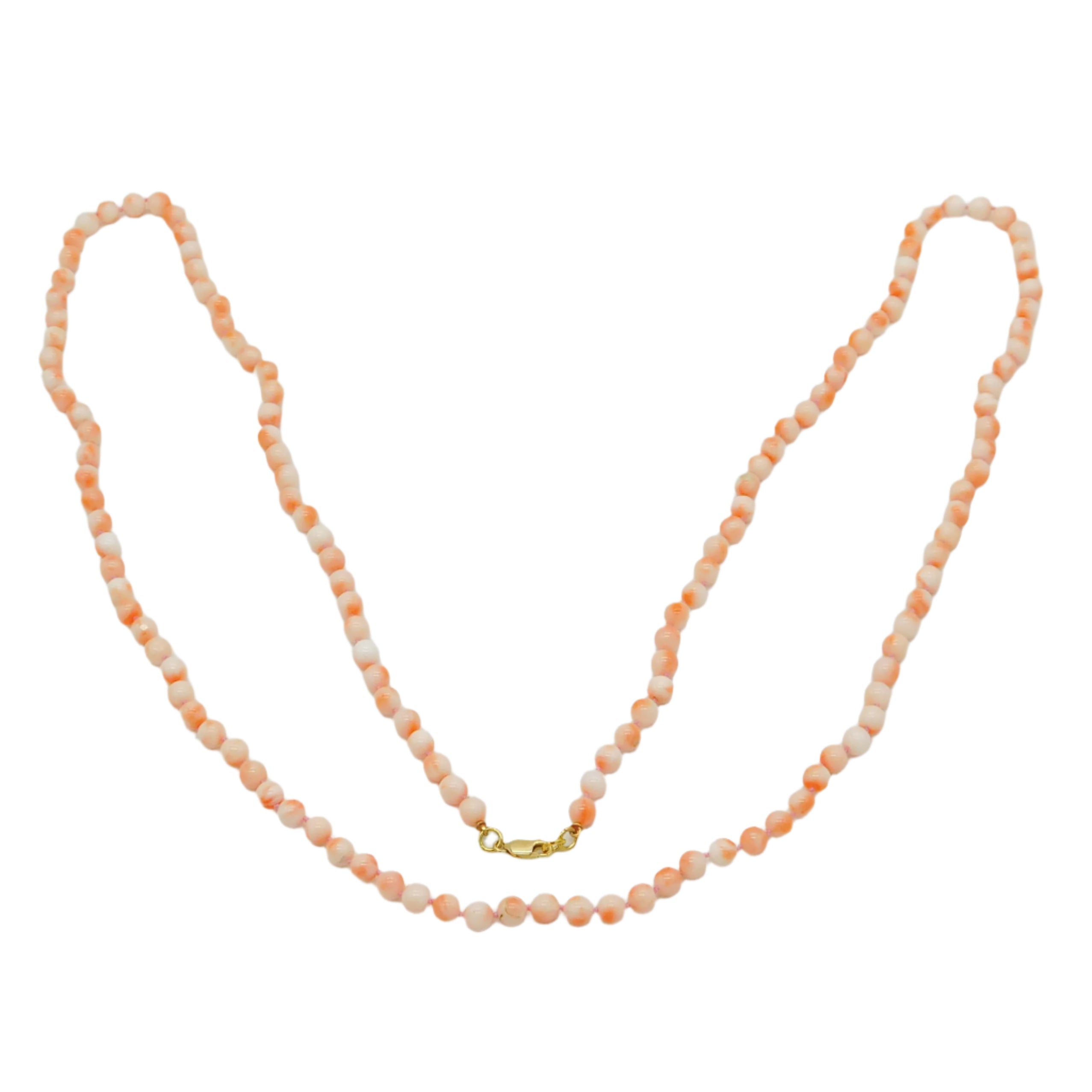 9ct Yellow Gold Carved Angel-Skin Coral Beaded Long Necklace Vintage c1970