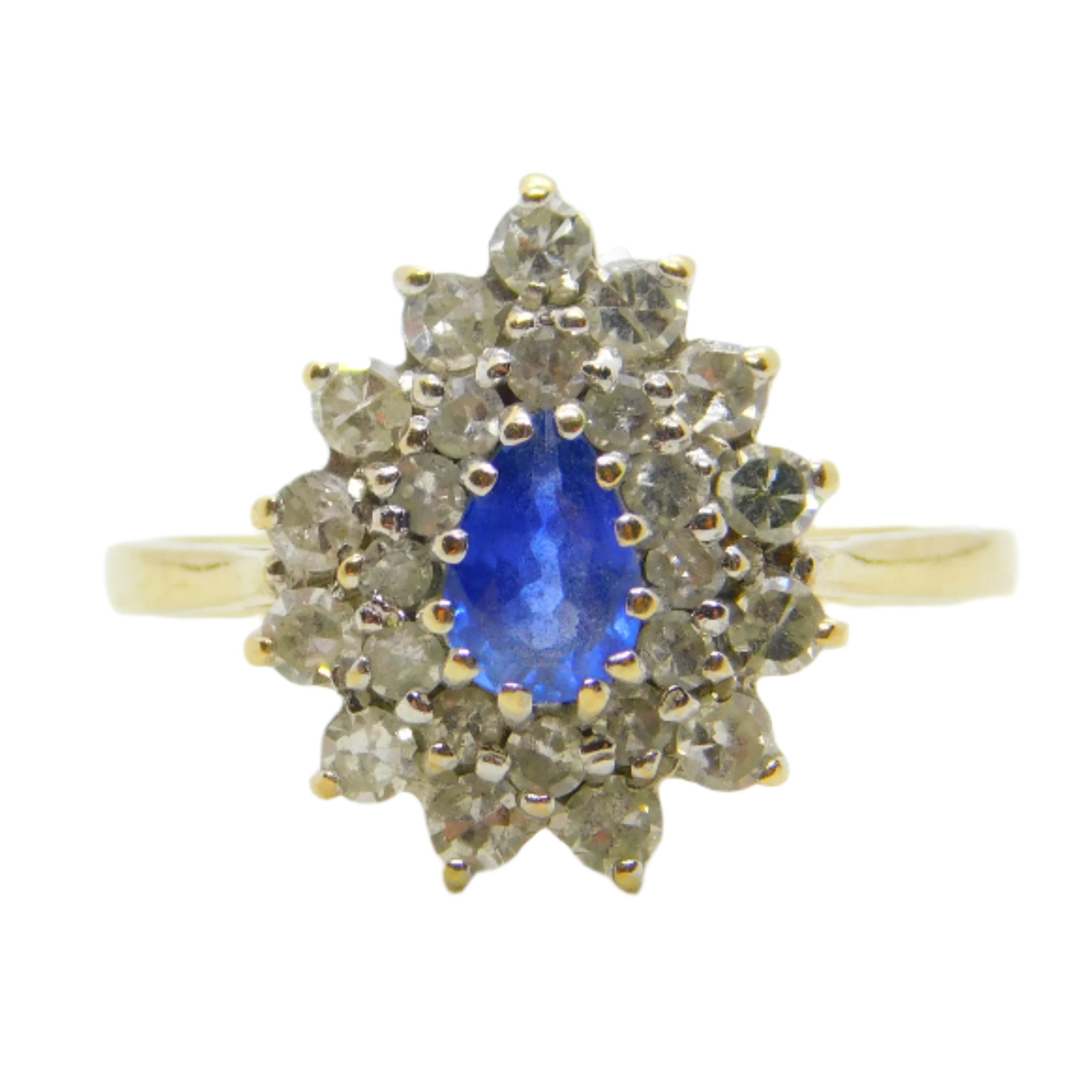9ct Yellow Gold, 0.3ct Sapphire & Diamond Pear Shaped Cluster Ring Vintage 1991