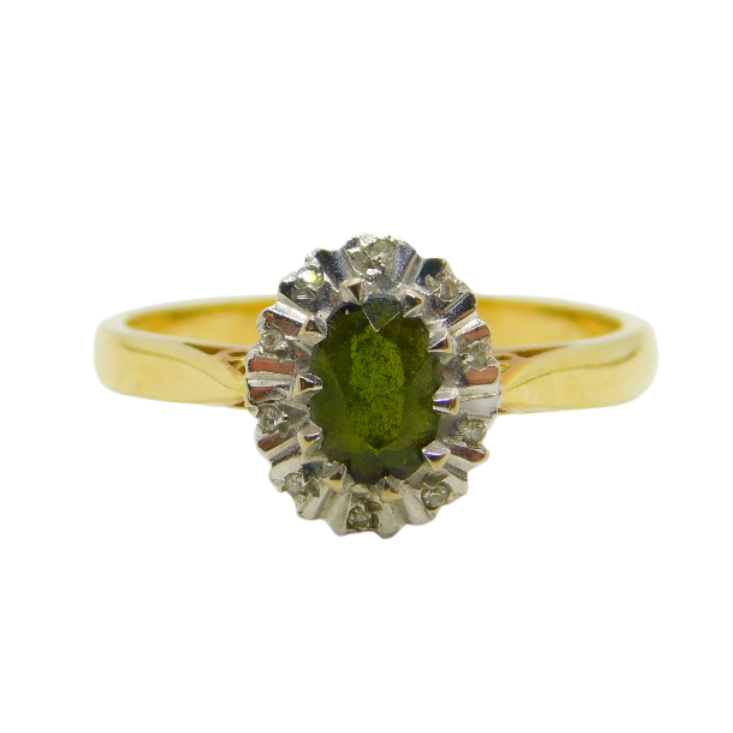 18ct Yellow Gold, Green Tourmaline & Diamond Floral Cluster Ring Vintage 1972 London