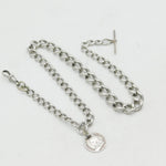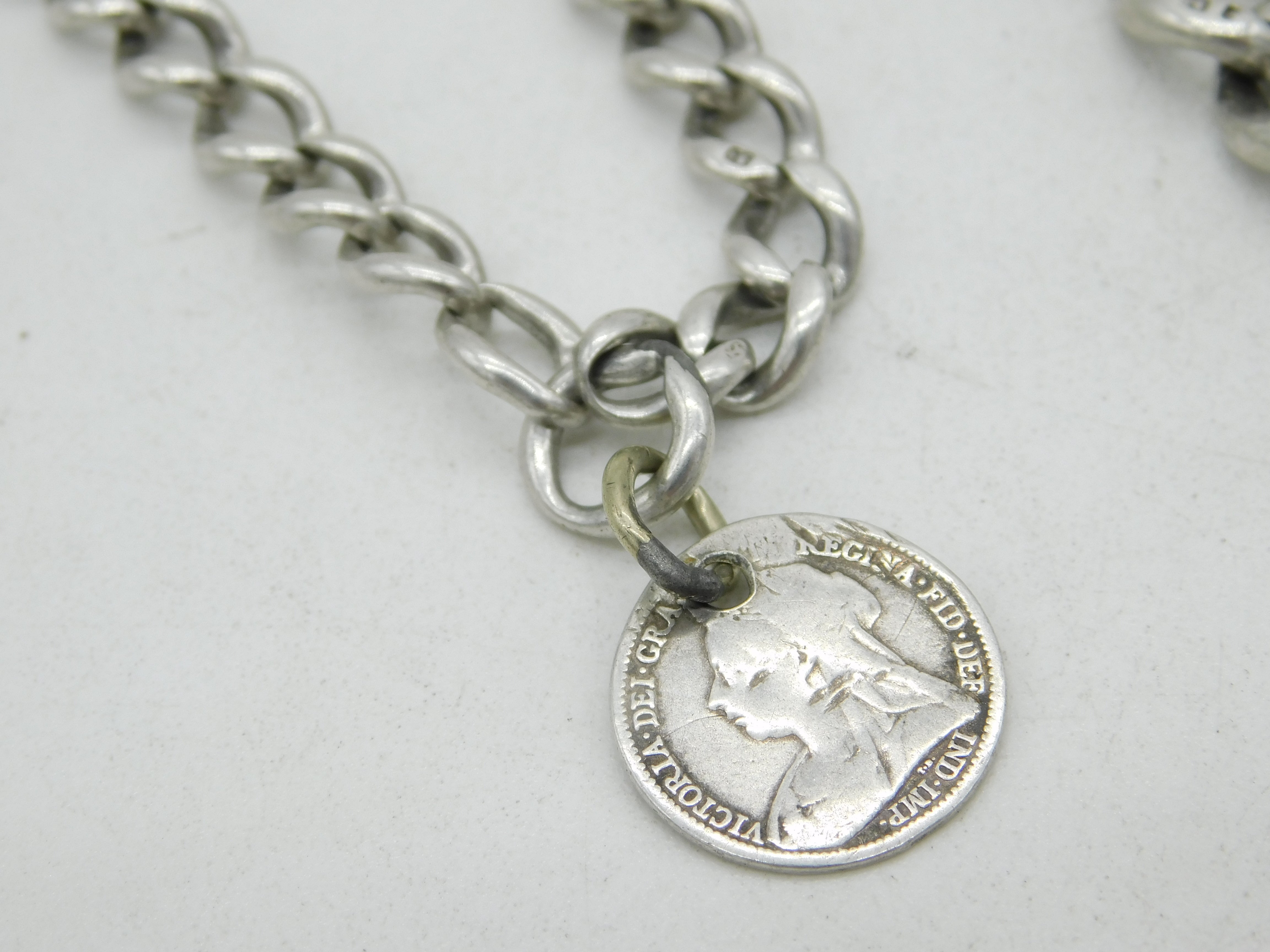 Details: A fantastic and wonderfully designed antique Victorian sterling silver graduating single albert watch chain with t-bar and coin fob, hallmarked to every link of the watch chain, the t-bar is more modern and is just hallmarked silver. This is a wonderful item that would make a perfect gift or addition to any collection.