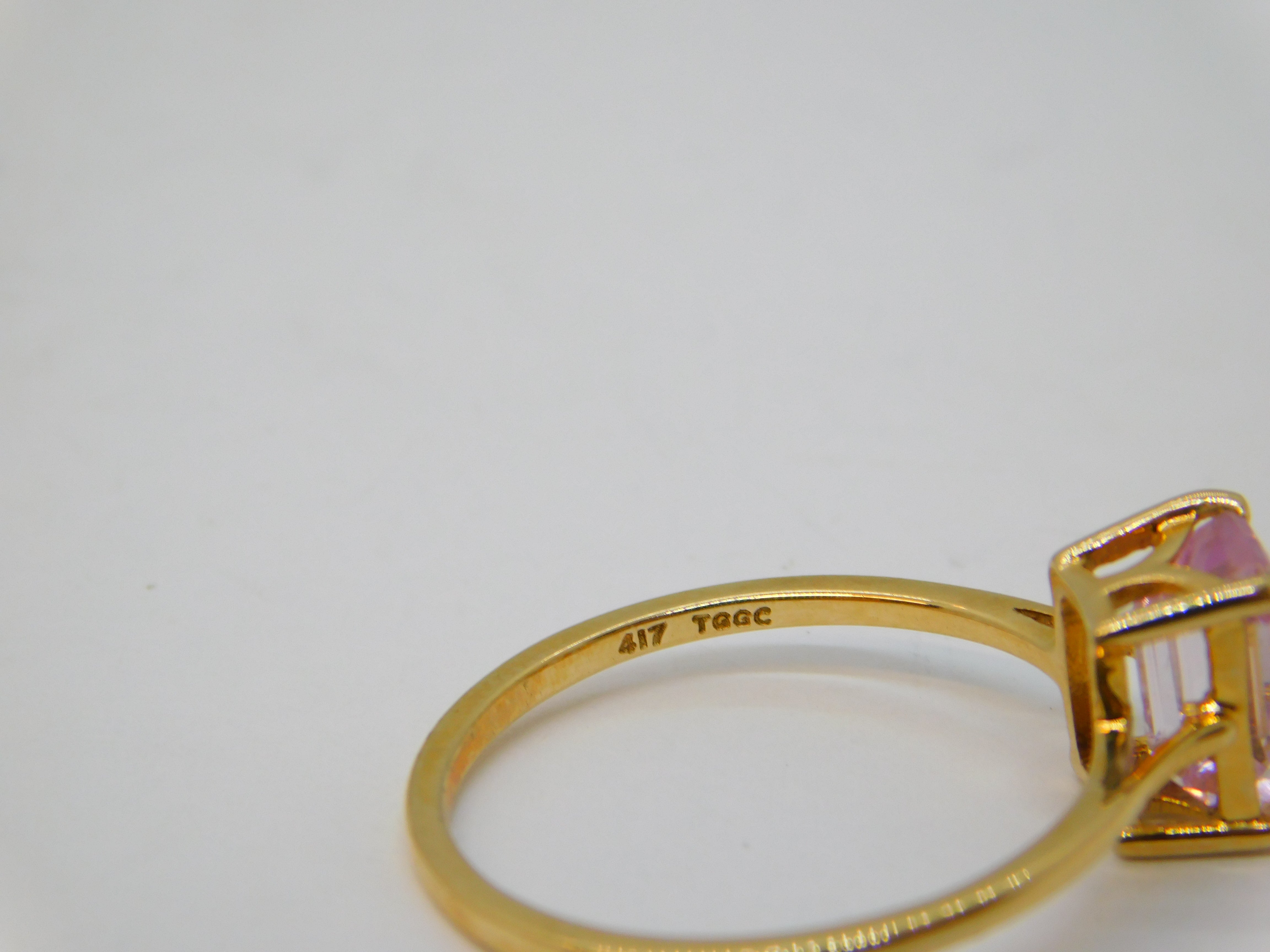 Details: A fantastic and wonderfully designed 9ct yellow gold baguette cut kunzite dress ring with lovely detailing hallmarked to the interior, included with the original authentication report. This is a wonderful item that would make a perfect gift or addition to any collection. We are more than happy to provide XRF reports for items upon request.