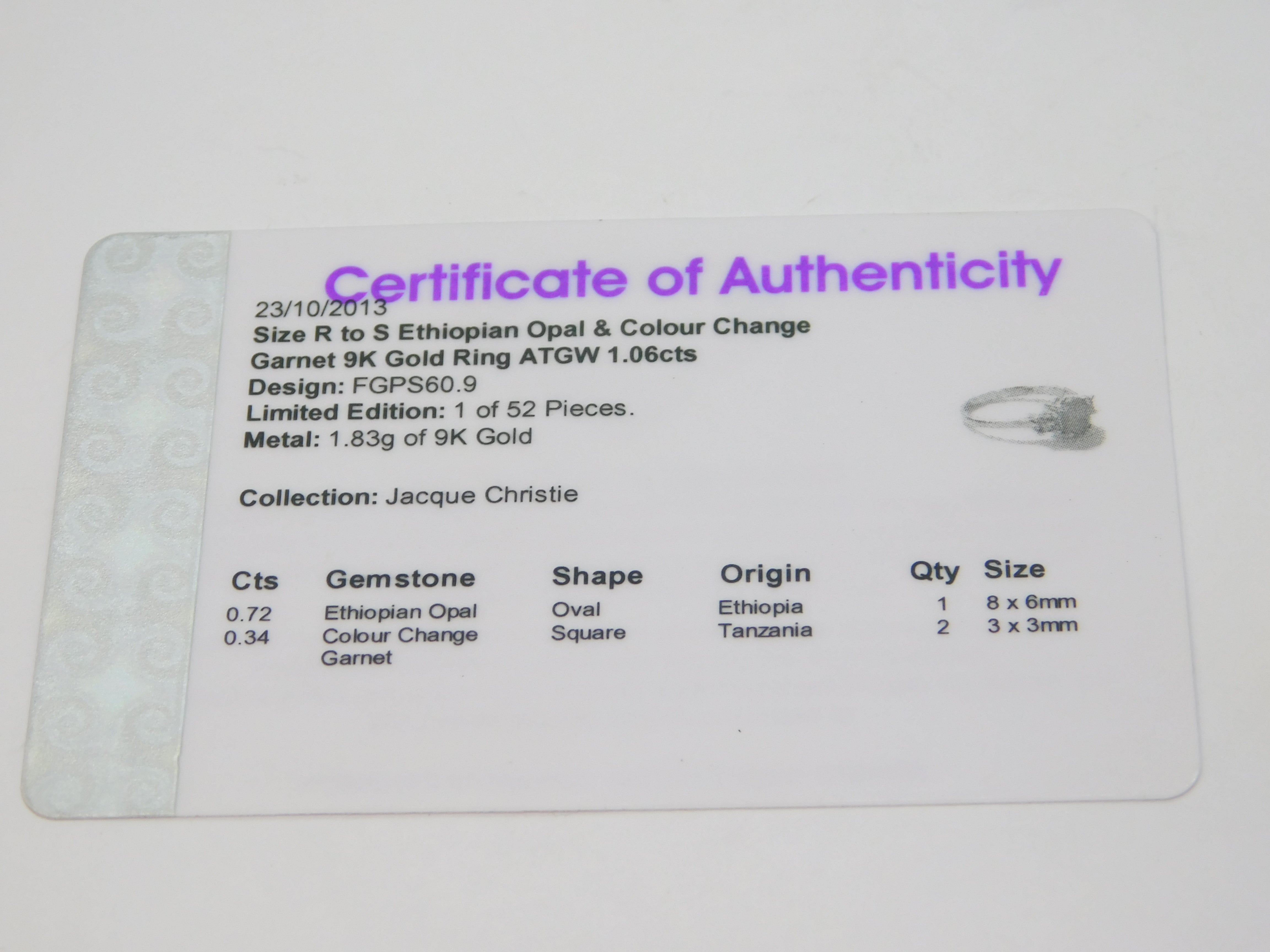 Details: A fantastic and wonderfully designed vintage 10ct yellow gold, ethiopian opal and garnet set dress ring hallmarked to the interior, the original authentication certificate is included. This is a wonderful item that would make a perfect gift or addition to any collection. We are more than happy to provide XRF reports for items upon request.