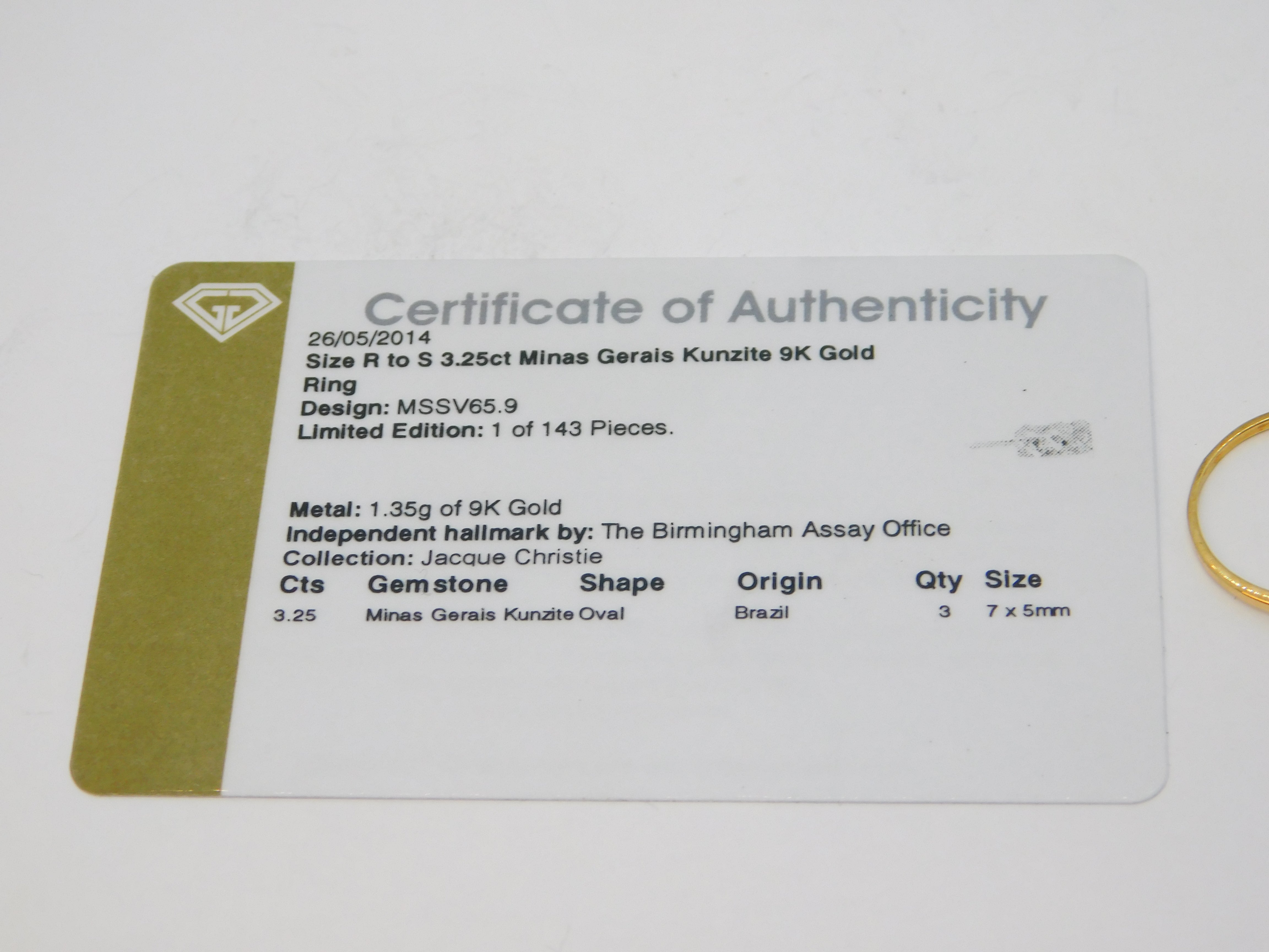 Details: A fantastic and wonderfully designed vintage 10ct yellow gold & three-stone kunzite dress ring with lovely detailing hallmarked to the interior, included with the original authentication certificate. This is a wonderful item that would make a perfect gift or addition to any collection. We are more than happy to provide XRF reports for items upon request.
