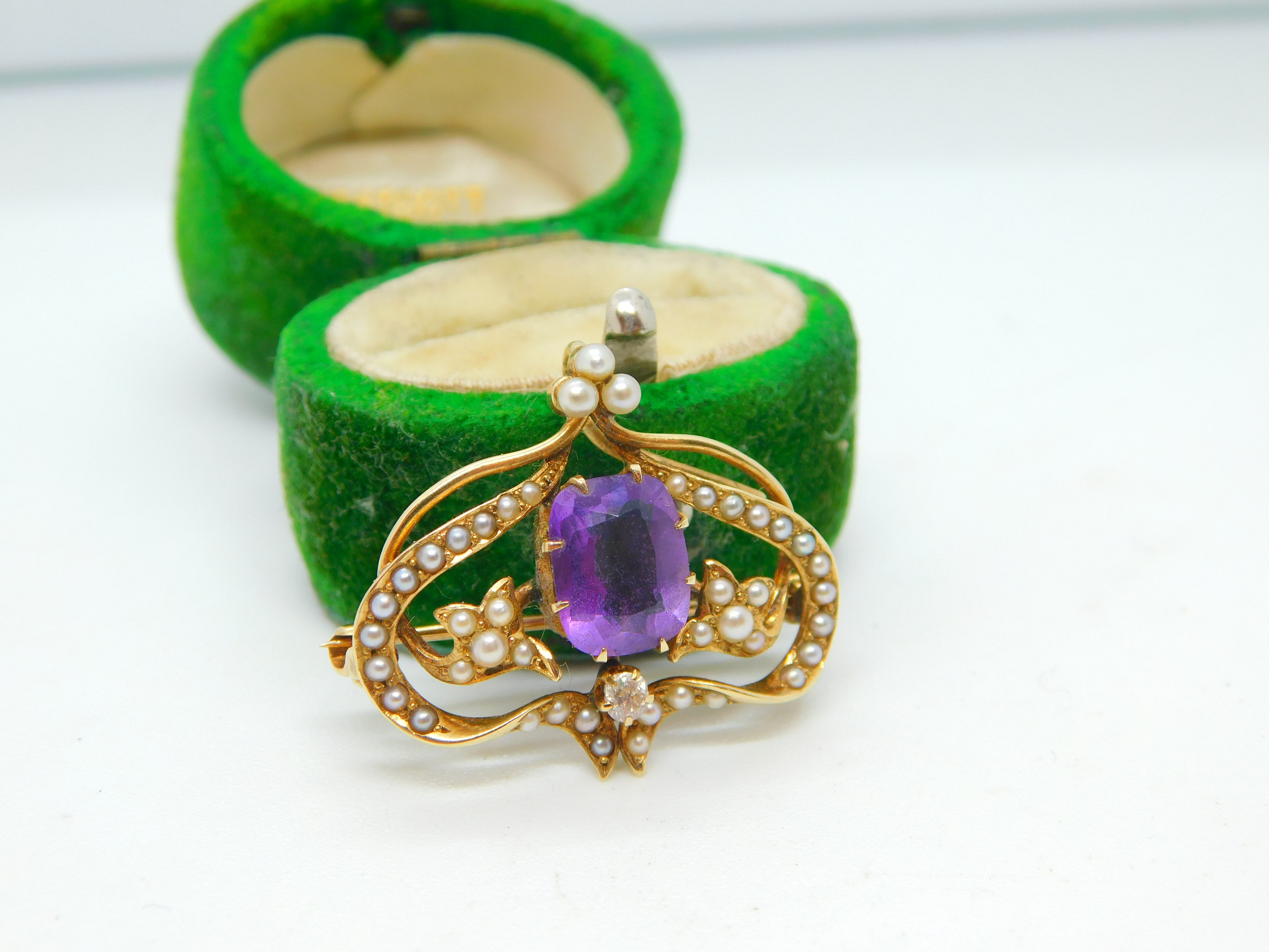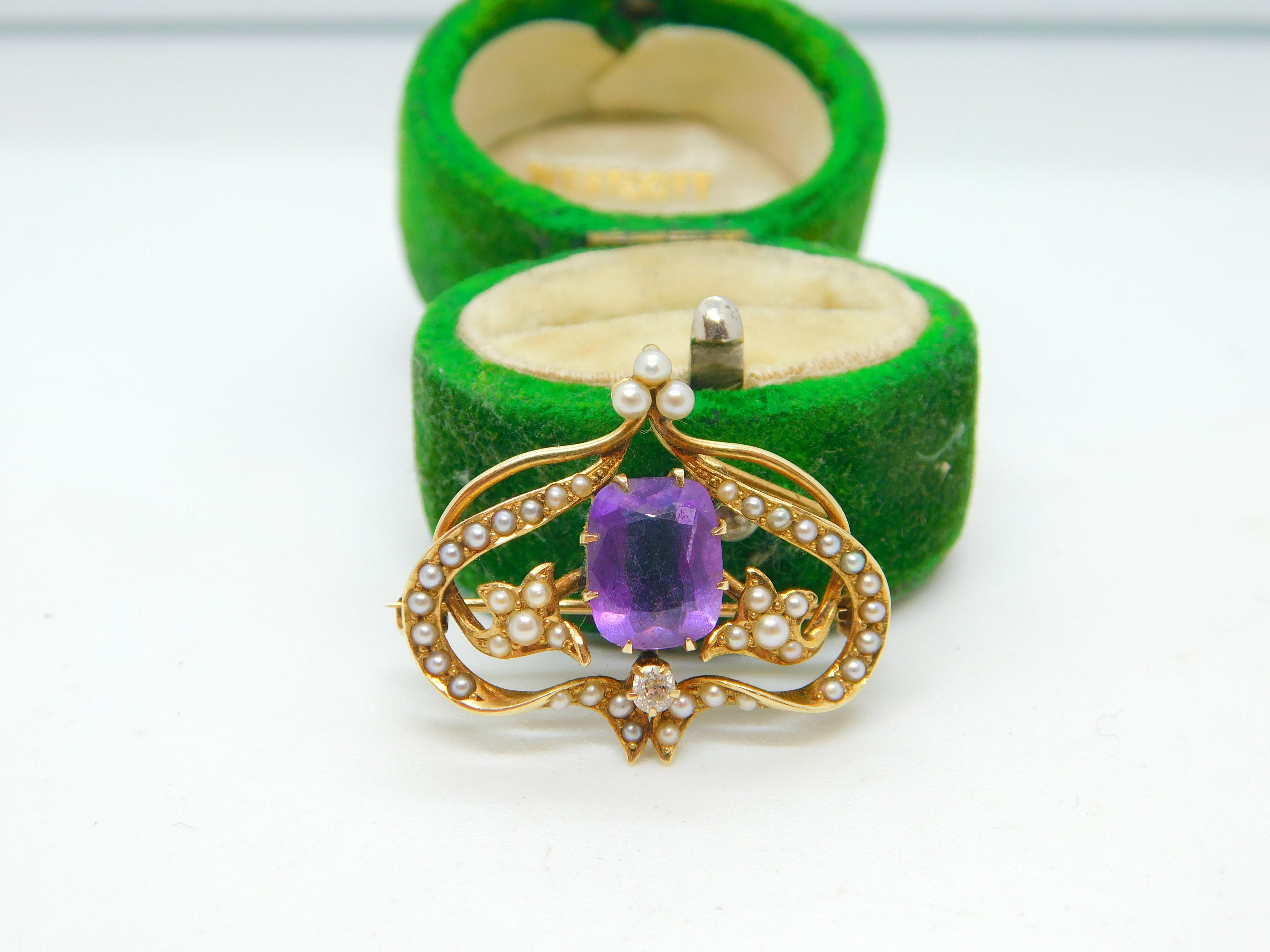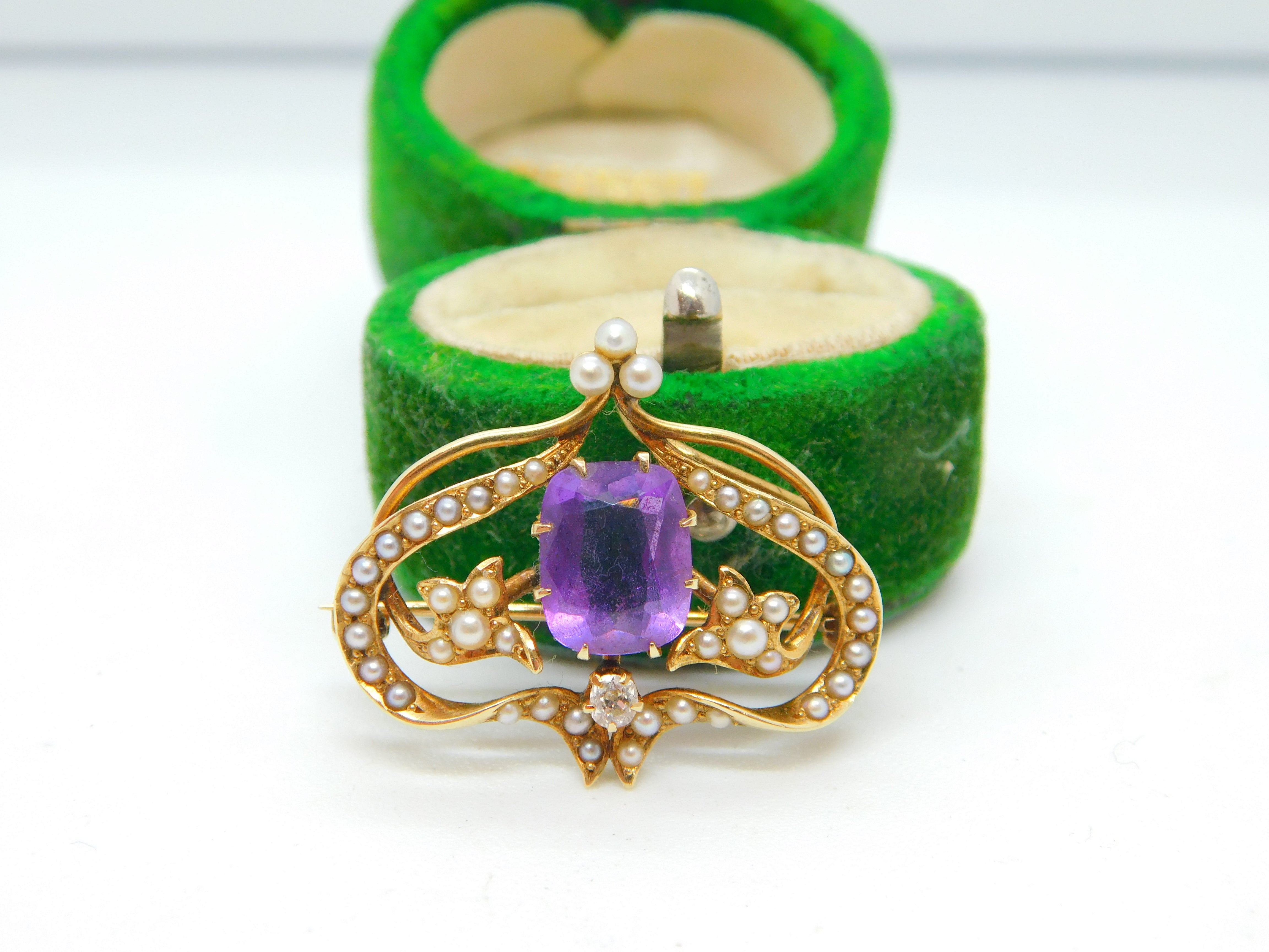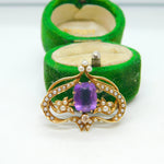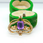 14ct Gold, Amethyst, Seed Pearl & Diamond Floral Brooch Pendant Antique c1920