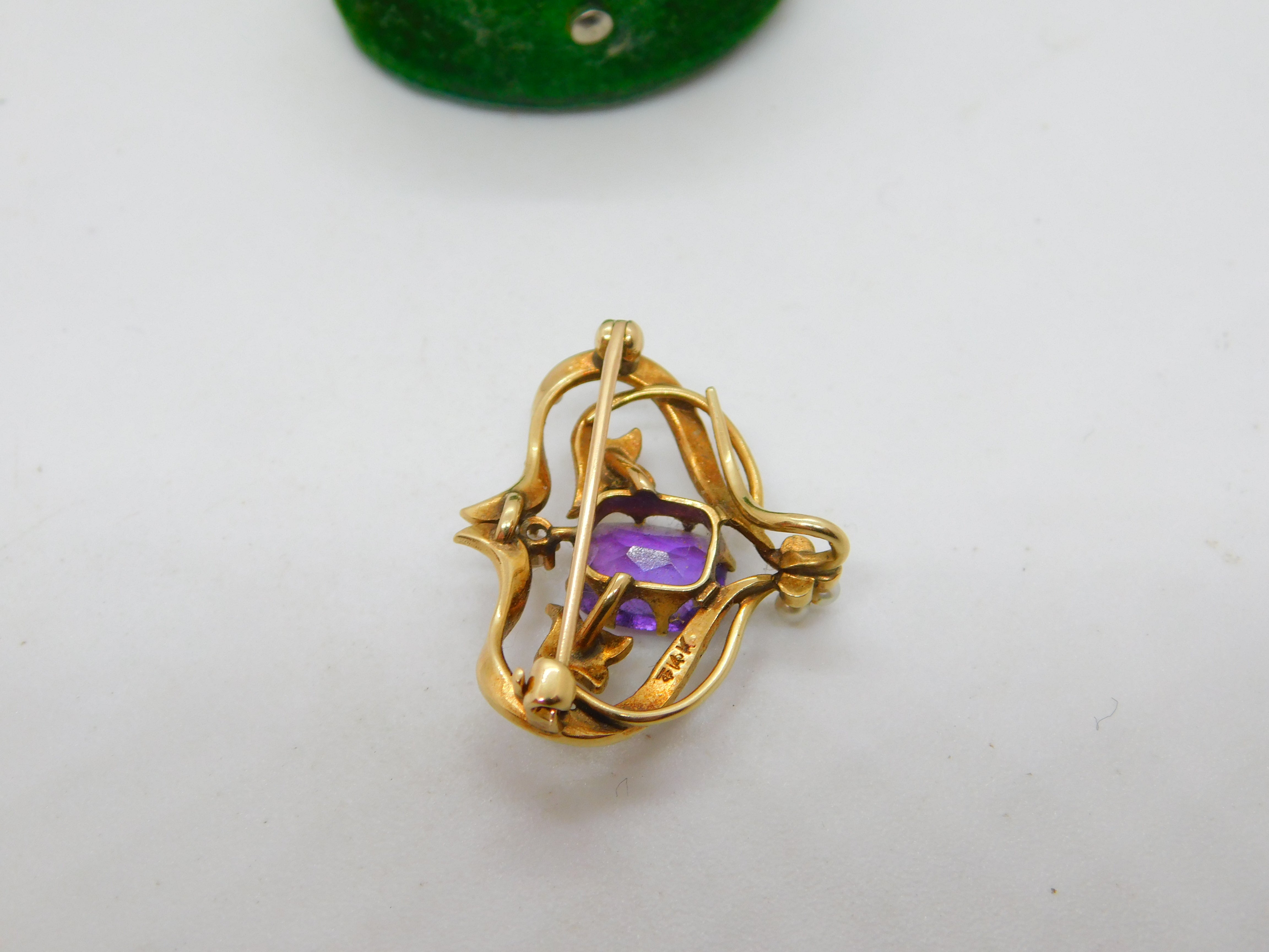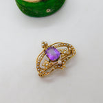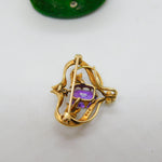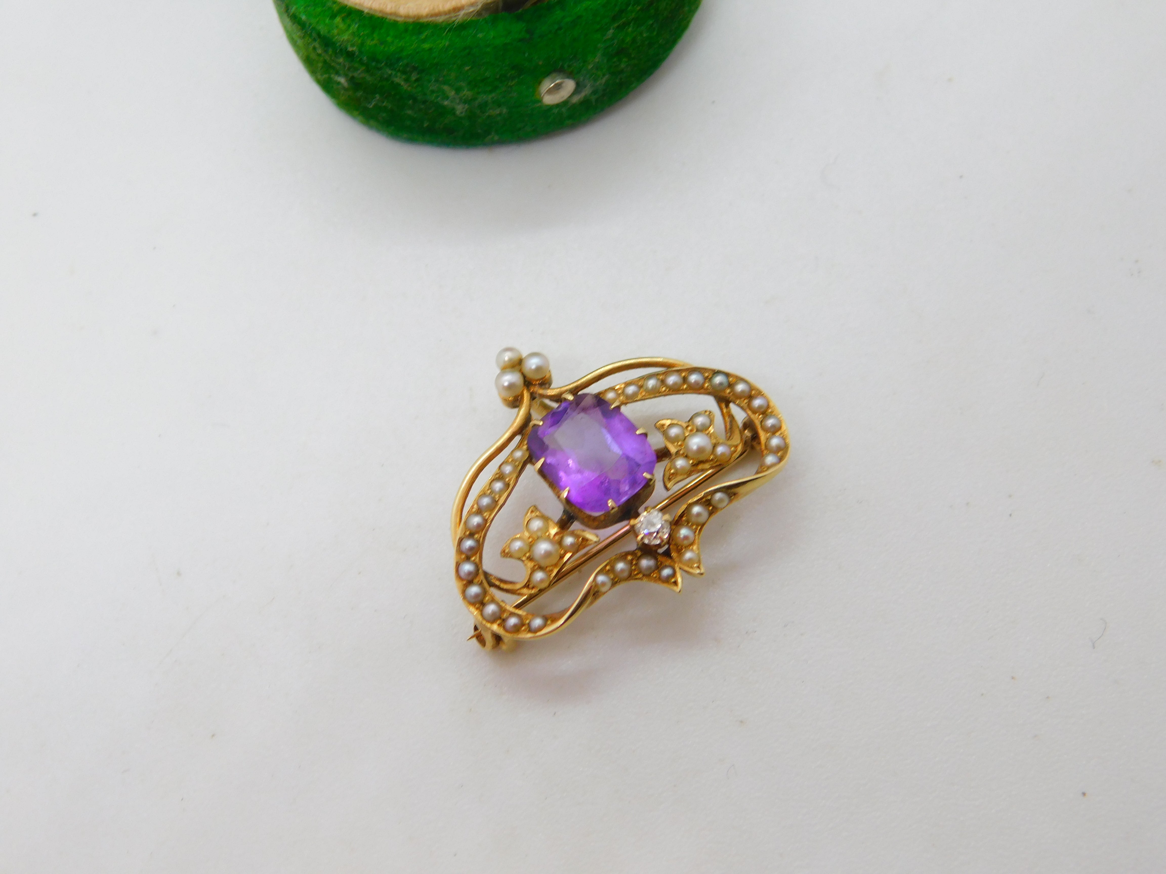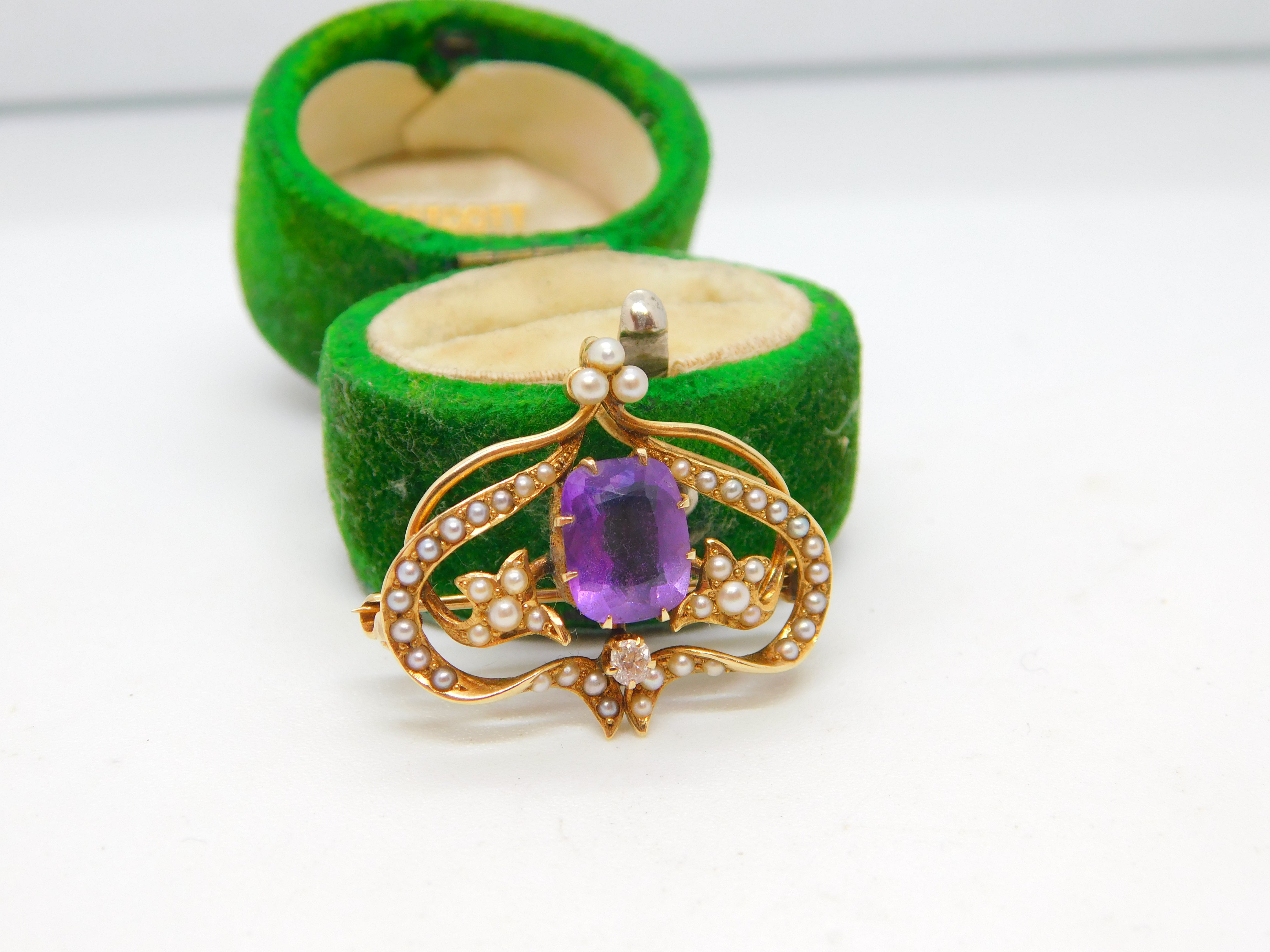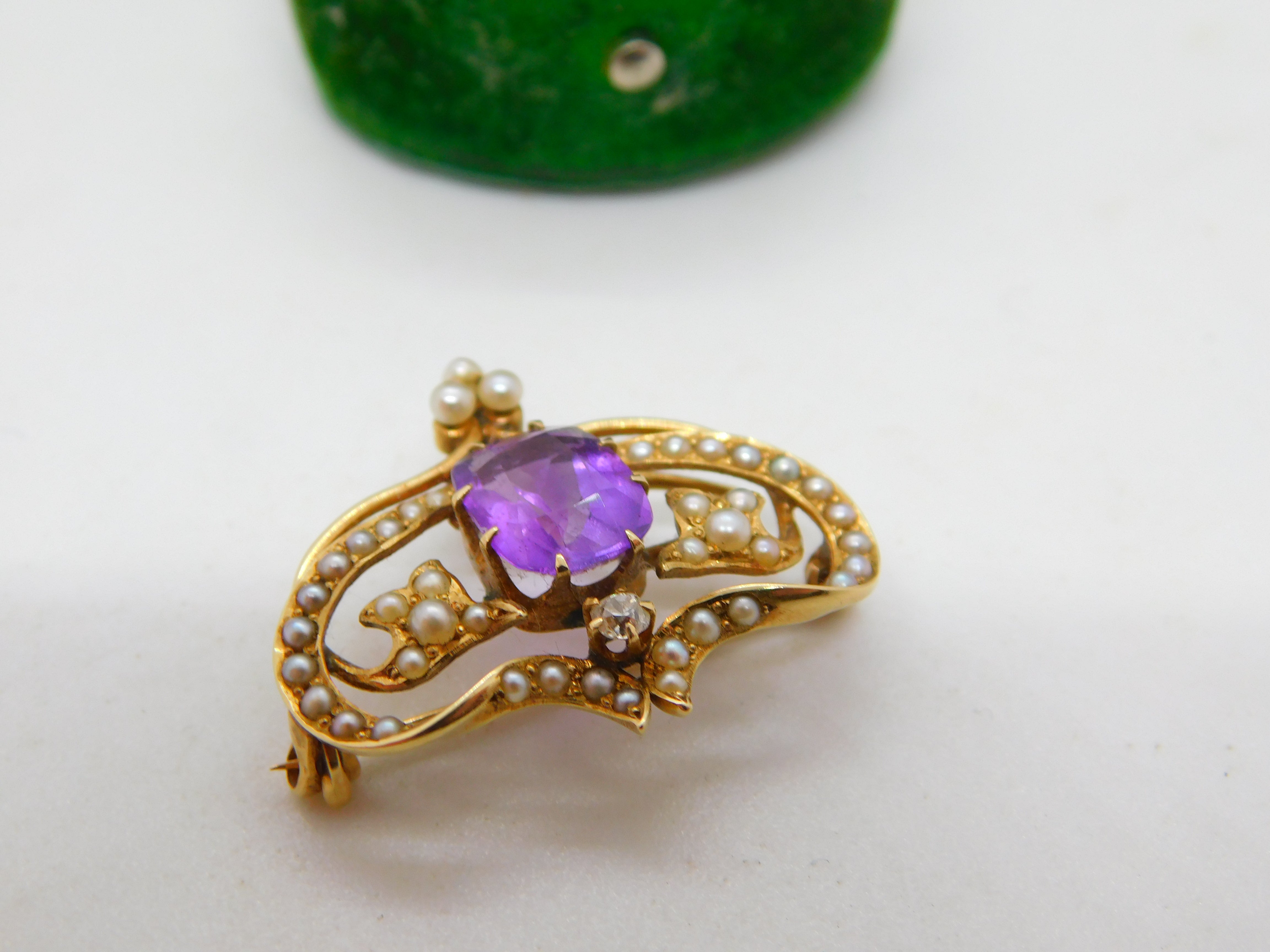 14ct Gold, Amethyst, Seed Pearl & Diamond Floral Brooch Pendant Antique c1920