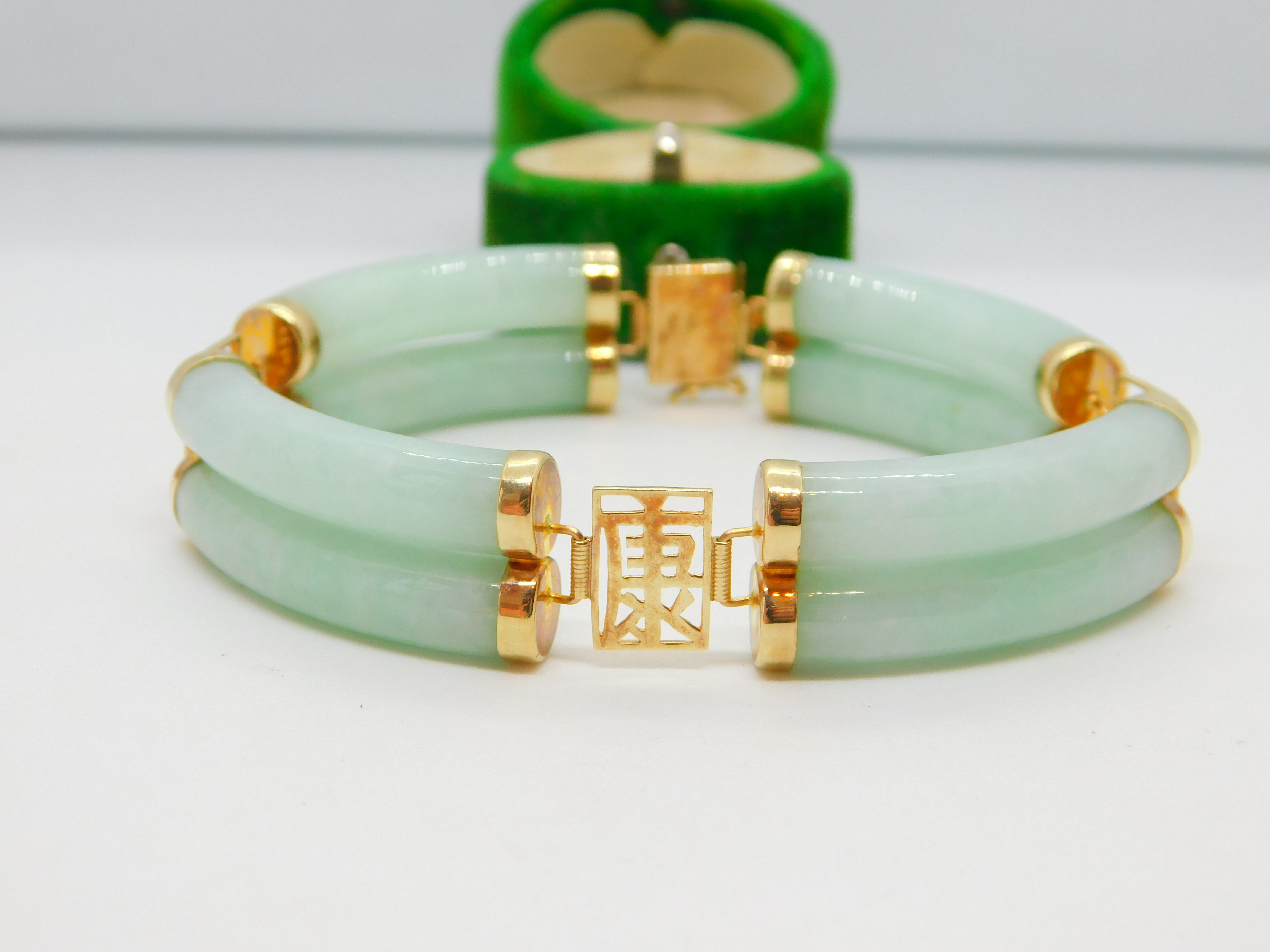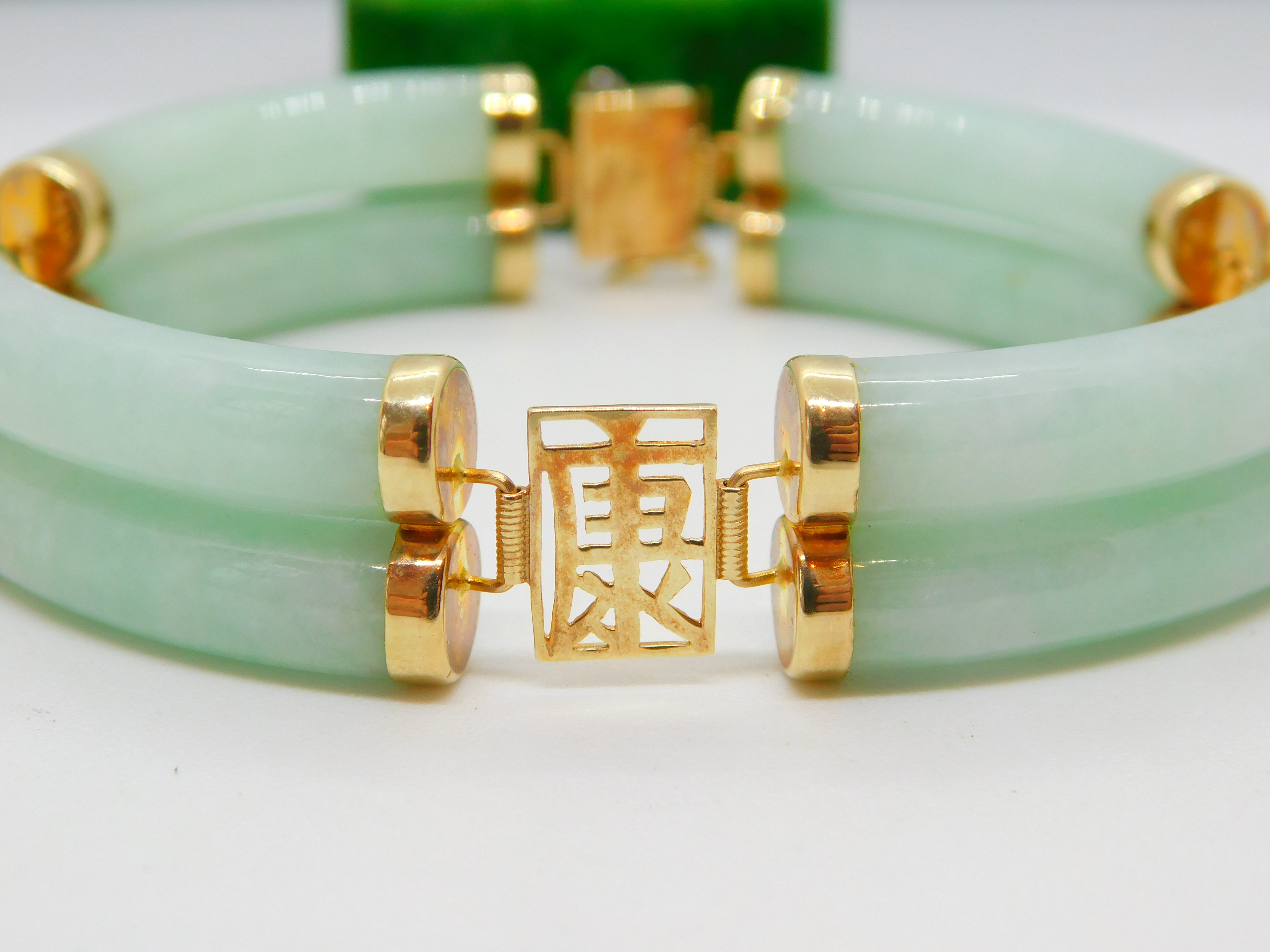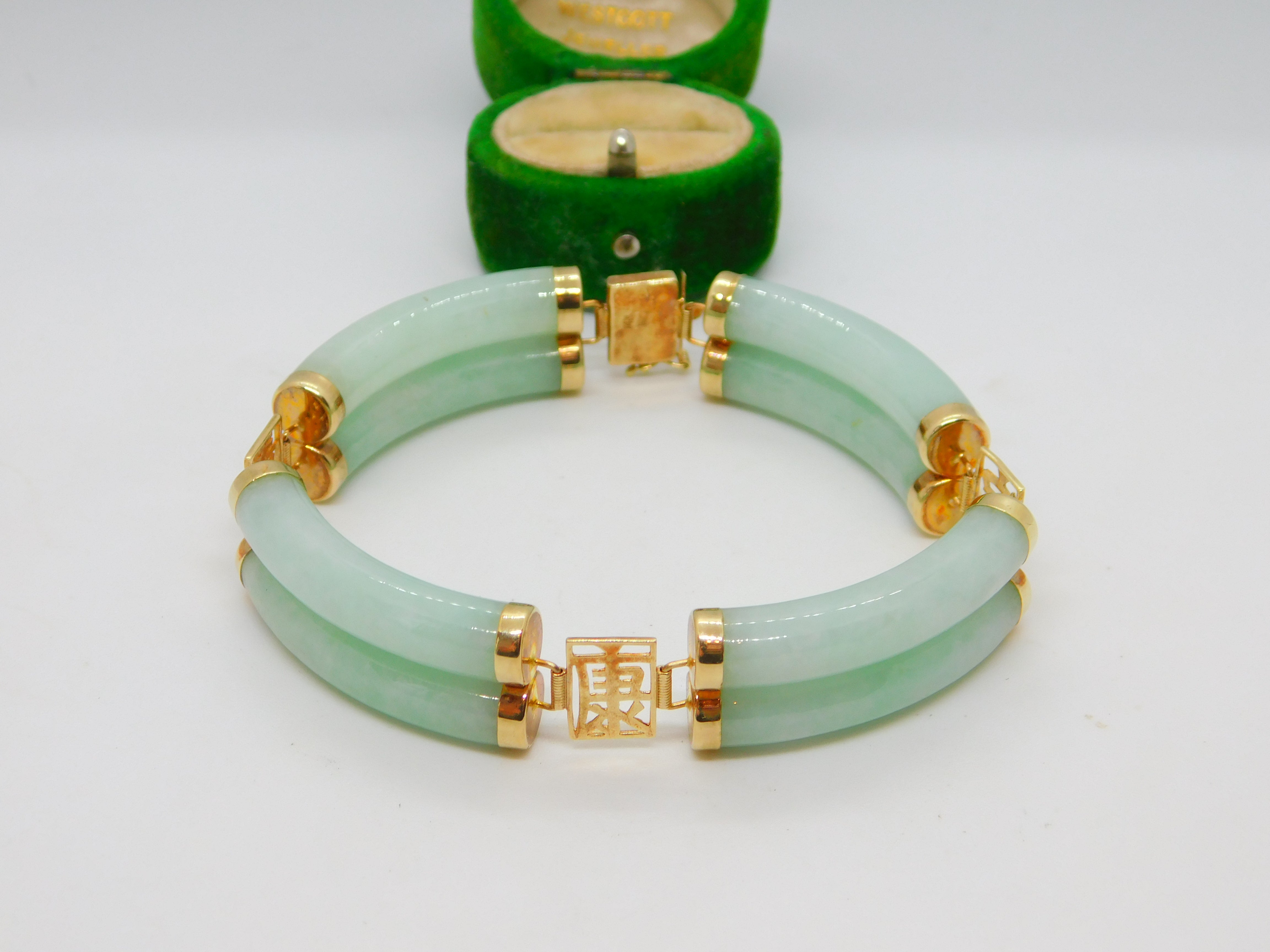 Details: A fantastic and wonderfully designed vintage 14ct yellow gold & apple green jade chinese character panel bracelet with lovely detailing hallmarked Birmingham 2001 to the clasp. This is a wonderful item that would make a perfect gift or addition to any collection. The BOX pictured is for PRESENTATION ONLY and is NOT included in the listings but used to frame the pictures unless specifically stated otherwise.