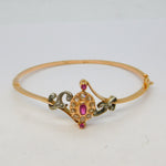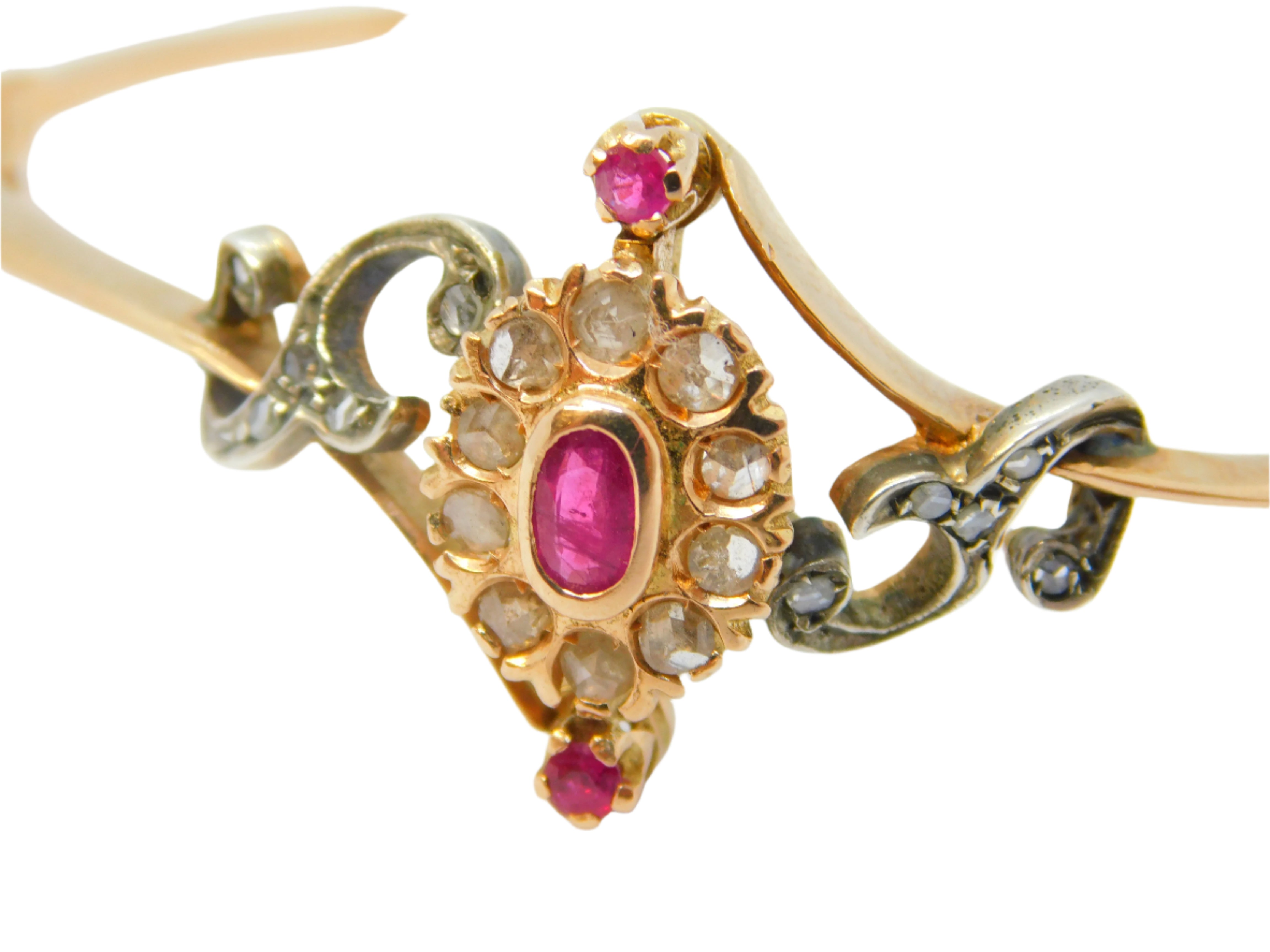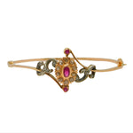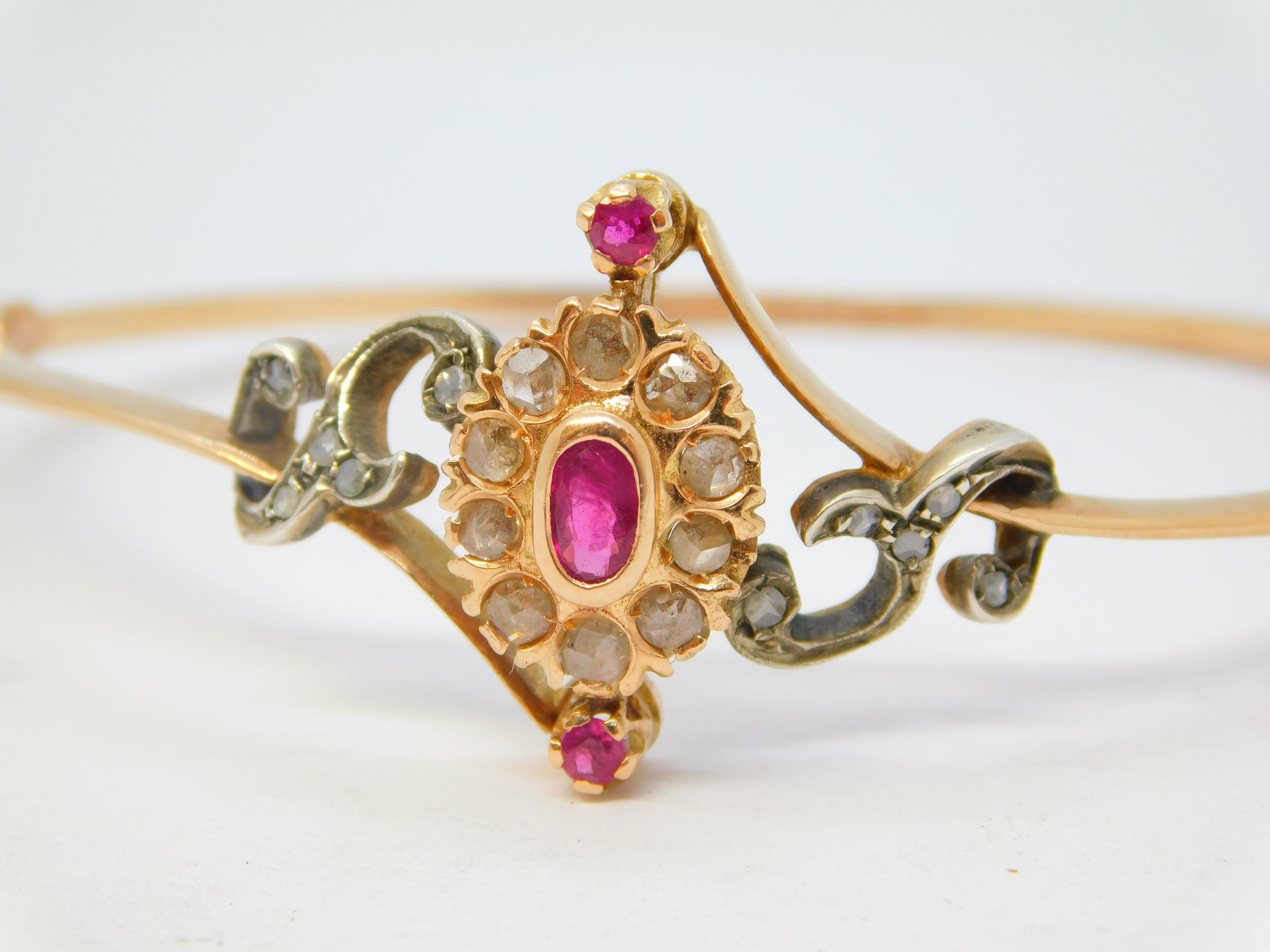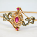 14ct Rose Gold, 1ct Old-Cut Diamond & Ruby Crossover Bangle Bracelet Antique c1920