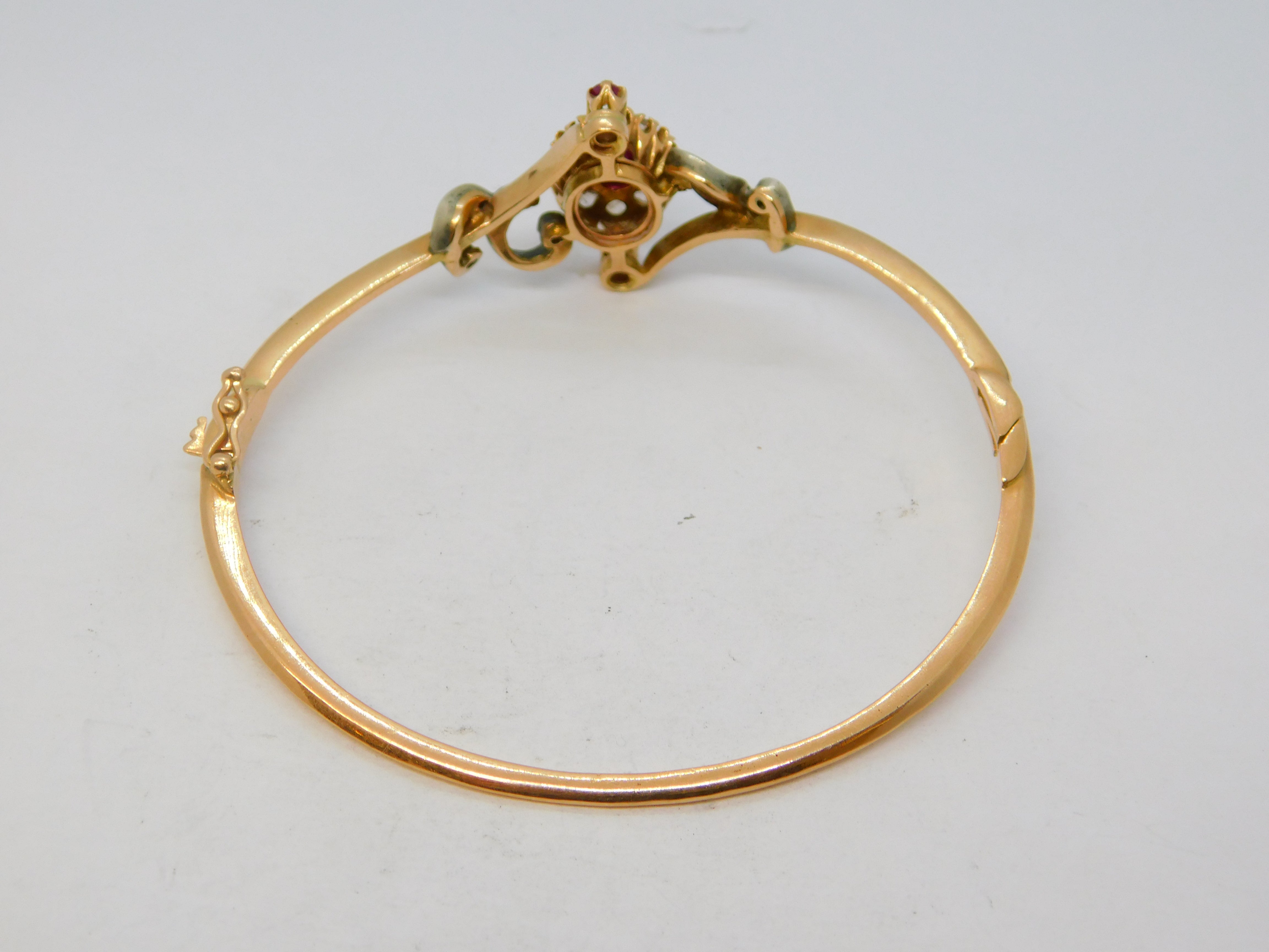 Details: A fantastic and wonderfully designed antique art deco 20th century 14ct rose gold floral crossover pattern bange set to the centre with three graduating rubies, the central ruby flanked by approximately 1ct old-cut diamonds alongside further small diamodns to the floral shoulders, hallmarked to the interior bangle and all the stones have been tested, a stunning example. This is a wonderful item that would make a perfect gift or addition to any collection.