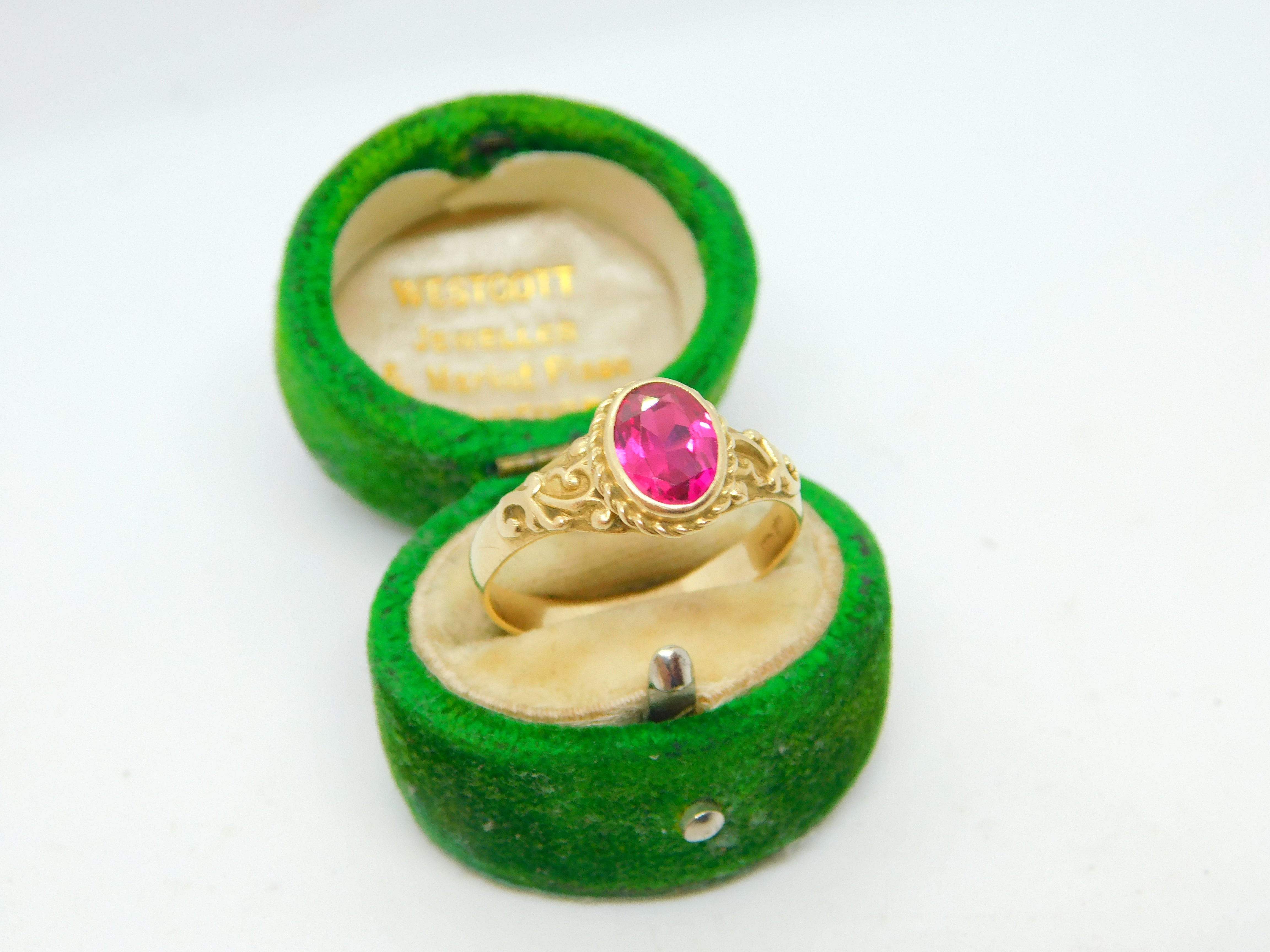 Details: A fantastic and wonderfully designed vintage 14ct yellow gold & 1ct natural ruby set dress ring with charming floral shoulders hallmarked to the interior band c1970. This is a wonderful item that would make a perfect gift or addition to any collection. The BOX pictured is for PRESENTATION ONLY and is NOT included in the listings but used to frame the pictures unless specifically stated otherwise.