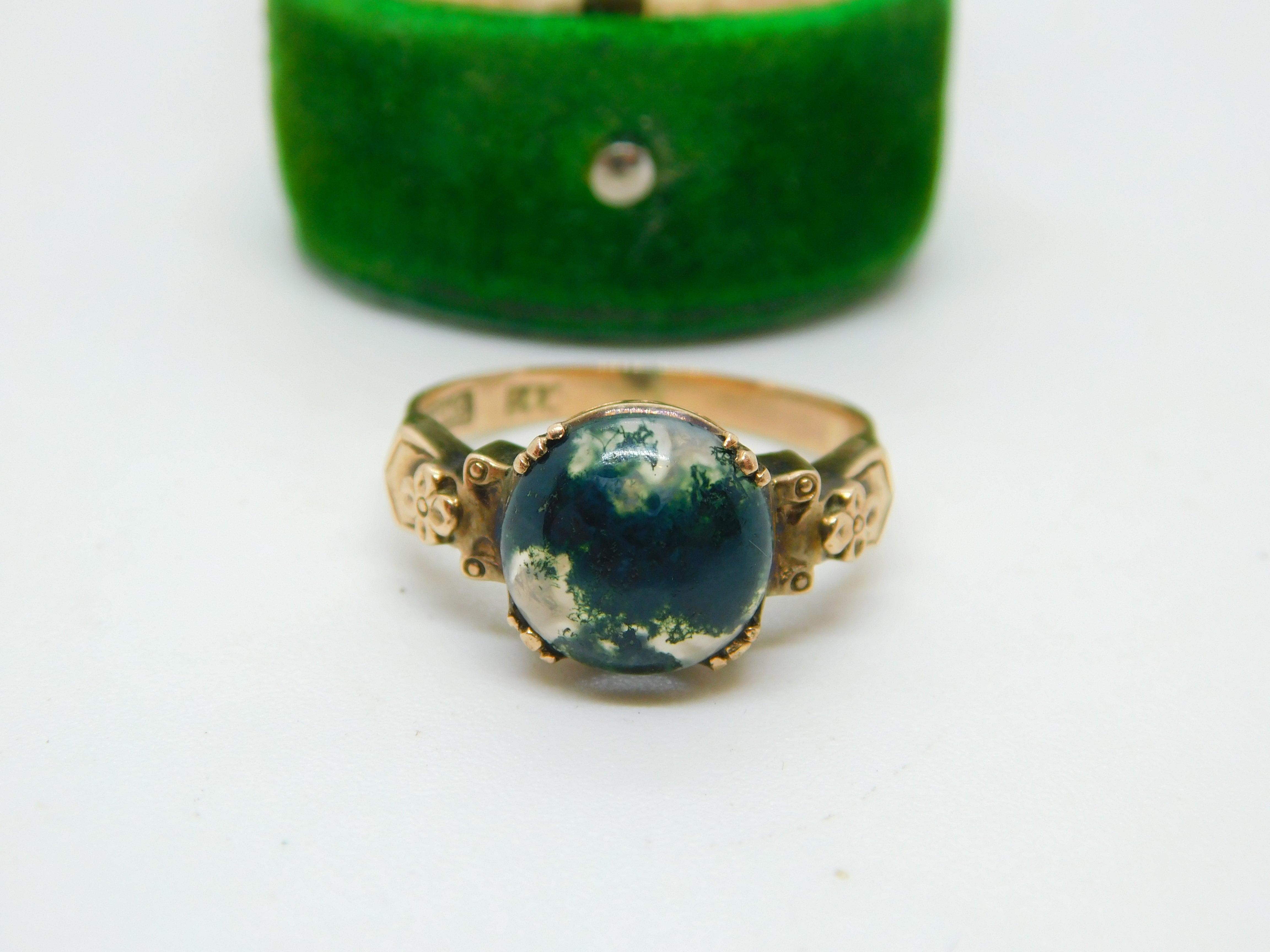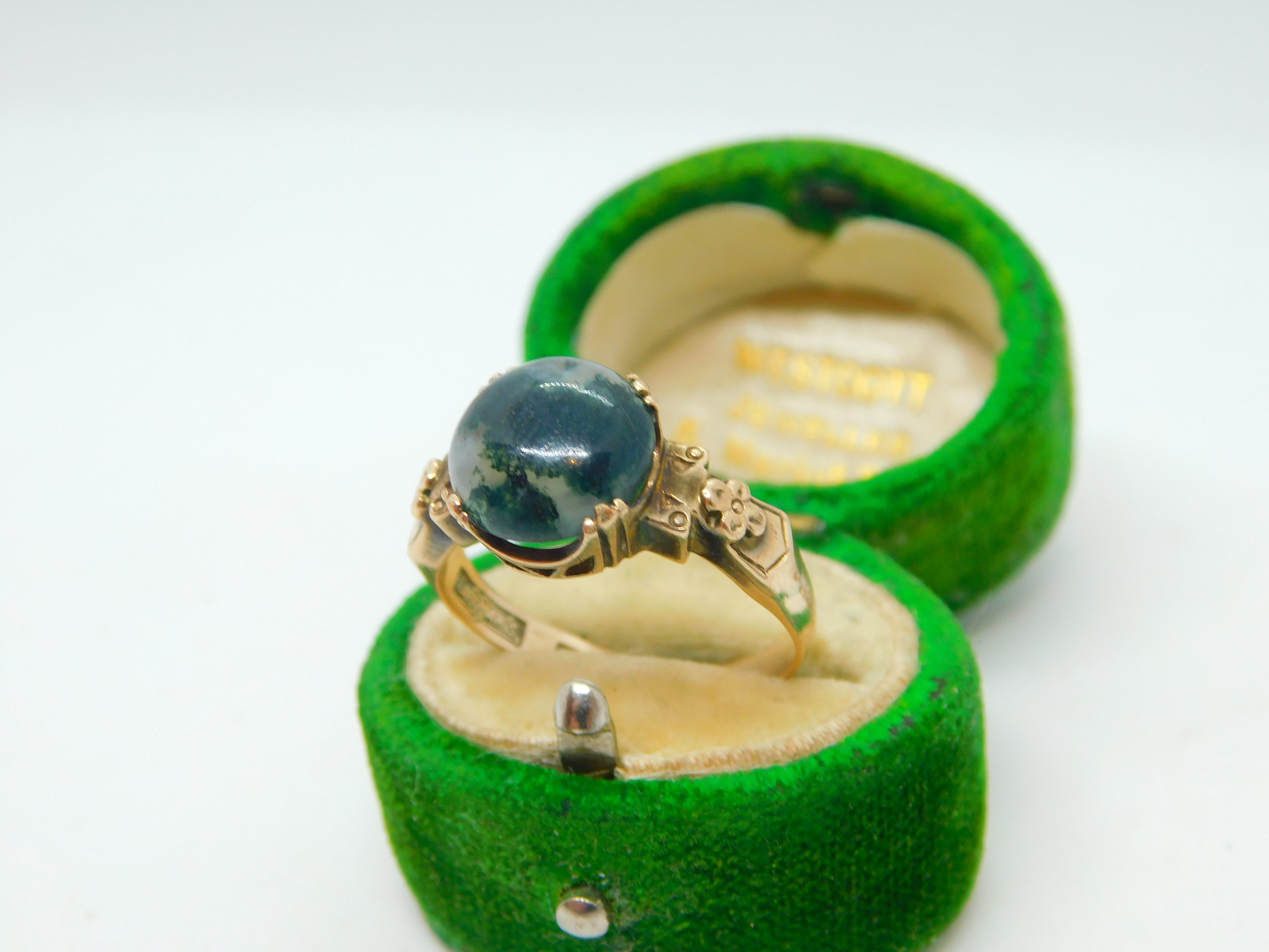Details: A fantastic and wonderfully designed antique art deco 14ct yellow gold floral pattern dress ring set with central cabochon moss agate stone hallmarked to the interior c1930. This is a wonderful item that would make a perfect gift or addition to any collection. The BOX pictured is for PRESENTATION ONLY and is NOT included in the listings but used to frame the pictures unless specifically stated otherwise.