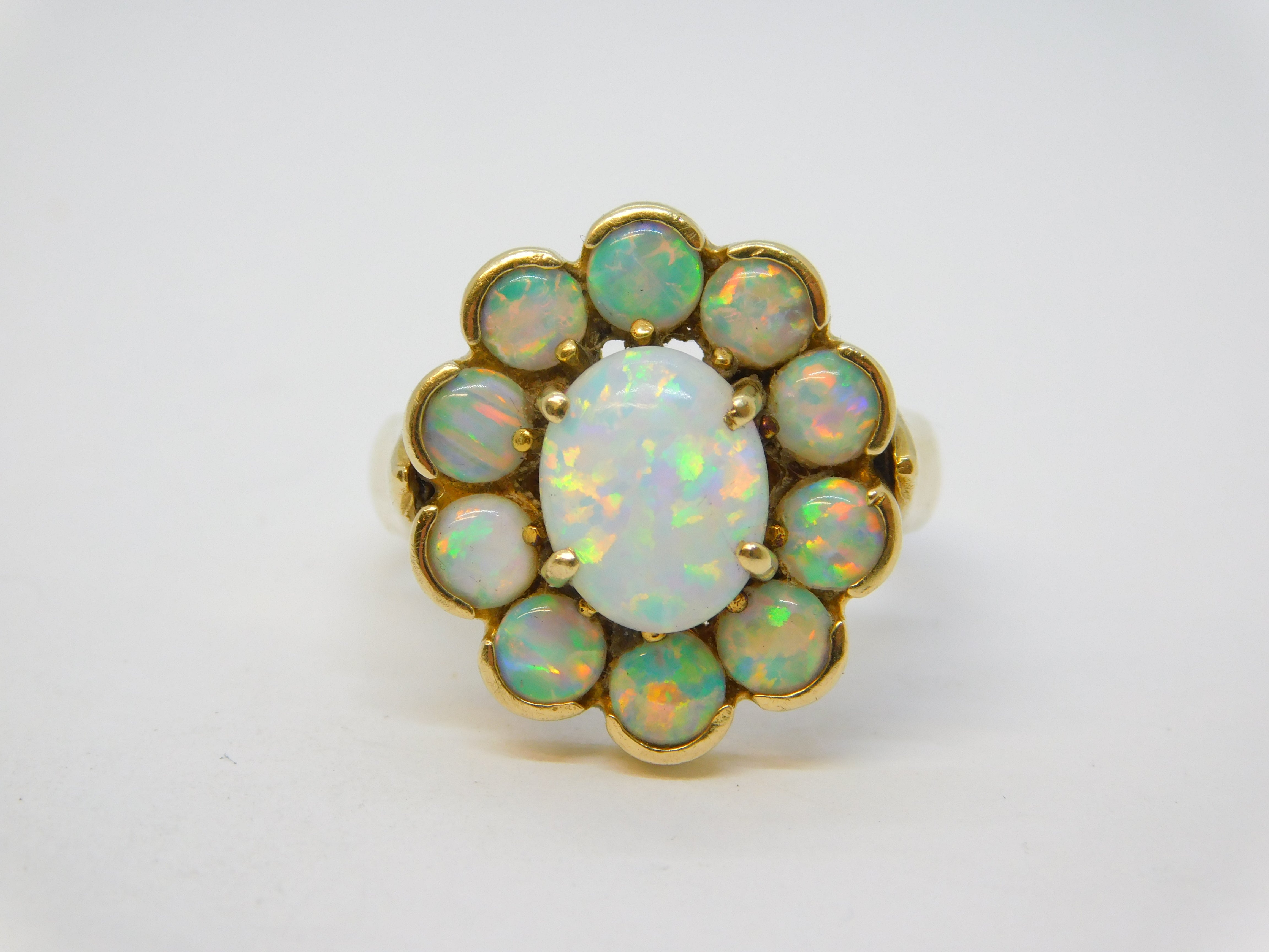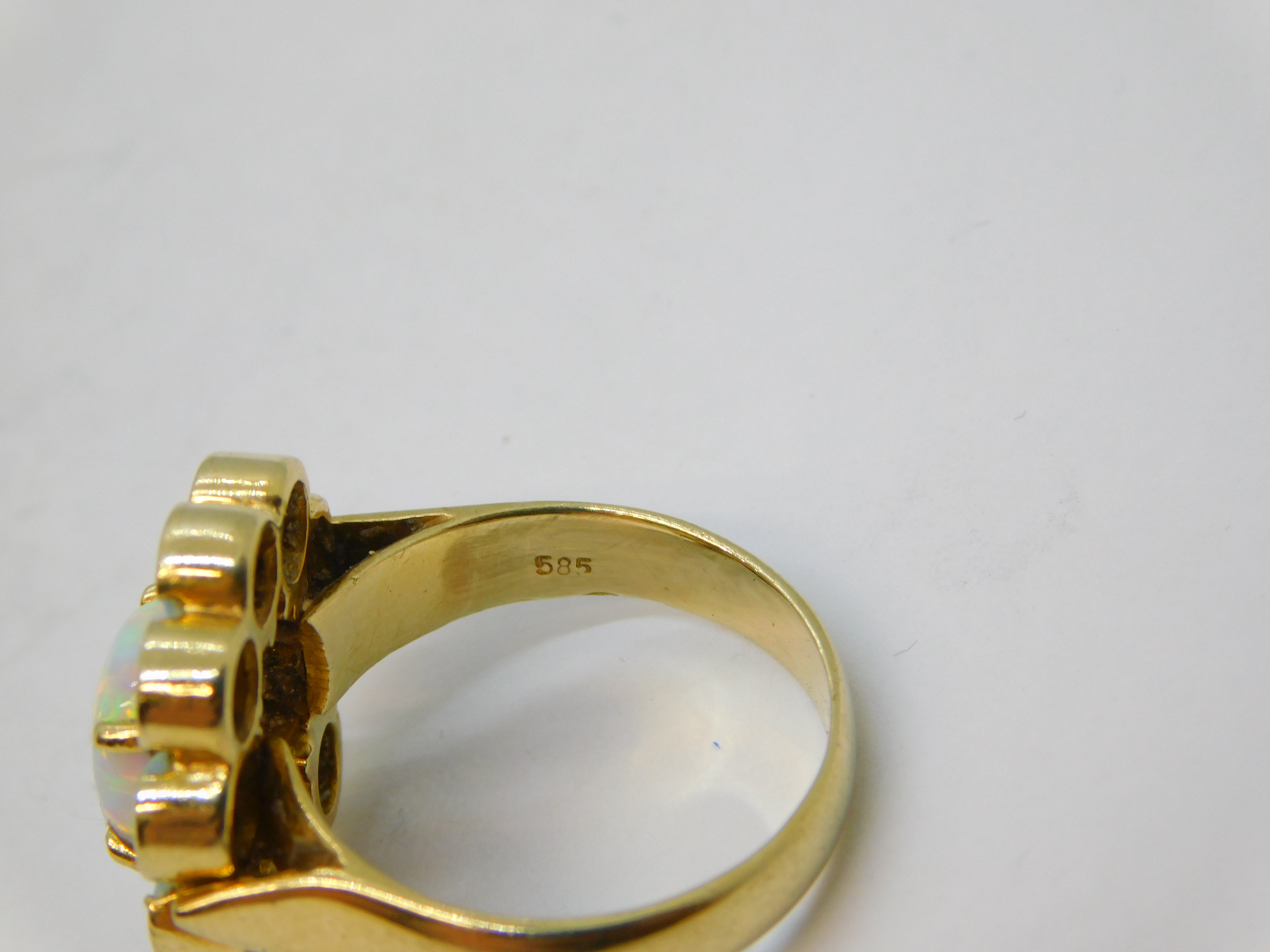 Details: A fantastic and wonderfully designed vintage 14ct yellow gold large floral cluster ring set with cabochon cut white opals, hallmarked '585' to the interior and XRF tested. This is a wonderful item that would make a perfect gift or addition to any collection. We are more than happy to provide XRF reports for items upon request.