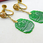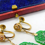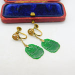14ct Yellow Gold Character Form Jade Screw-Back Drop Earrings Antique c1940