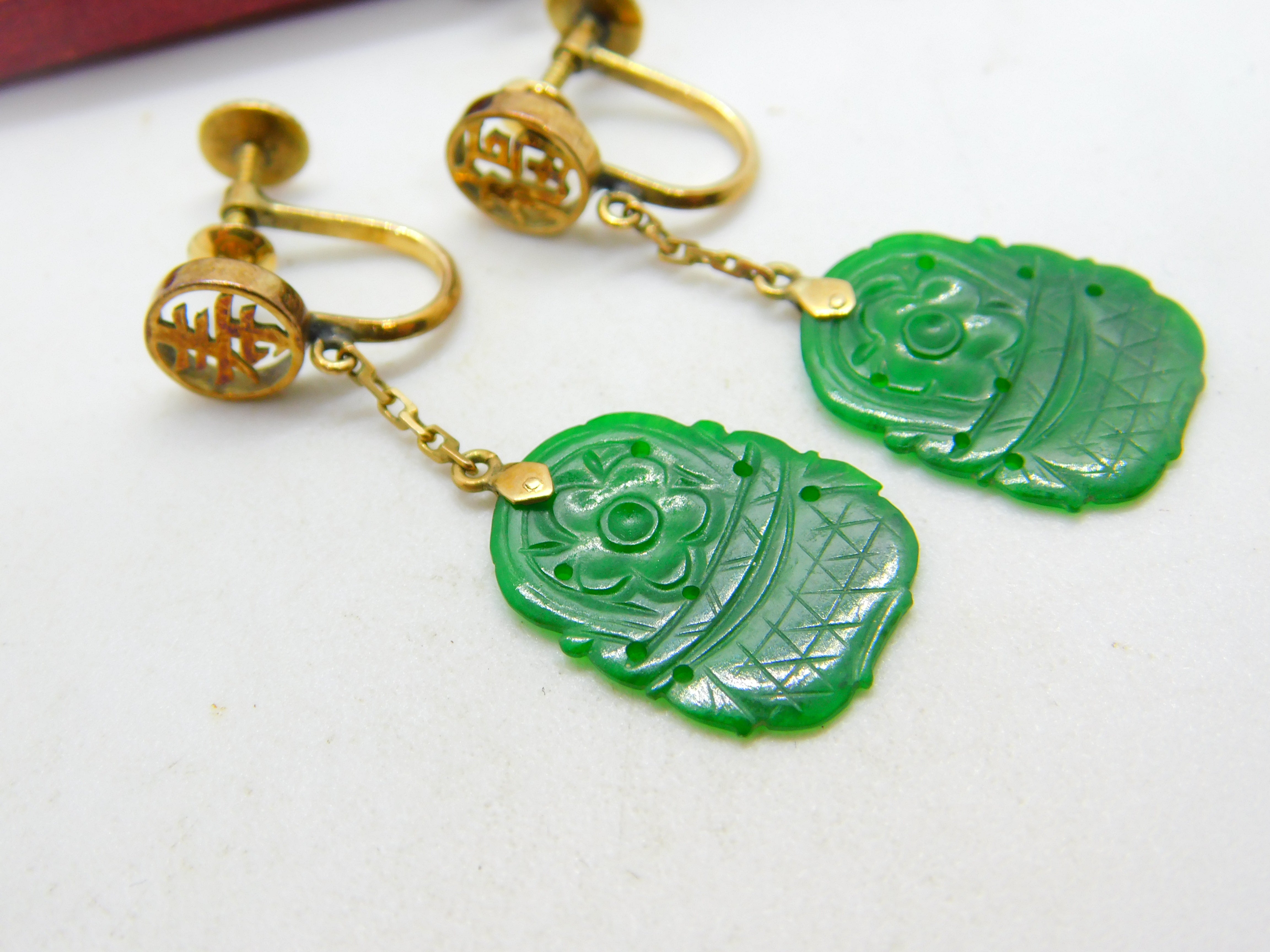 Details: A fantastic and wonderfully designed pair of antique art deco 14ct yellow gold character form screw-back earrings with jade drops c1940 marked 14K to the reverse. This is a wonderful item that would make a perfect gift or addition to any collection. The BOX pictured is for PRESENTATION ONLY and is NOT included in the listings but used to frame the pictures unless specifically stated otherwise.