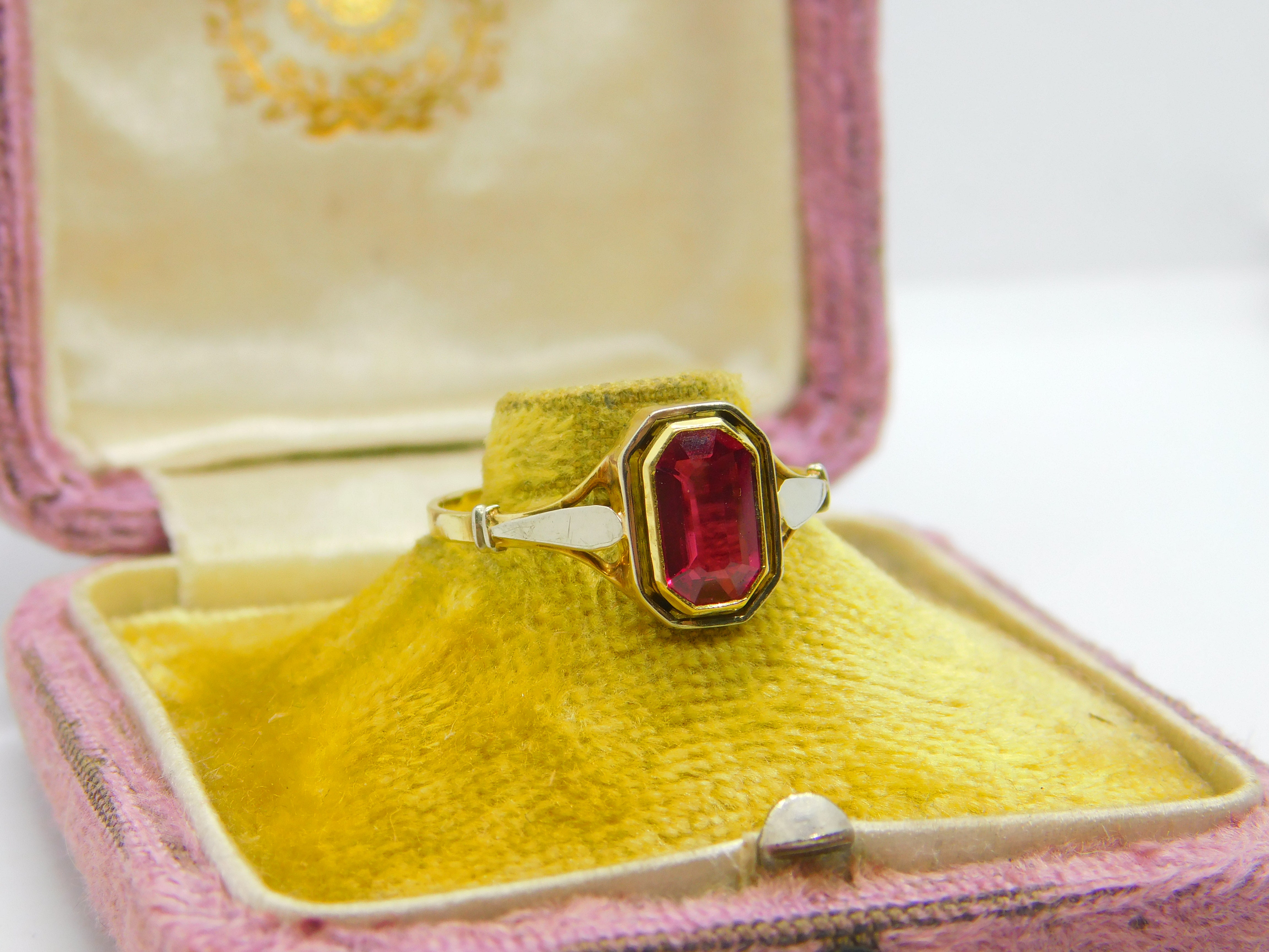 Details: A fantastic and wonderfully designed antique art deco 14ct yellow gold dress ring set with an emerald cut ruby stone approximately 1.75ct in weight c1930, the gold has been XRF tested as it is unmarked. This is a wonderful item that would make a perfect gift or addition to any collection. The BOX pictured is for PRESENTATION ONLY and is NOT included in the listings but used to frame the pictures unless specifically stated otherwise.