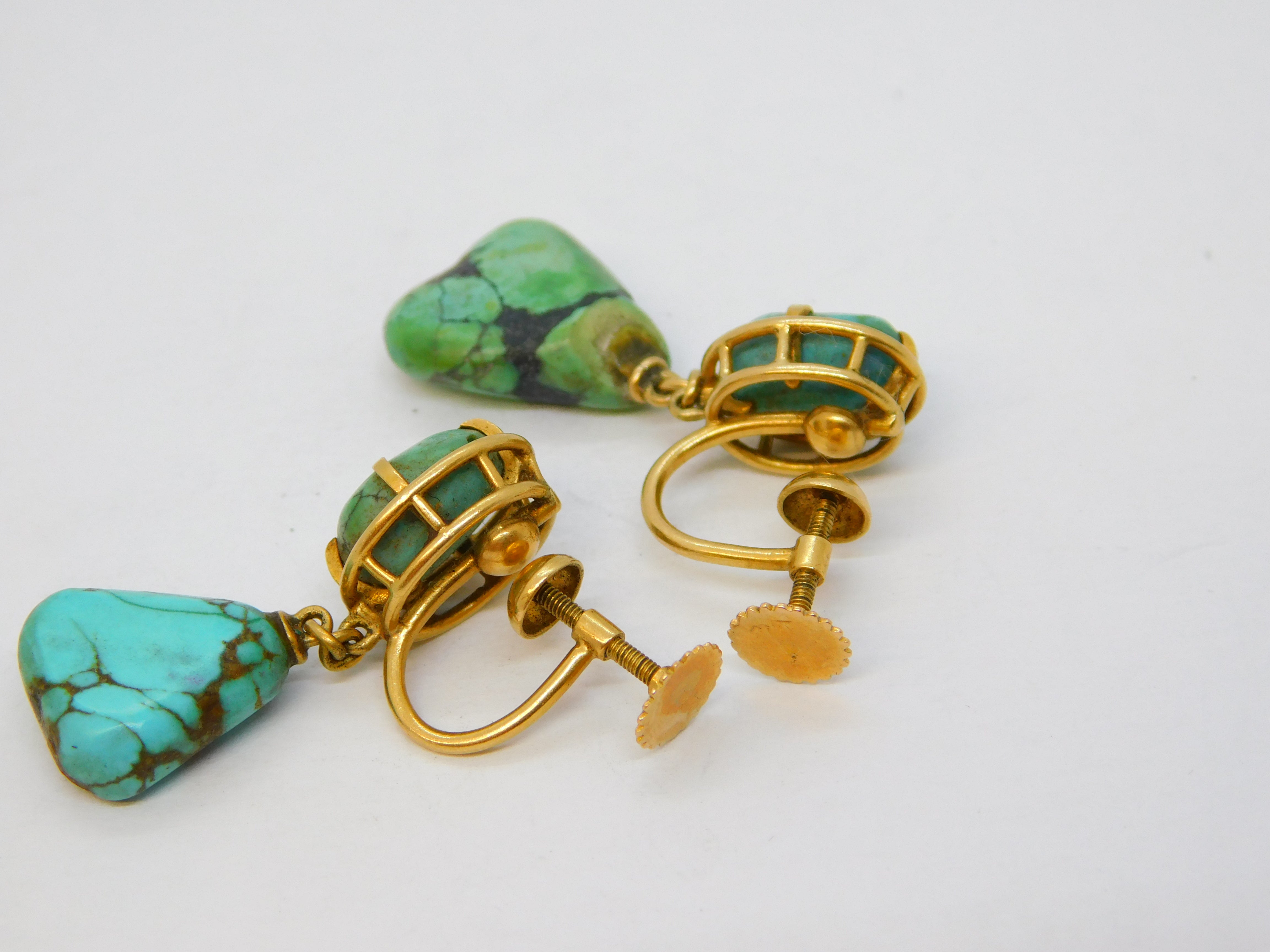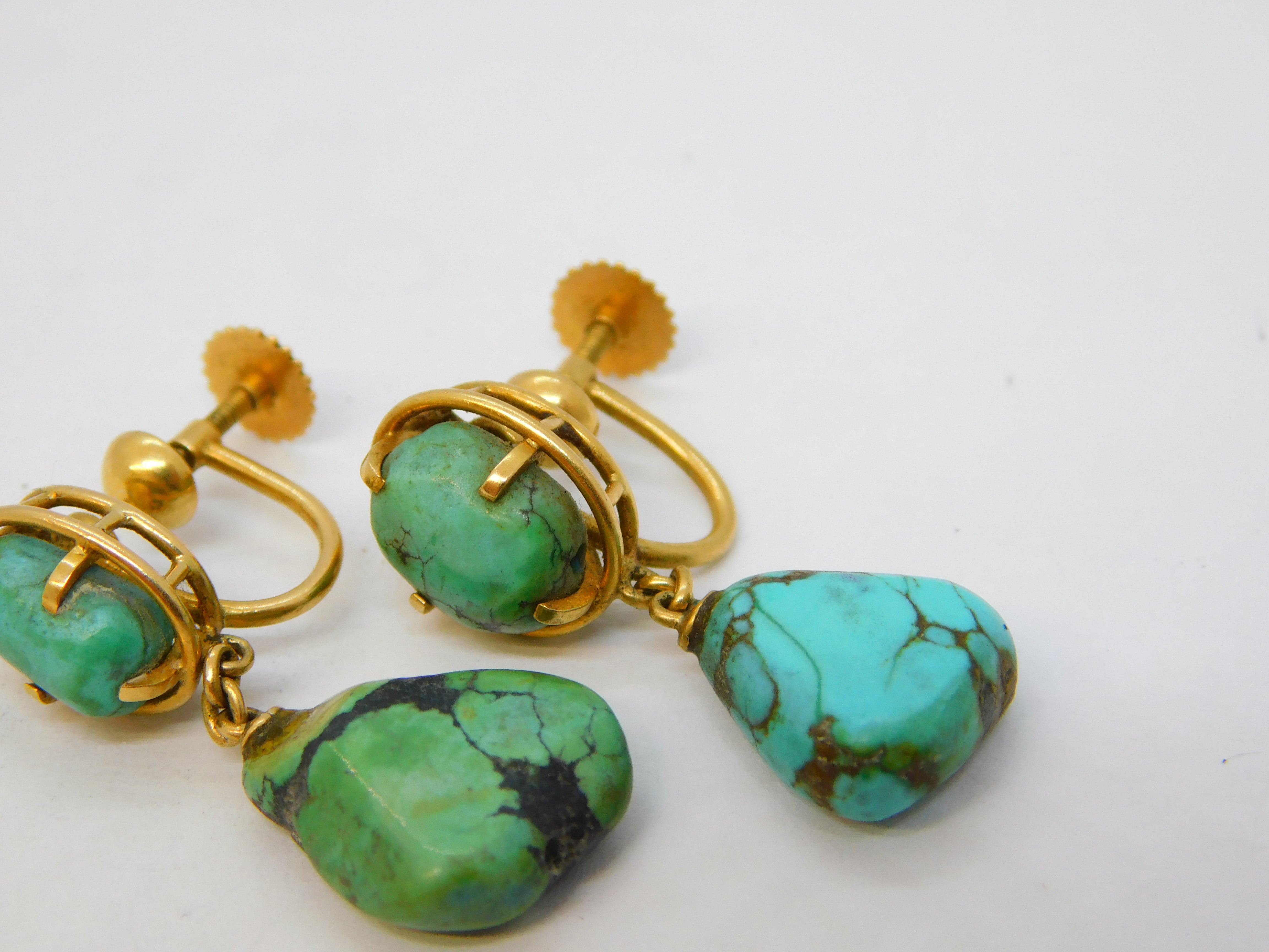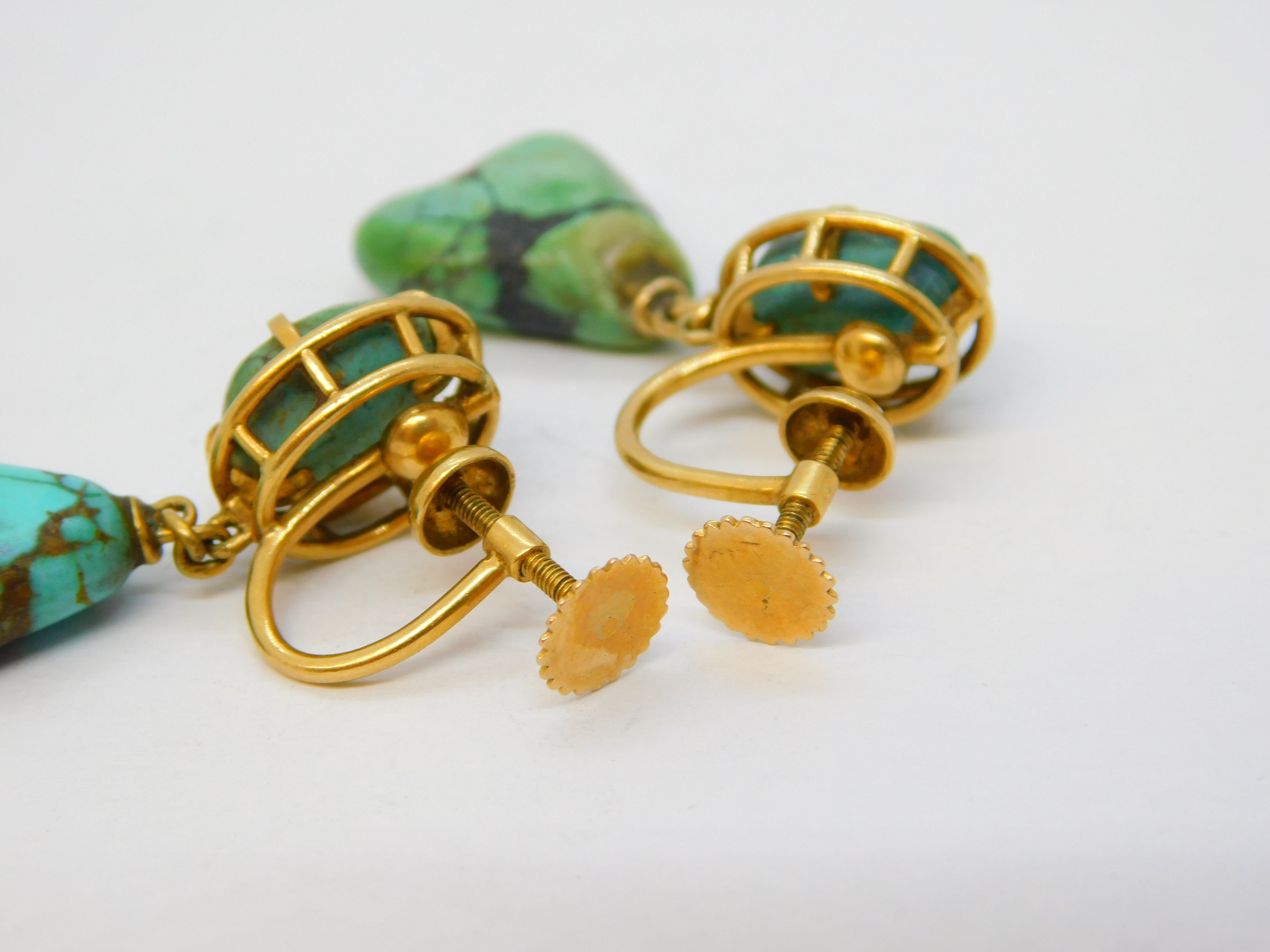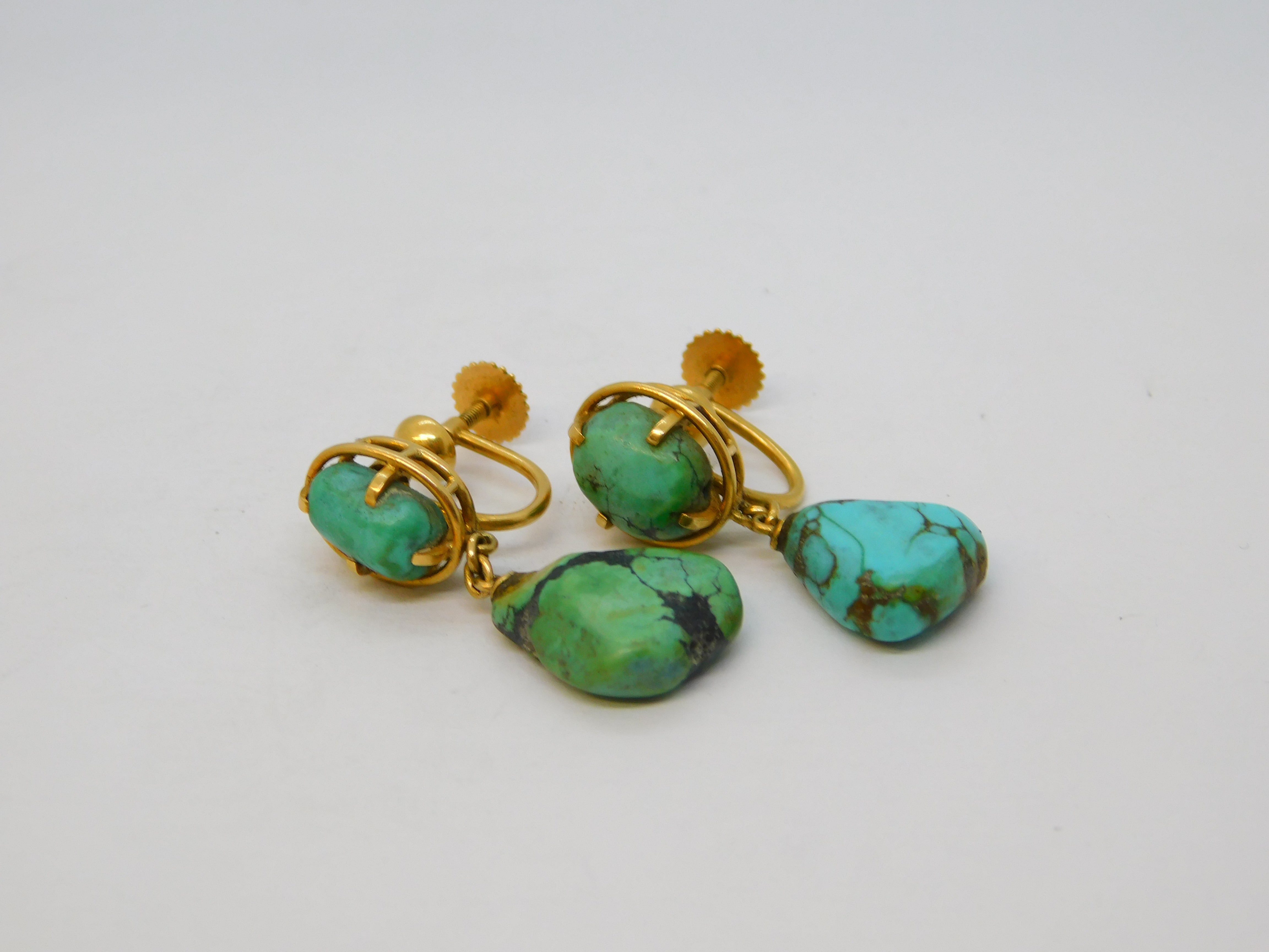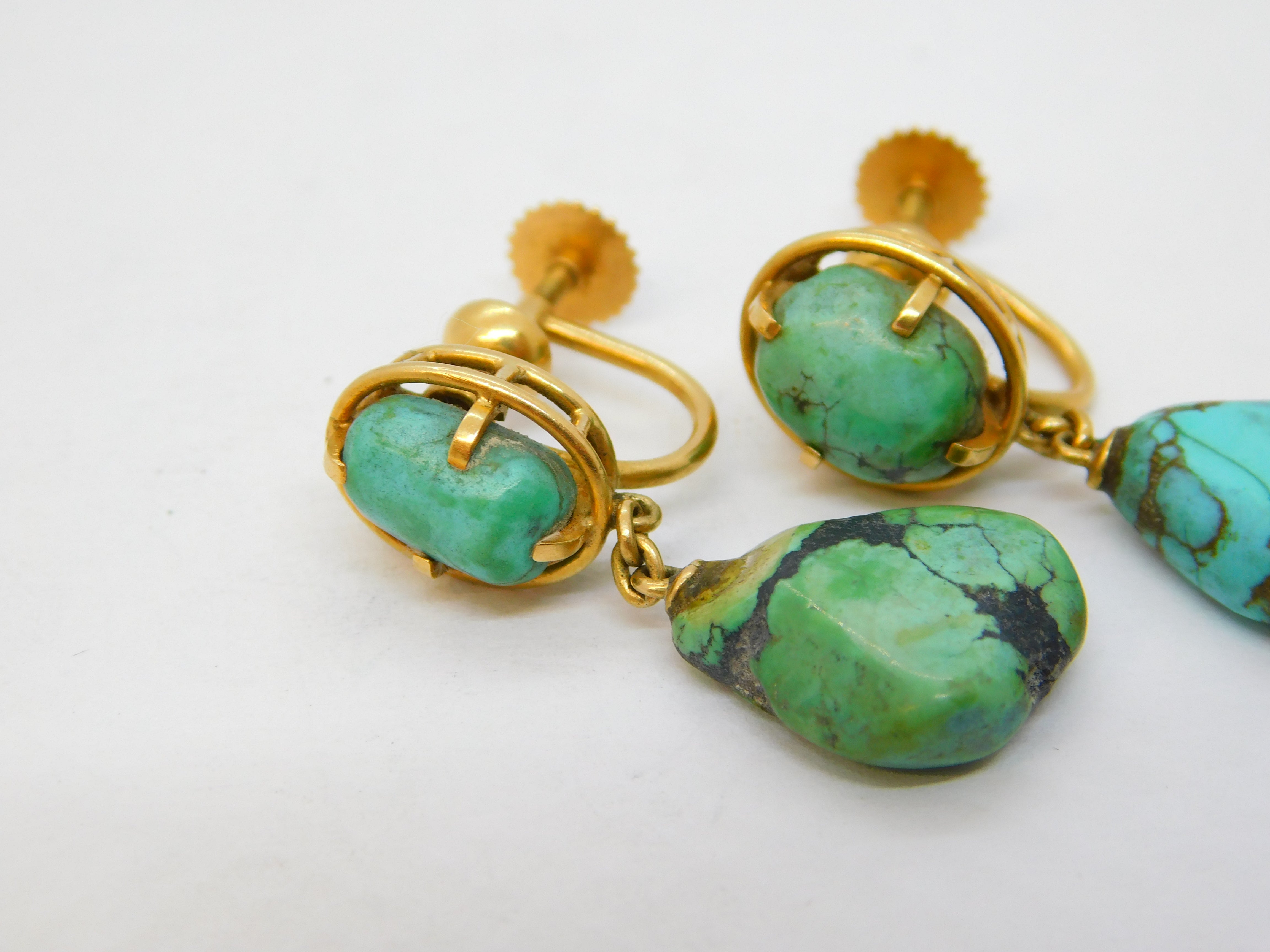 Details: A fantastic and wonderfully designed antique early 20th century 14ct yellow gold mounted raw turquoise drop earrings with lovely screw-back detailing c1920, the gold has been XRF tested as it is unmarked. This is a wonderful item that would make a perfect gift or addition to any collection.