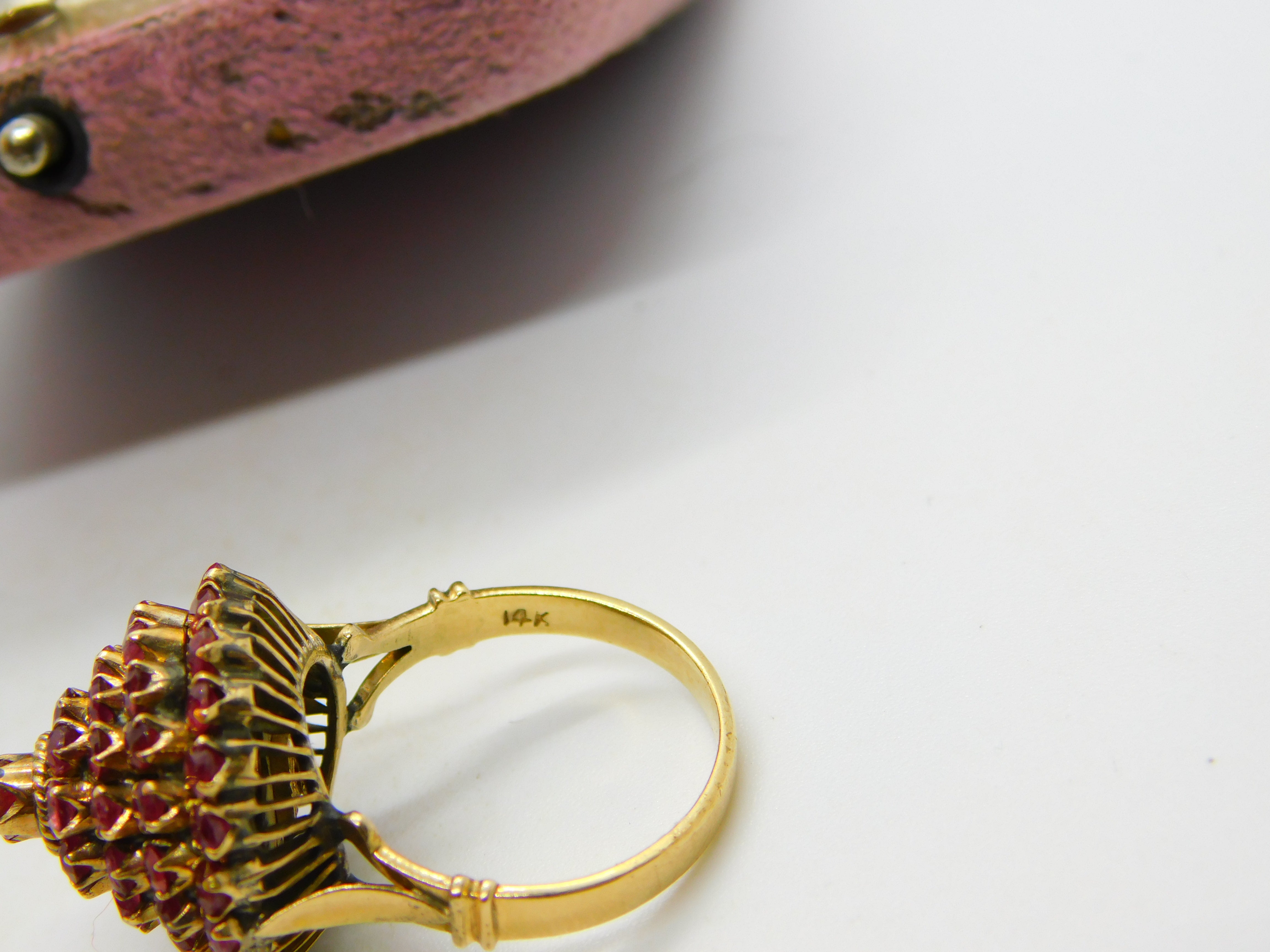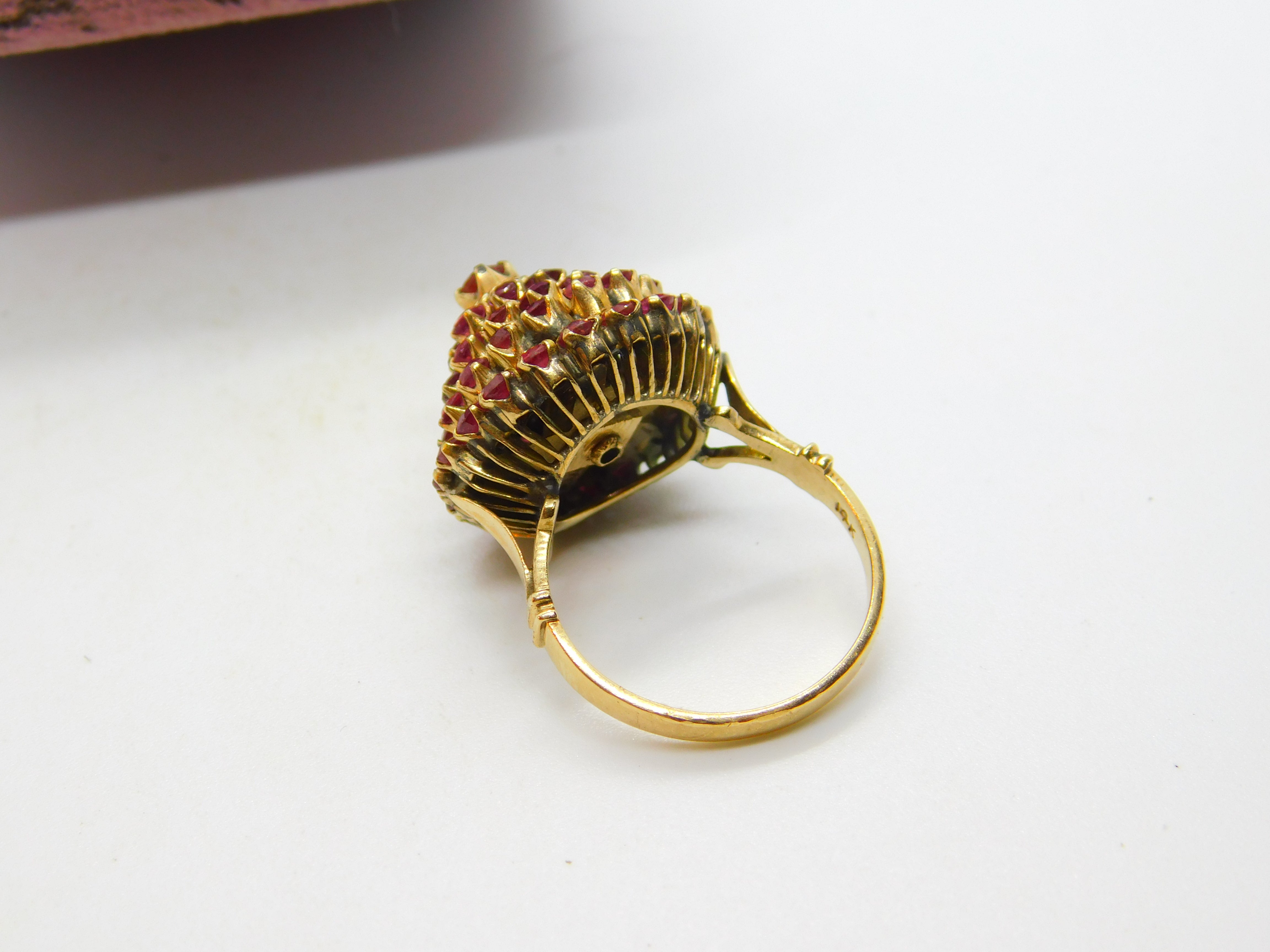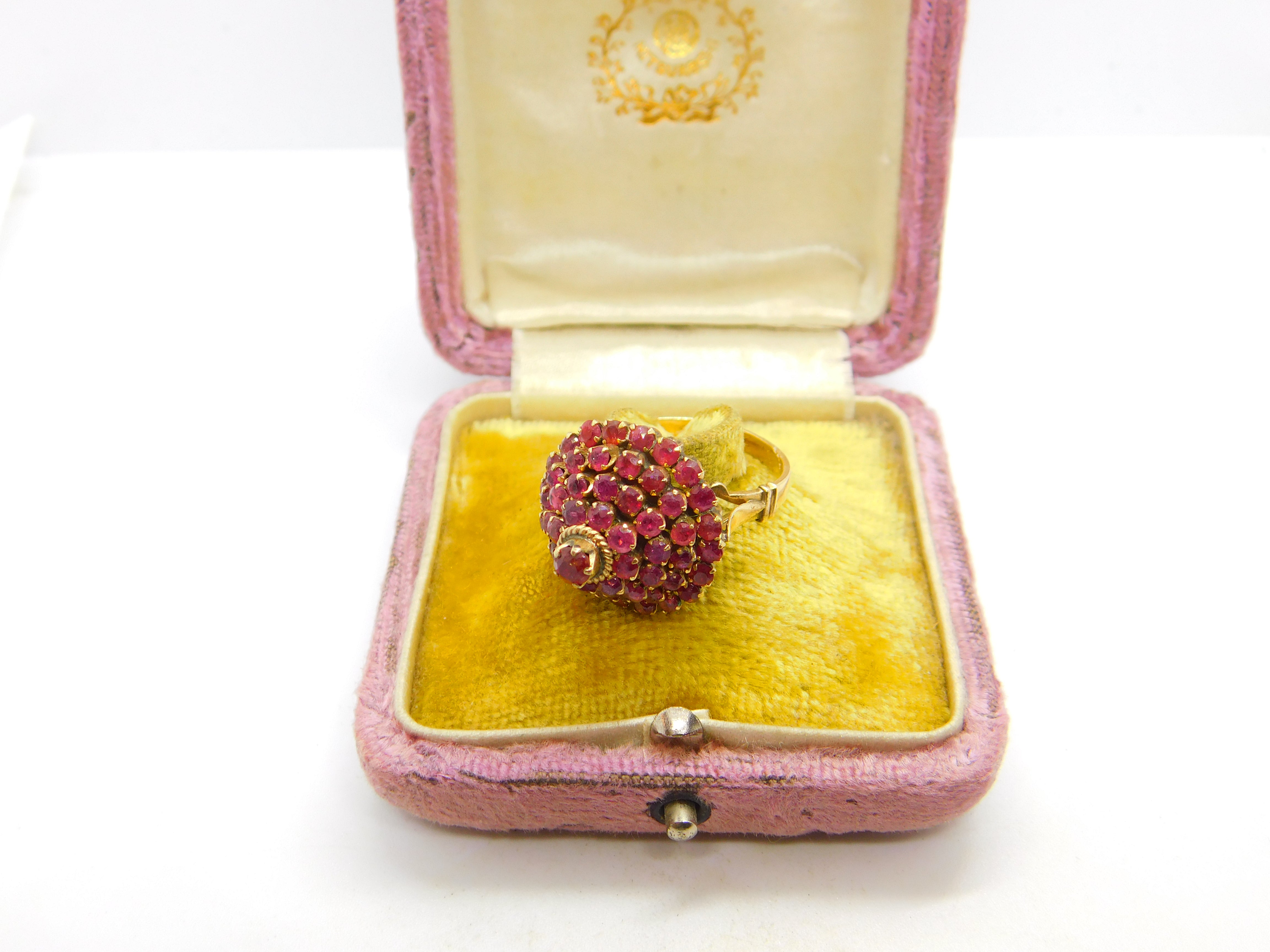 Details: A fantastic and wonderfully designed antique art deco 14ct yellow gold pagoda or floral cluster ring set with natural rubies throughout hallmarked 14K to the interior band c1930. The stones have been tested. This is a wonderful item that would make a perfect gift or addition to any collection. The BOX pictured is for PRESENTATION ONLY and is NOT included in the listings but used to frame the pictures unless specifically stated otherwise.
