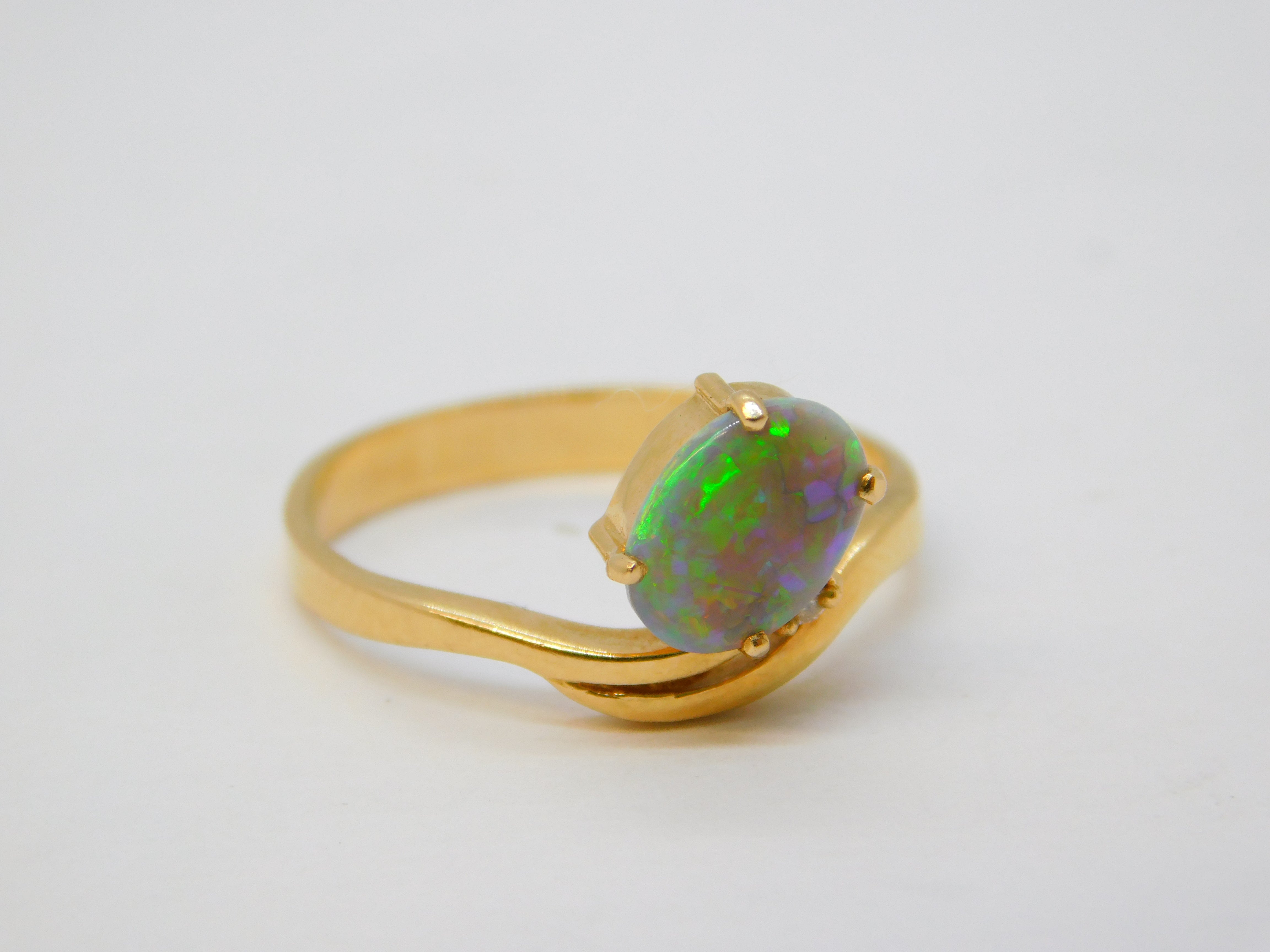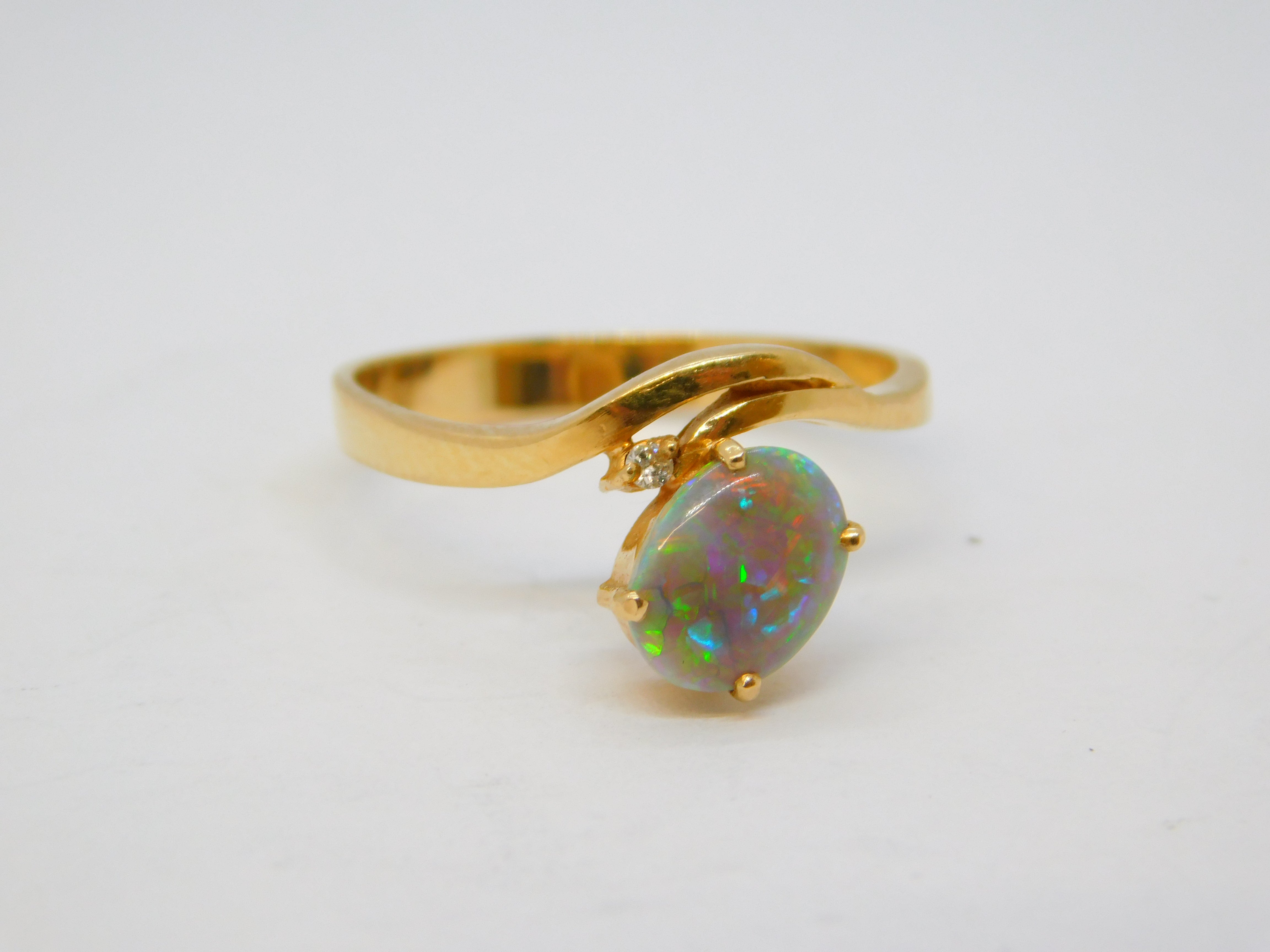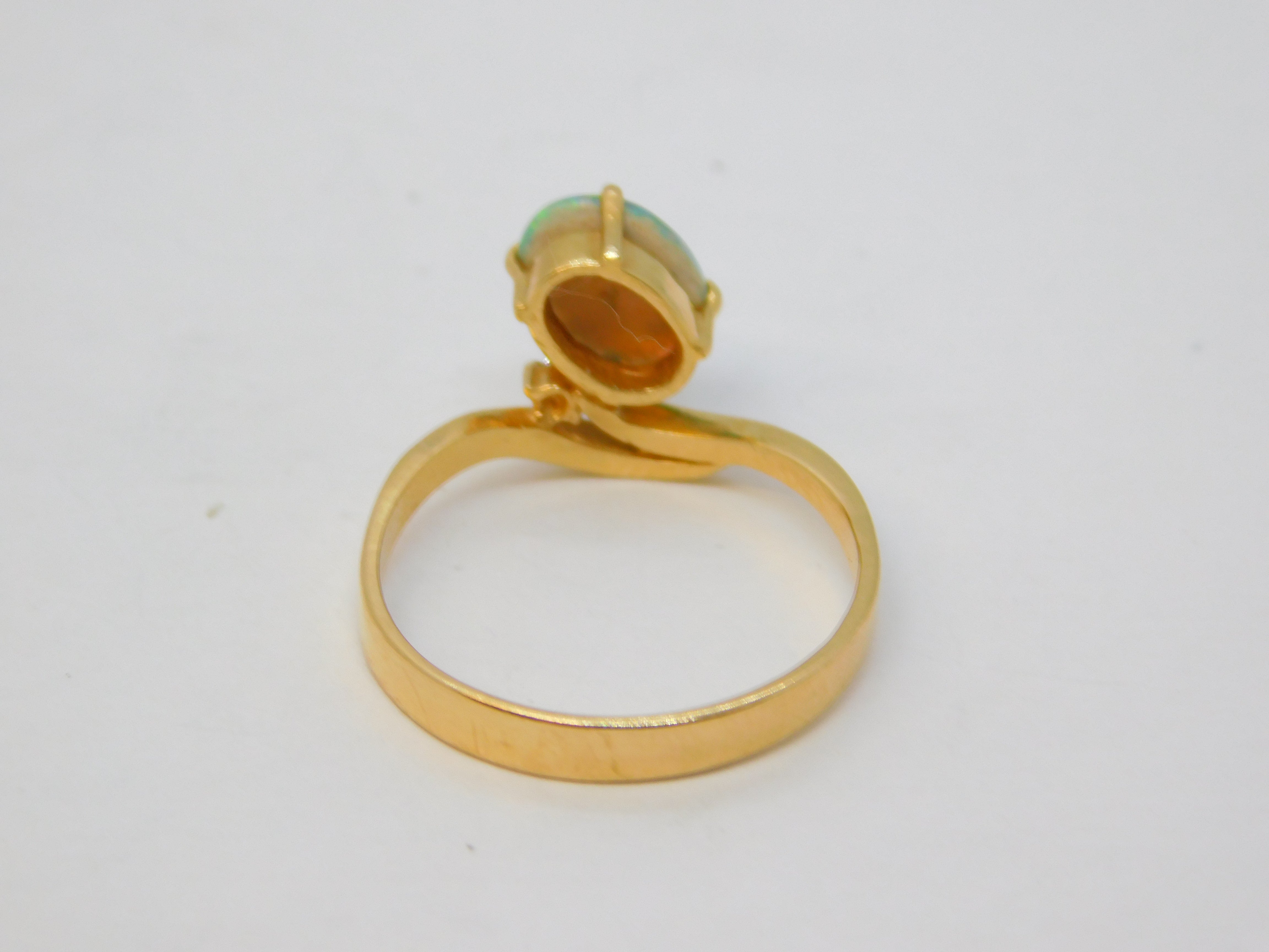 Details: A fantastic and wonderfully designed vintage 14ct yellow gold crossover ring set with cabochon white opal above a small diamond hallmarked to the interior c1970, the stones have been tested. This is a wonderful item that would make a perfect gift or addition to any collection.