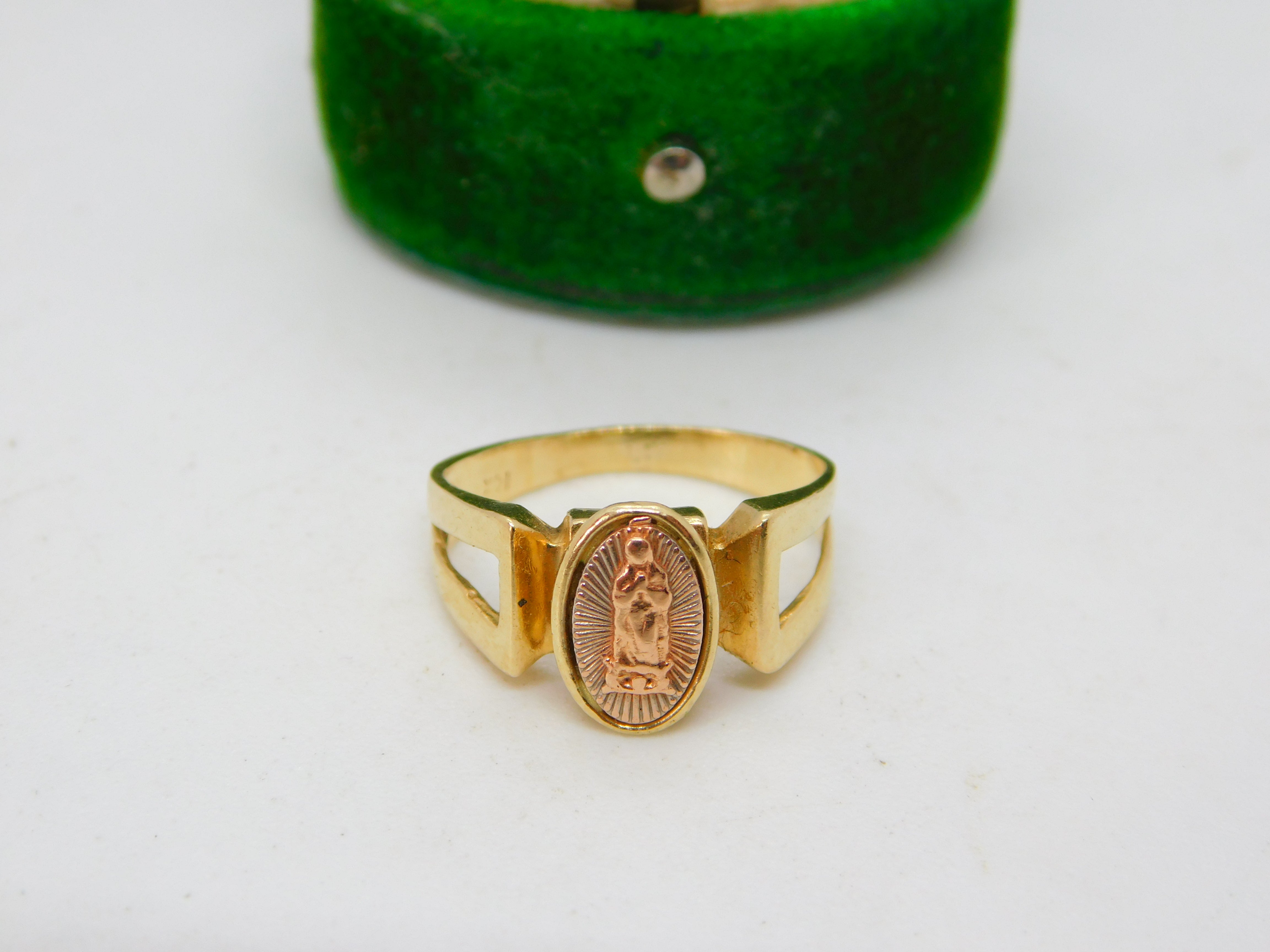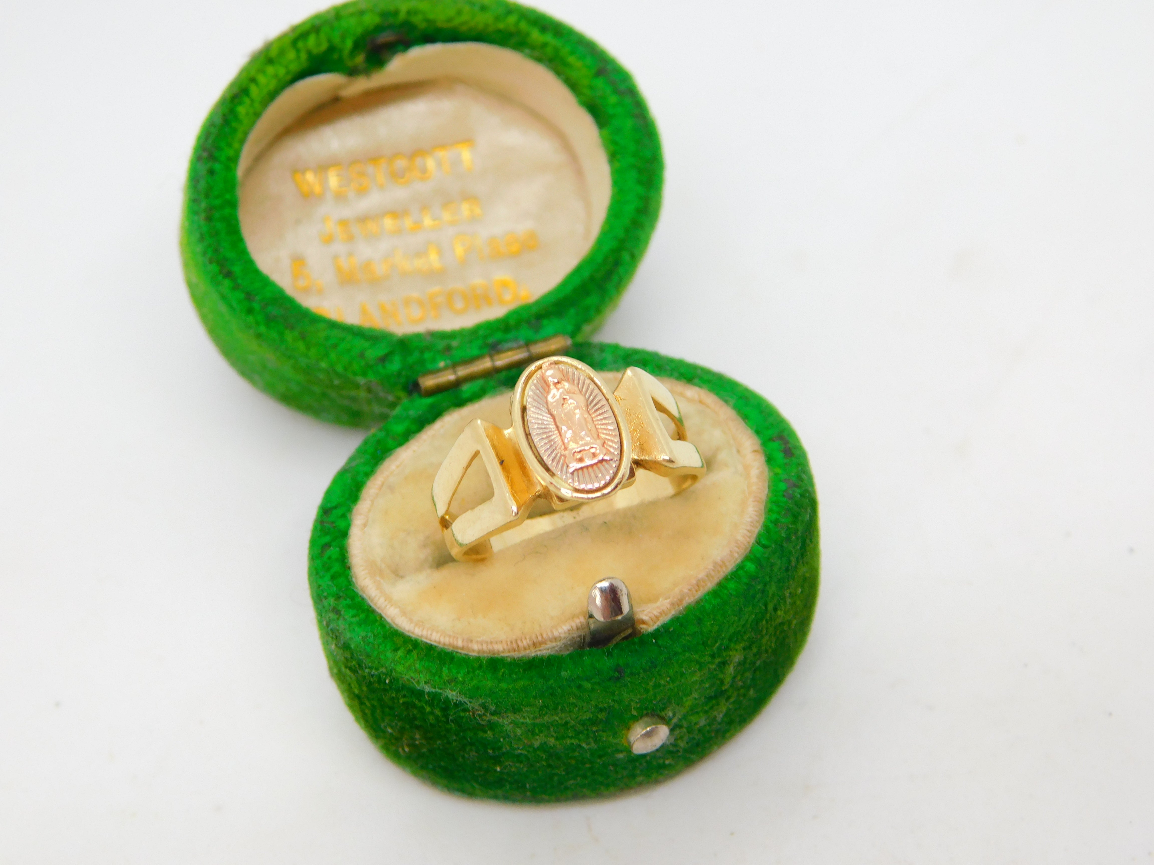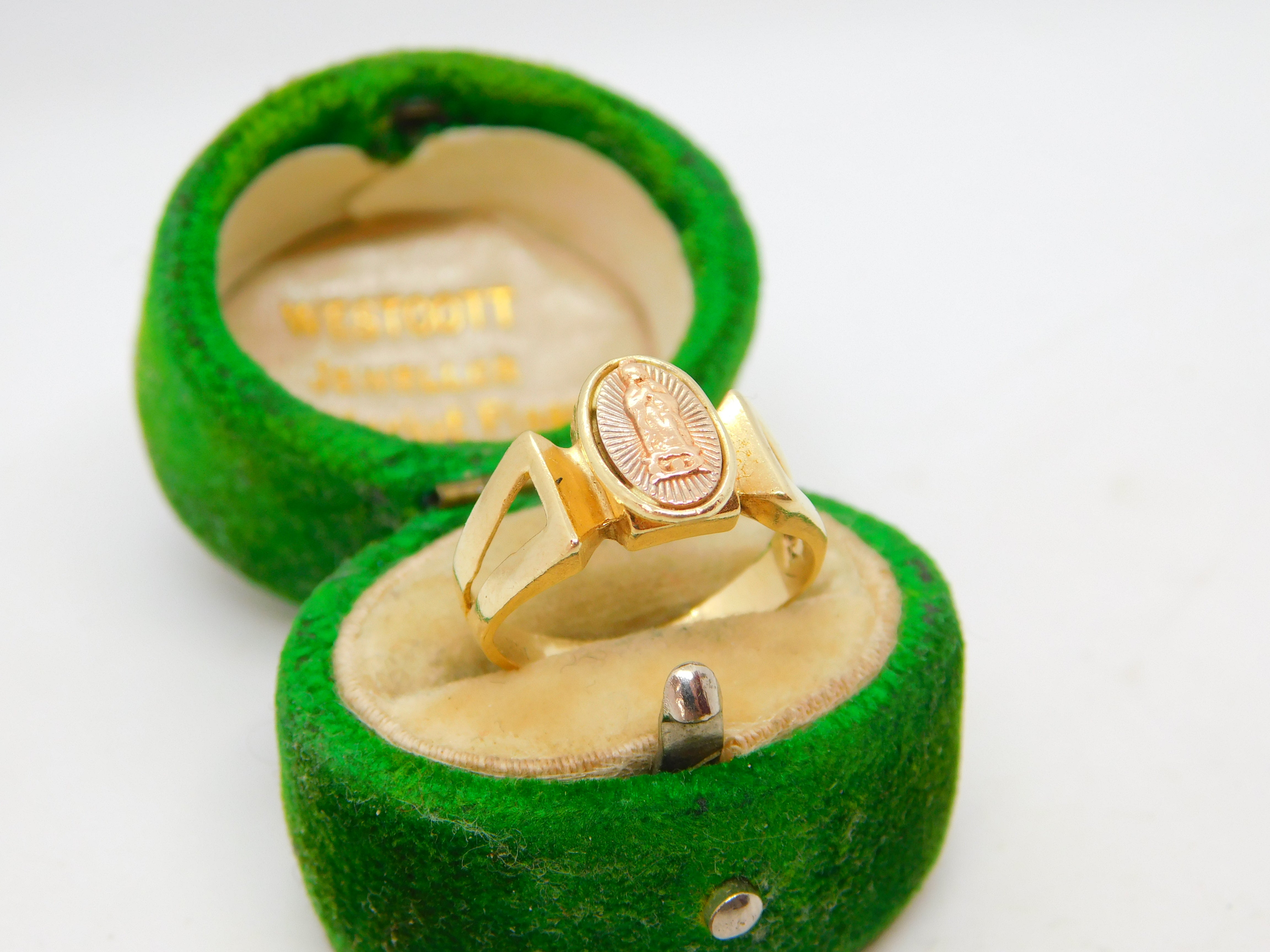 14ct Yellow & Rose Gold Catholic Religious Signet Ring Vintage c1960