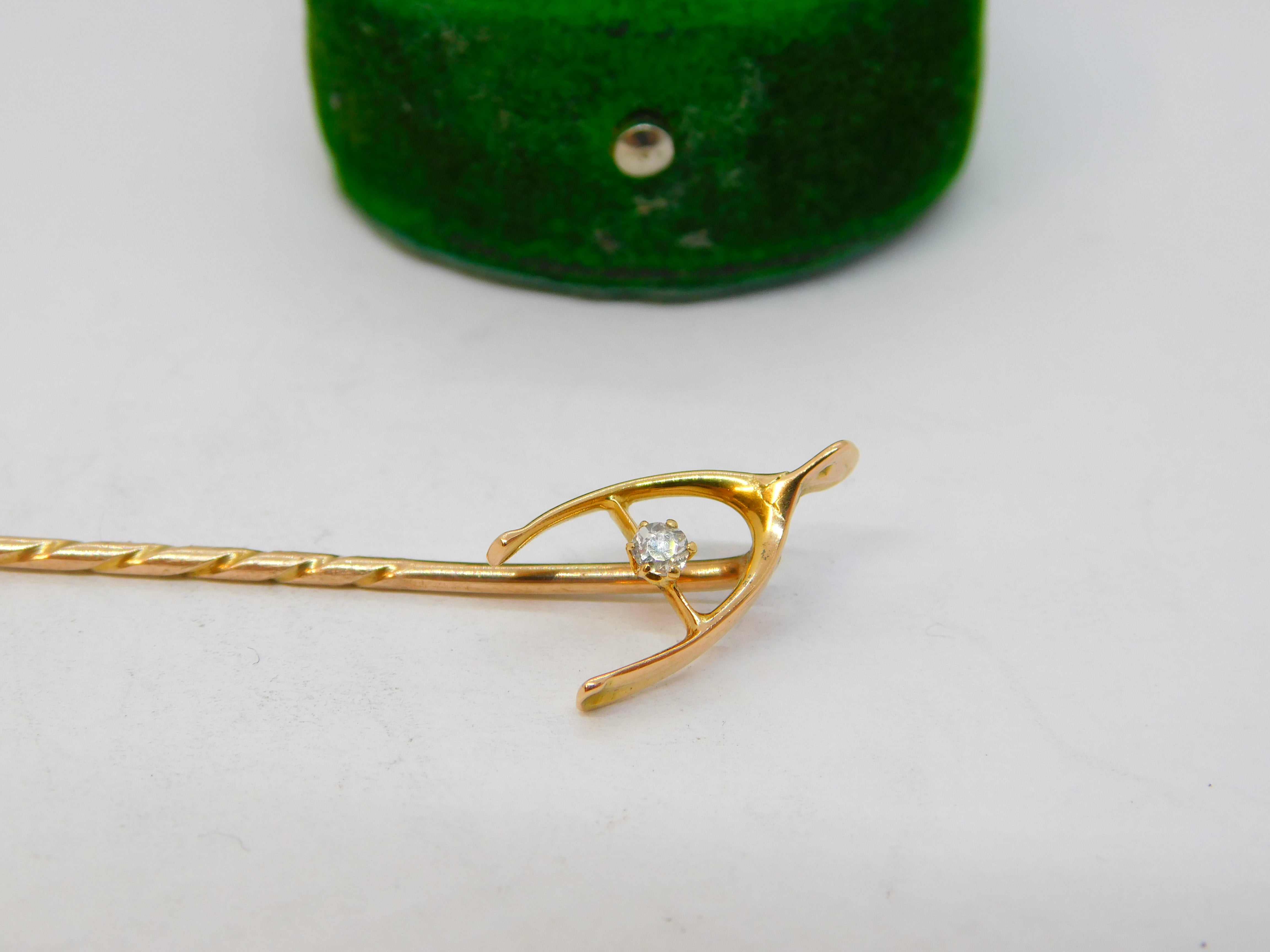 Details: A fantastic and wonderfully designed antique Victorian 15ct yellow gold & diamond set lucky wishbone stick pin c1890, the gold has been XRF tested as it is unmarked, the pin is 9ct. This is a wonderful item that would make a perfect gift or addition to any collection. The BOX pictured is for PRESENTATION ONLY and is NOT included in the listings but used to frame the pictures unless specifically stated otherwise.
