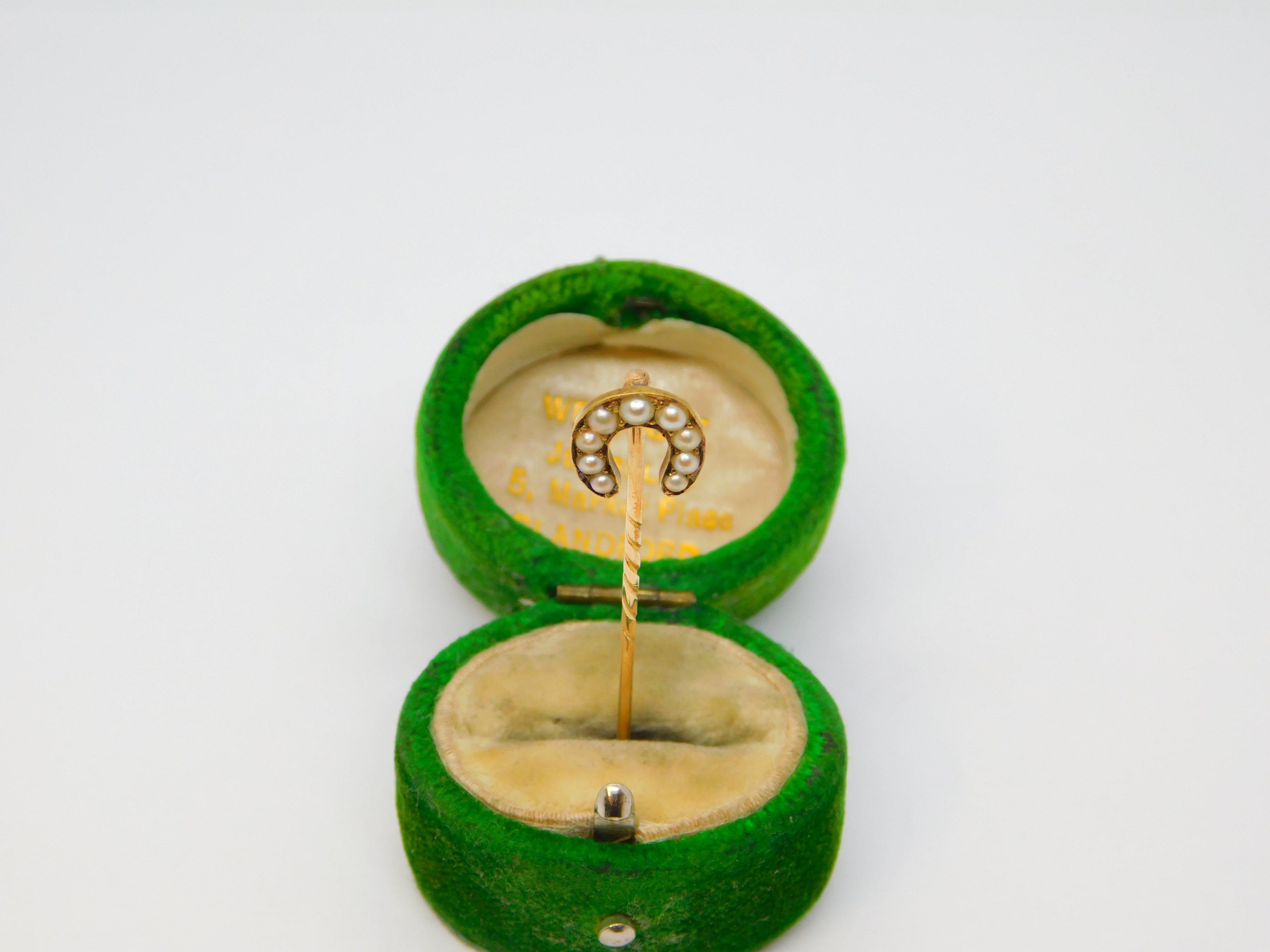 Details: A fantastic and wonderfully designed antique Edwardian 15ct yellow gold & seed pearl set lucky horseshoe stick pin c1910, the gold has been XRF tested as it is unmarked. This is a wonderful item that would make a perfect gift or addition to any collection. The BOX pictured is for PRESENTATION ONLY and is NOT included in the listings but used to frame the pictures unless specifically stated otherwise.