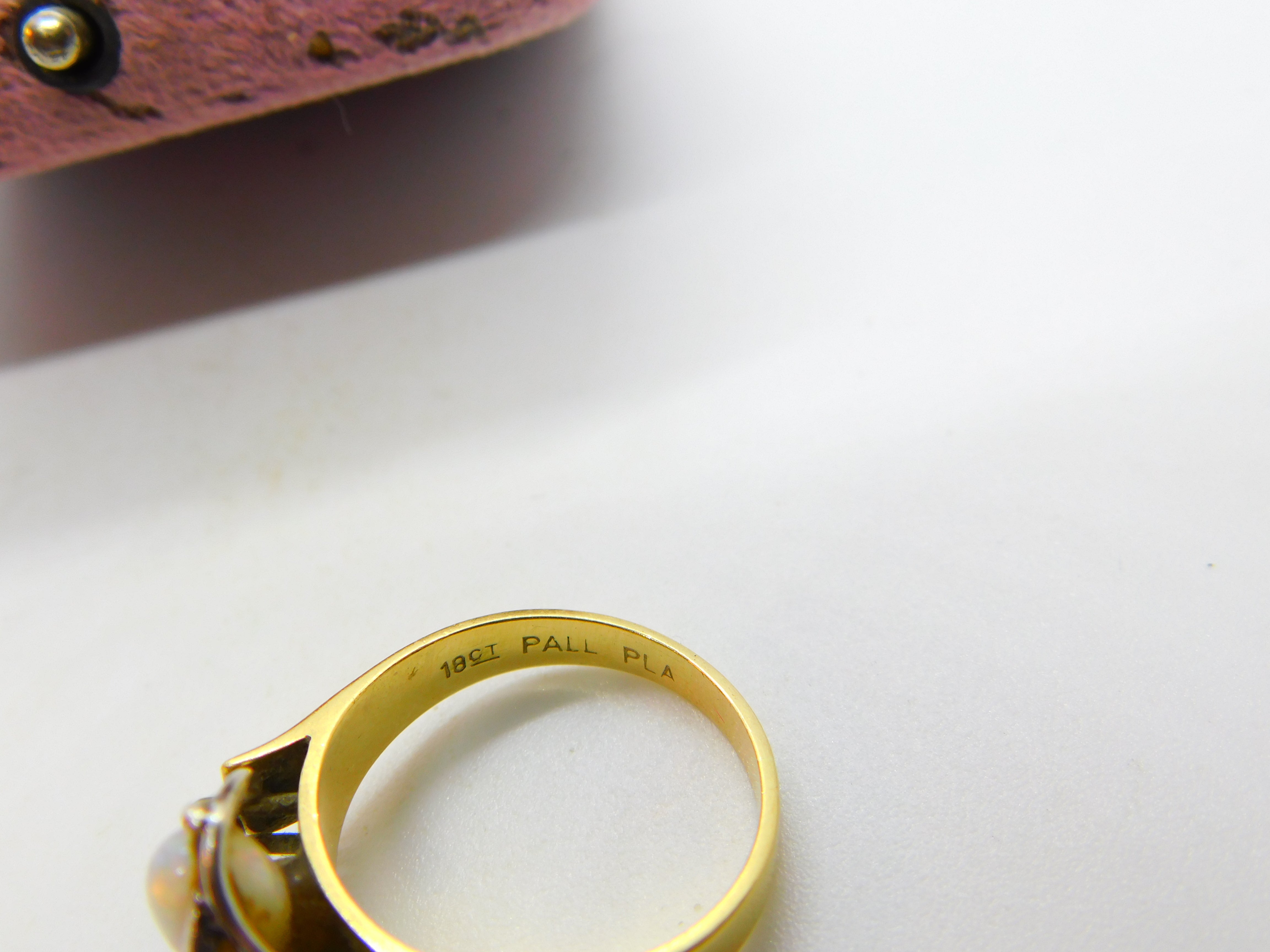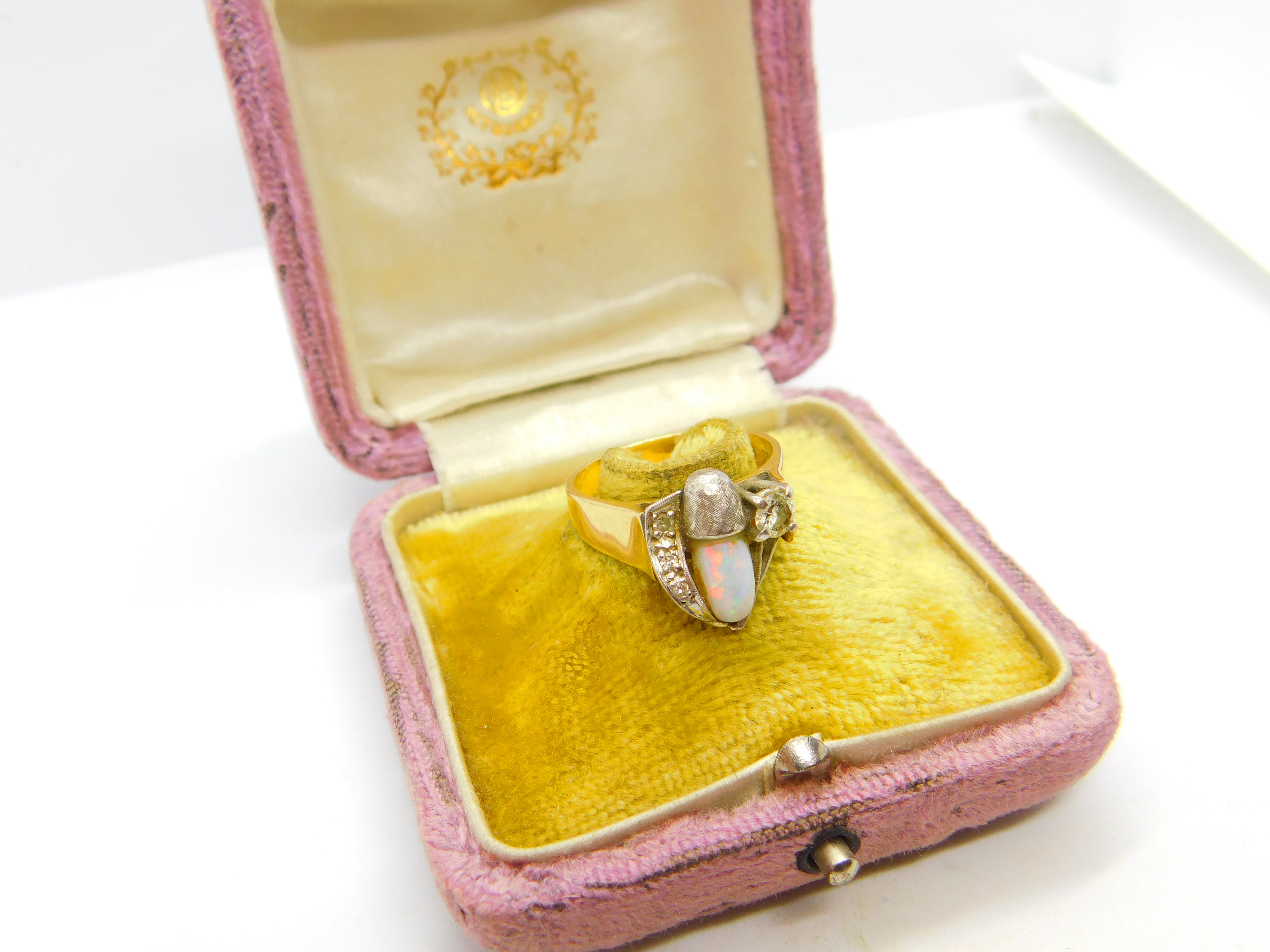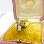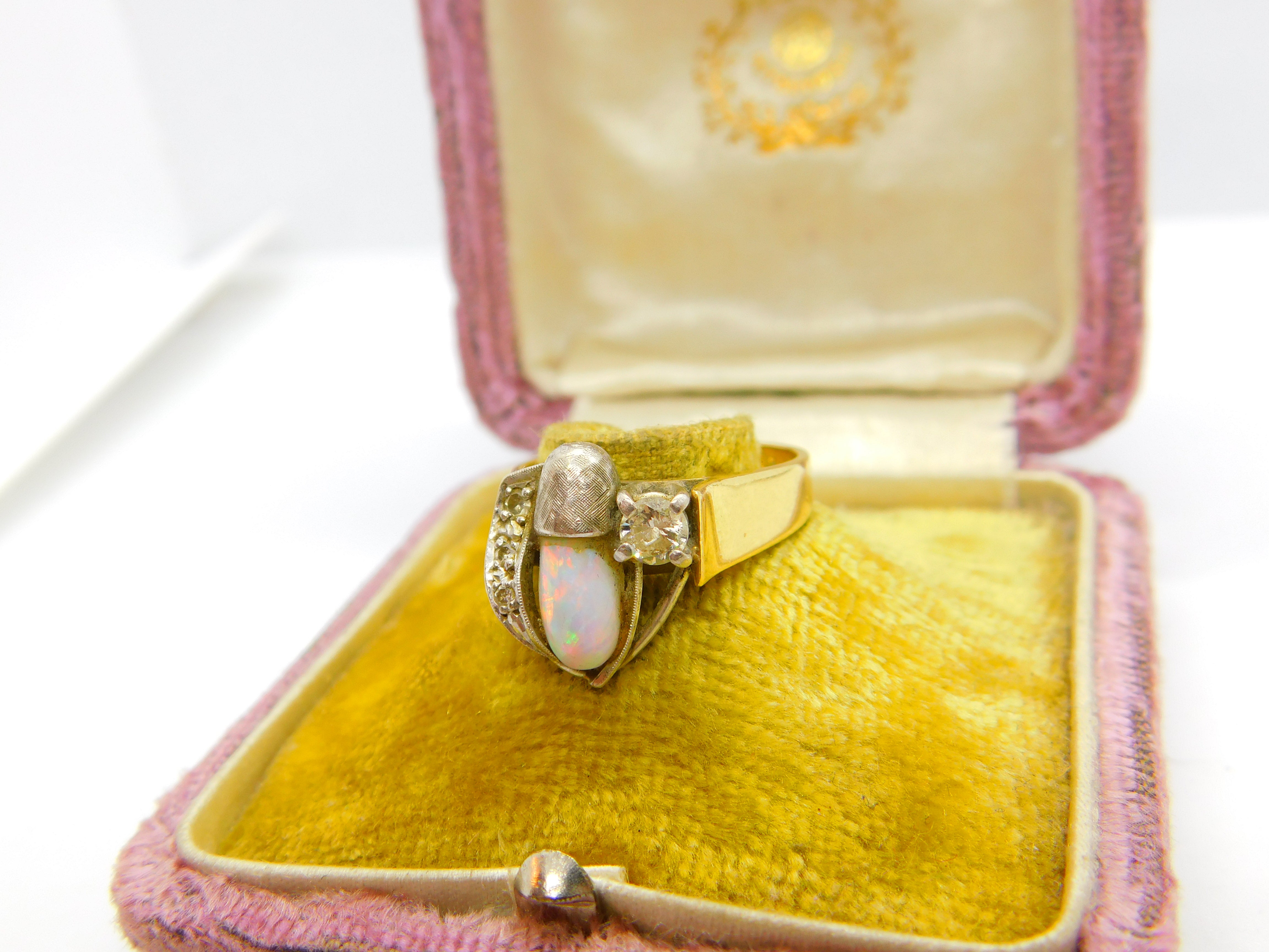 Details: A fantastic and wonderfully designed antique art deco 18ct yellow gold statement ring with platinum & palladium set cabochon fire opal flanked by diamonds, the largest stone approximately 0.2ct hallmarked to the interior c1920. The stones have all been tested. Marked 18ct Pall. Plat. to the interior. Very unusual to have a palladium setting. This is a wonderful item that would make a perfect gift or addition to any collection. The BOX pictured is for PRESENTATION ONLY and is NOT included in the listings but used to frame the pictures unless specifically stated otherwise.
