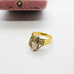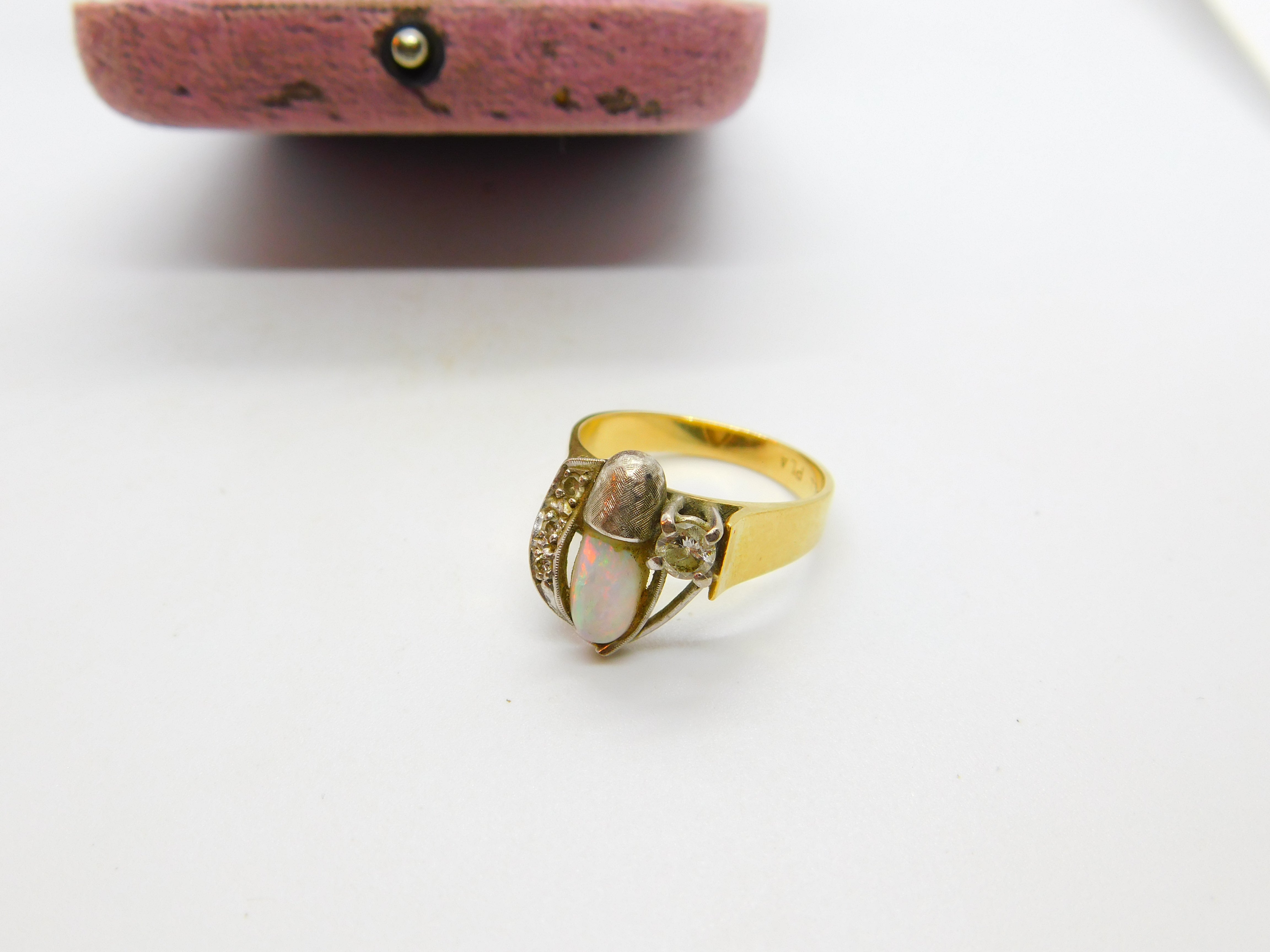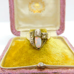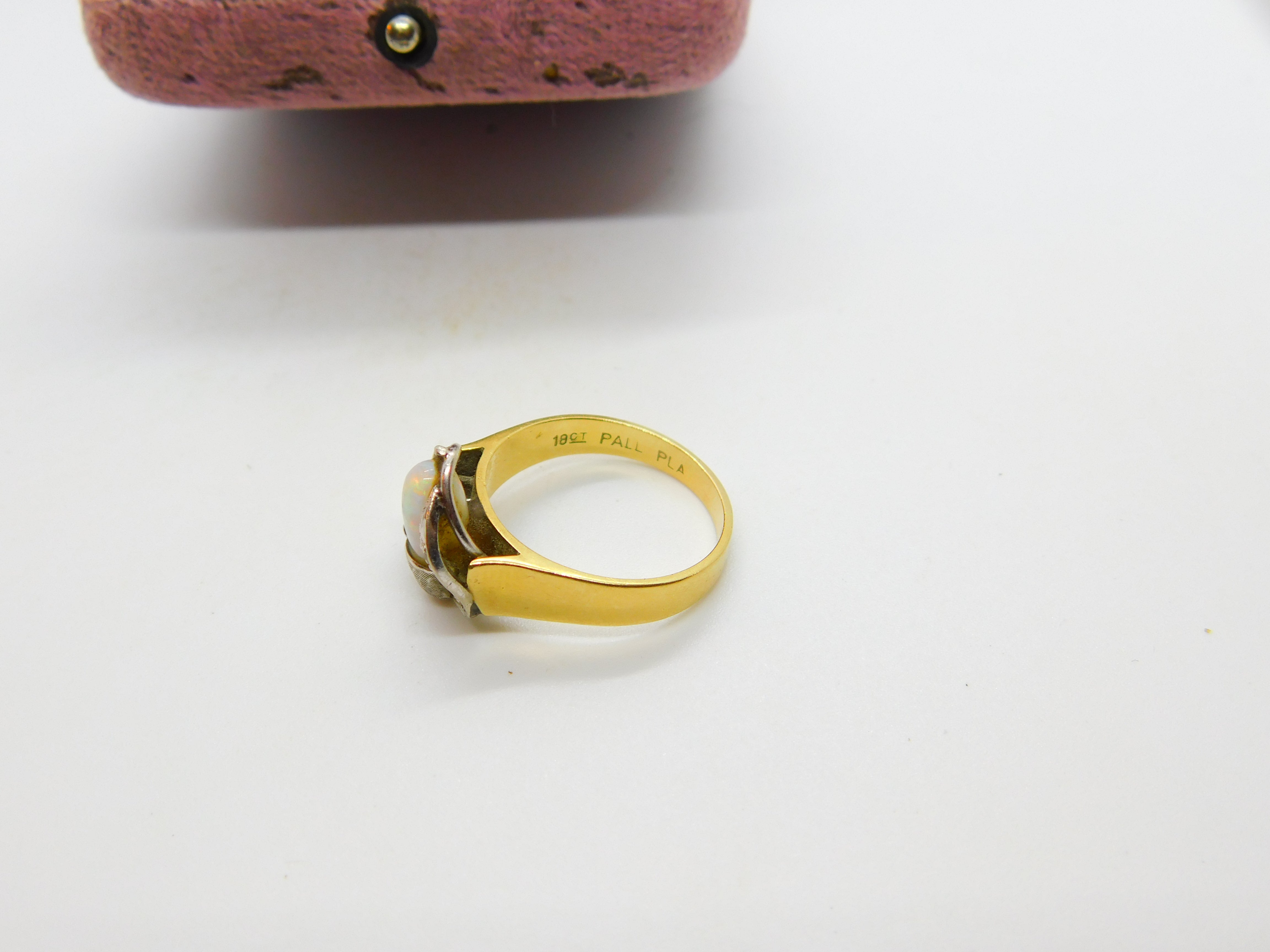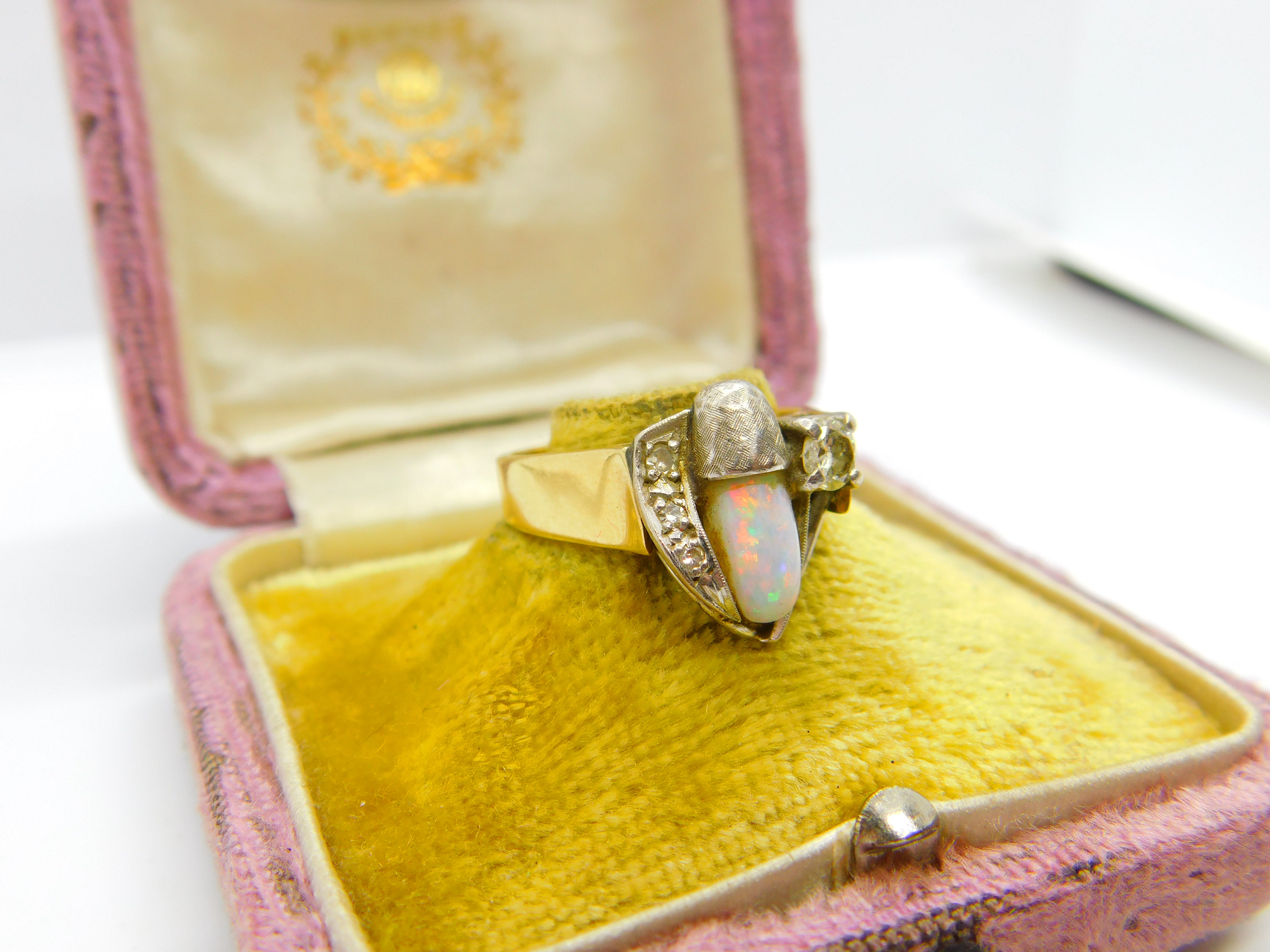 Details: A fantastic and wonderfully designed antique art deco 18ct yellow gold statement ring with platinum & palladium set cabochon fire opal flanked by diamonds, the largest stone approximately 0.2ct hallmarked to the interior c1920. The stones have all been tested. Marked 18ct Pall. Plat. to the interior. Very unusual to have a palladium setting. This is a wonderful item that would make a perfect gift or addition to any collection. The BOX pictured is for PRESENTATION ONLY and is NOT included in the listings but used to frame the pictures unless specifically stated otherwise.