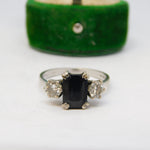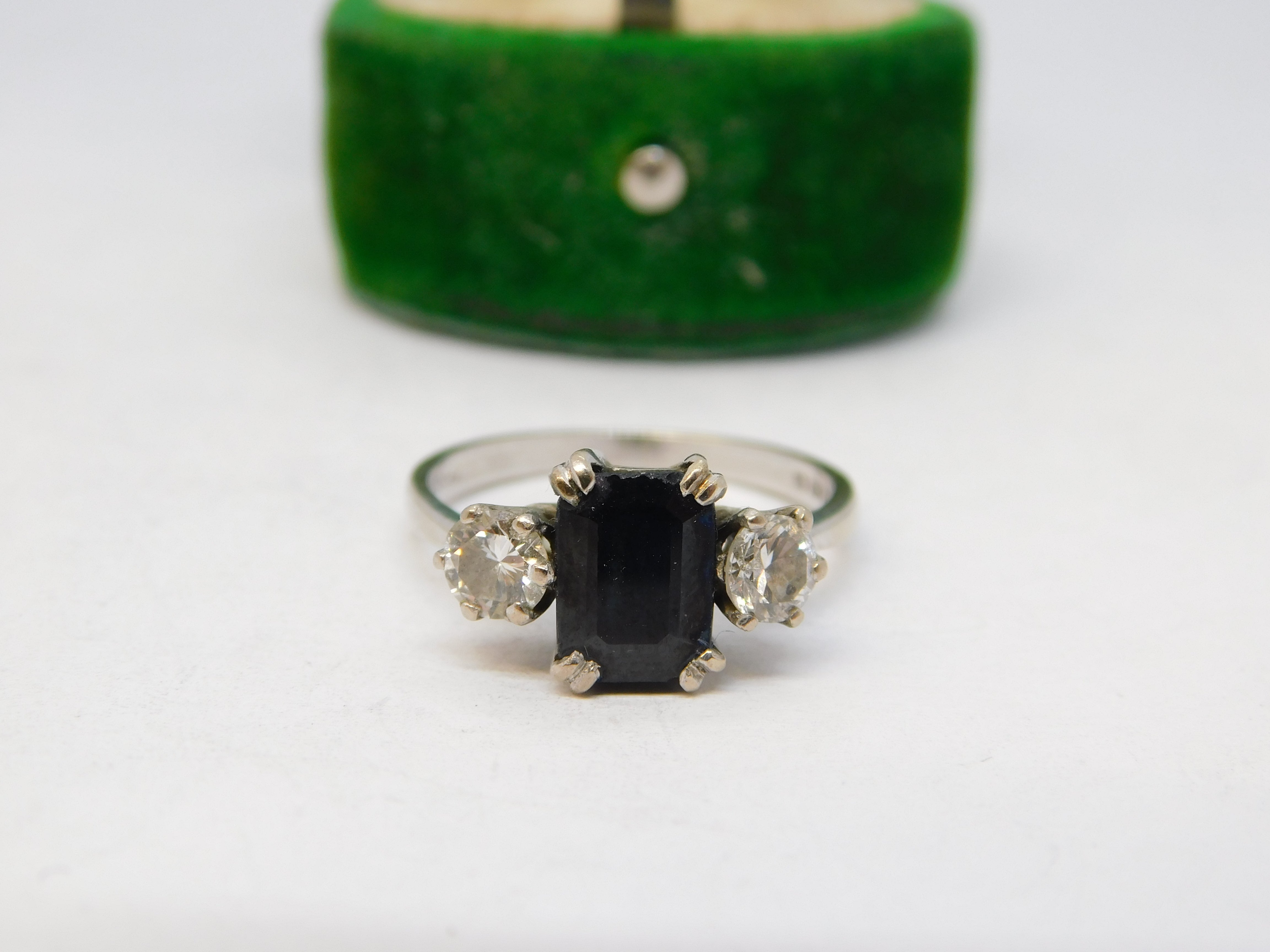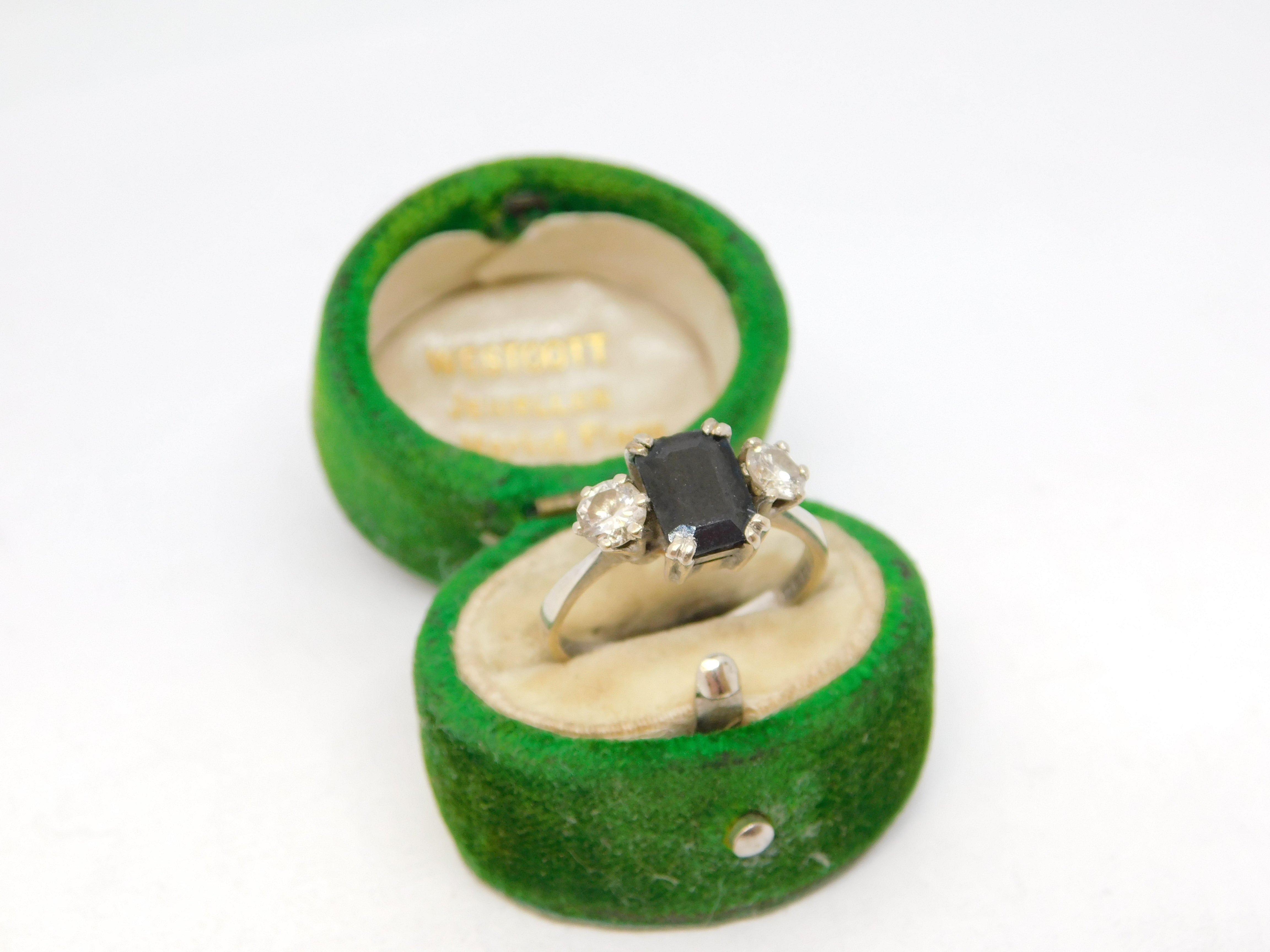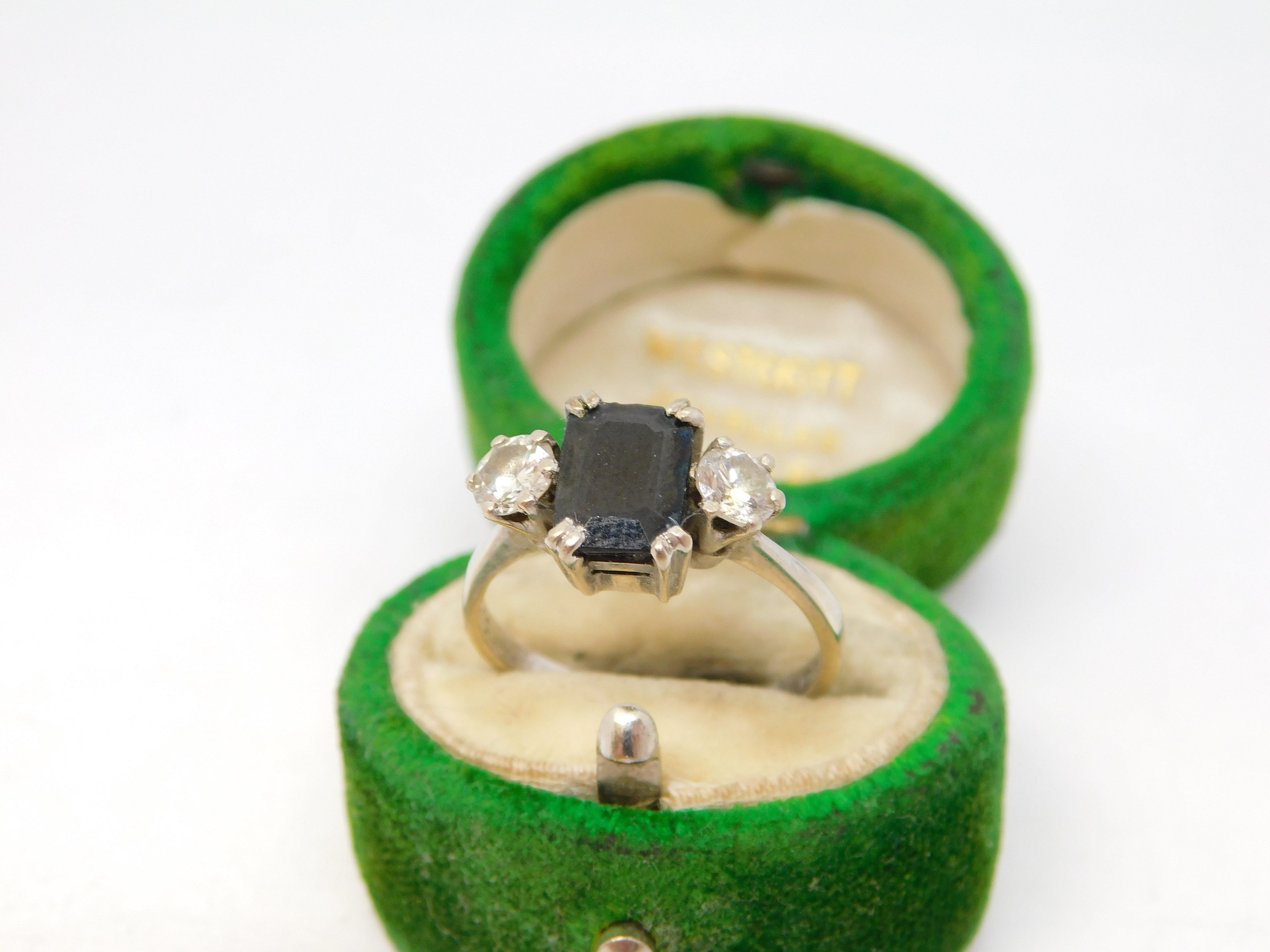 Details: A fantastic and wonderfully designed vintage 18ct white gold engagement ring set with a central 0.5ct emerald cut sapphire flanked by two 0.2ct diamonds hallmarked London 1974, the stones have been tested. This is a wonderful item that would make a perfect gift or addition to any collection. The BOX pictured is for PRESENTATION ONLY and is NOT included in the listings but used to frame the pictures unless specifically stated otherwise.