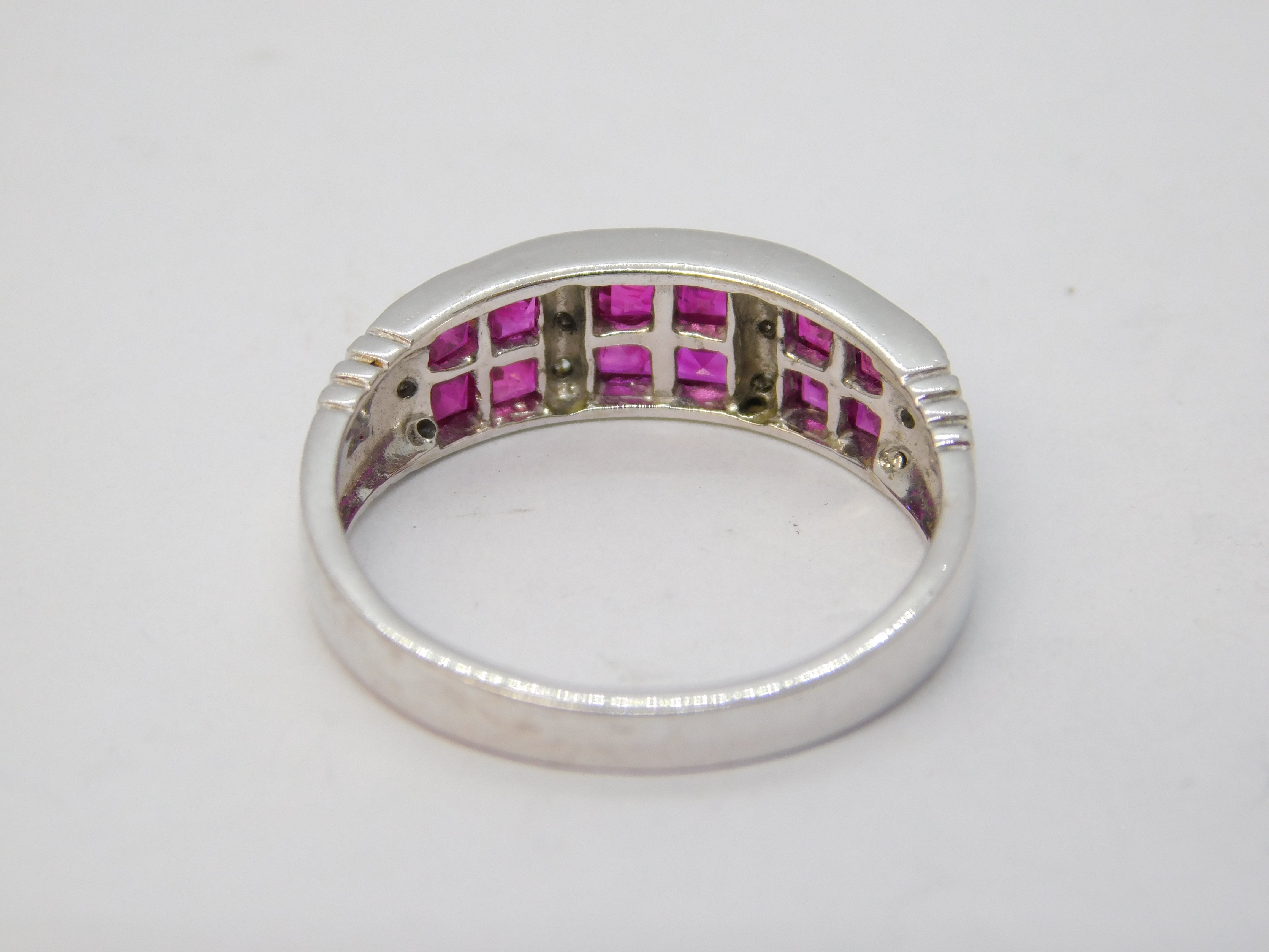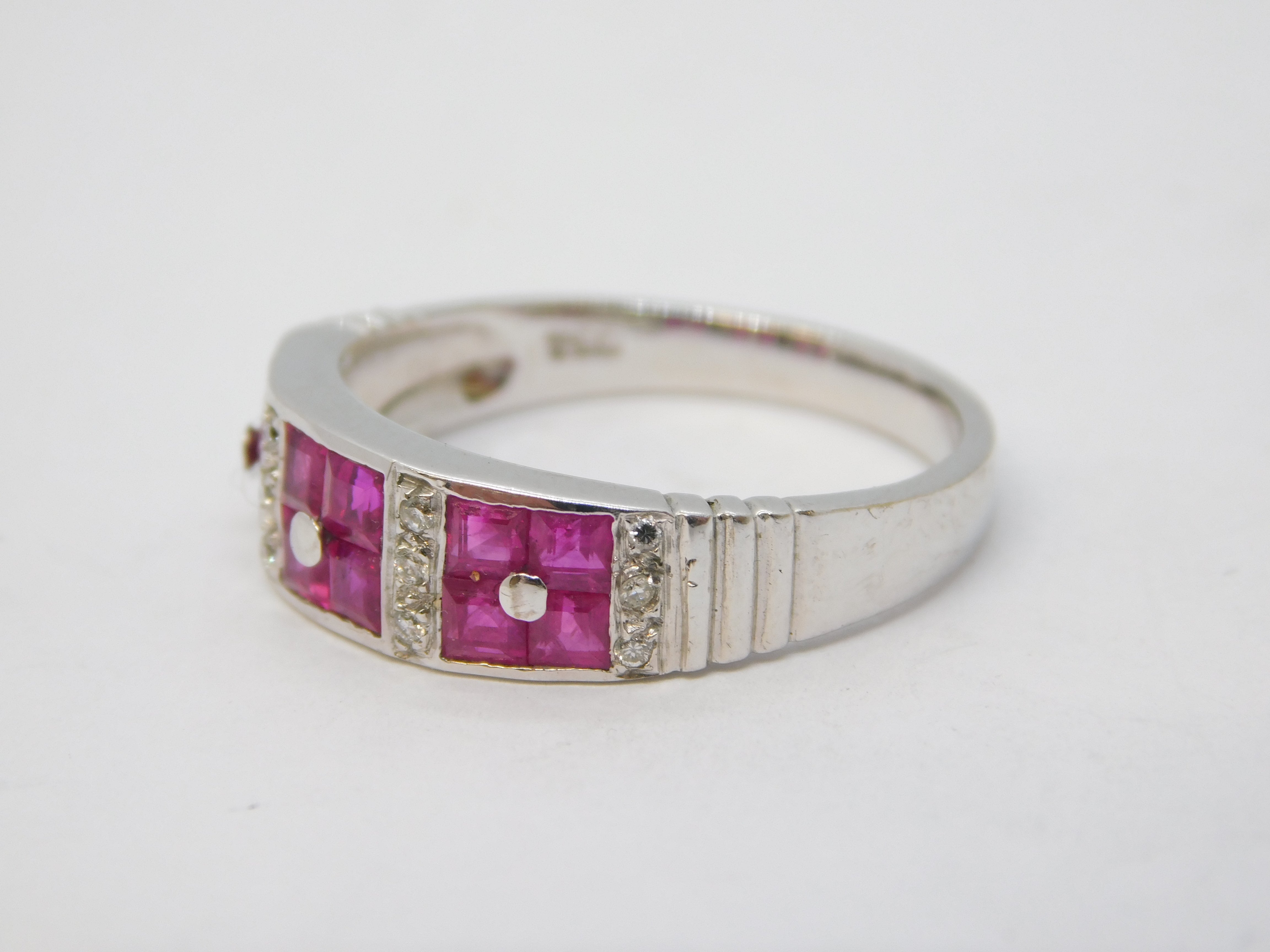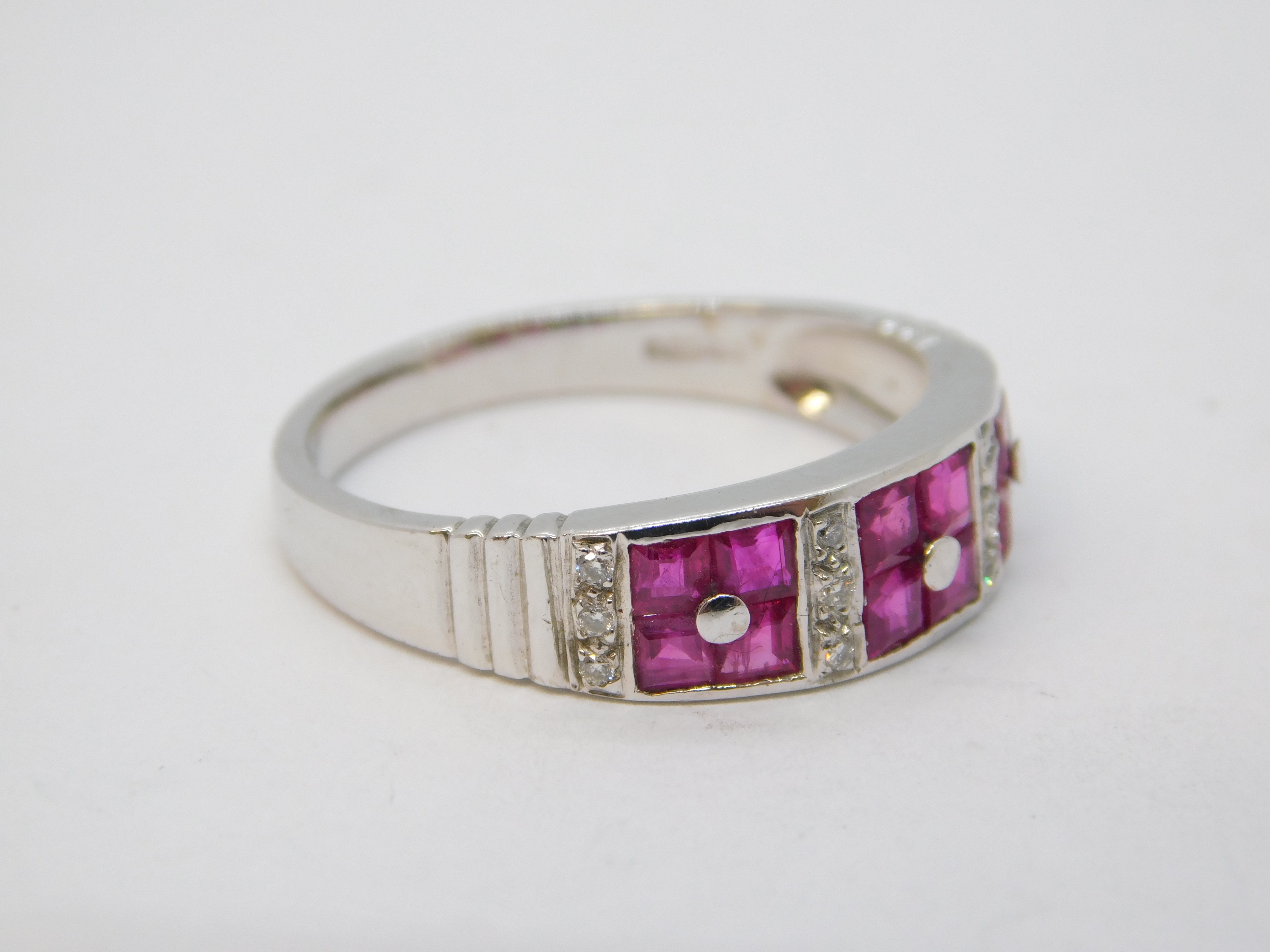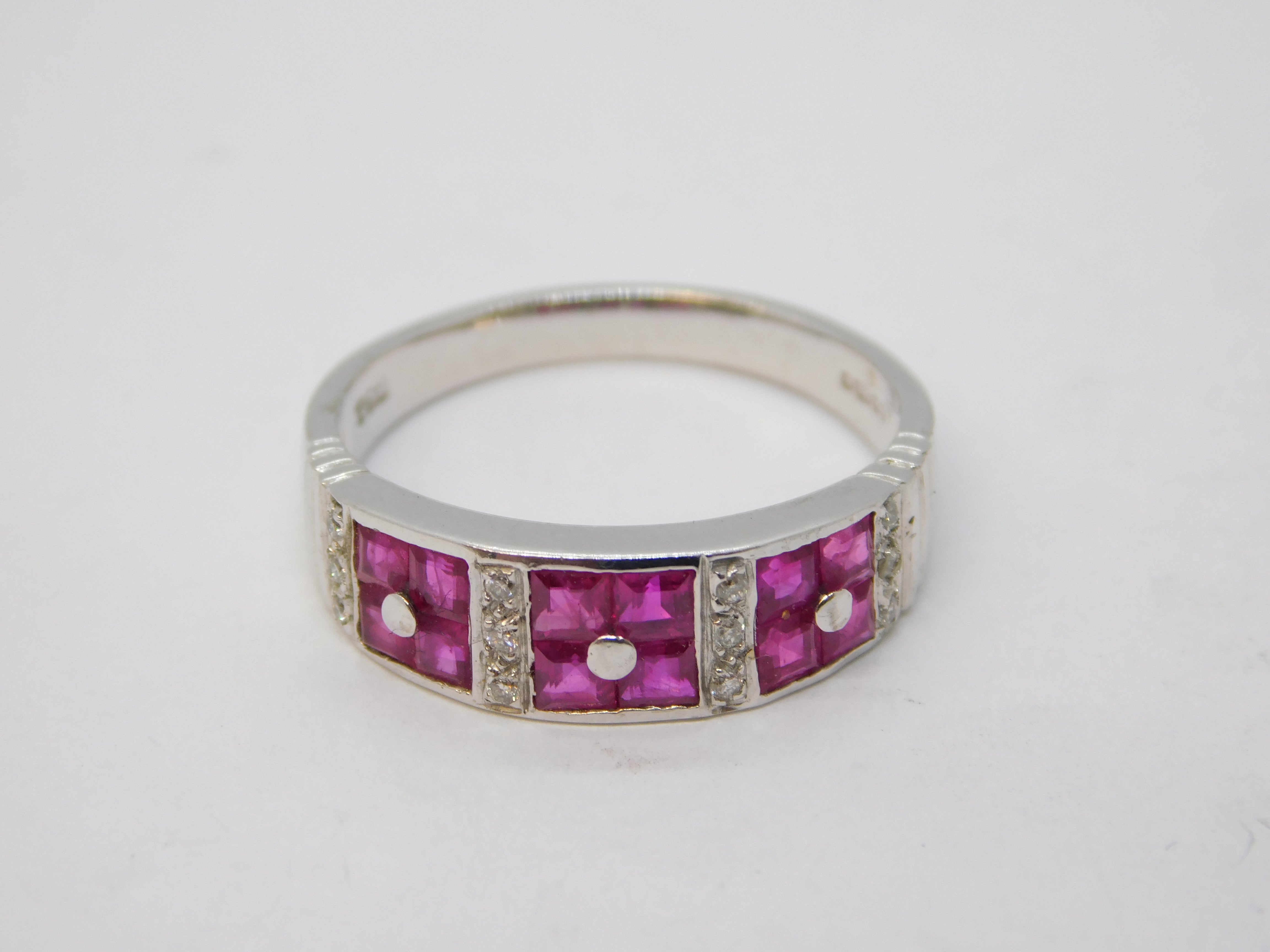Details: A fantastic and wonderfully designed vintage 18ct white gold dress ring set with twelve square cut natural rubies arranged in square panels flanked by brilliant cut diamonds, hallmarked to the interior band for Sheffield c1990. The stones have been machine tested. This is a wonderful item that would make a perfect gift or addition to any collection. We are more than happy to provide XRF reports for items upon request.
