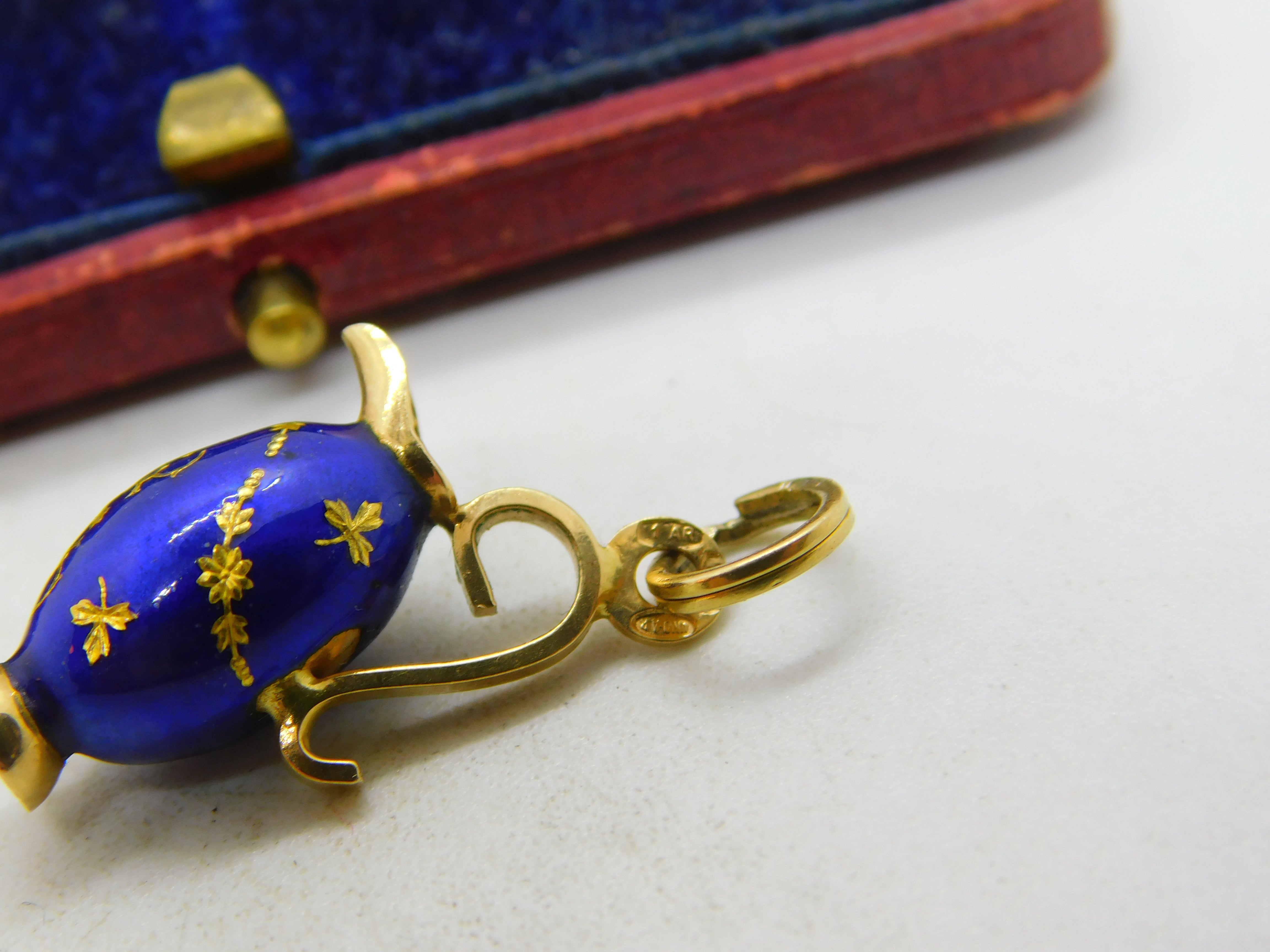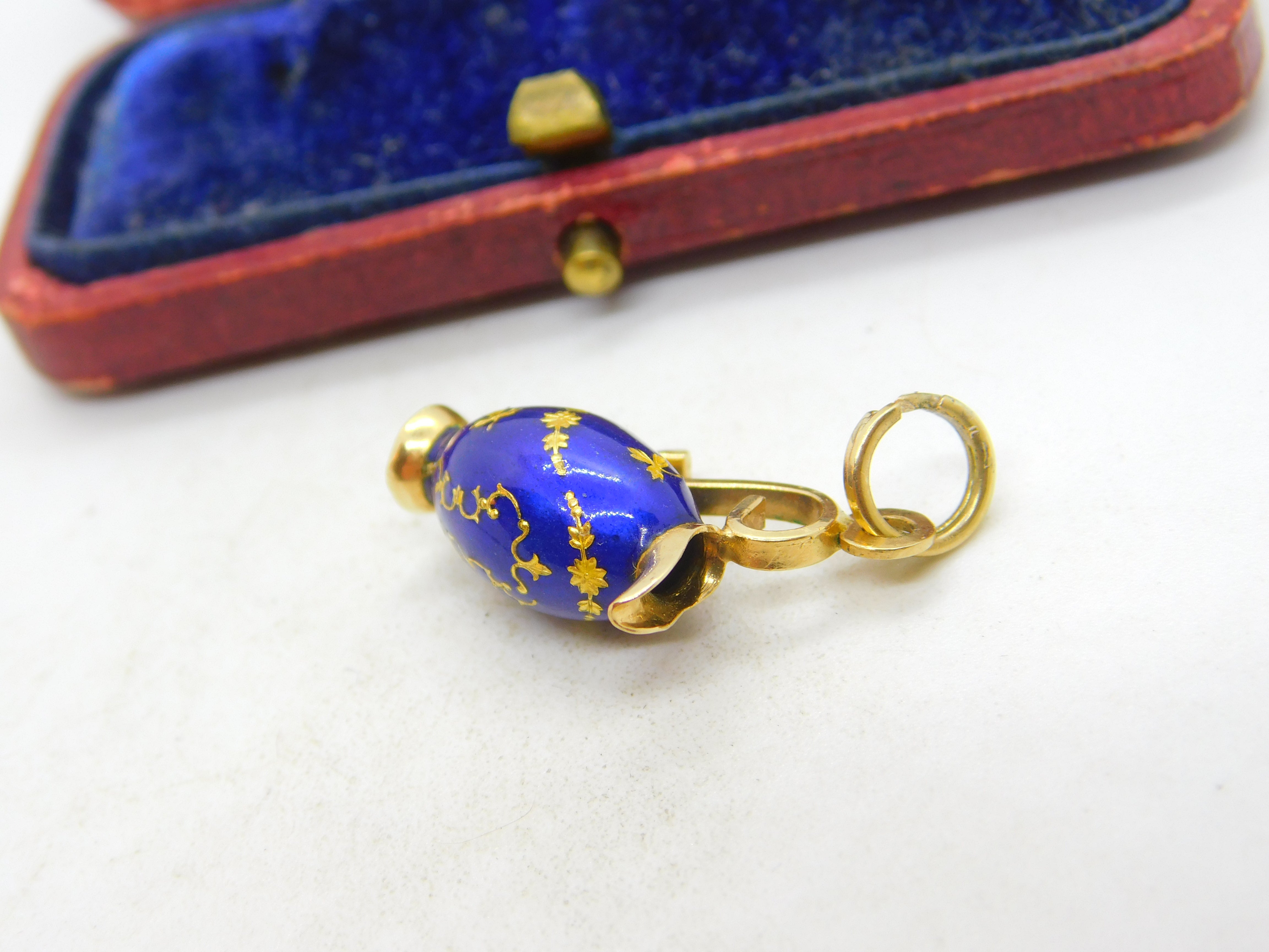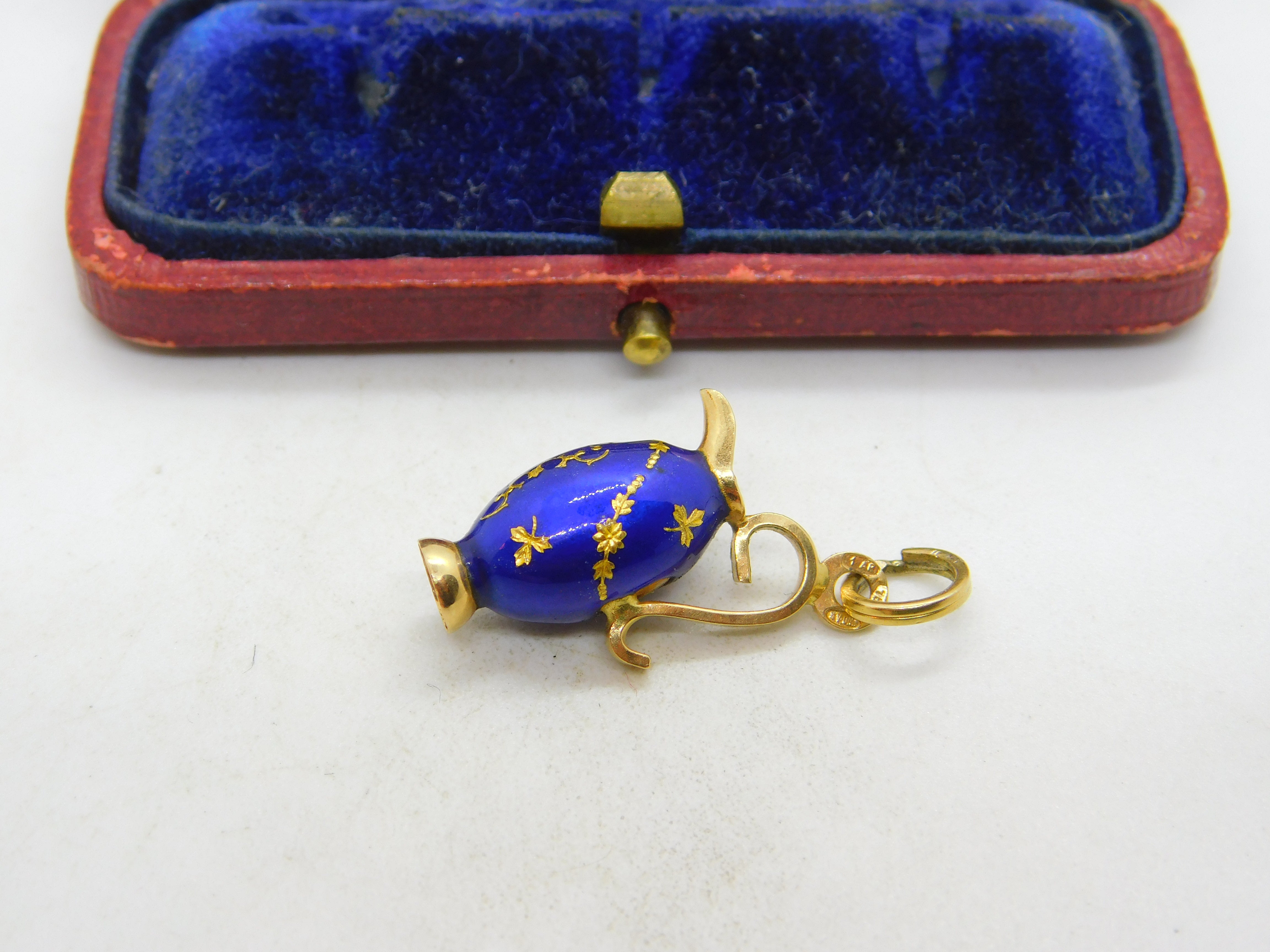 Details: A fantastic and wonderfully designed vintage 18ct yellow gold & blue enamel wine jug charm or pendant with lovely detailing possibly Italian hallmarked to the bale c1980. Very minor chip to the enamel base. This is a wonderful item that would make a perfect gift or addition to any collection. The BOX pictured is for PRESENTATION ONLY and is NOT included in the listings but used to frame the pictures unless specifically stated otherwise.
