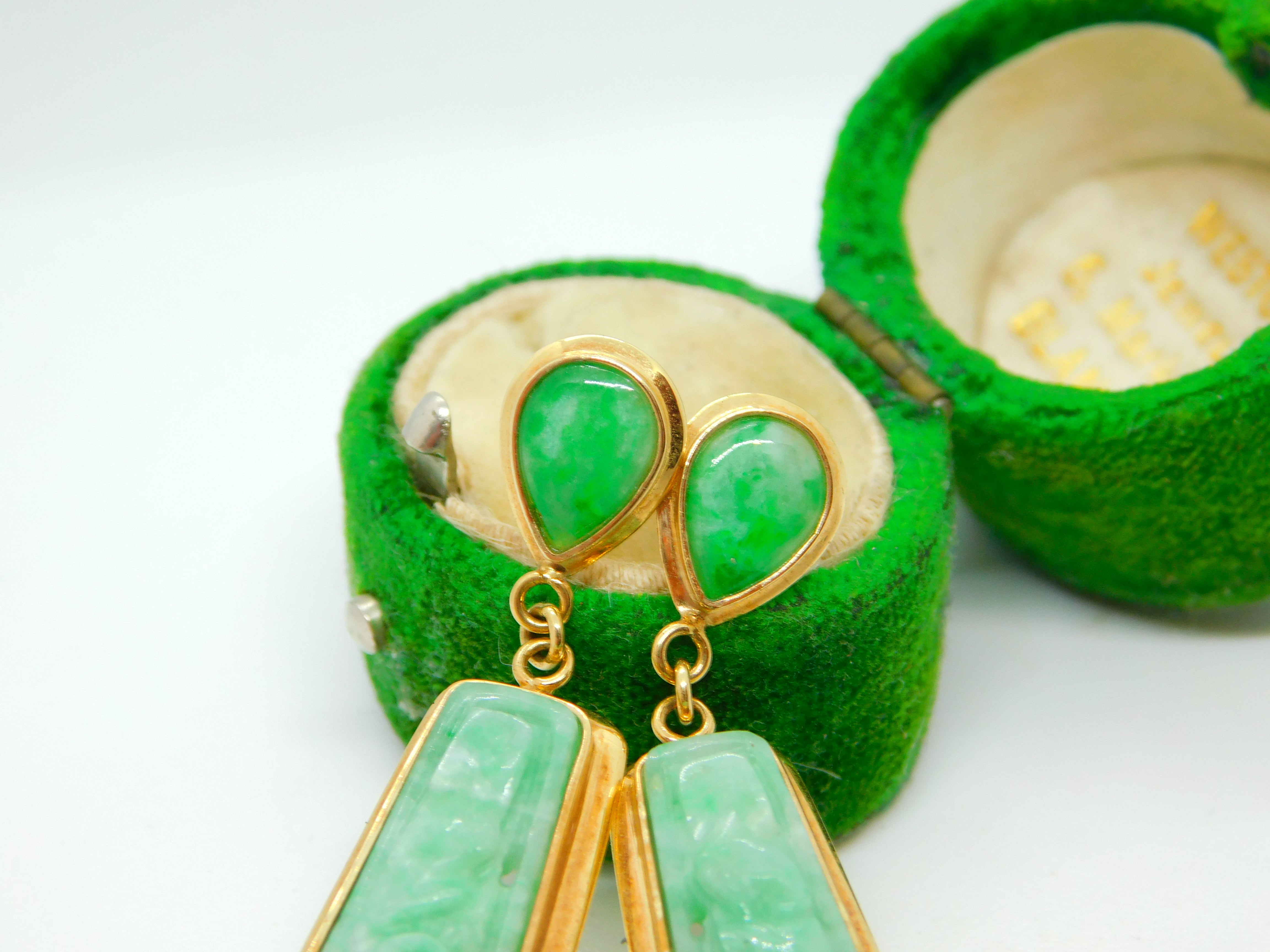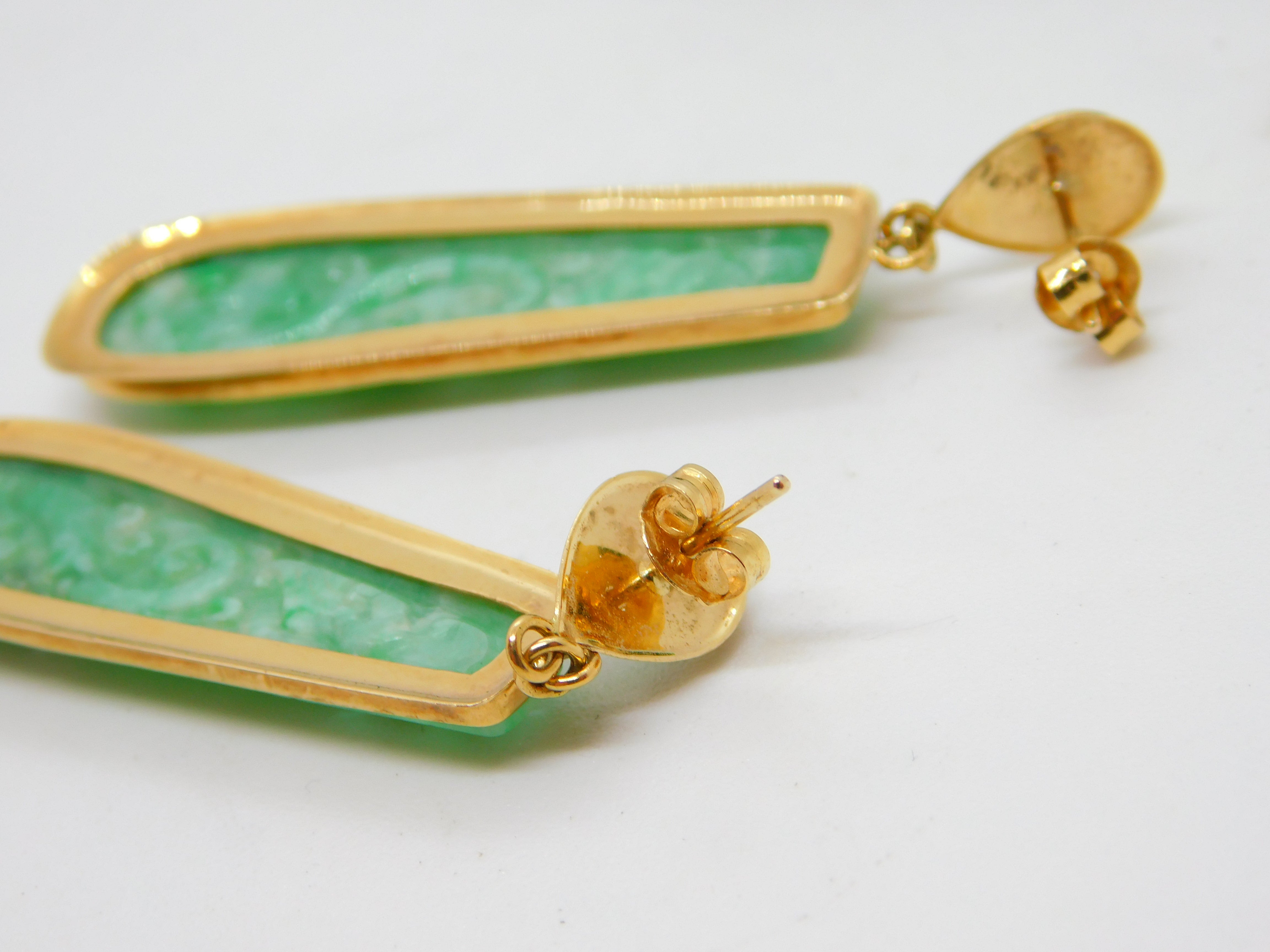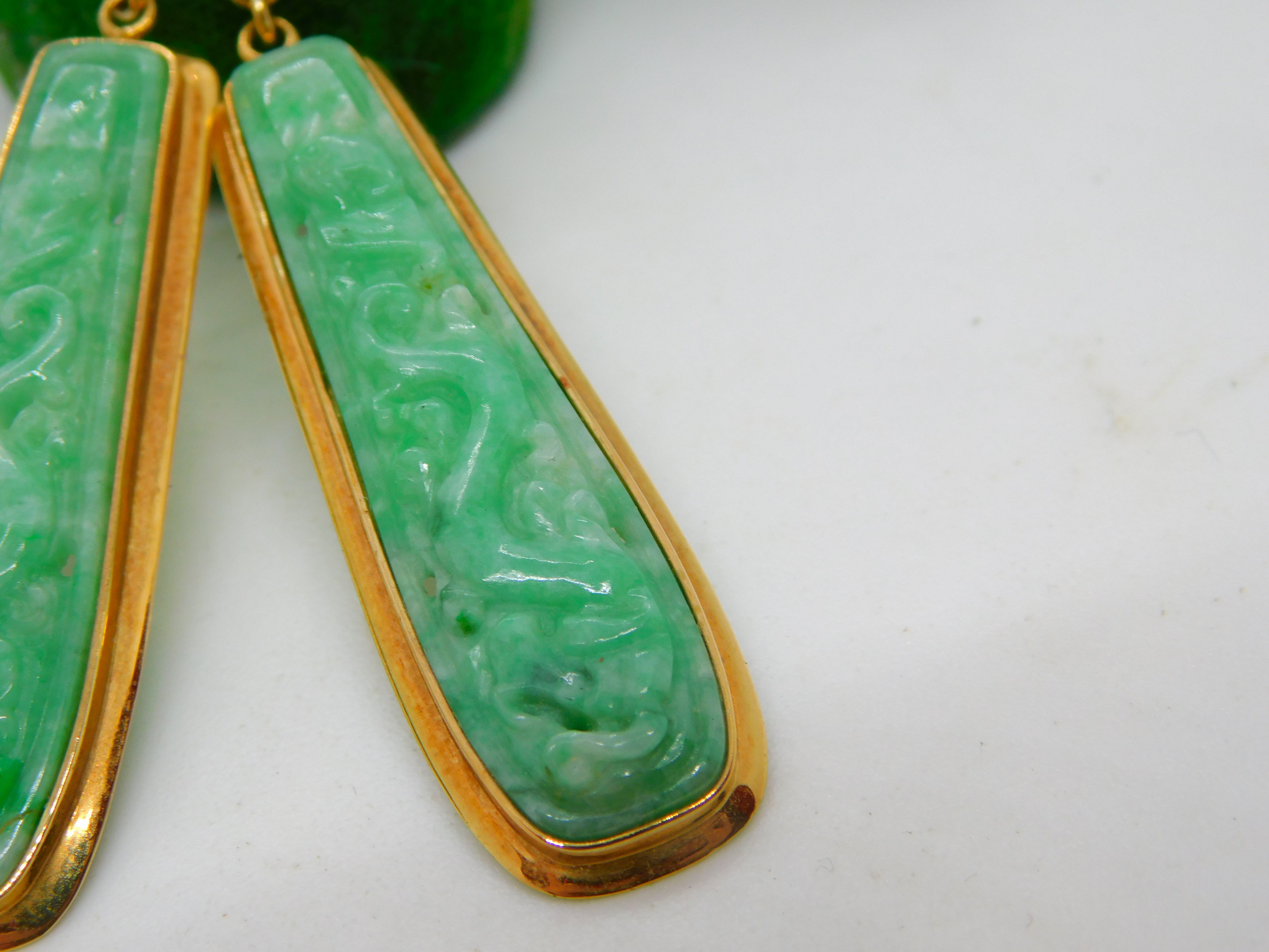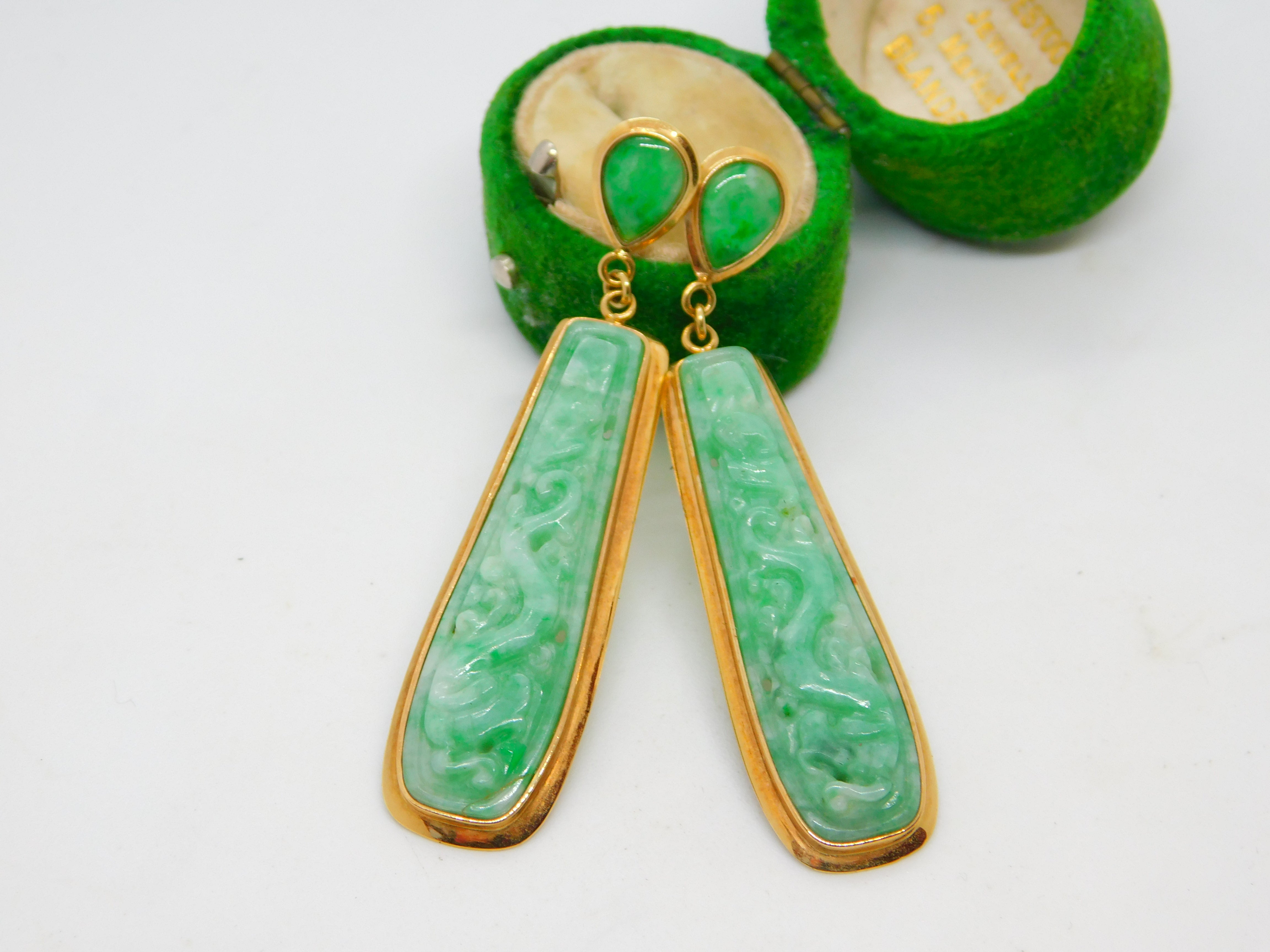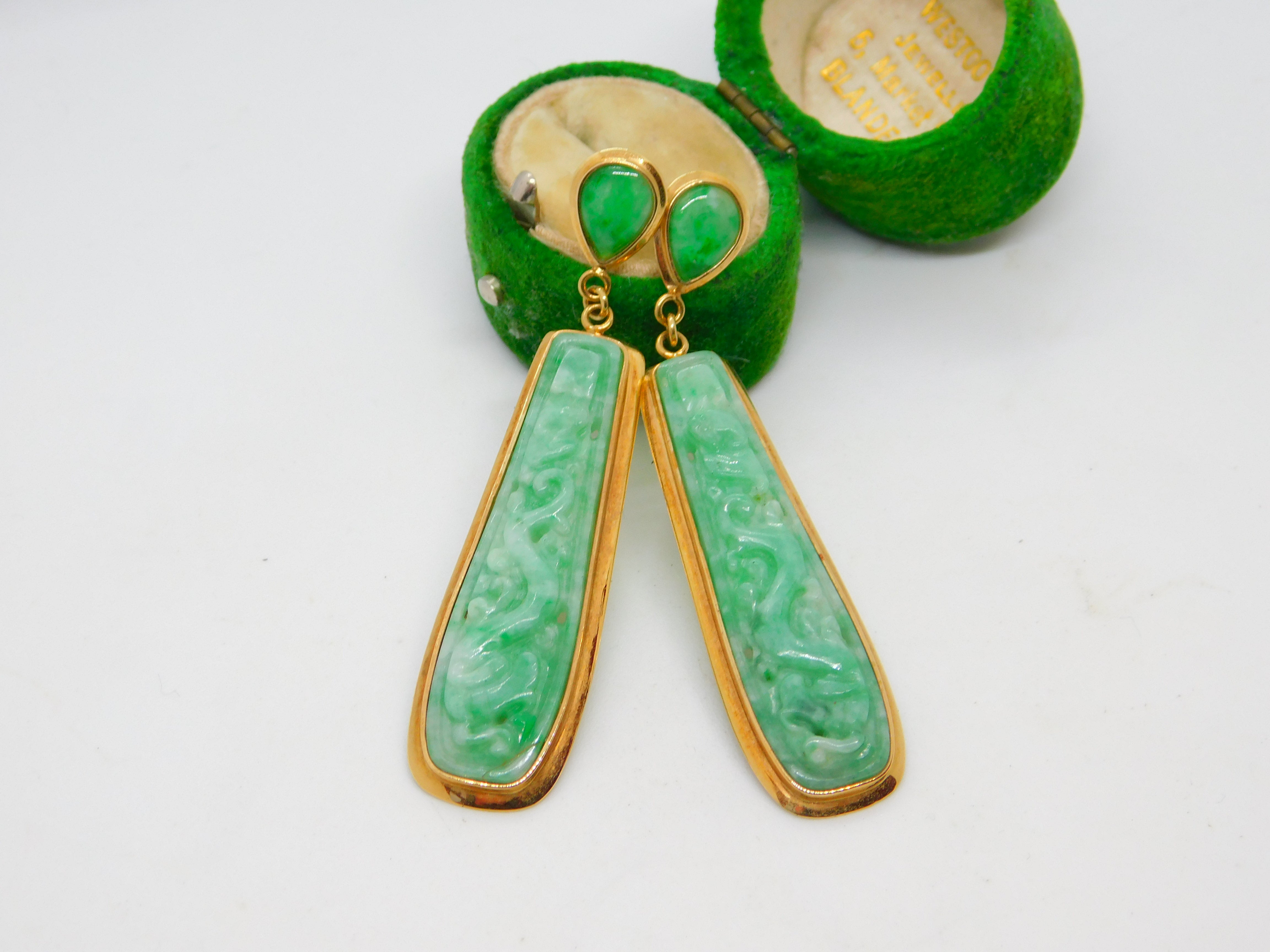 Details: A fantastic and wonderfully designed vintage 18ct yellow gold & carved apple-green jade drop earrings with lovely detailing hallmarked '750' to the backs c1970. This is a wonderful item that would make a perfect gift or addition to any collection. The BOX pictured is for PRESENTATION ONLY and is NOT included in the listings but used to frame the pictures unless specifically stated otherwise.