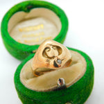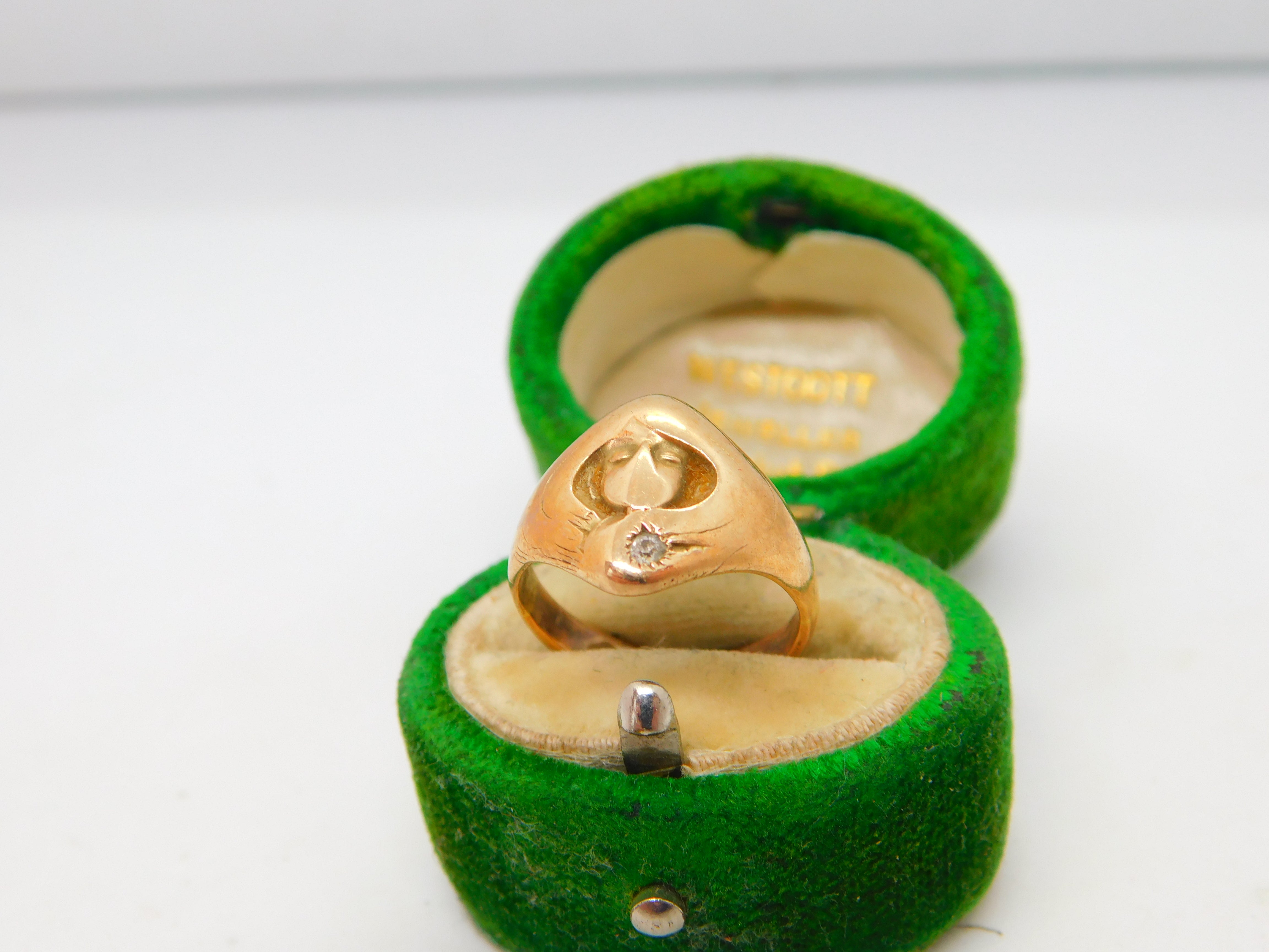 Details: A fantastic and wonderfully designed antique 18ct yellow gold signet ring depicting the face of a lady in art nouveau style set with a diamond to the bottom edge c1930, the gold has been XRF tested as it is unmarked. This is a wonderful item that would make a perfect gift or addition to any collection. The BOX pictured is for PRESENTATION ONLY and is NOT included in the listings but used to frame the pictures unless specifically stated otherwise.