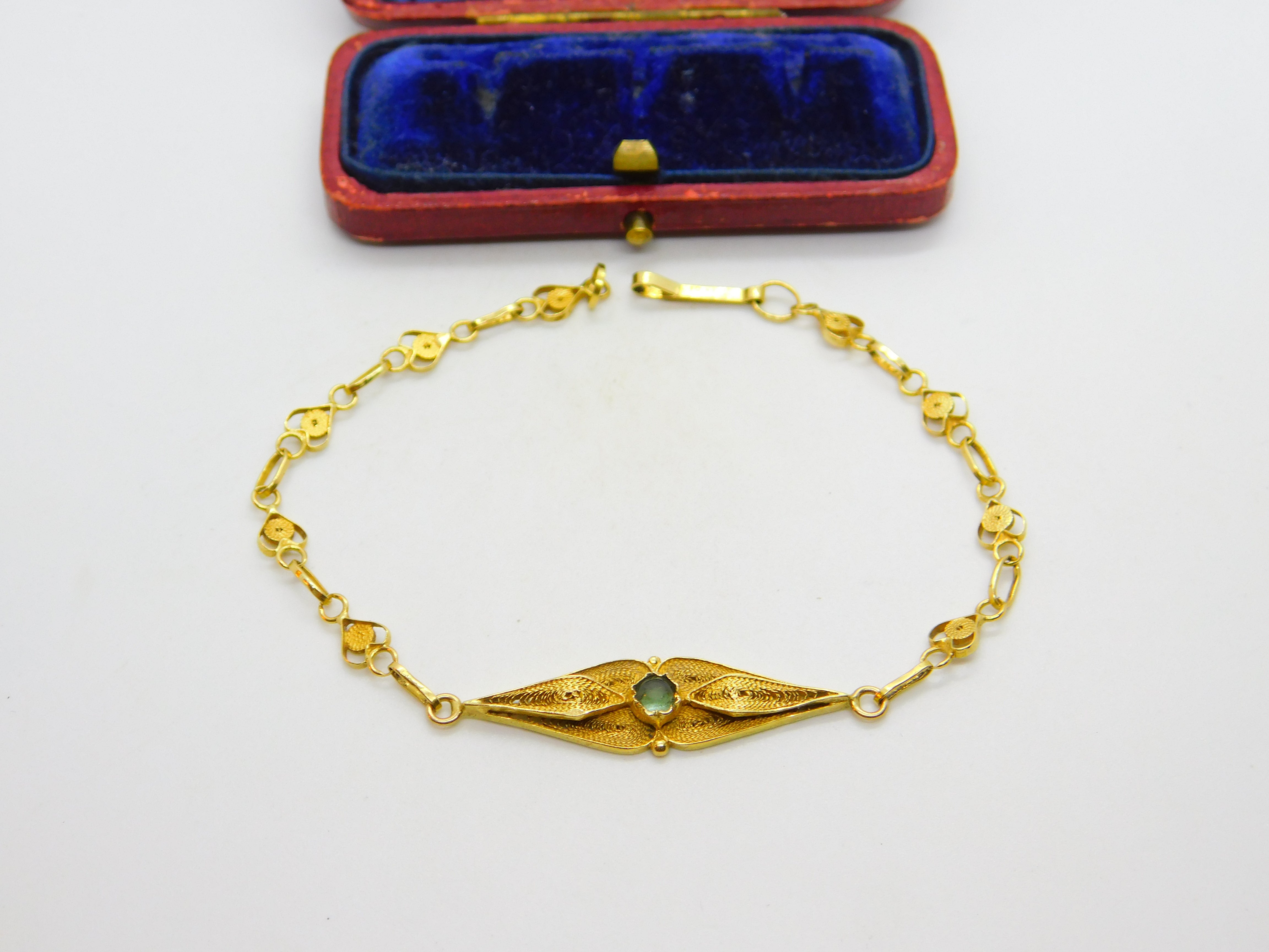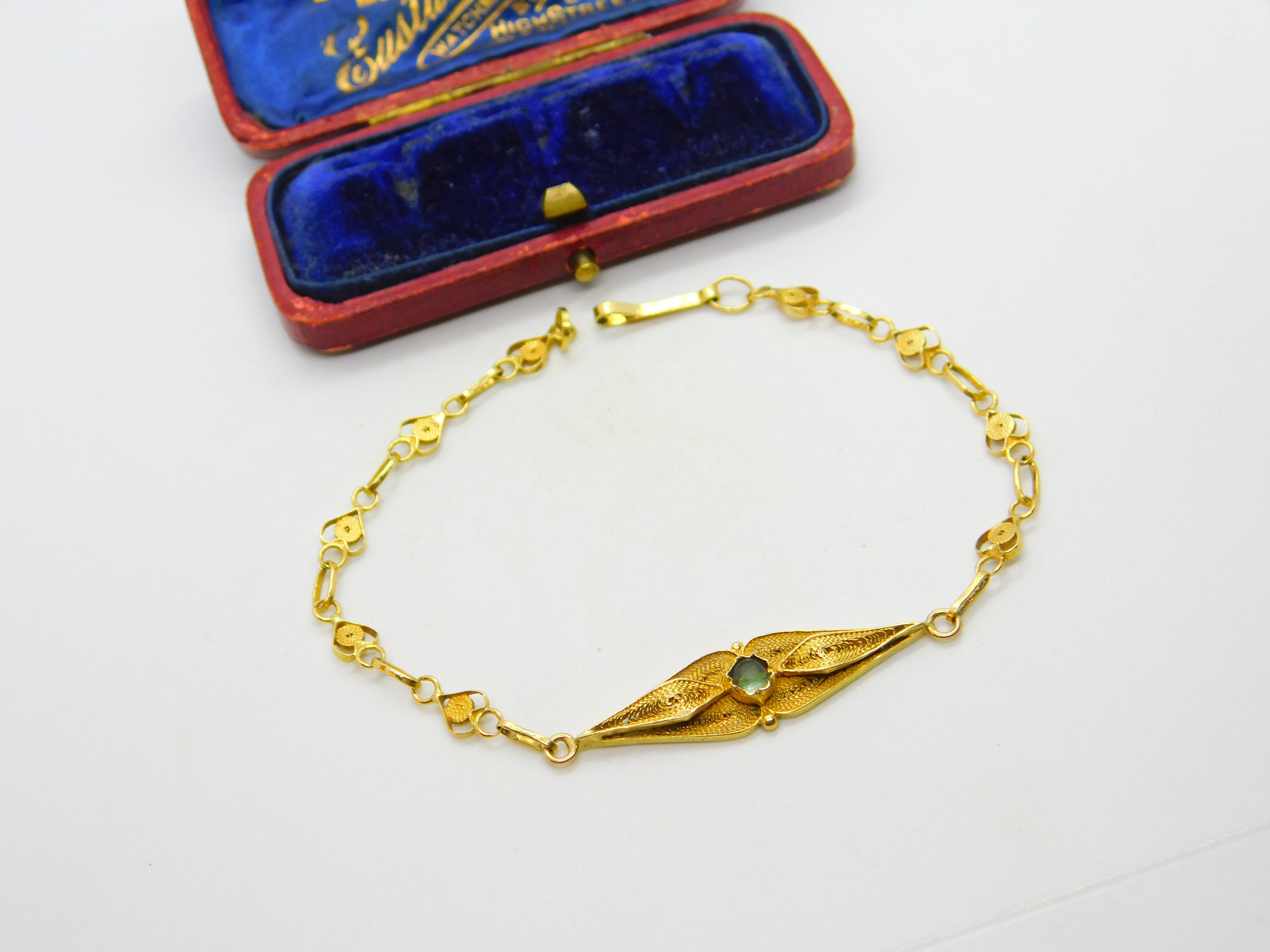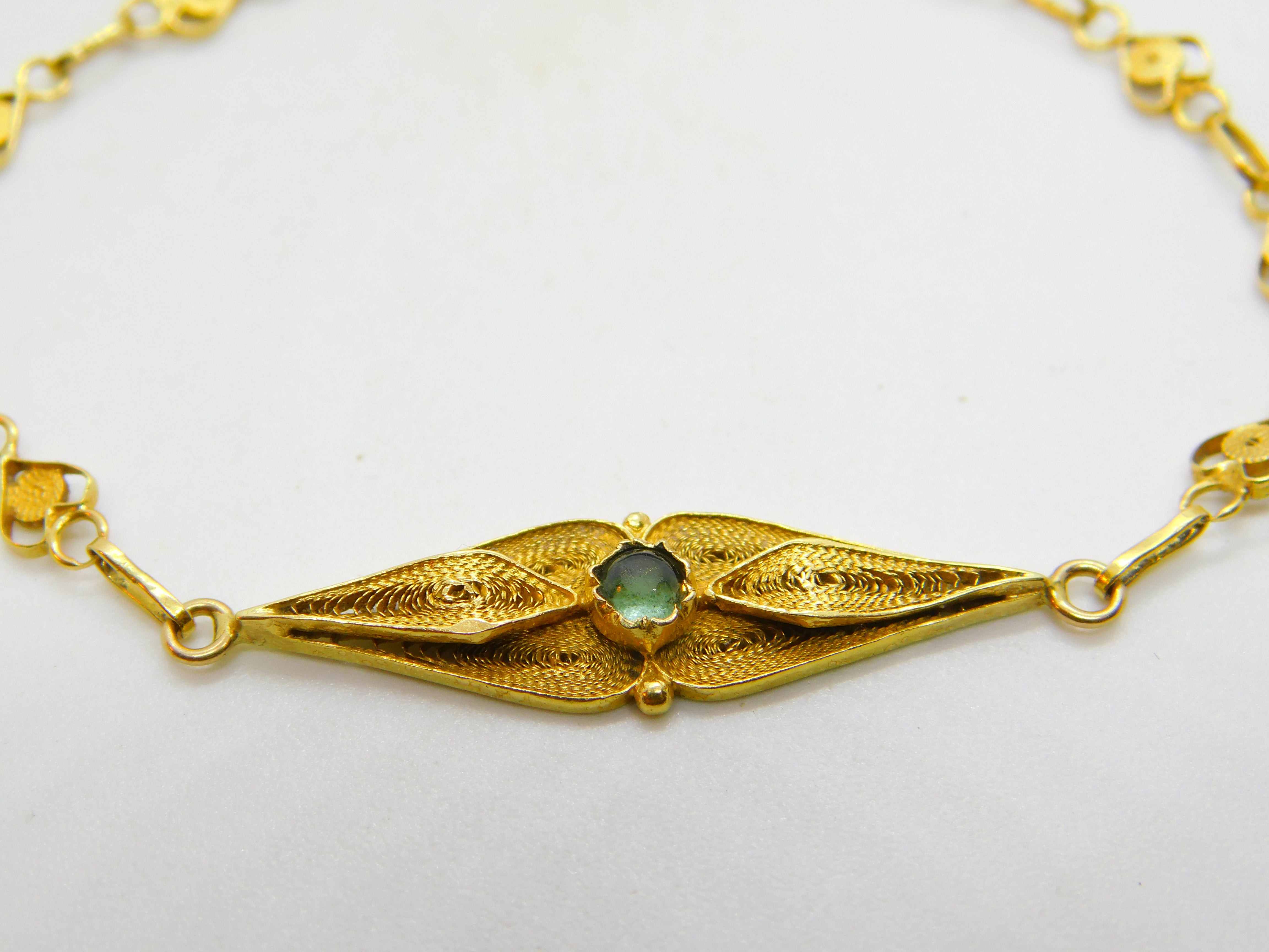 18ct Yellow Gold Heart Panel Filigree Form Sea Glass Set Panel Bracelet Antique