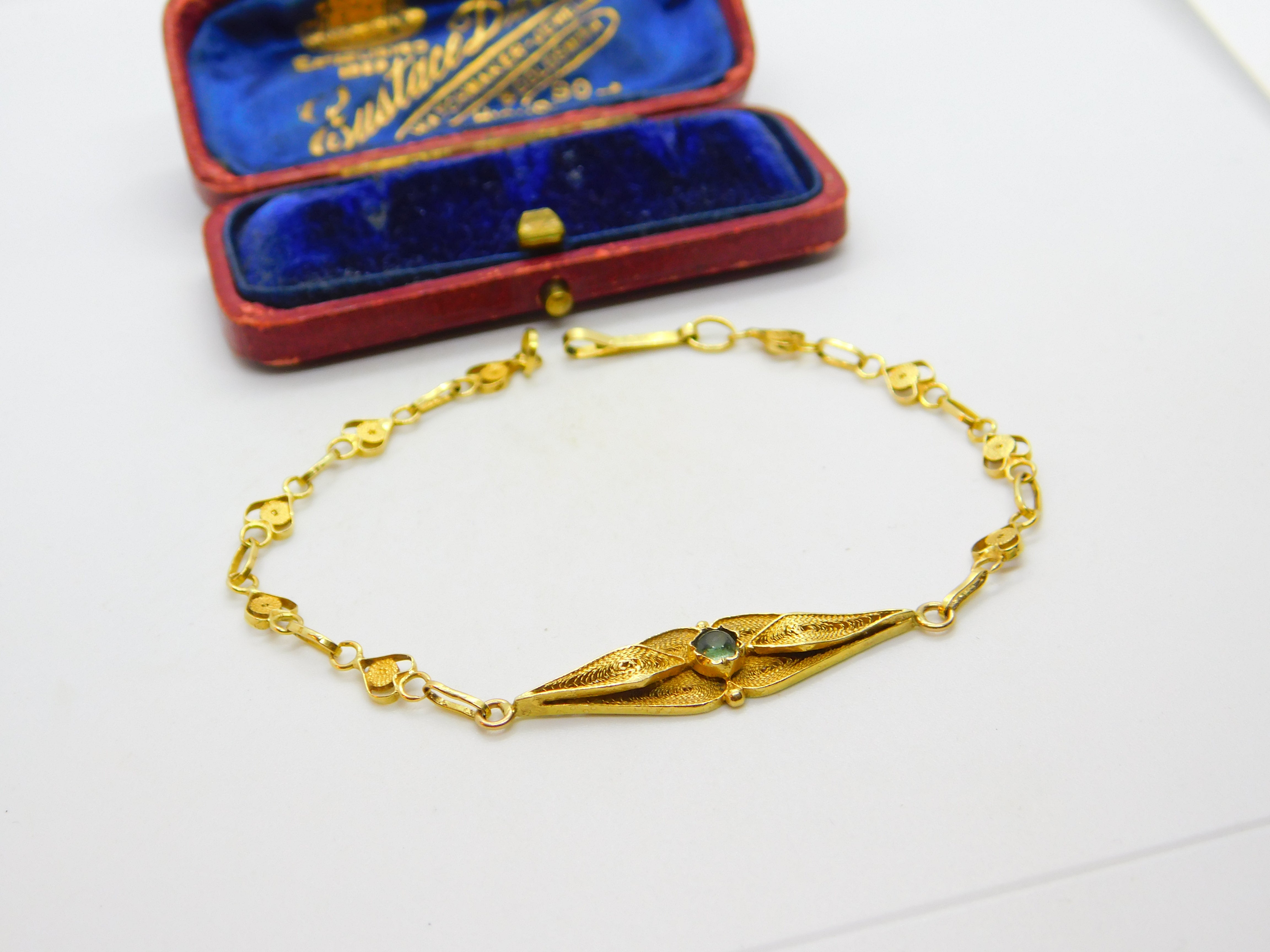Details: A fantastic and wonderfully designed antique art deco 18ct yellow gold filigree form panel bracelet with super heart patterns set with central sea glass hallmarked 18ct in multiple places c1920. This is a wonderful item that would make a perfect gift or addition to any collection. The BOX pictured is for PRESENTATION ONLY and is NOT included in the listings but used to frame the pictures unless specifically stated otherwise.