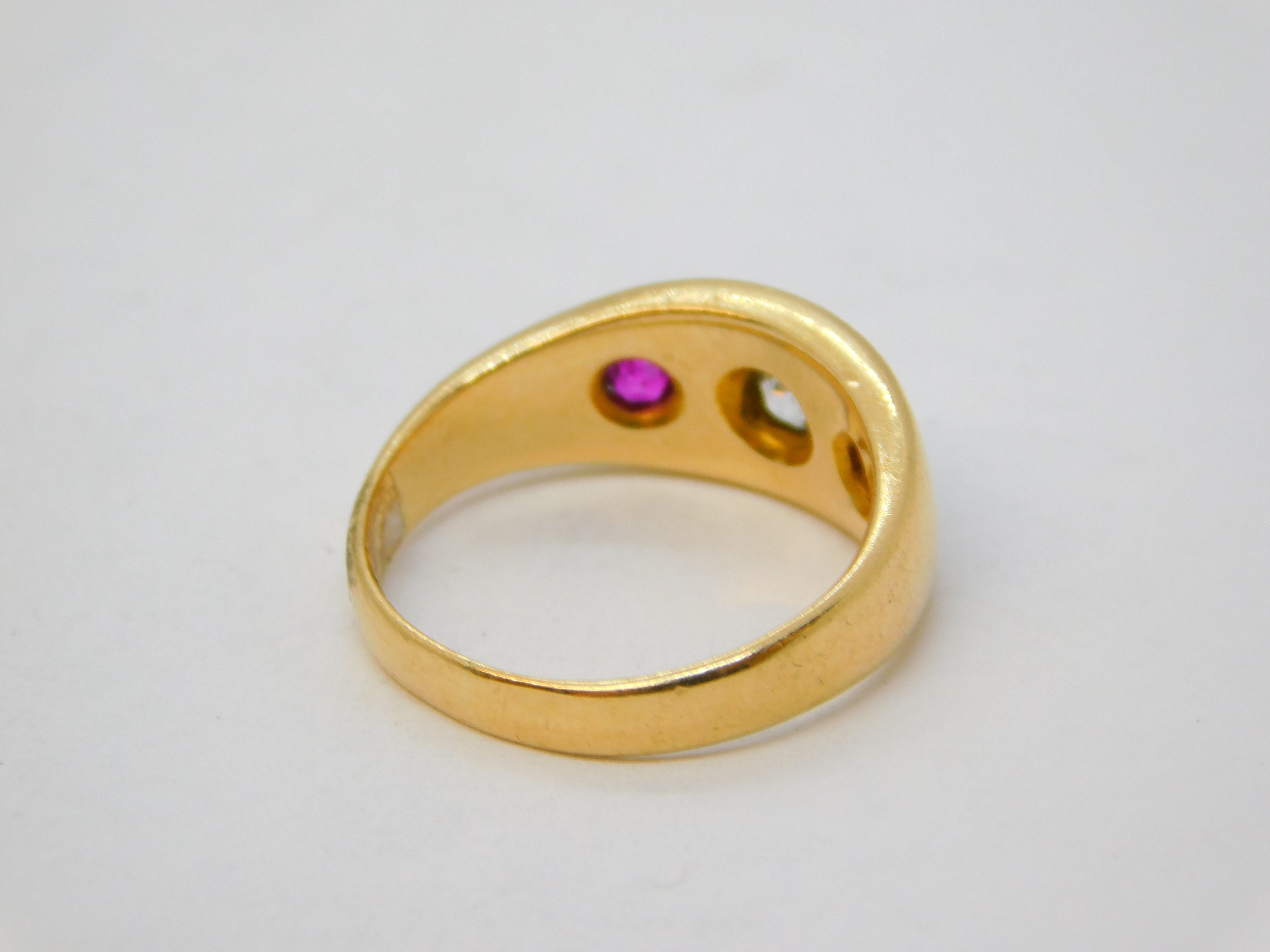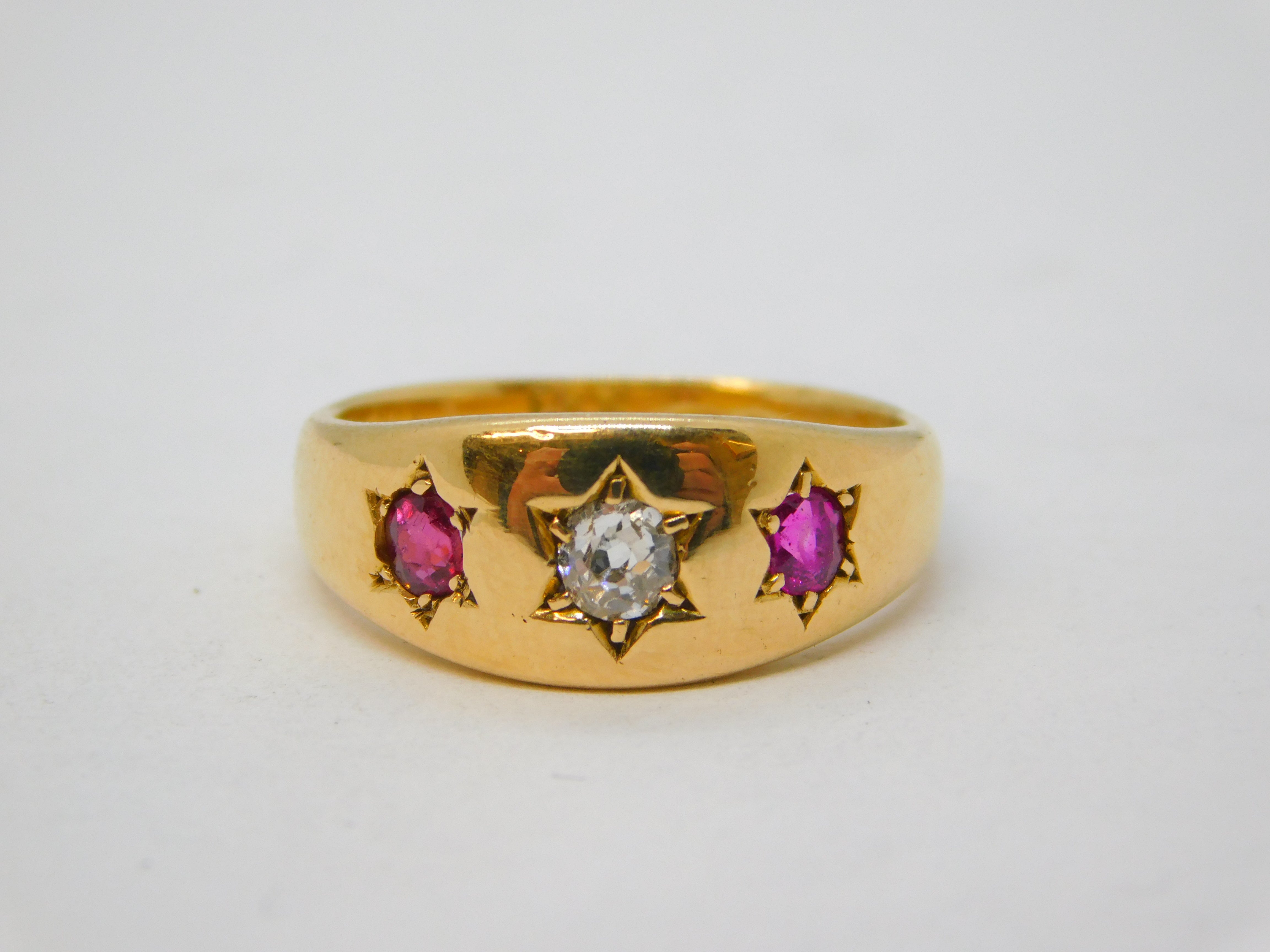 Details: A fantastic and wonderfully designed antique Victorian 18ct yellow gold gypsy ring set with central old-cut diamond flanked by two rubies, hallmarked for Chester 1874 to the interior. The stones have been tested. This is a wonderful item that would make a perfect gift or addition to any collection. We are more than happy to provide XRF reports for items upon request.