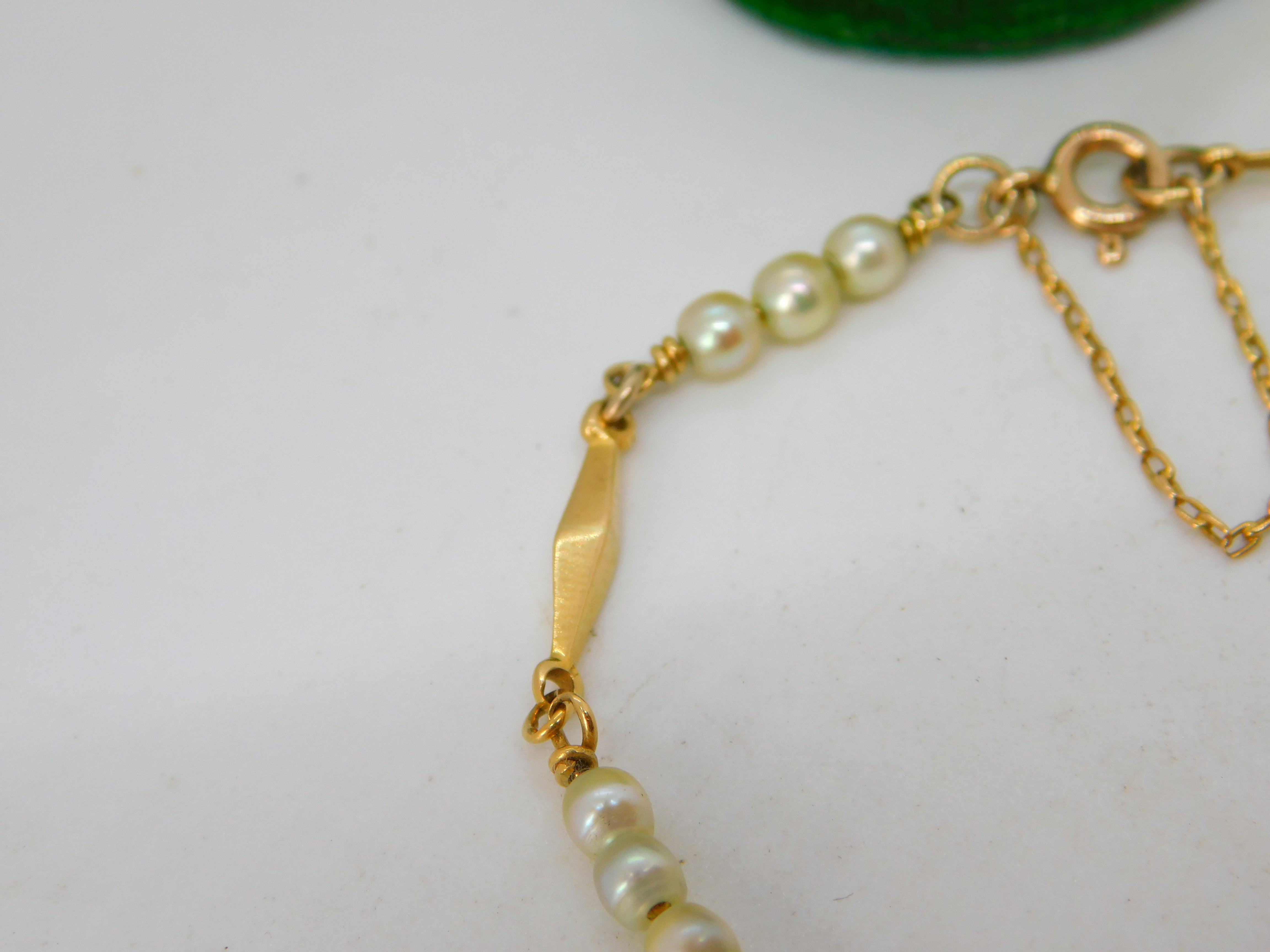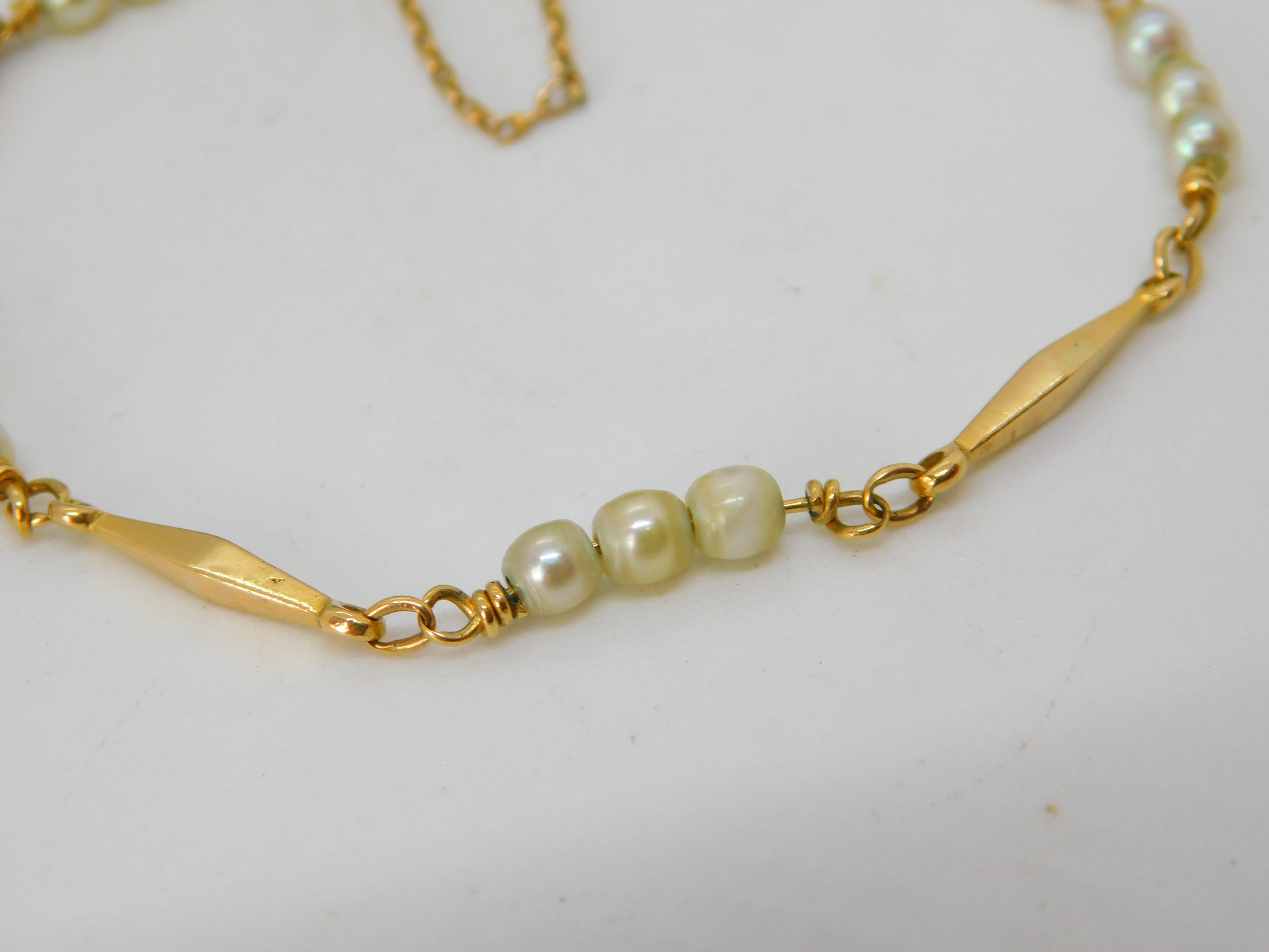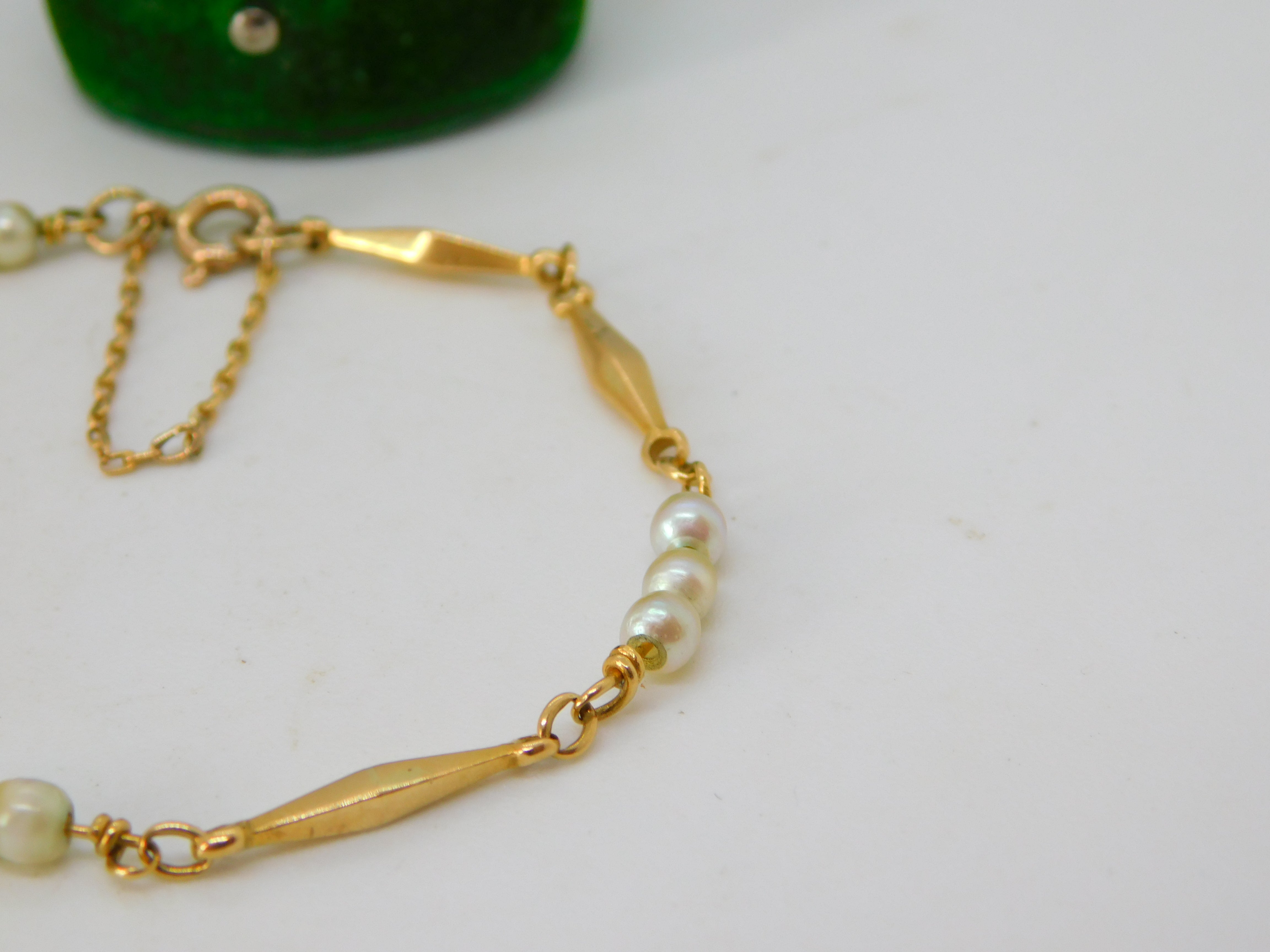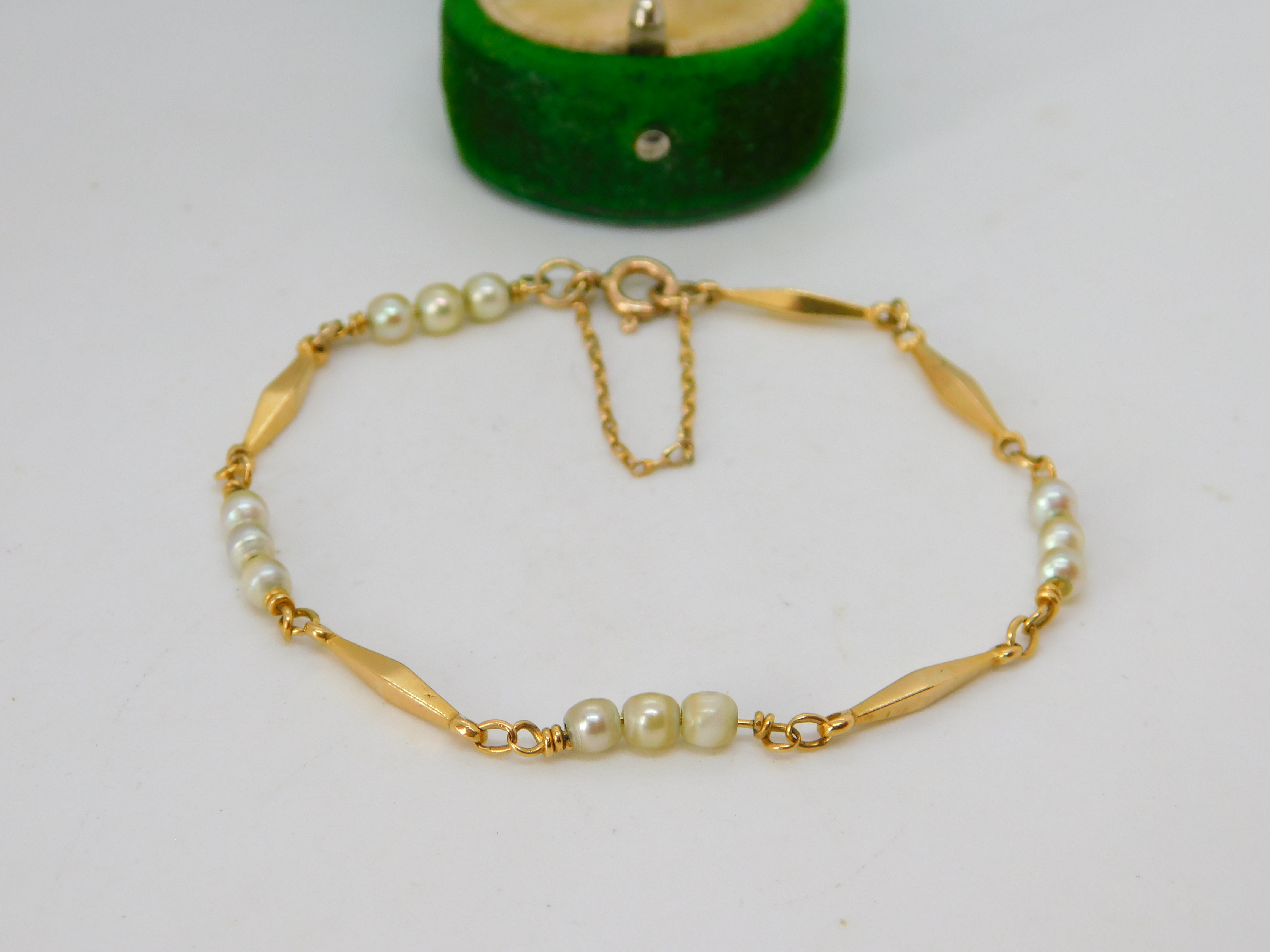 Details: A fantastic and wonderfully designed antique art deco 18ct yellow gold panel bracelet interspersed with pearls c1930, the gold has been XRF tested as it is unmarked. This is a wonderful item that would make a perfect gift or addition to any collection. The BOX pictured is for PRESENTATION ONLY and is NOT included in the listings but used to frame the pictures unless specifically stated otherwise.