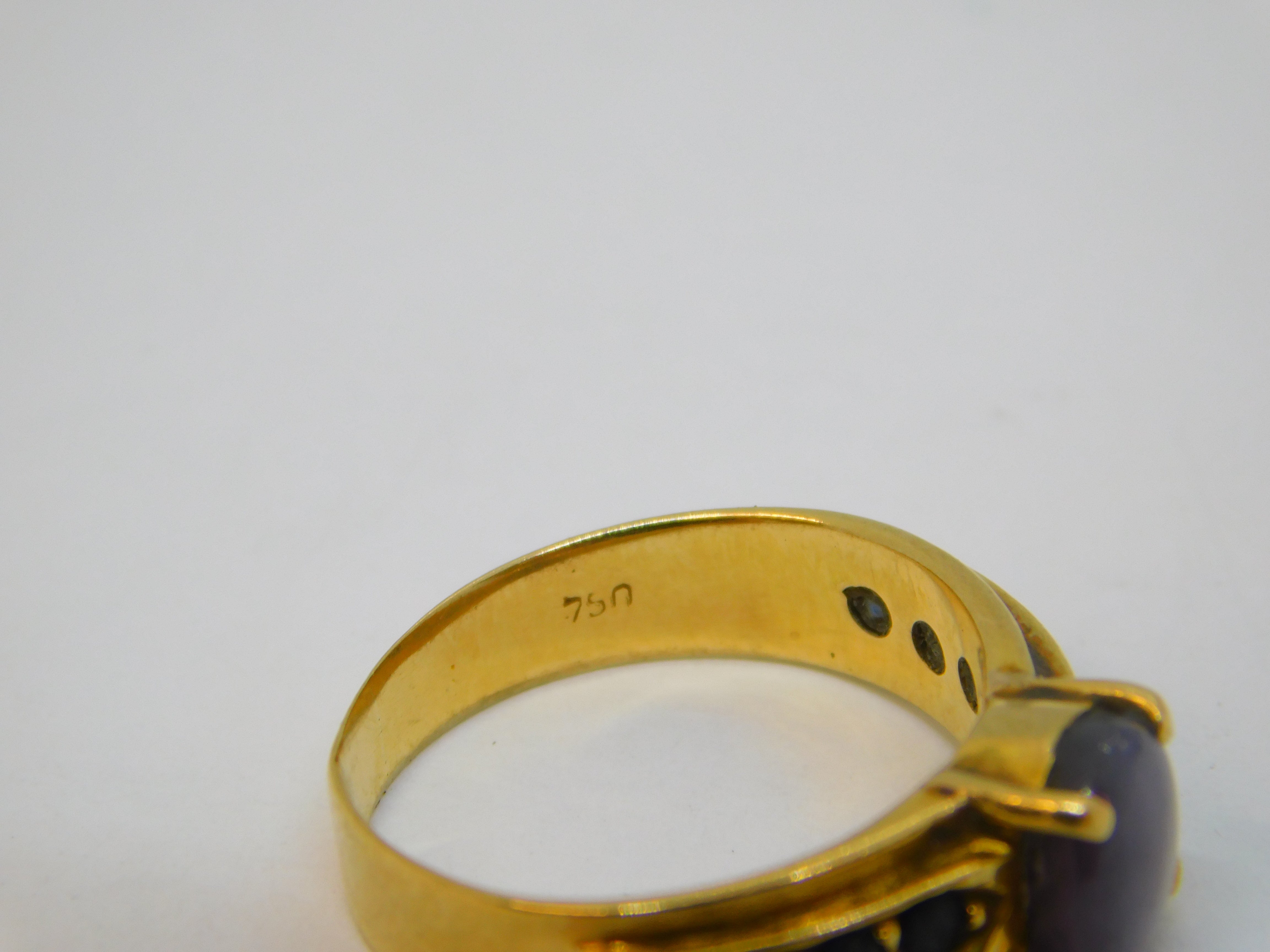 Details: A fantastic and wonderfully designed vintage 18ct yellow gold dress ring set with central cabochon cut 'star' sapphire flanked by natural blue sapphires, hallmarked '750' to the interior and XRF tested. The stones have been tested. This is a wonderful item that would make a perfect gift or addition to any collection. We are more than happy to provide XRF reports for items upon request.