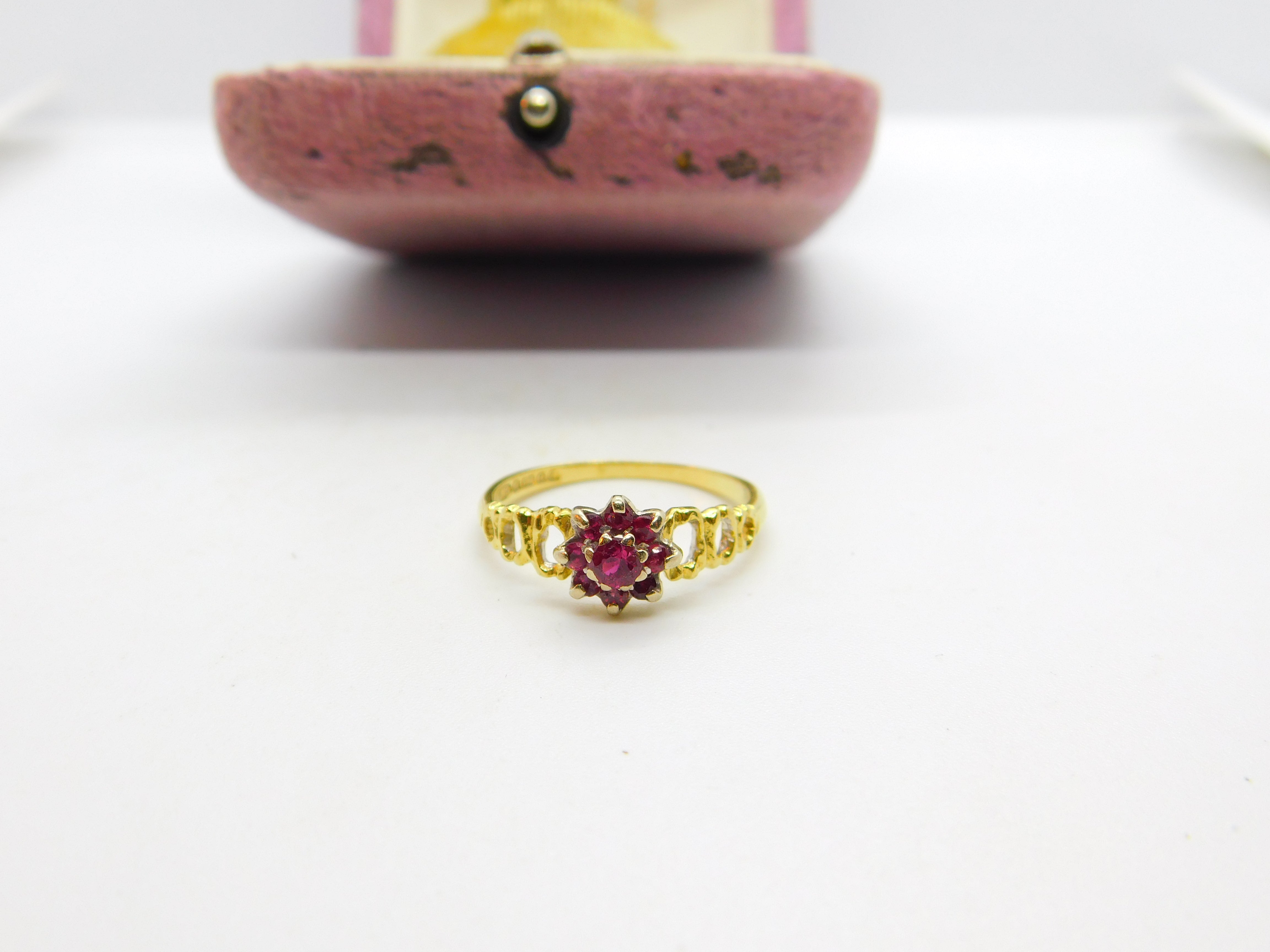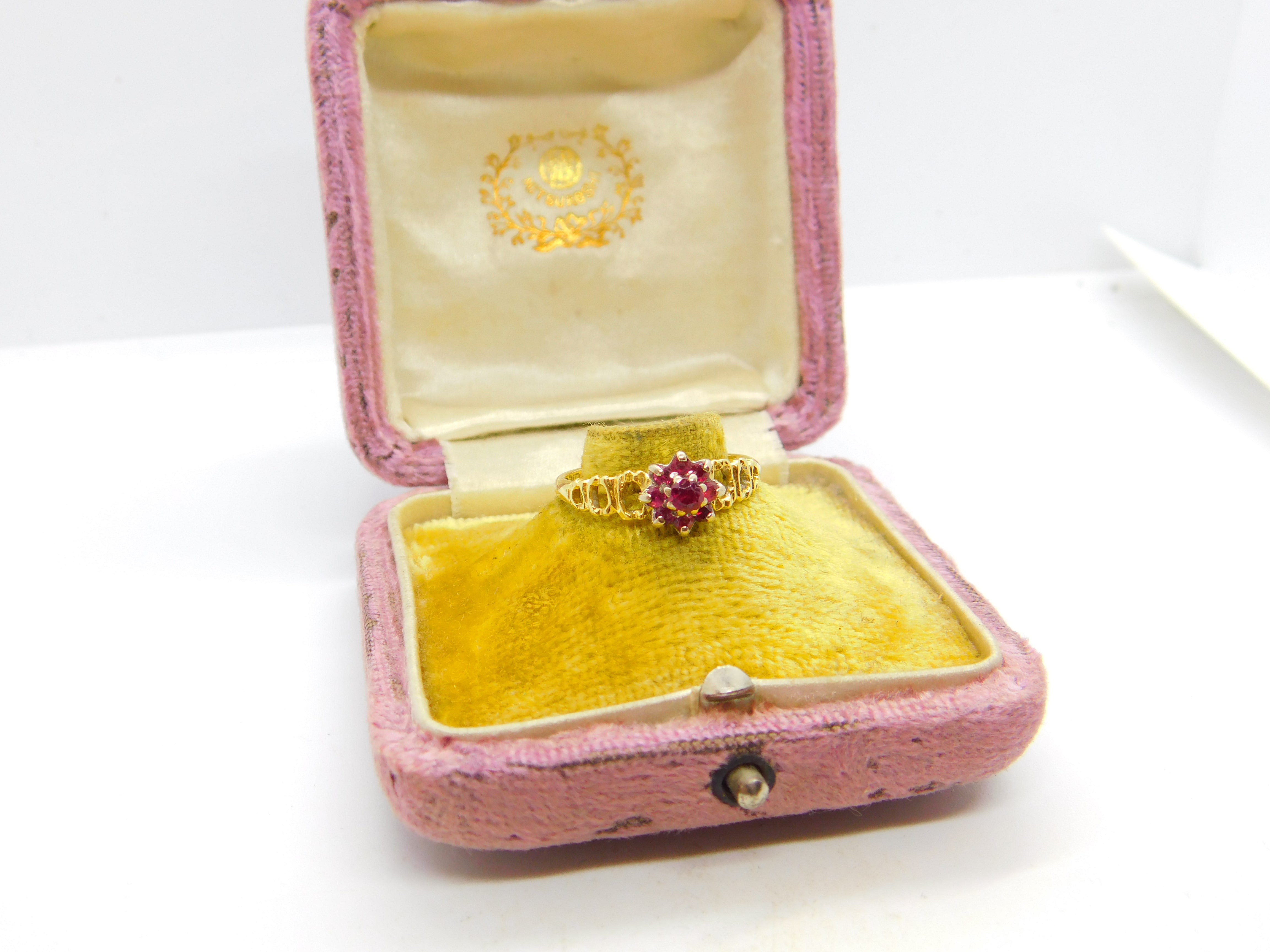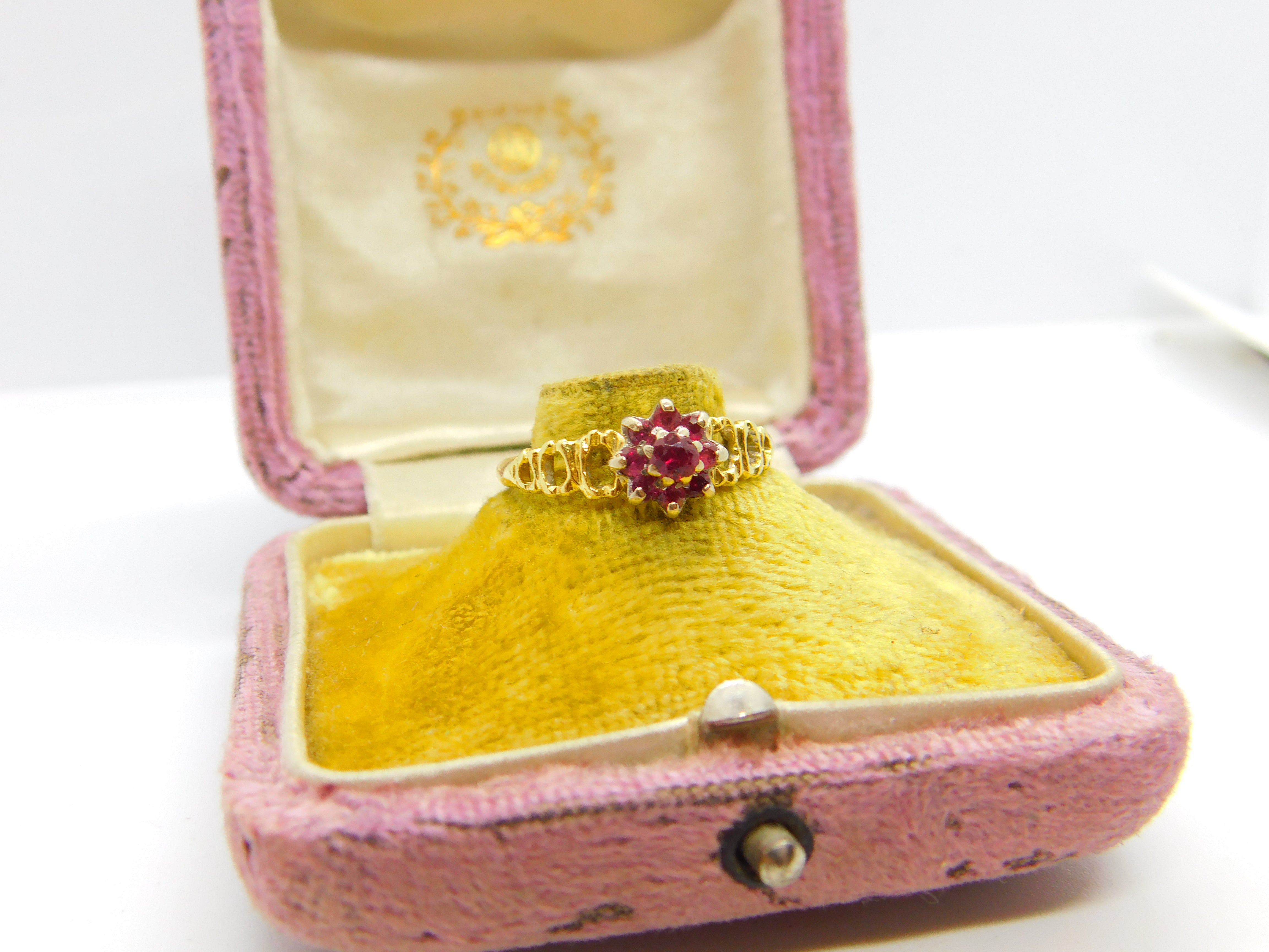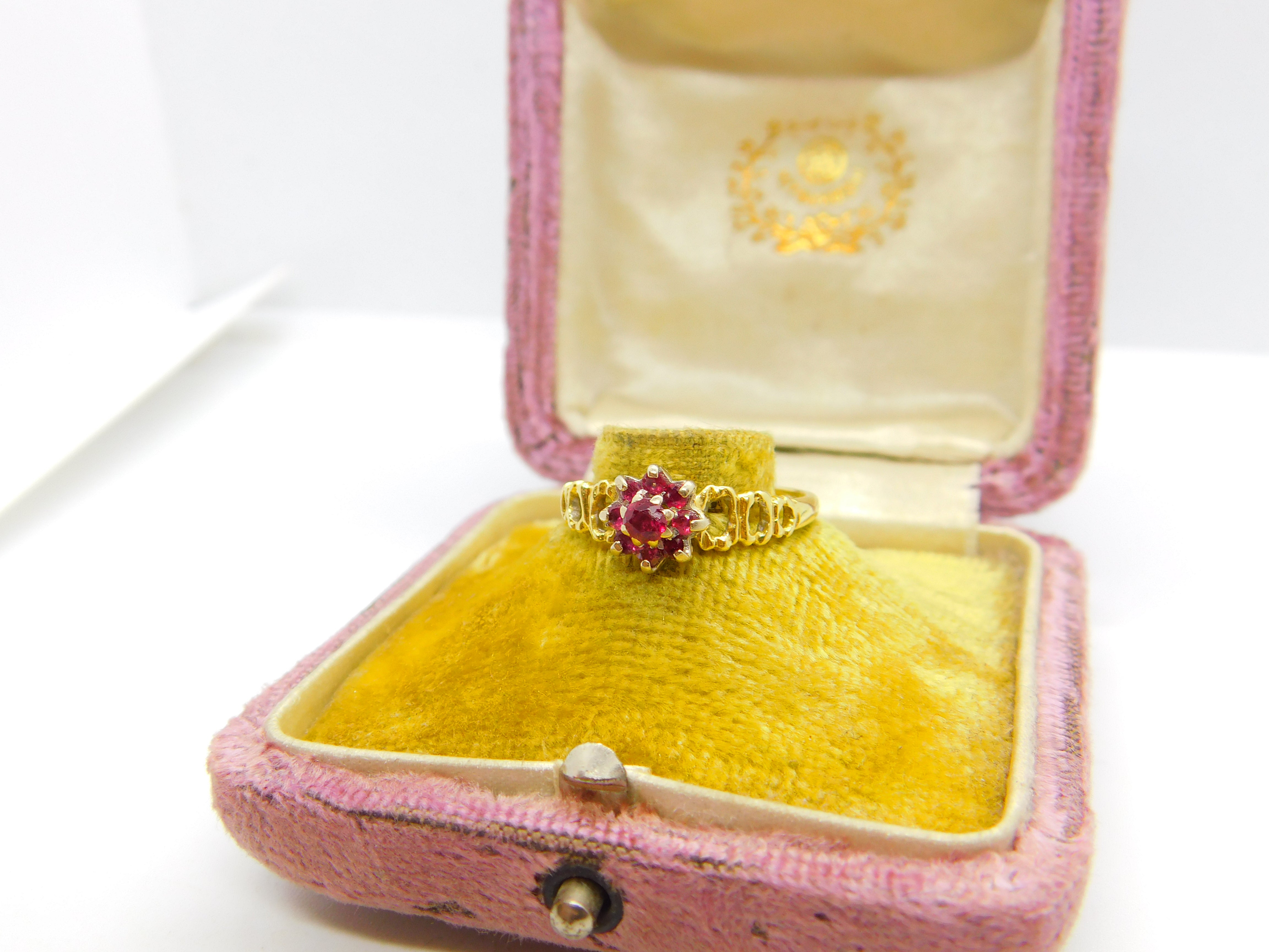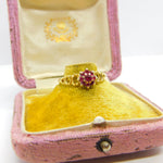18ct Yellow Gold Textured Natural Ruby Set Floral Cluster Ring 1974 Birmingham