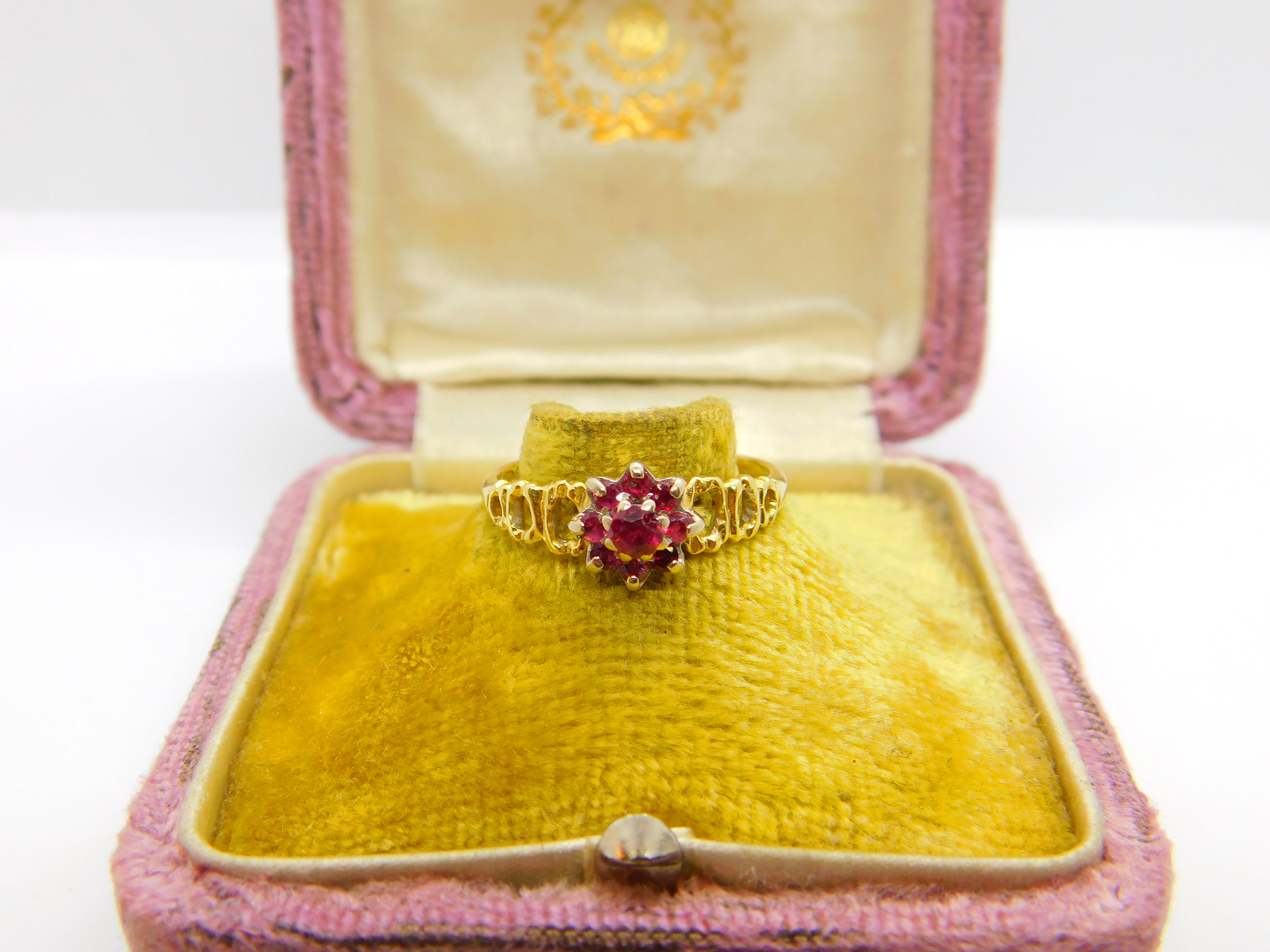 Details: A fantastic and wonderfully designed vintage 18ct yellow gold natural ruby set floral cluster ring with superb textured shoulders hallmarked Birmingham 1974 with an import hallmarked, the stones have been tested. This is a wonderful item that would make a perfect gift or addition to any collection. The BOX pictured is for PRESENTATION ONLY and is NOT included in the listings but used to frame the pictures unless specifically stated otherwise.