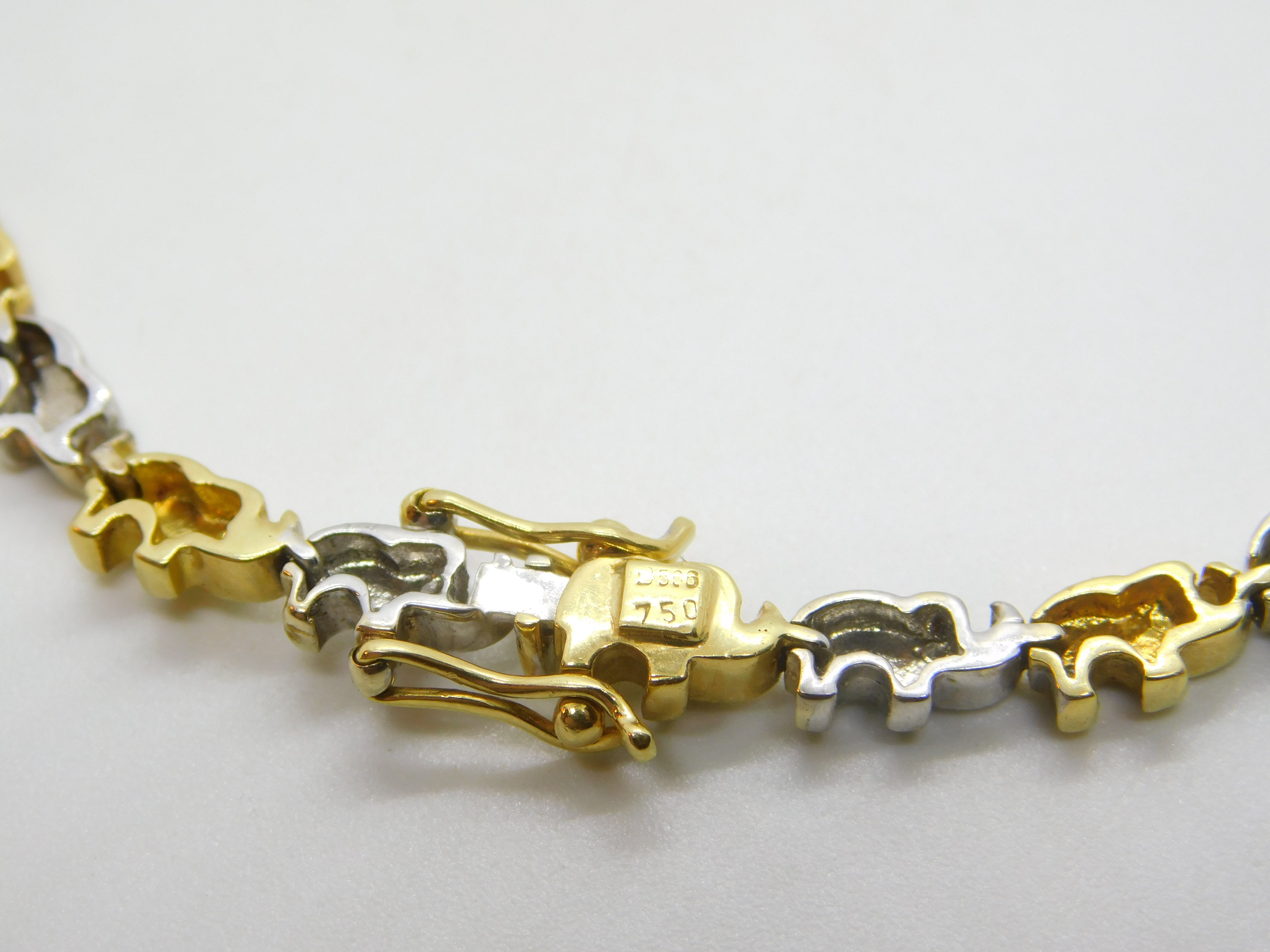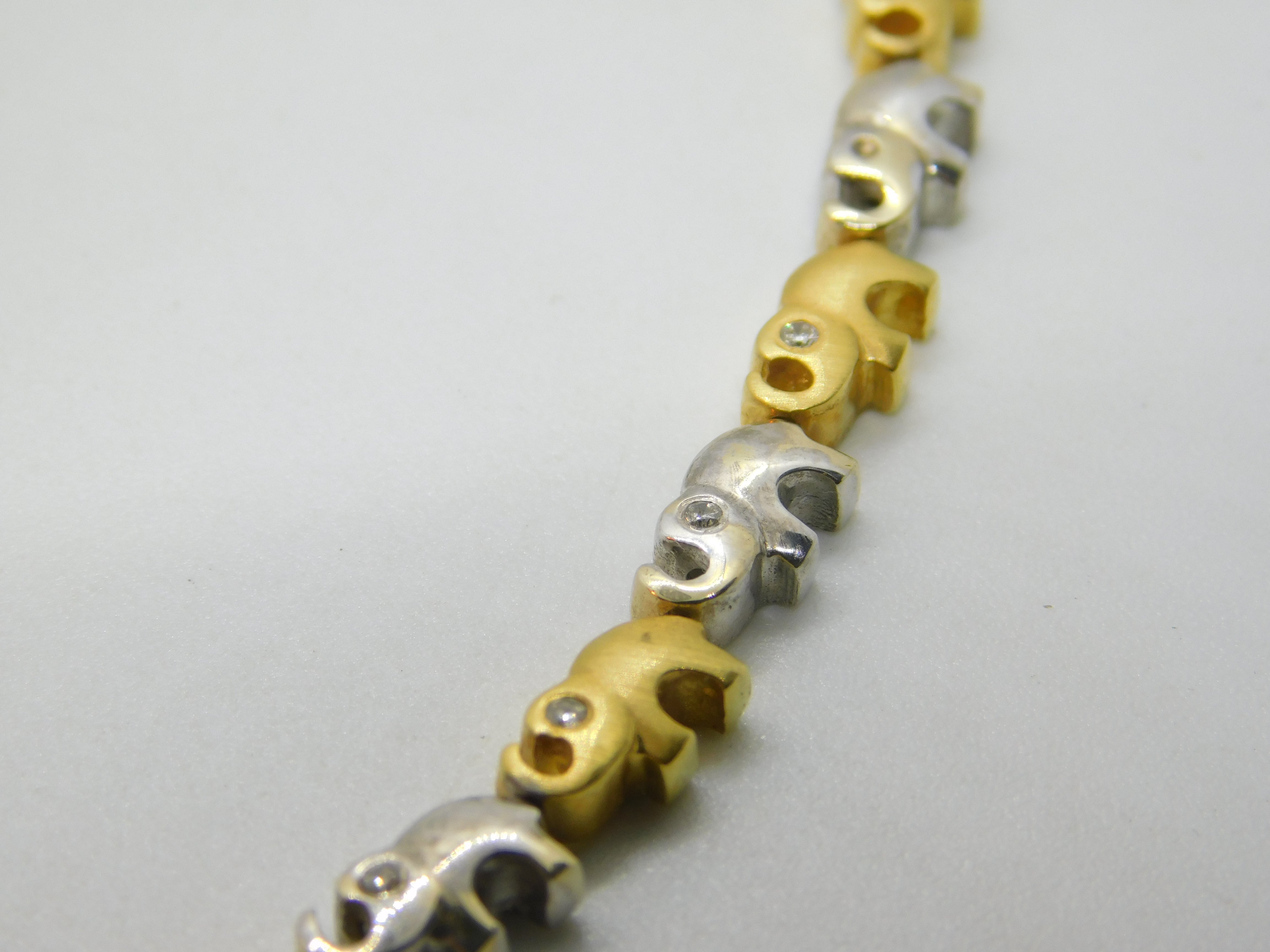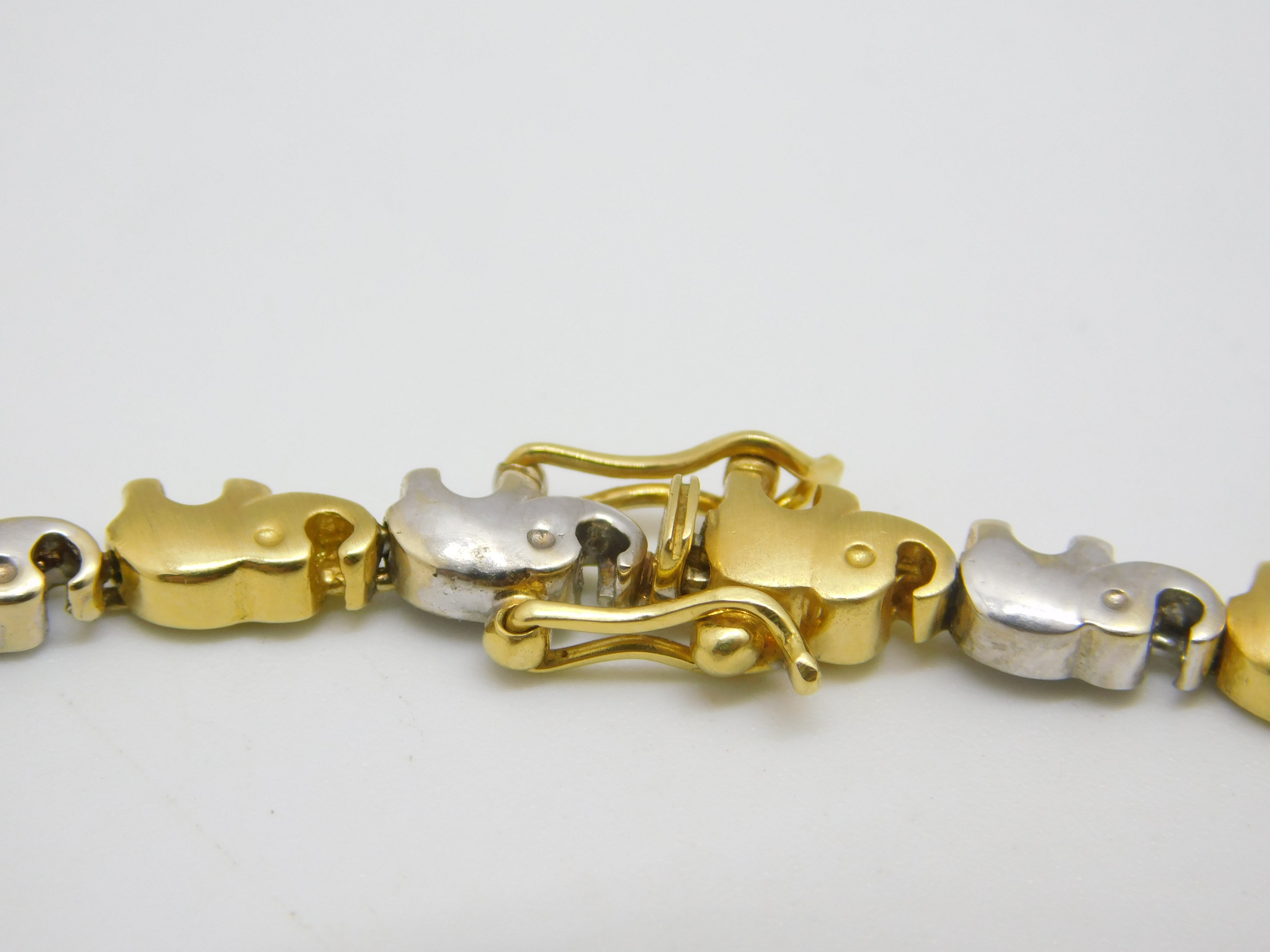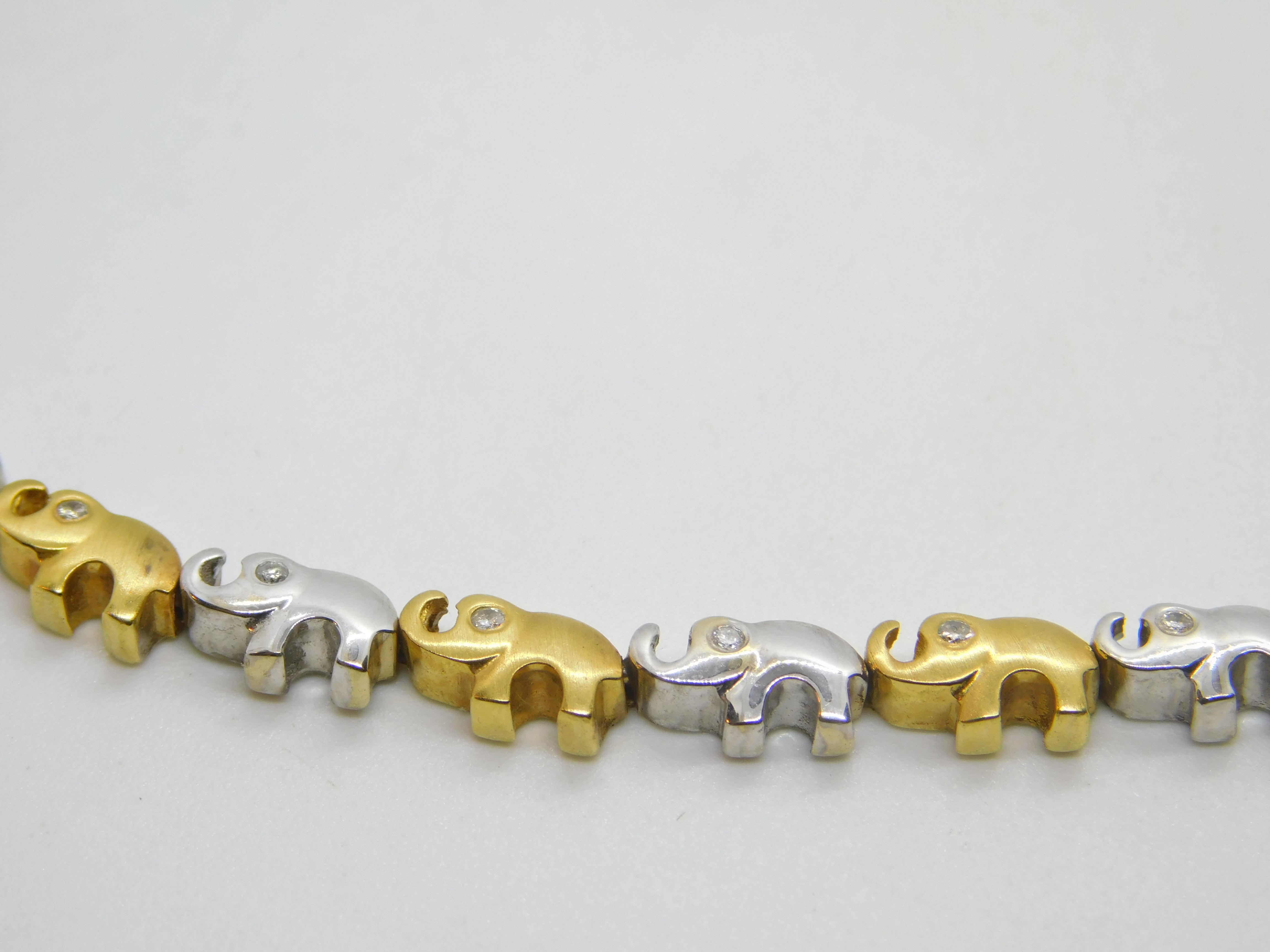 Simply stunning quality to this vintage 2 colour, yellow and white 18ct gold necklace dating from the 1980's. The links of the chain are made from elephants with raised trunks for luck with real diamond eyes. The gold is marked to the rear of the clasp, good secure clasp with safety clips top and bottom for added peace of mind. The diamonds have been tested, there are 19 central front elephants that have the diamond eyes, all are present and in good order. A simply wonderful and charming vintage gold necklace.