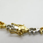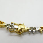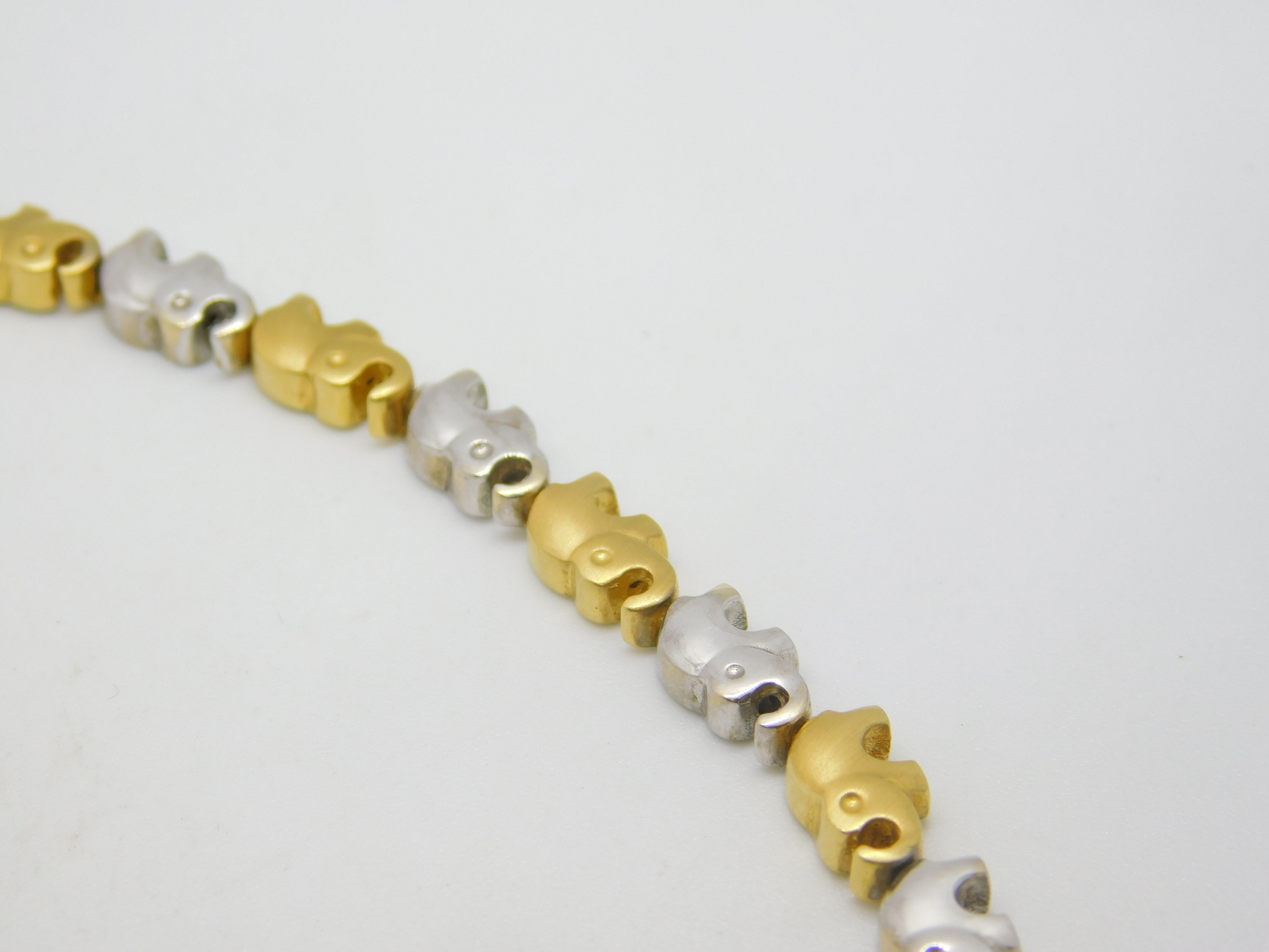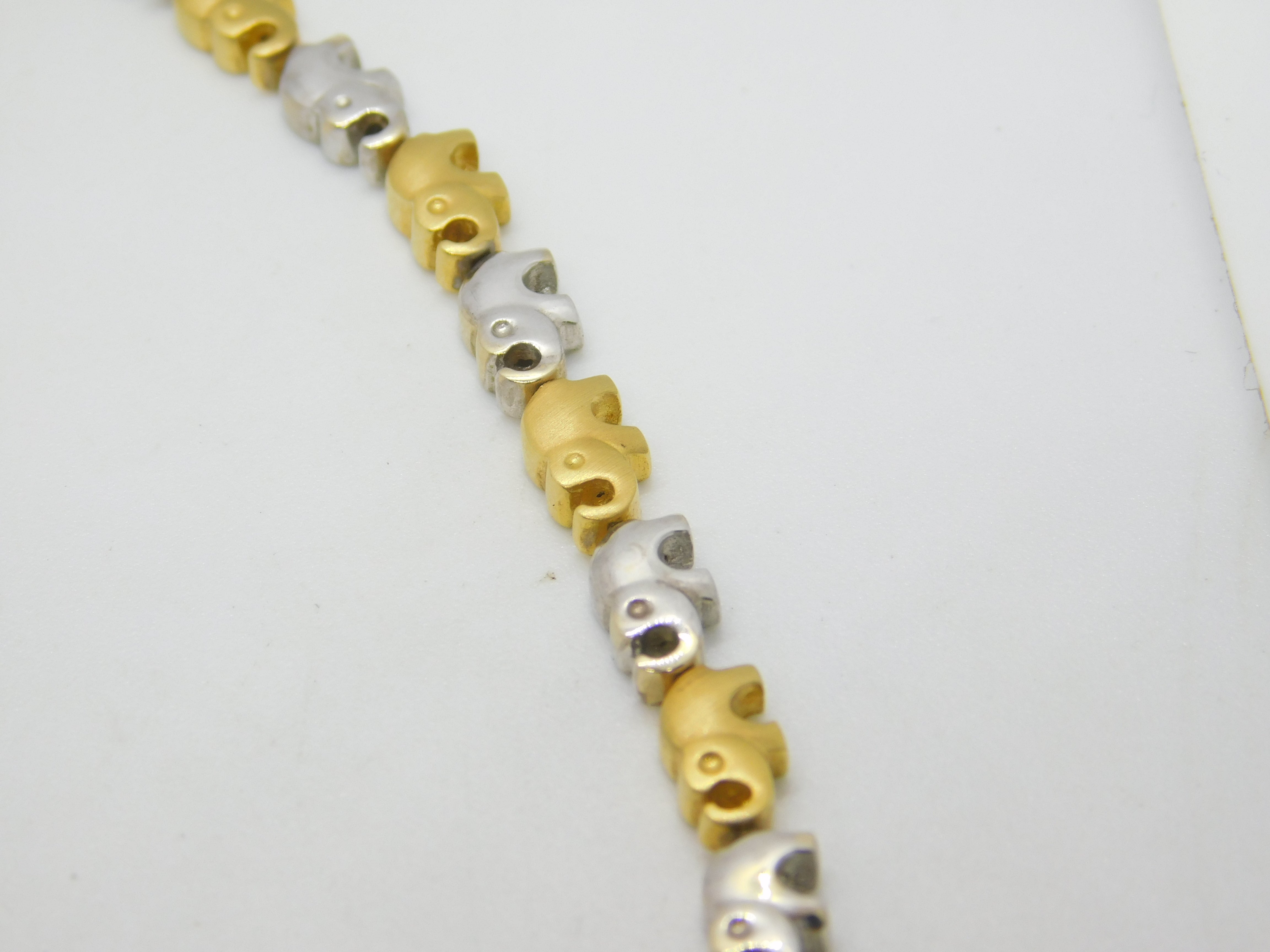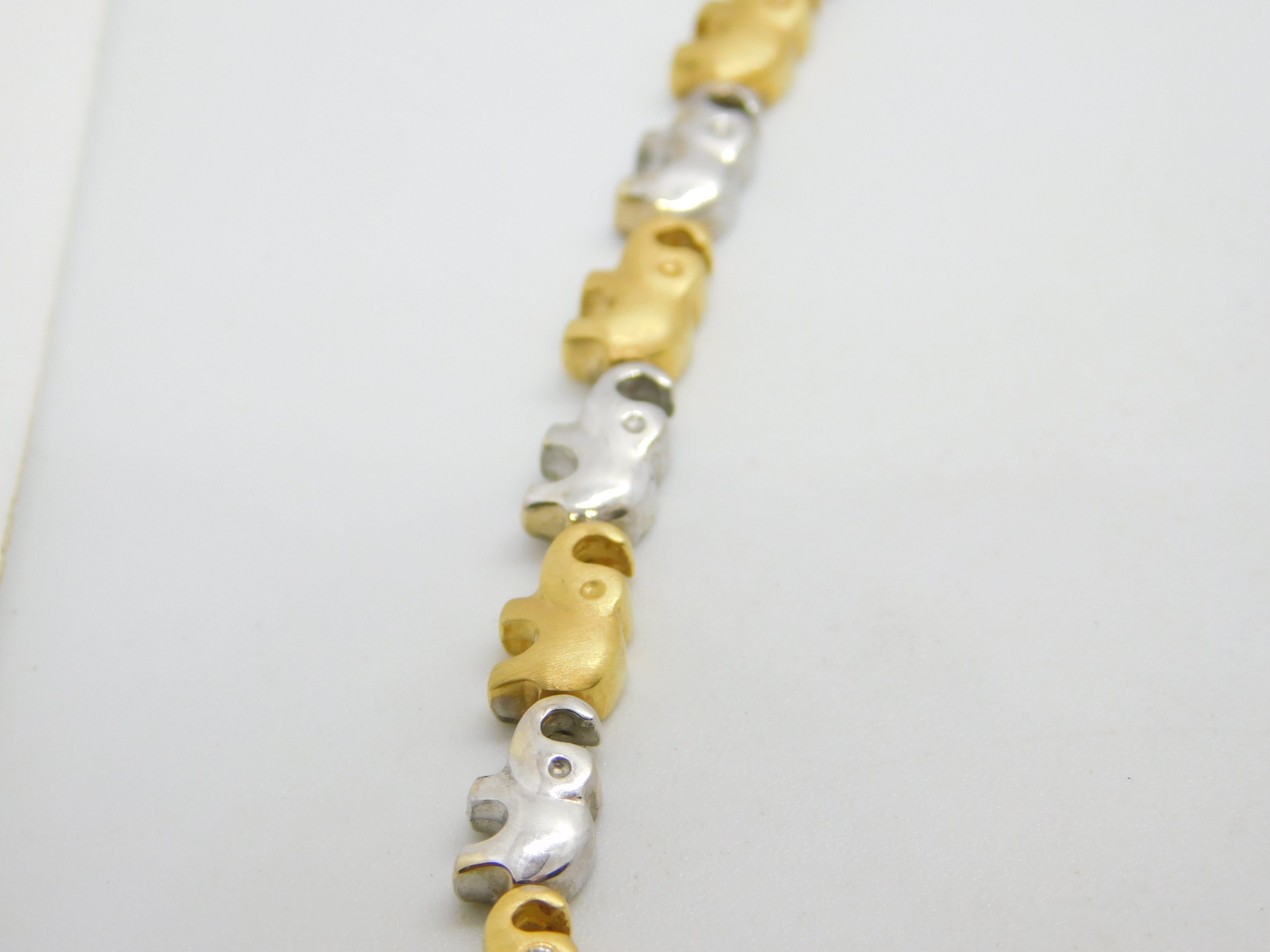 Simply stunning quality to this vintage 2 colour, yellow and white 18ct gold necklace dating from the 1980's. The links of the chain are made from elephants with raised trunks for luck with real diamond eyes. The gold is marked to the rear of the clasp, good secure clasp with safety clips top and bottom for added peace of mind. The diamonds have been tested, there are 19 central front elephants that have the diamond eyes, all are present and in good order. A simply wonderful and charming vintage gold necklace.