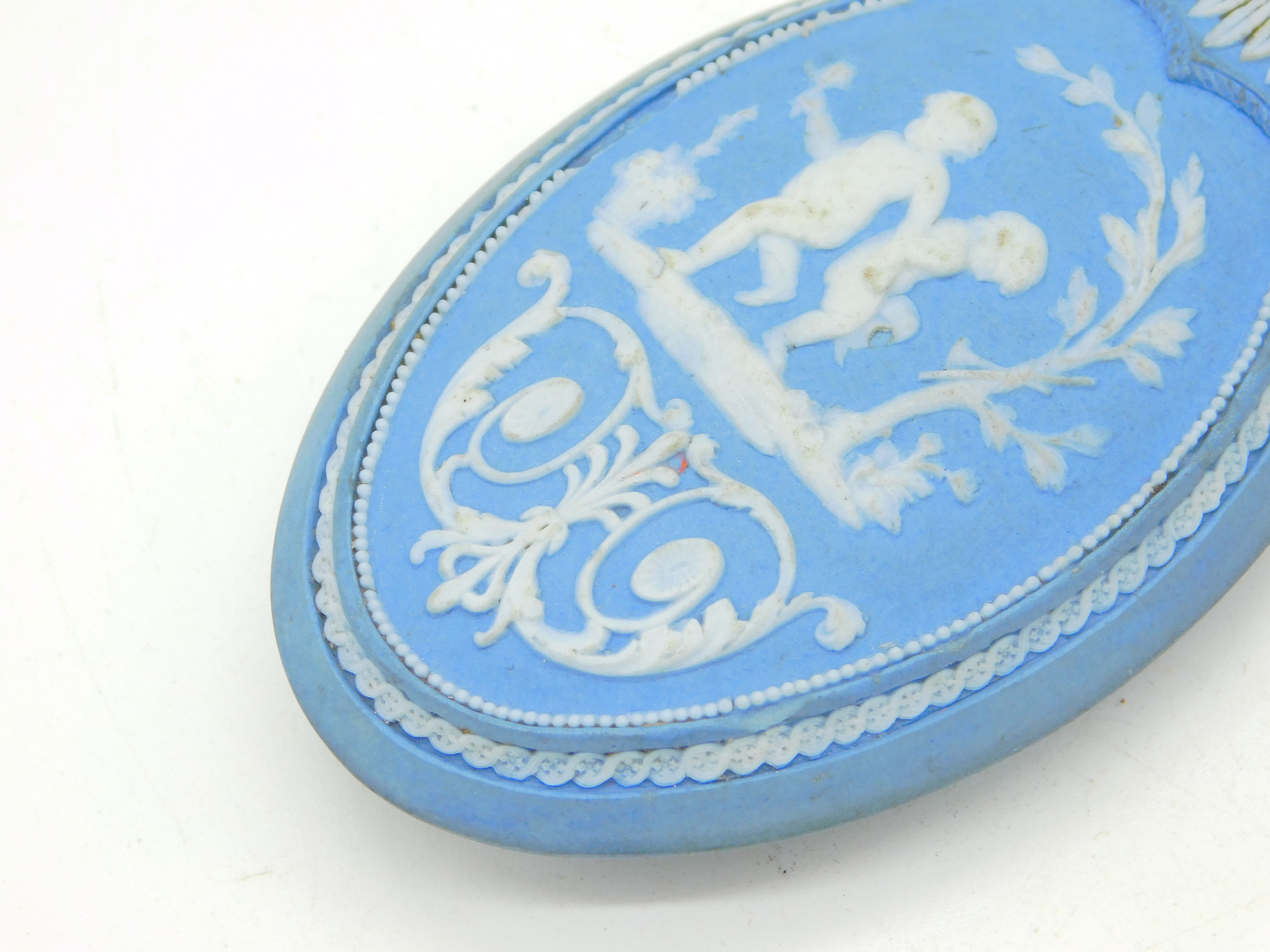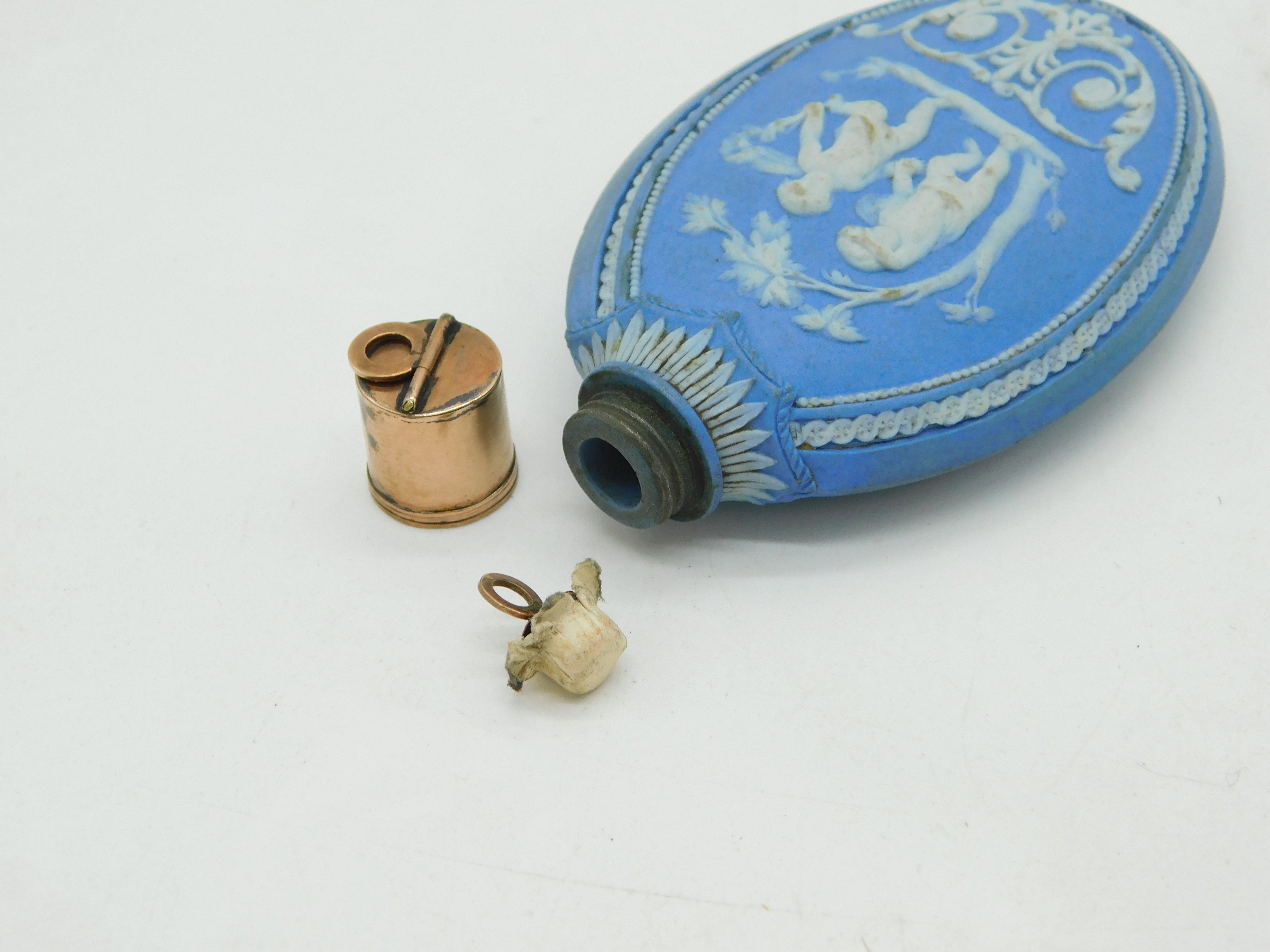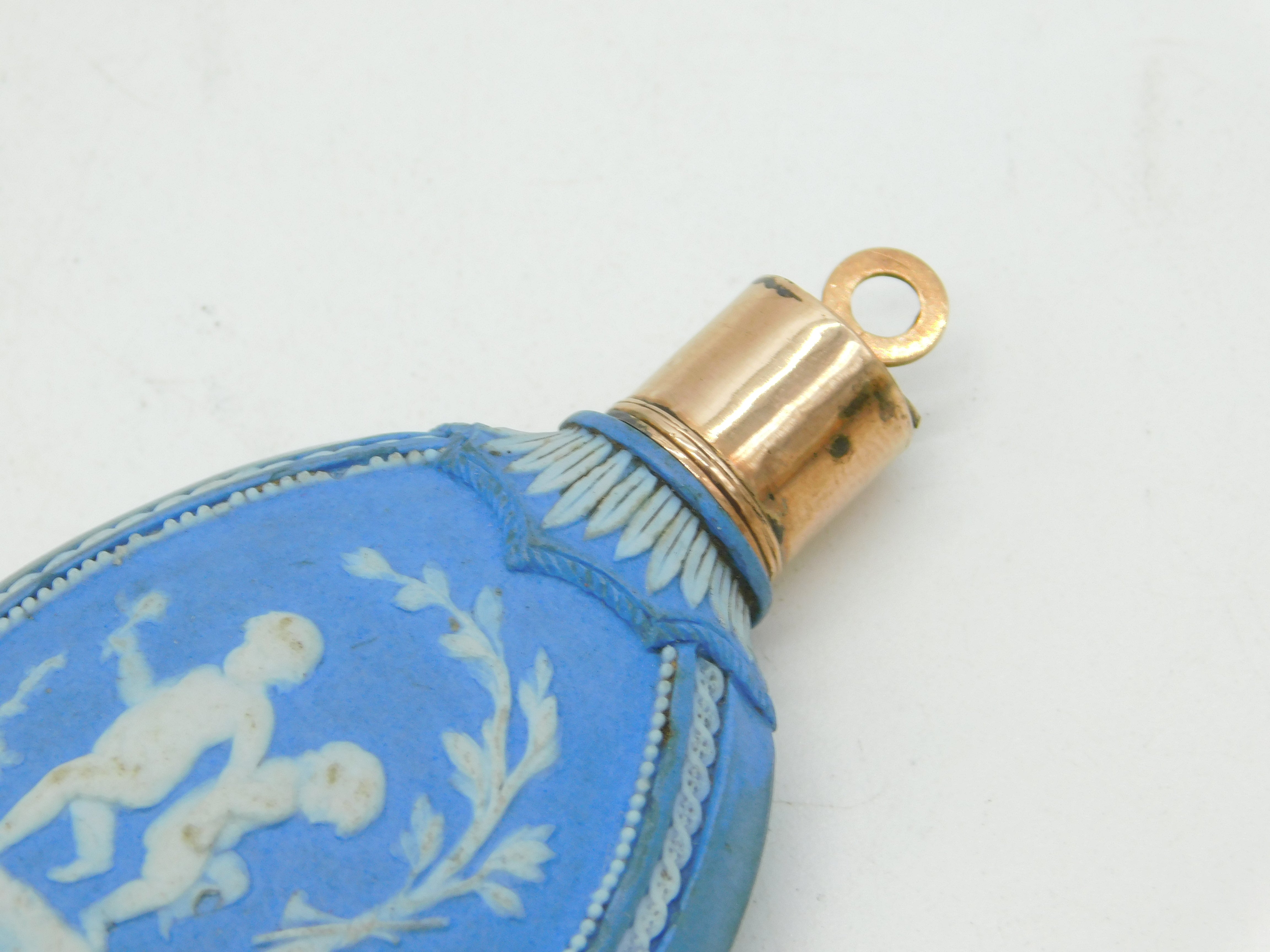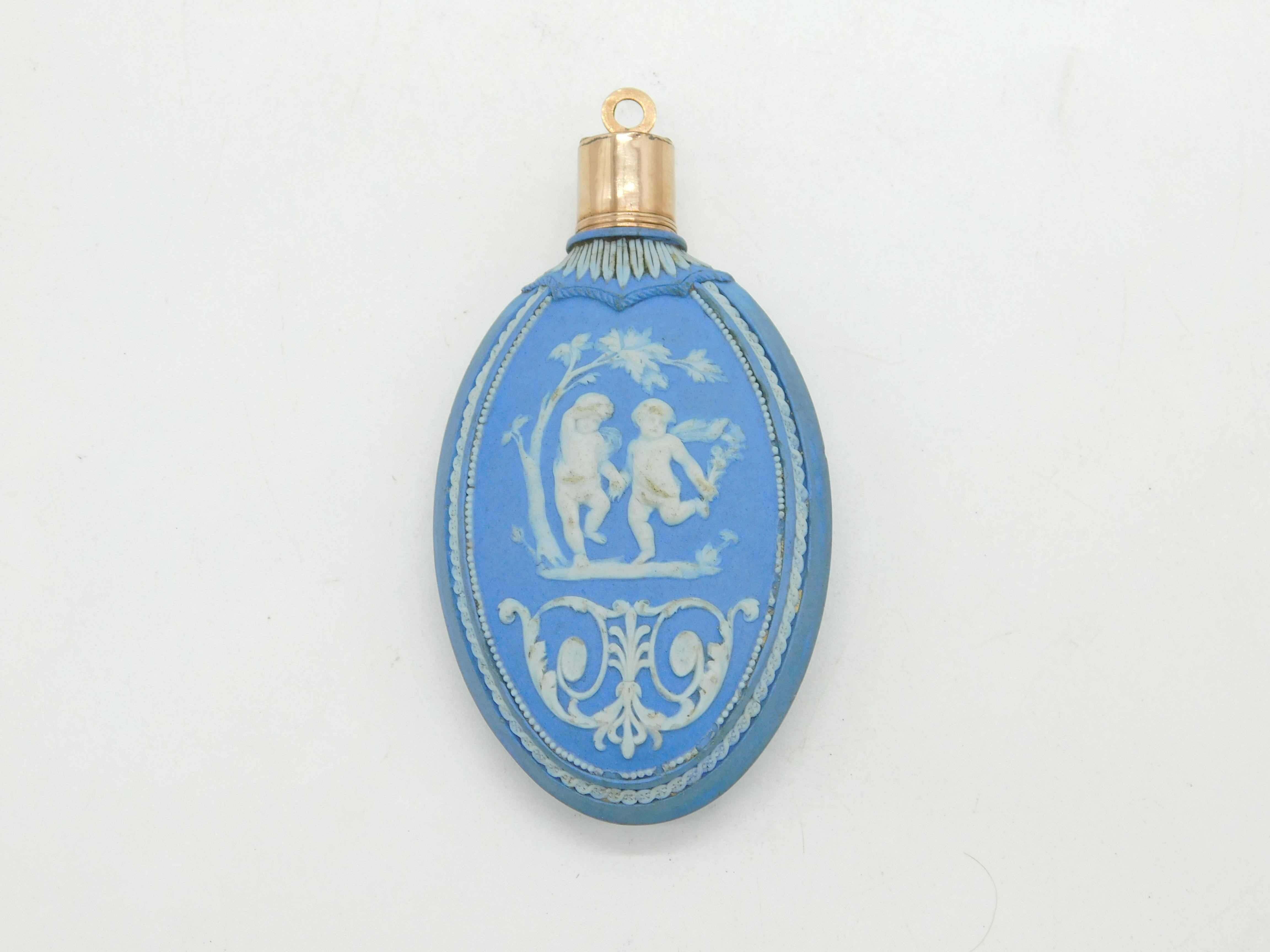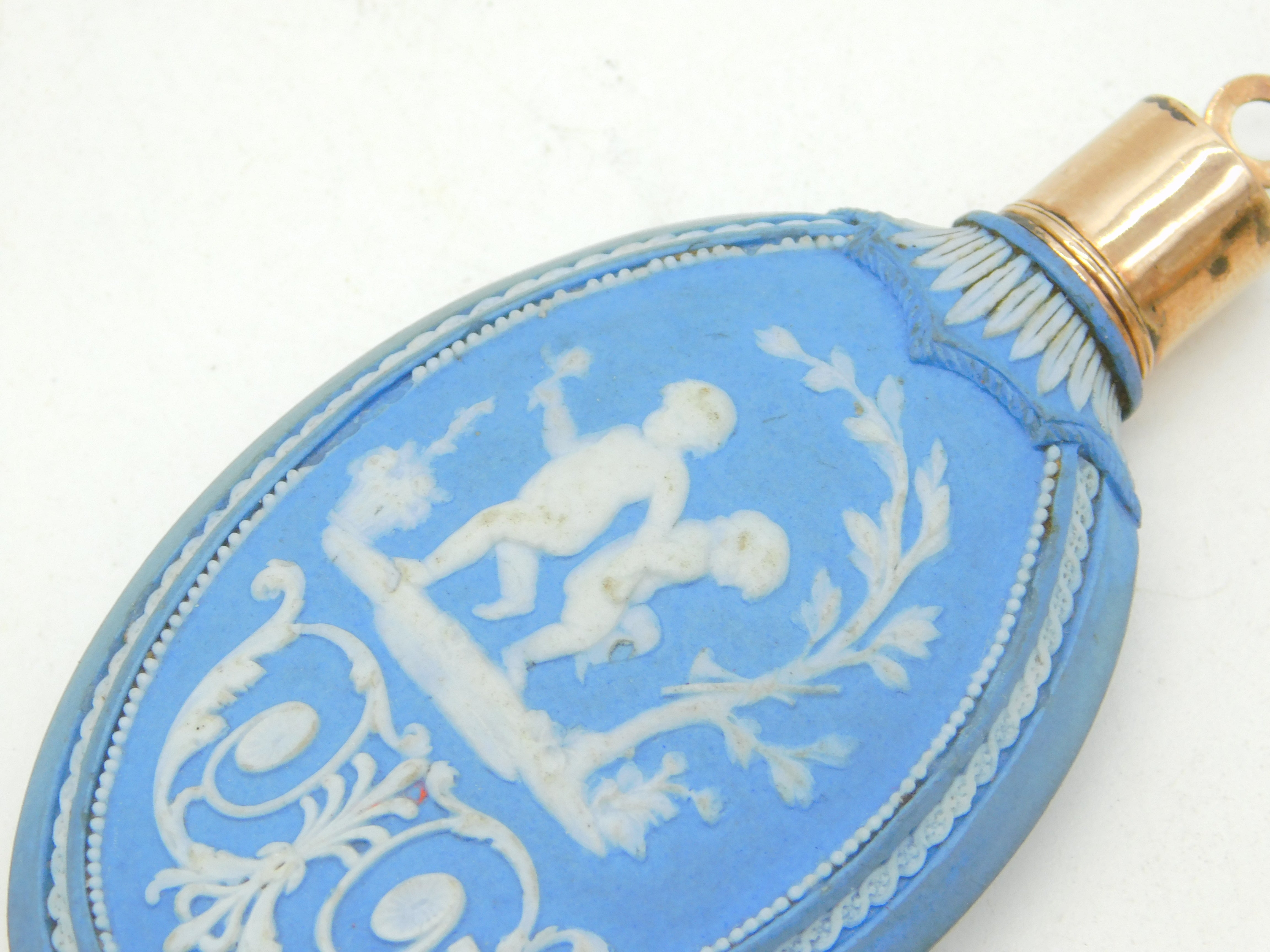 Details: A fantastic and wonderfully designed antique 18th century Wedgwood pale jasperware oval form scent bottle with silver gilt top and original stopper, decorated with vignettes depicting cherubs with flowers throughout c1790s, the silver has been XRF tested. Good condition to the decorations. This is a wonderful item that would make a perfect gift or addition to any collection. We are more than happy to provide XRF reports for items upon request.