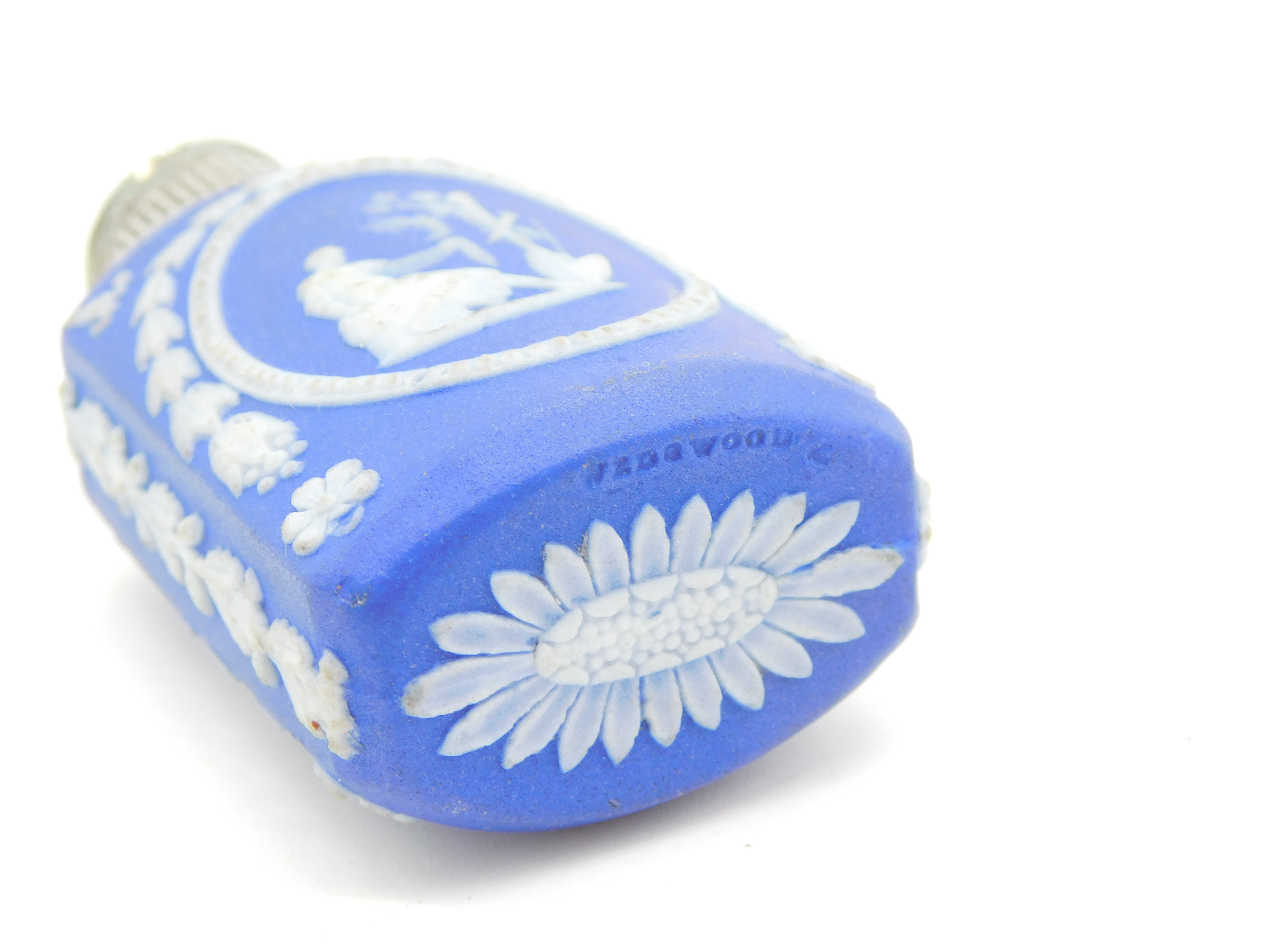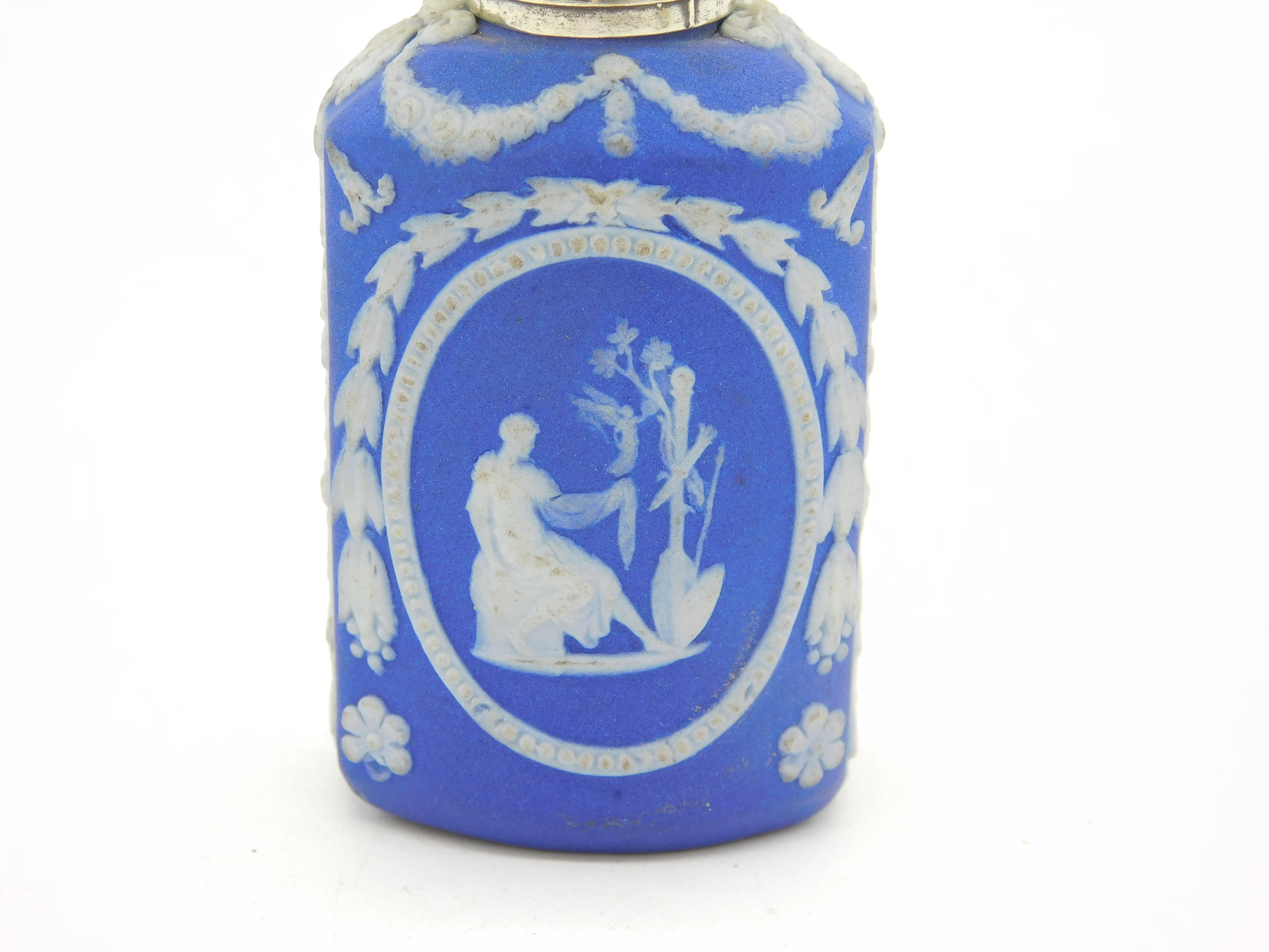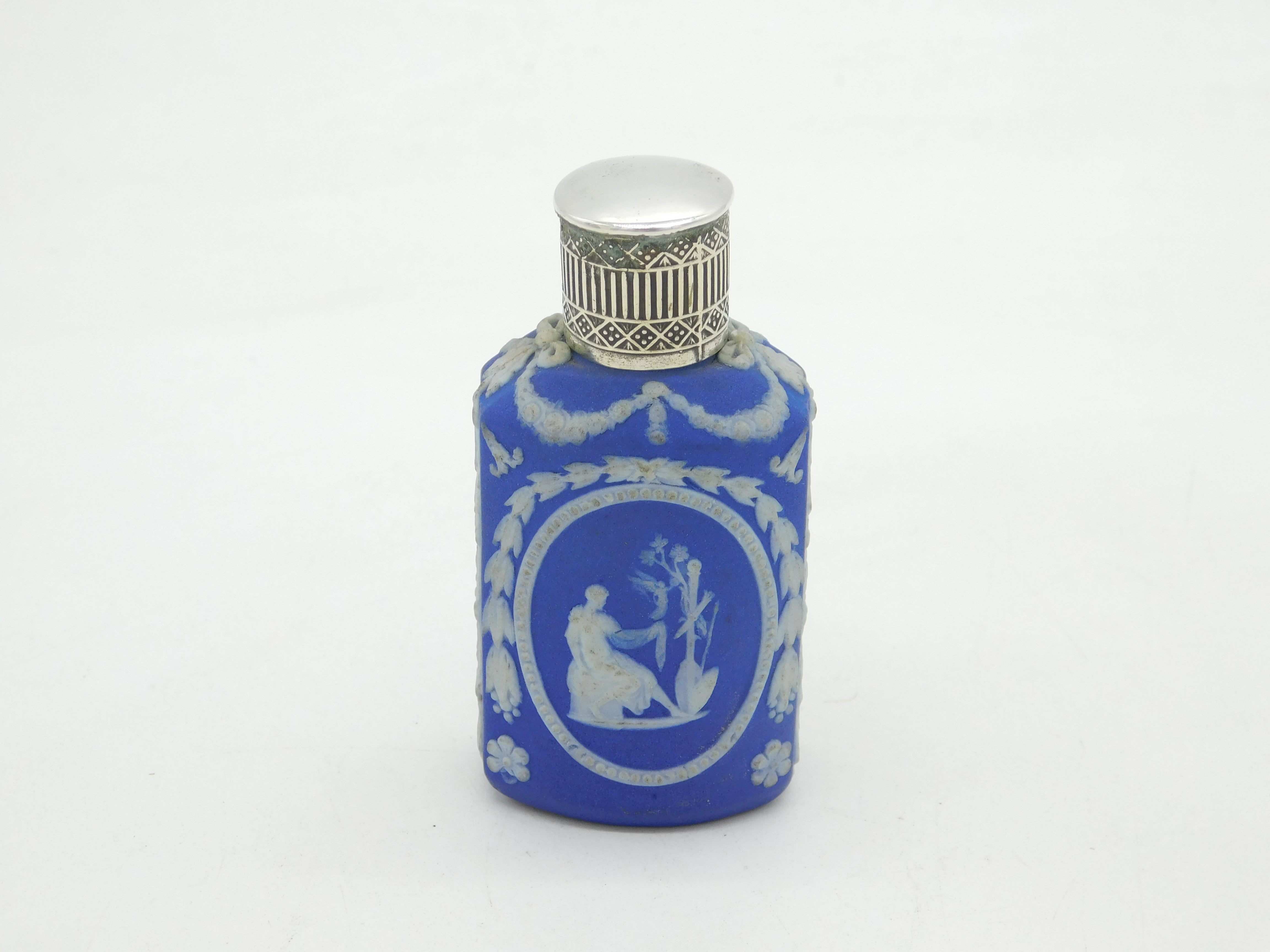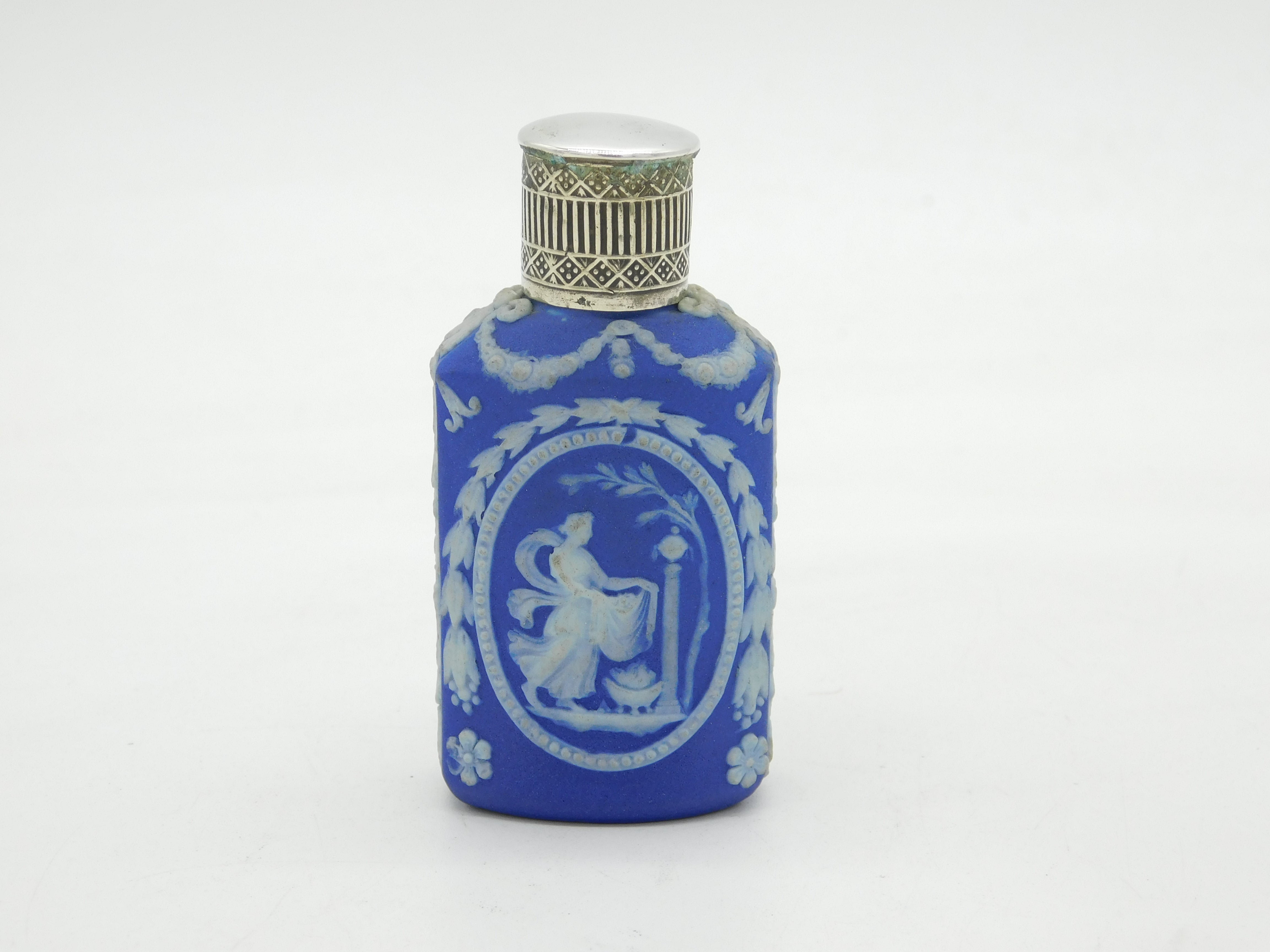 Details: A fantastic and wonderfully designed antique 18th century sterling silver topped wedgwood jasperware scent bottle with charming classical goddess scenes alongside swags & bows, marked 'Wedgwood' to the base and marked with flowers c1790s, the silver top has been XRF tested. This is a wonderful item that would make a perfect gift or addition to any collection. We are more than happy to provide XRF reports for items upon request.