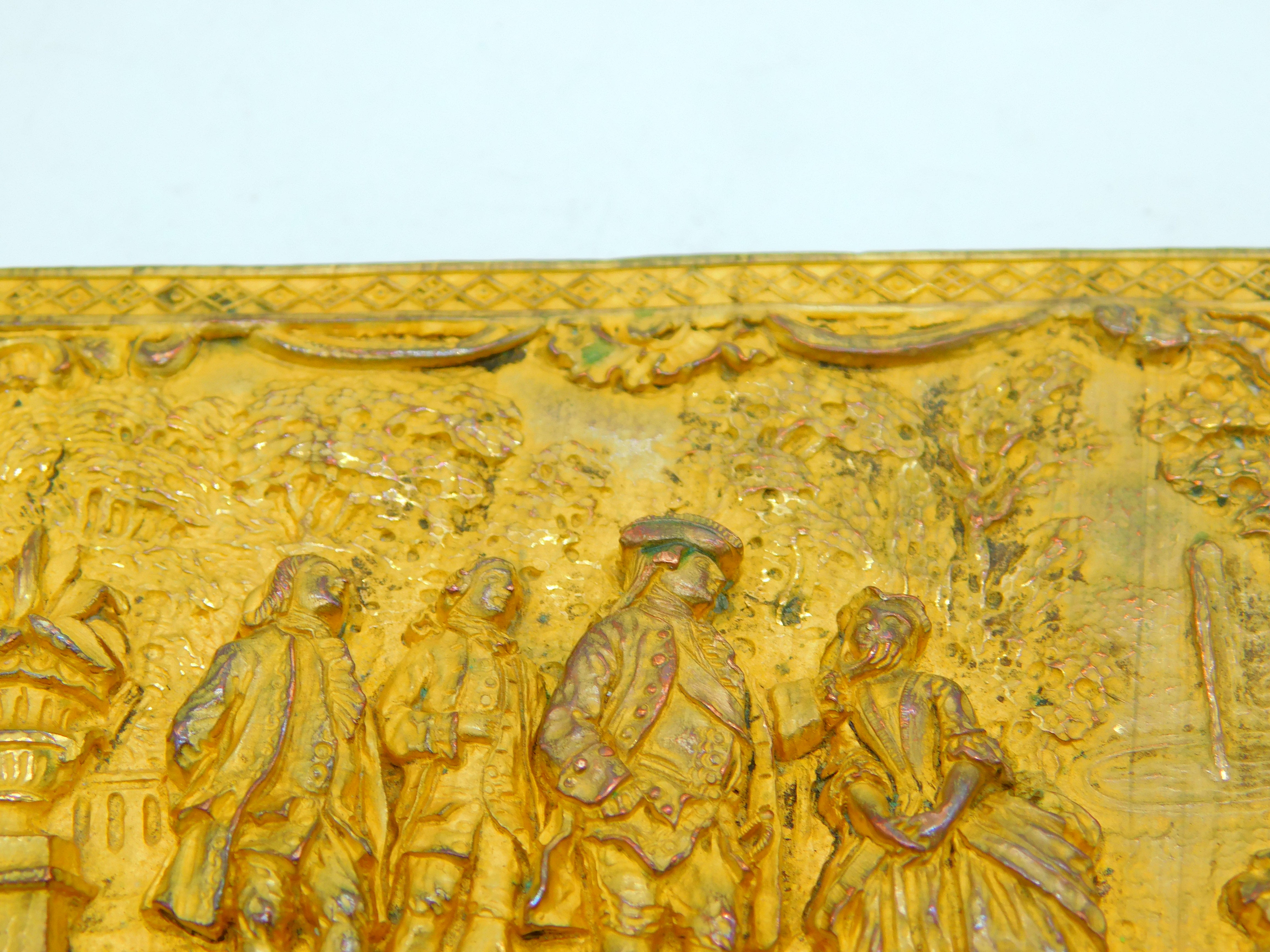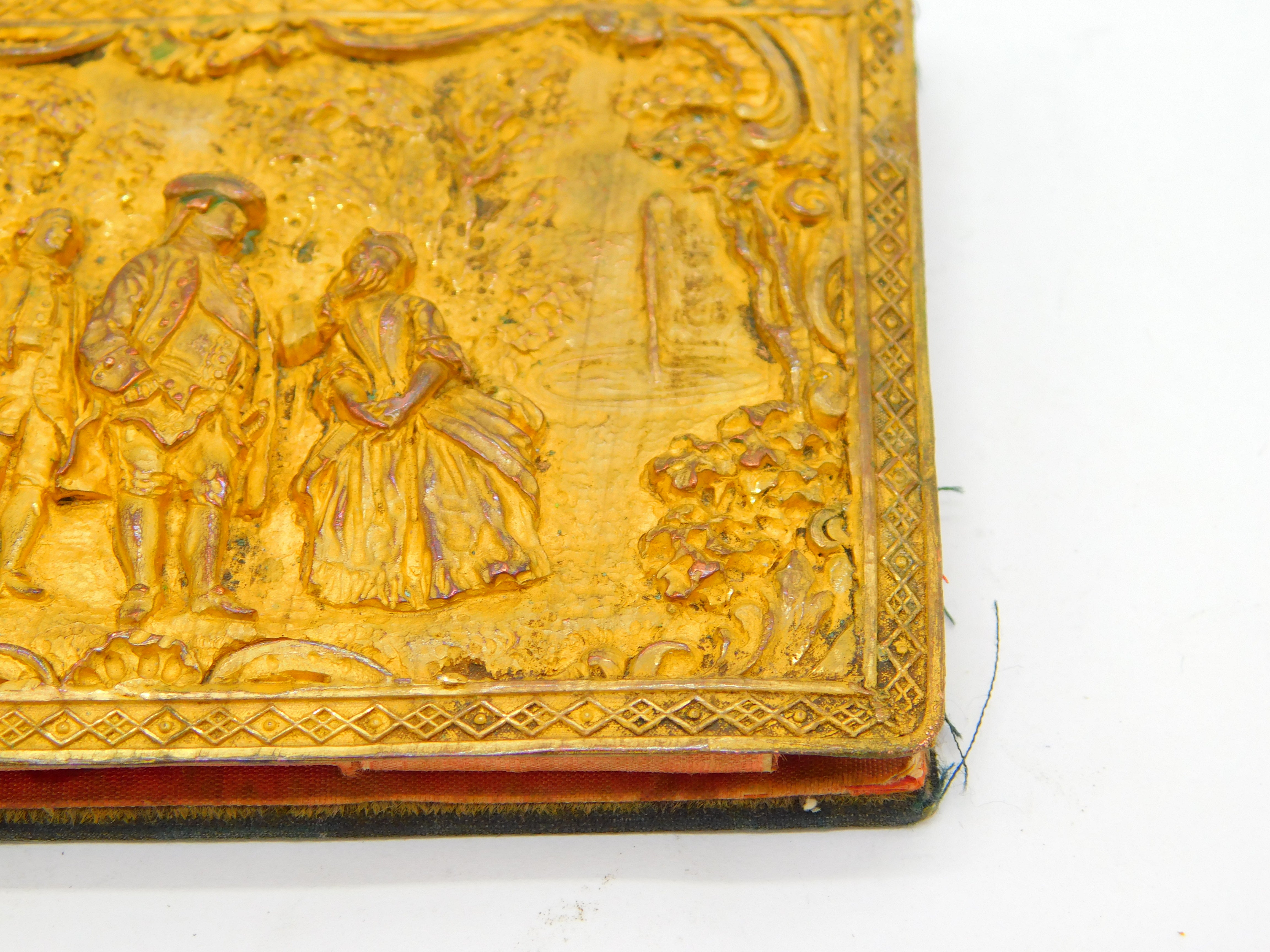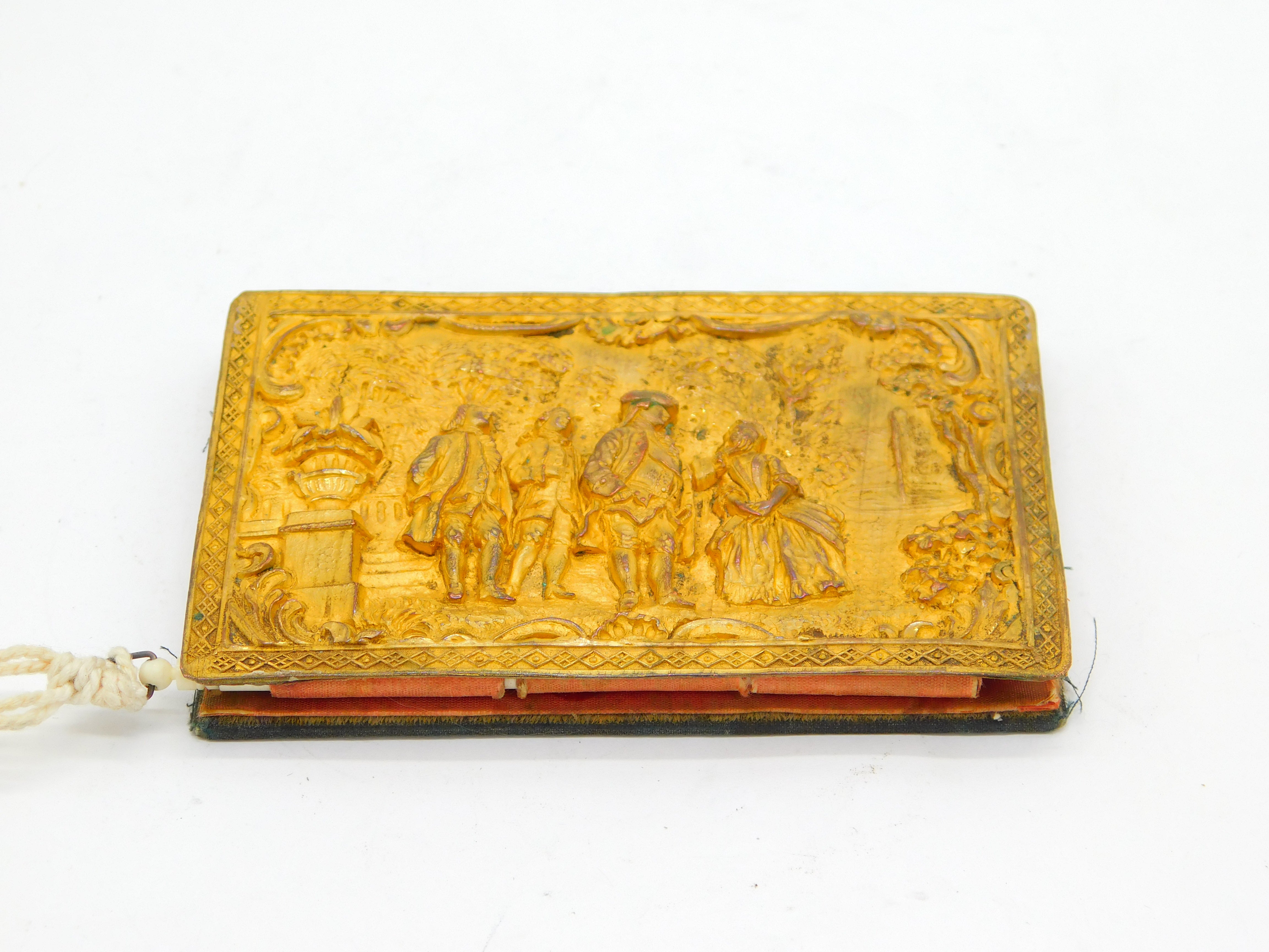 Details: A fantastic and wonderfully designed antique early 19th century French 'palais royale' gold plated aide memoire or diary depicting a charming regency scene to the front c1830, includes original newspaper clippings and un-worked pages to the interiorThis is a wonderful item that would make a perfect gift or addition to any collection. We are more than happy to provide XRF reports for items upon request.