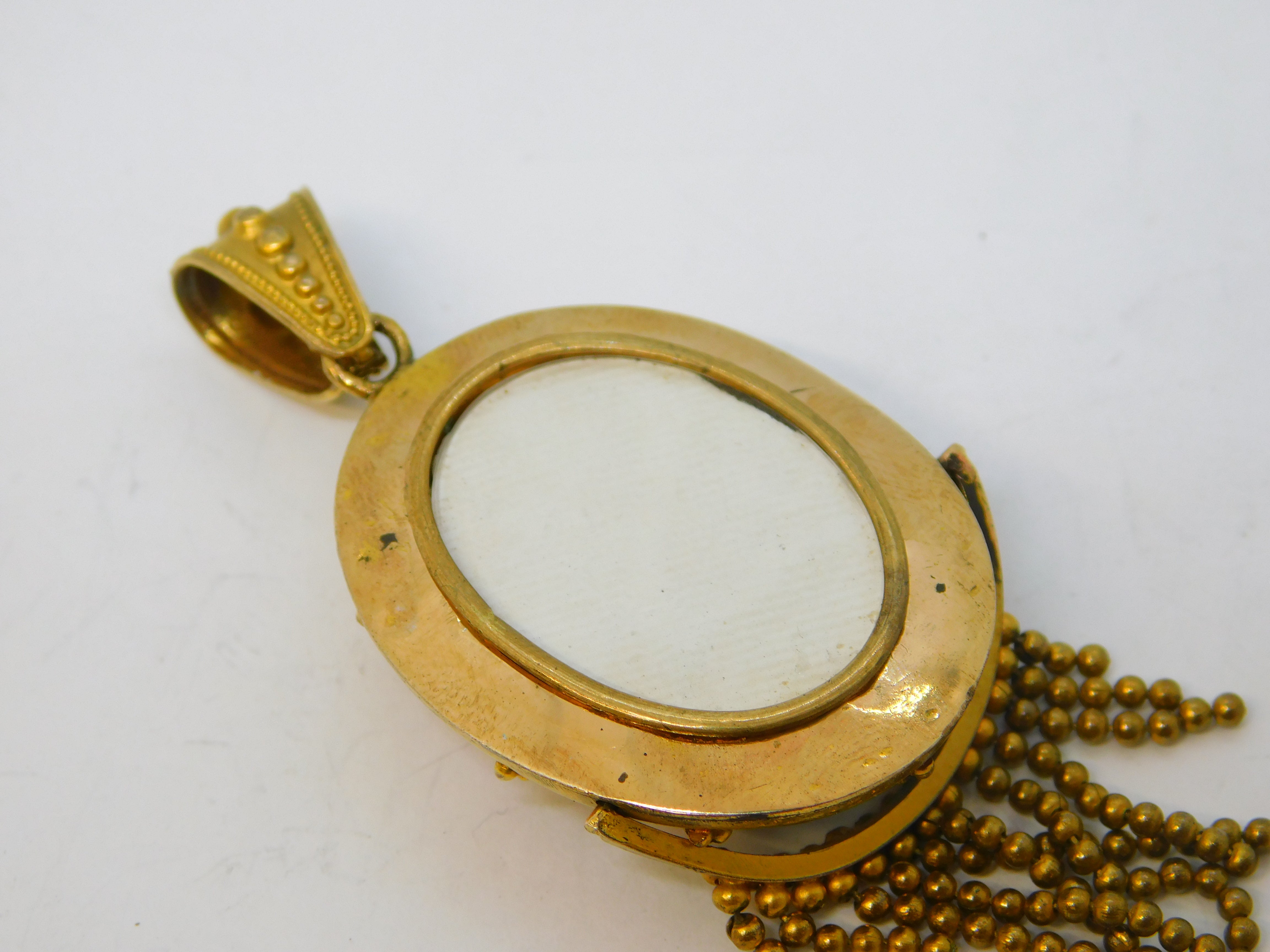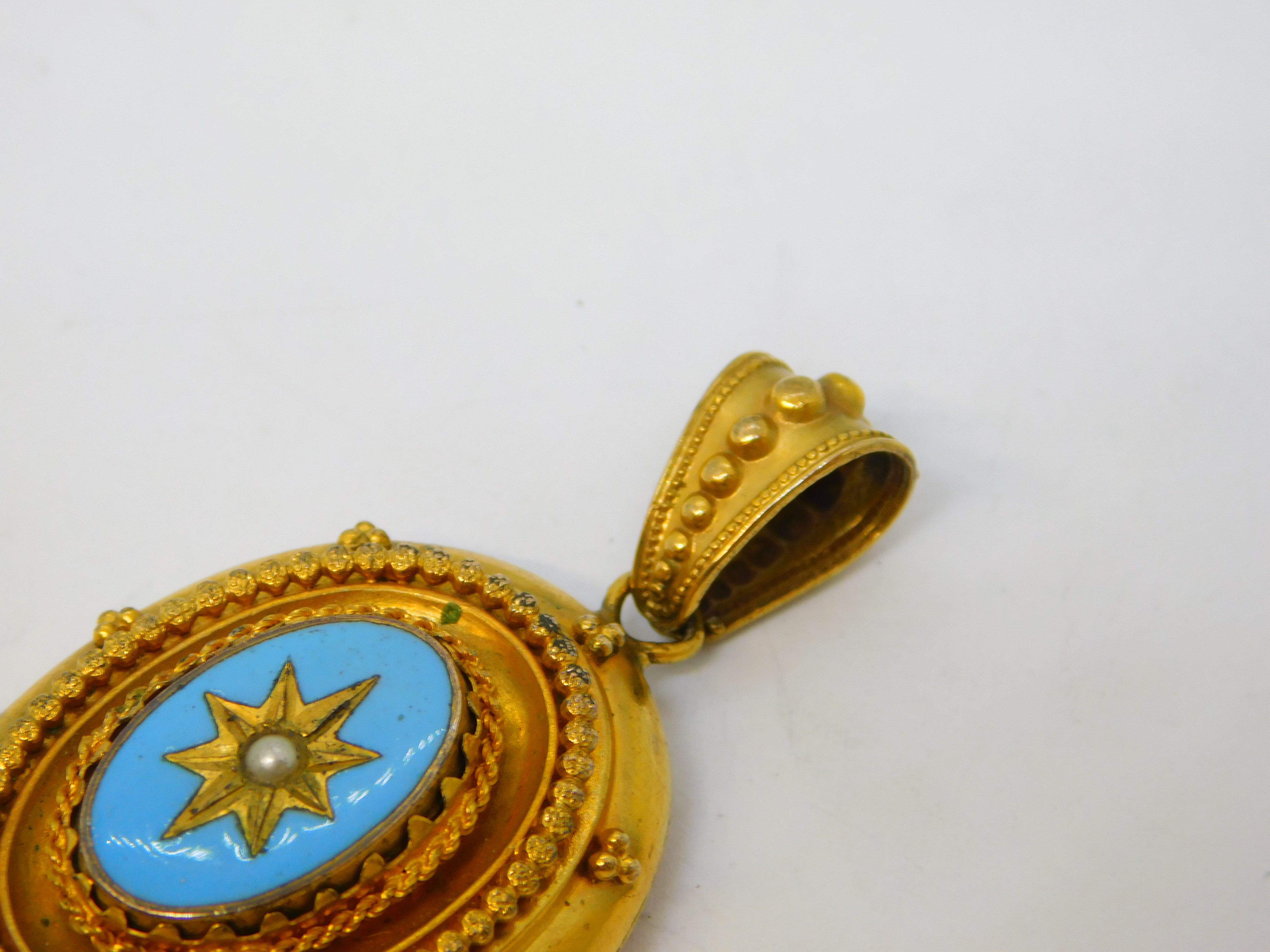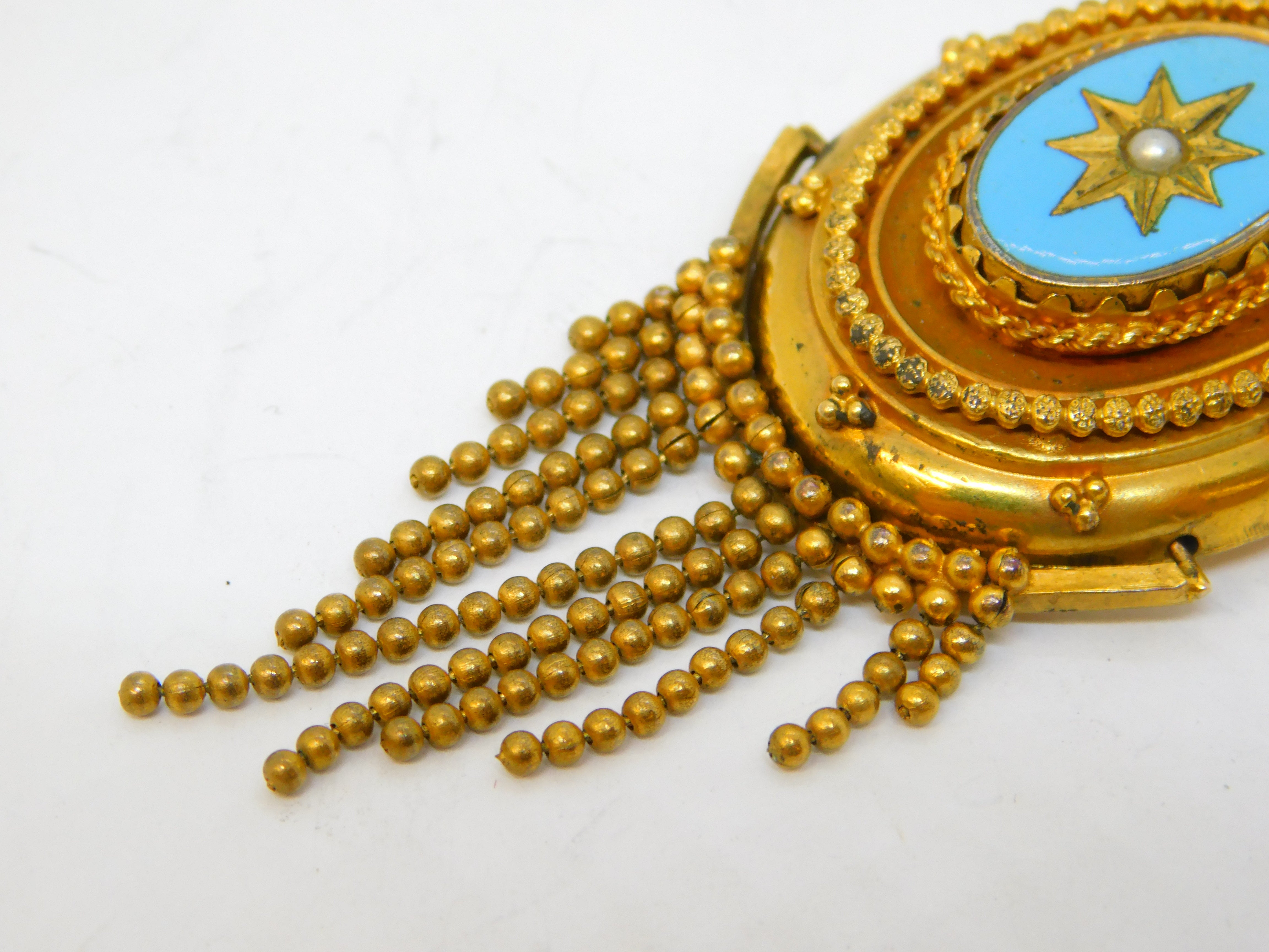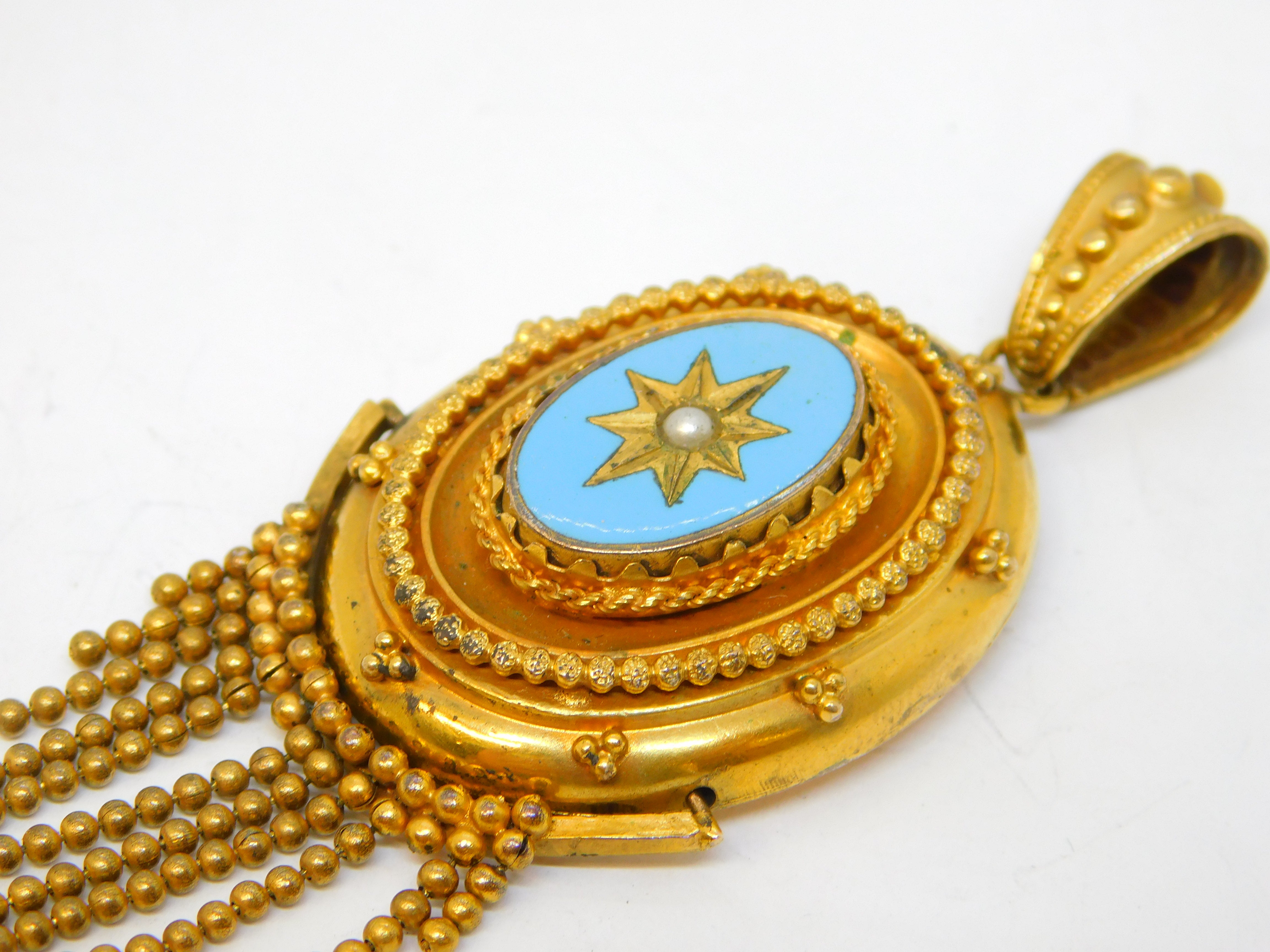 Details: A fantastic and wonderfully designed antique Victorian pinchbeck etruscan style tassel mourning pendant set with blue enamel and seed pearl c1850s. Lovely mourning locket section to the reverse. This is a wonderful item that would make a perfect gift or addition to any collection. We are more than happy to provide XRF reports for items upon request.