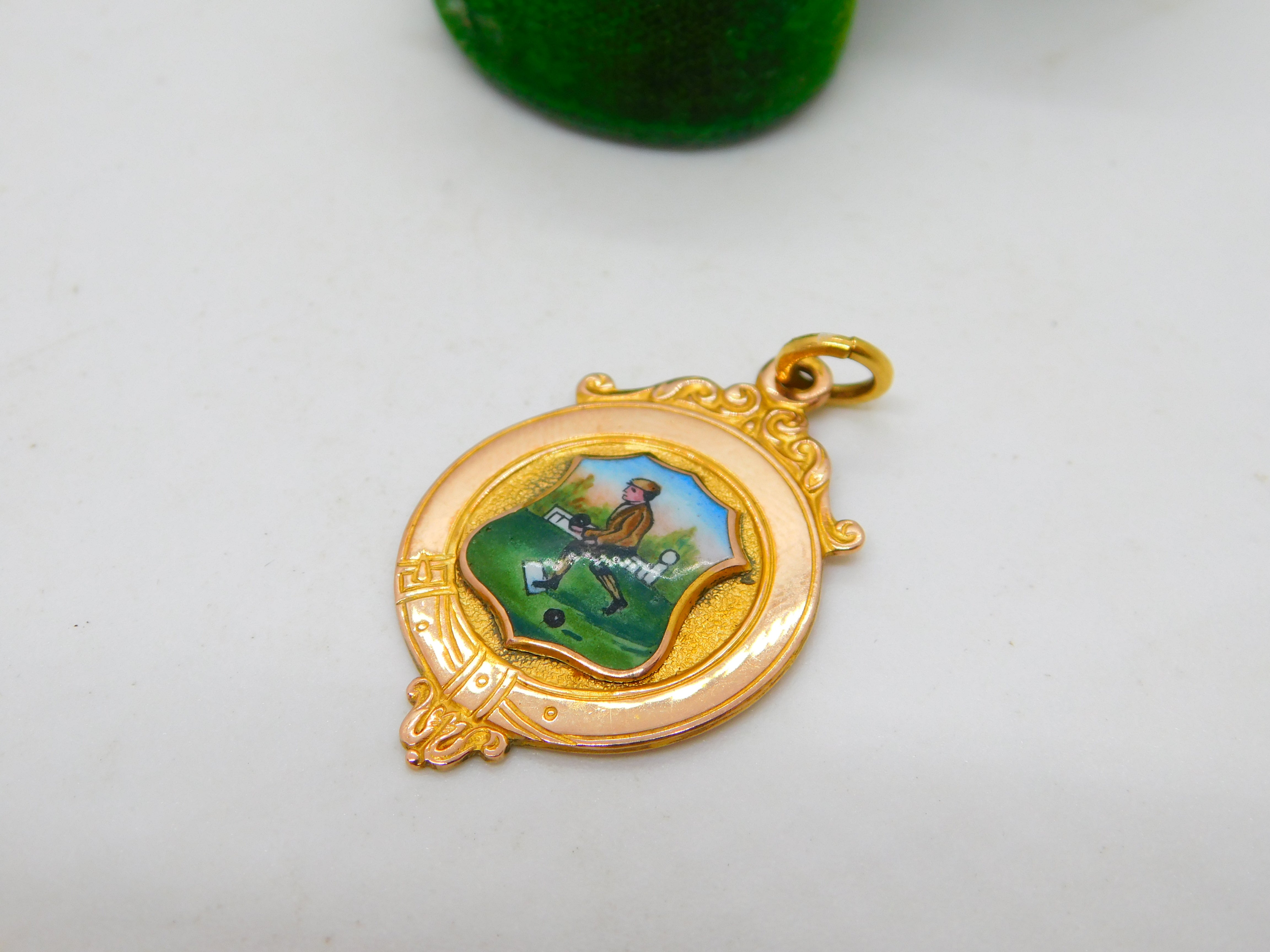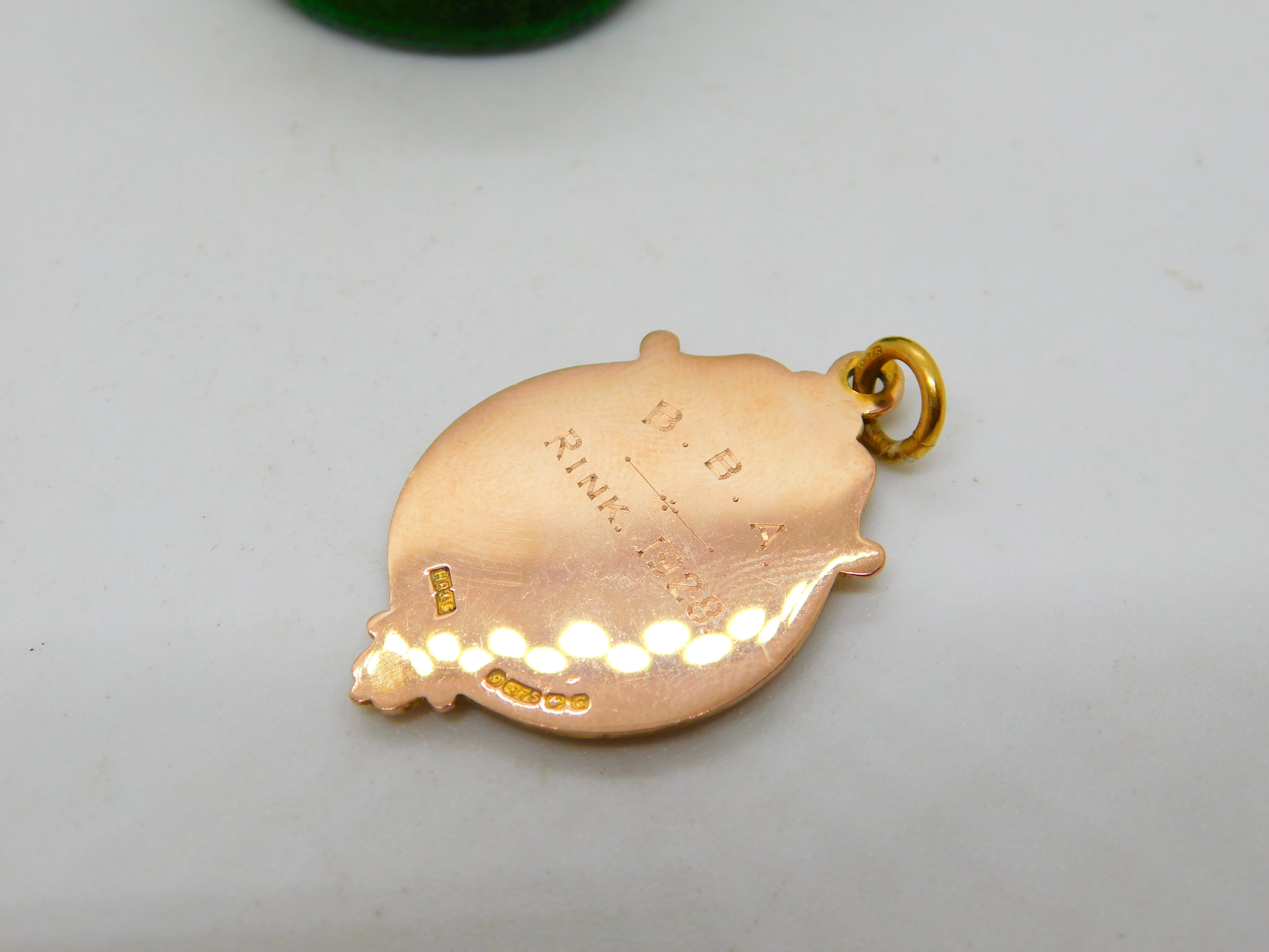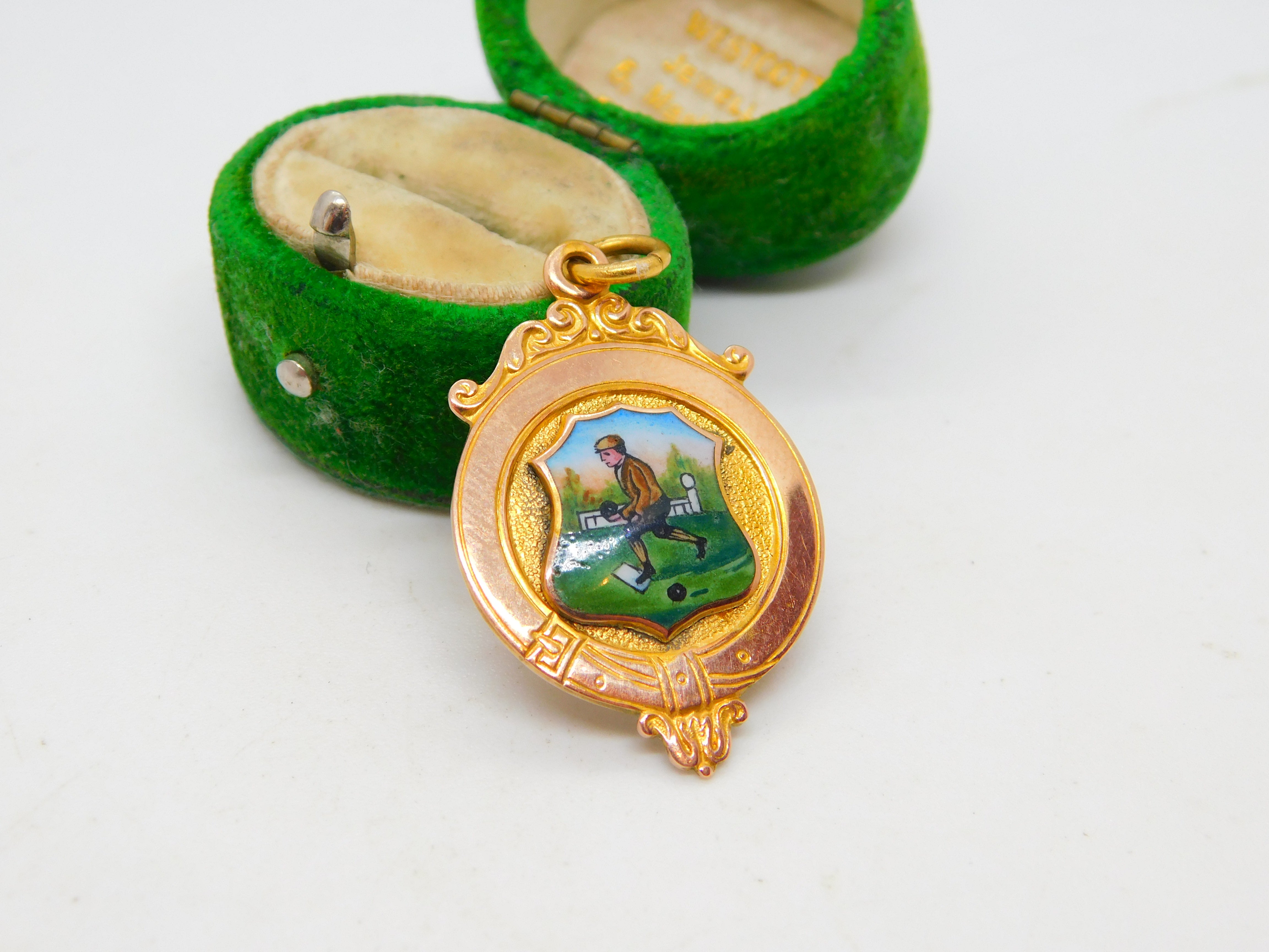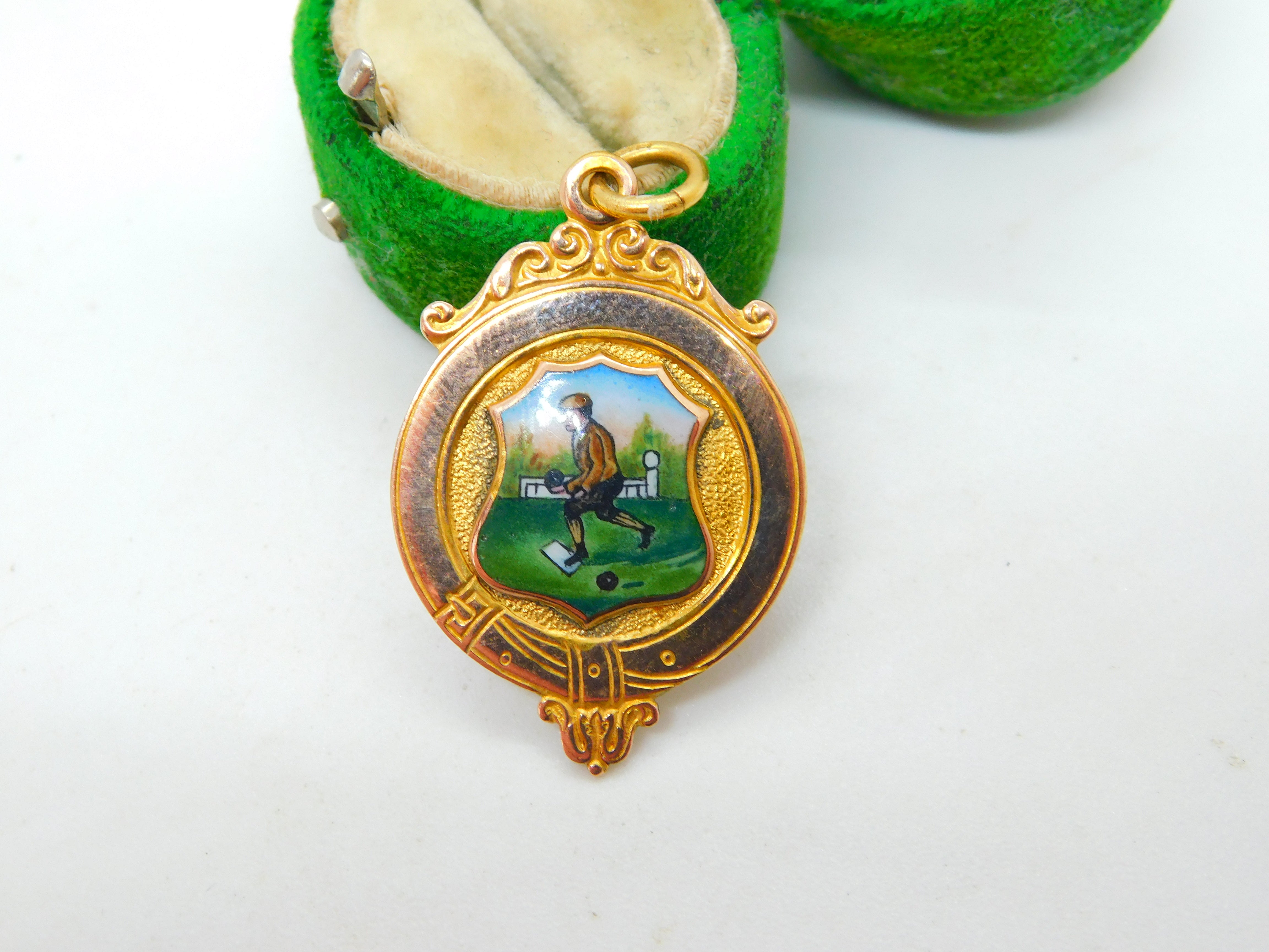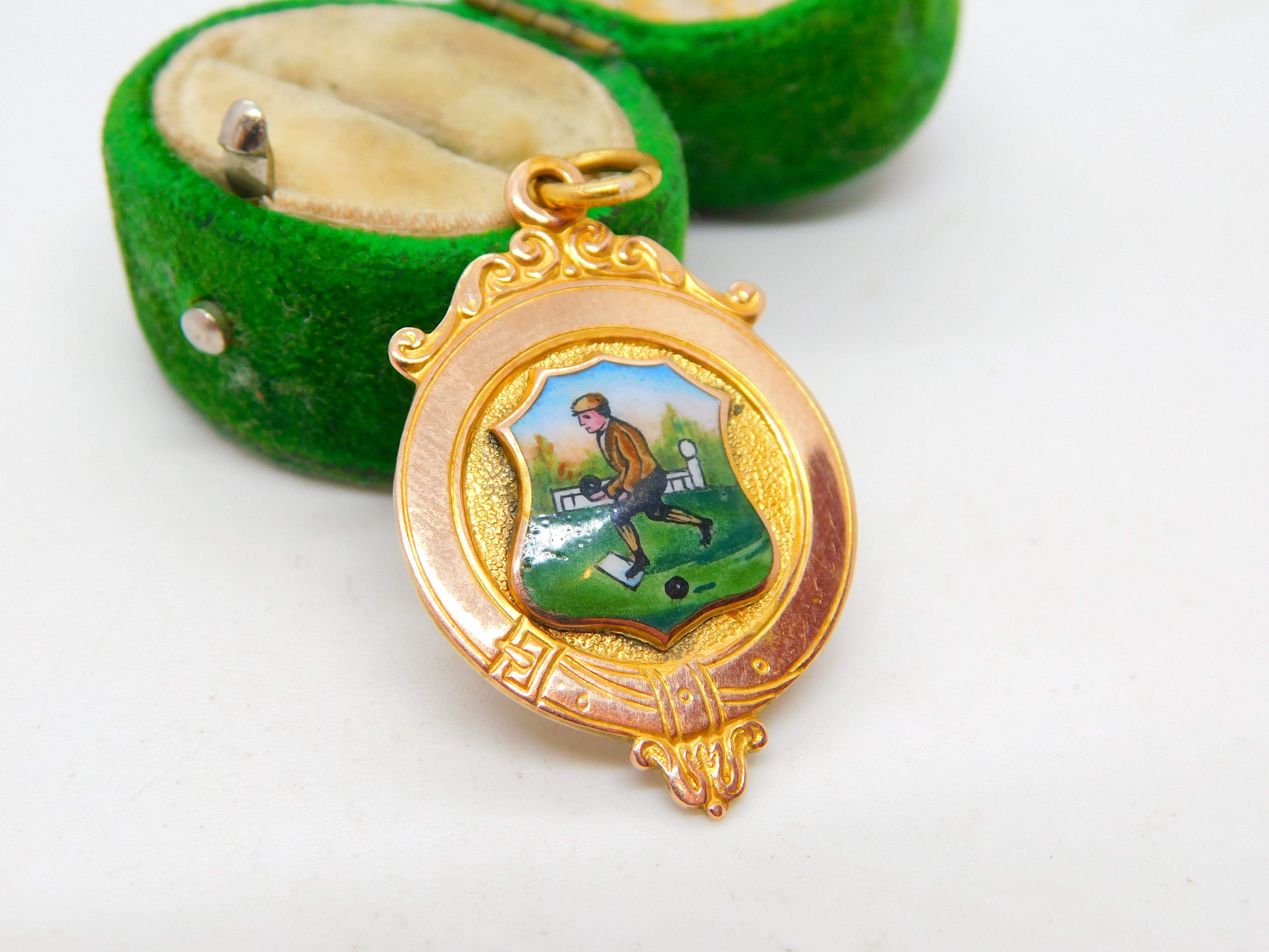 9ct Gold & Enamel Lawn Boules Sporting Fob Medal Antique 1927 Birmingham