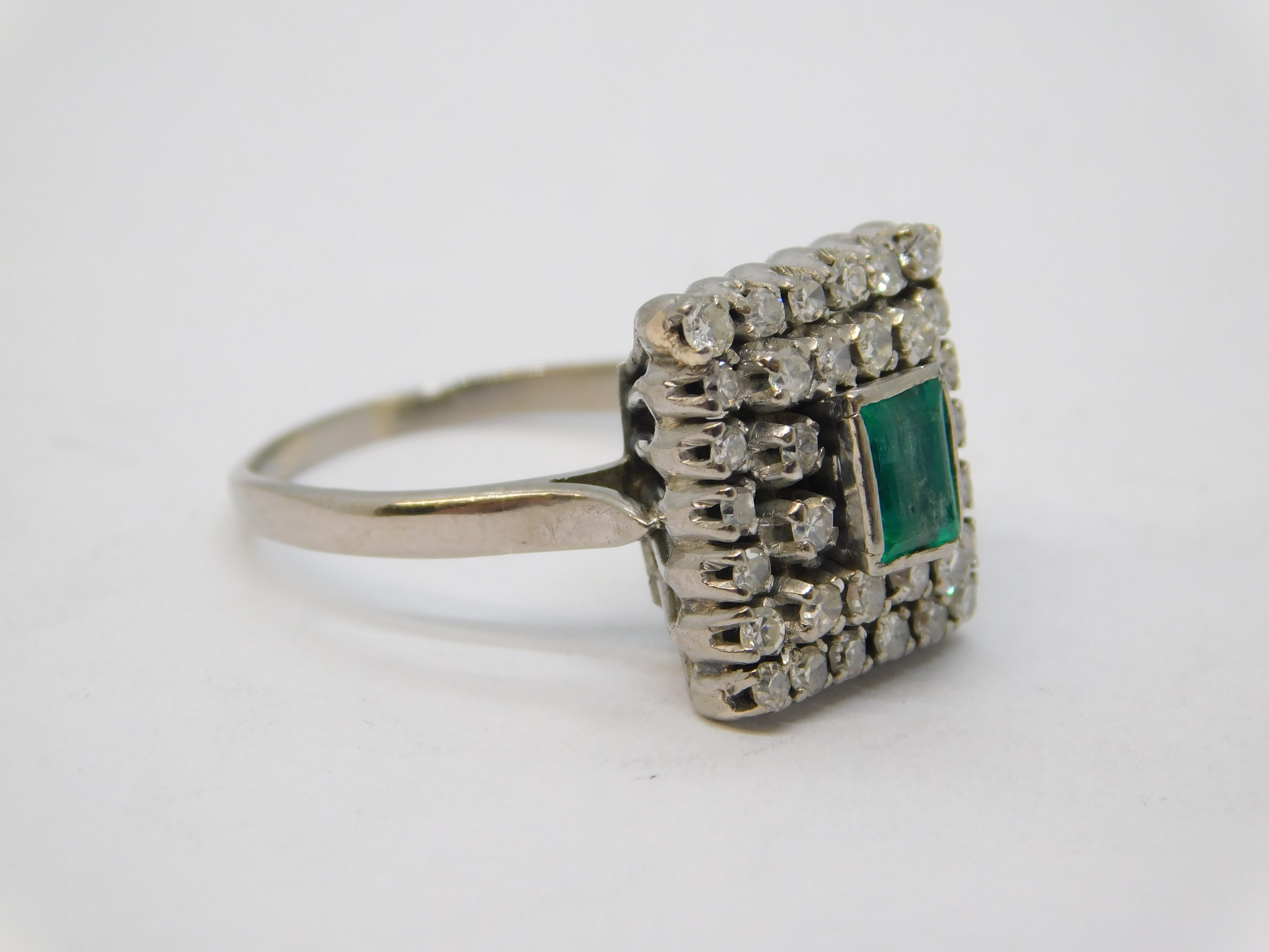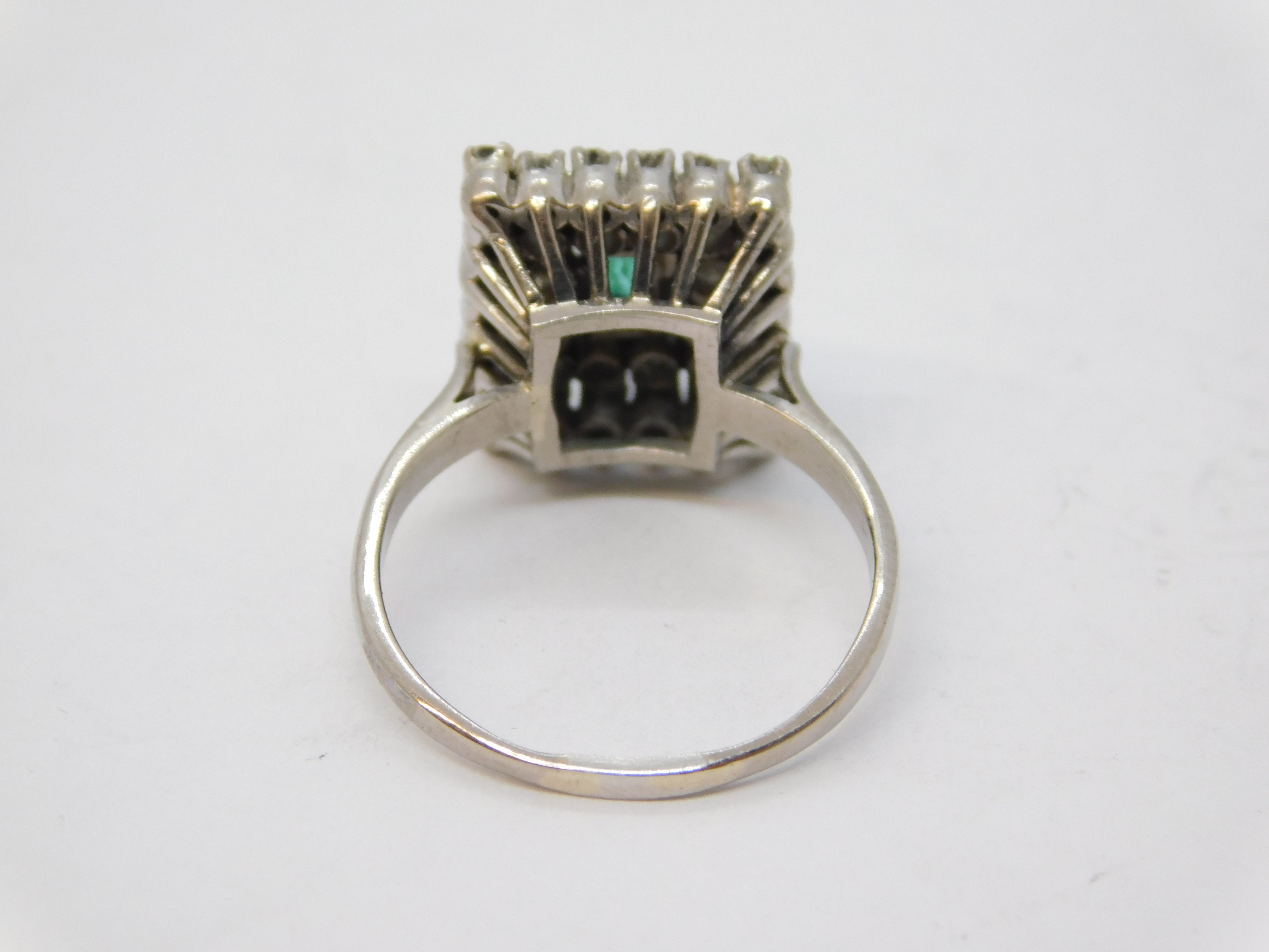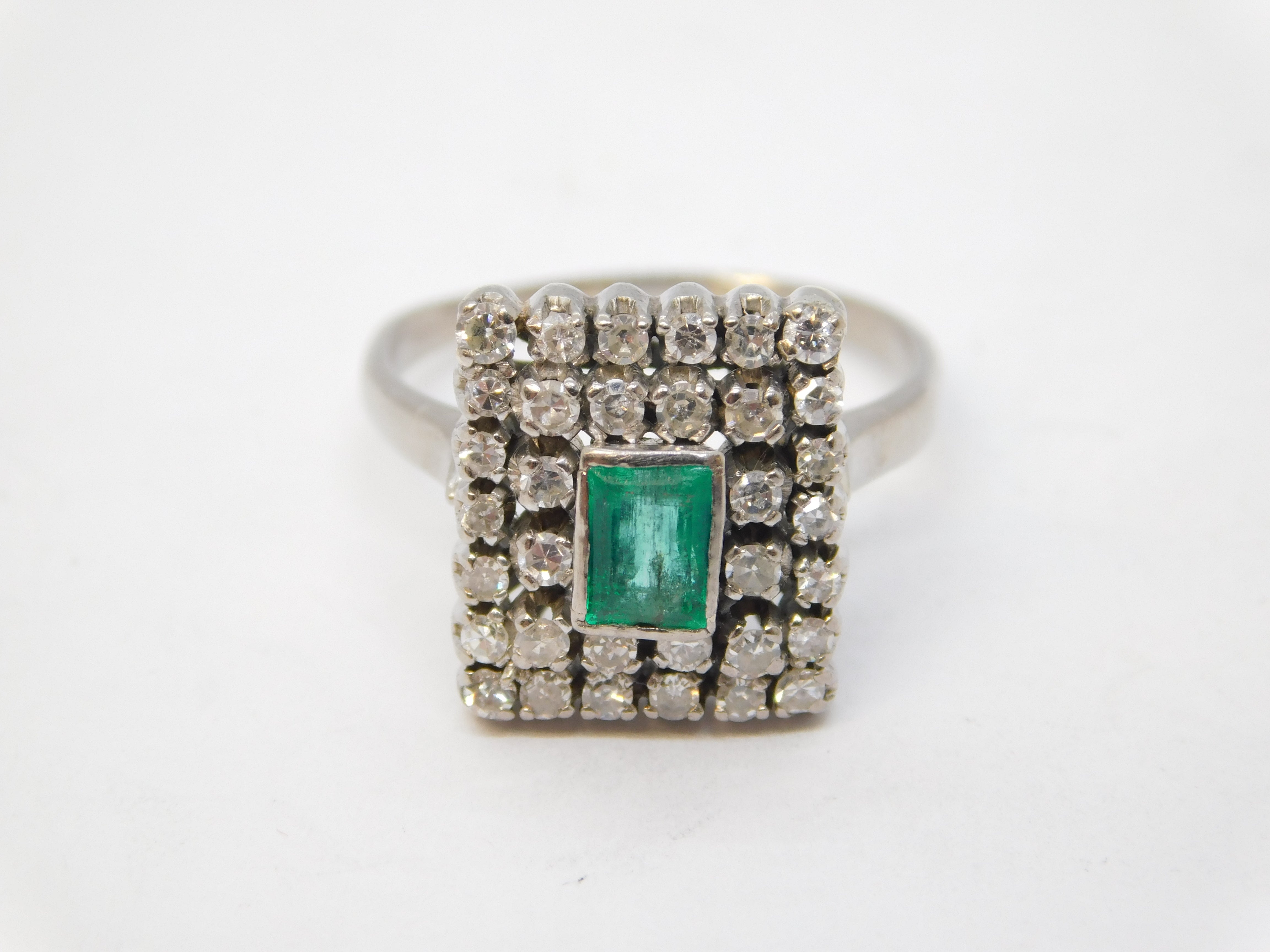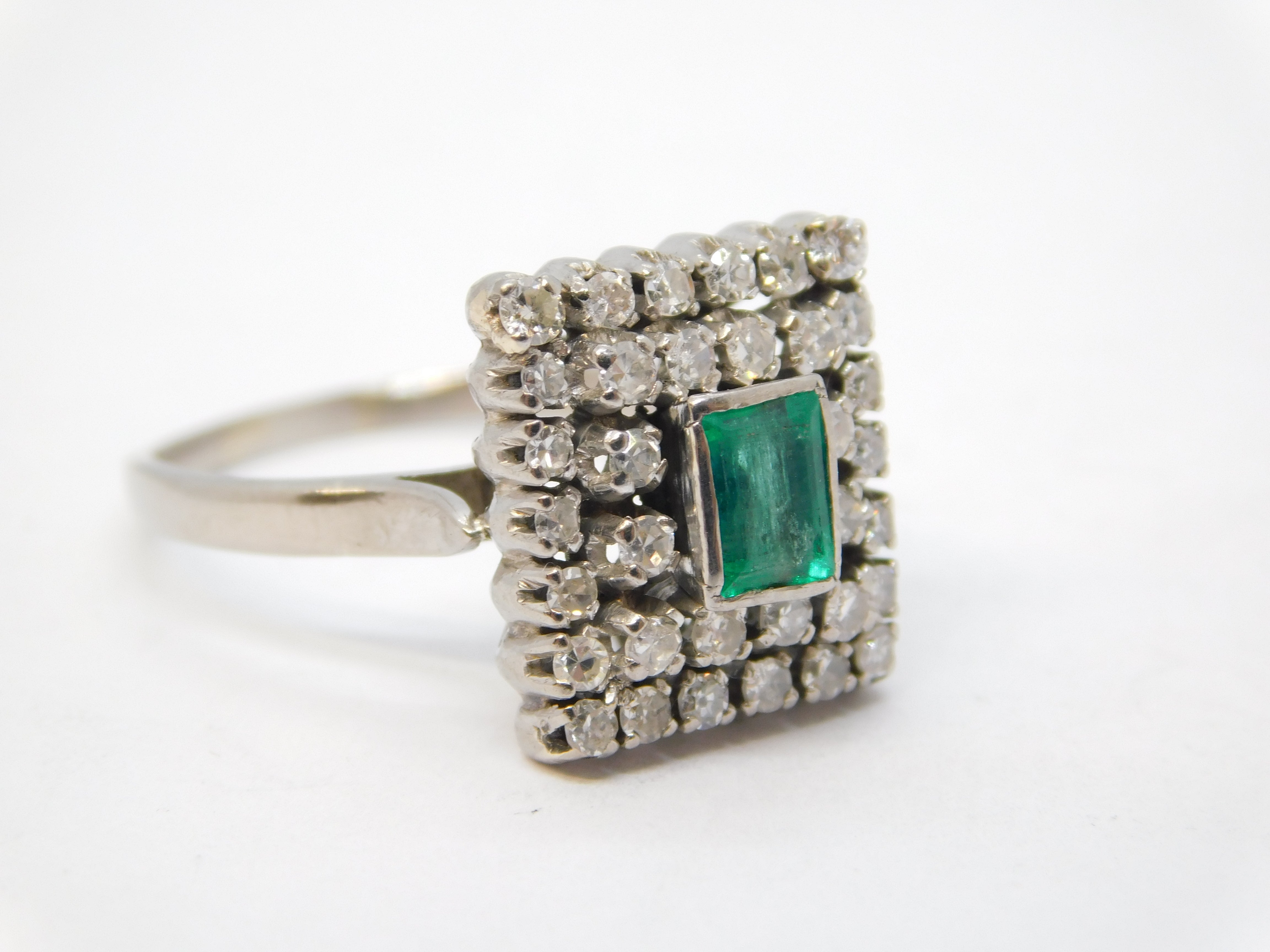 Details: A fantastic and wonderfully designed vintage 9ct white gold modernist style engagement ring or statement ring set with central baguette cut columbian emerald flanked by thirty brilliant cut diamonds. The gold has been XRF tested as it is unmarked, the stones have all been machine tested. This is a wonderful item that would make a perfect gift or addition to any collection. We are more than happy to provide XRF reports for items upon request.