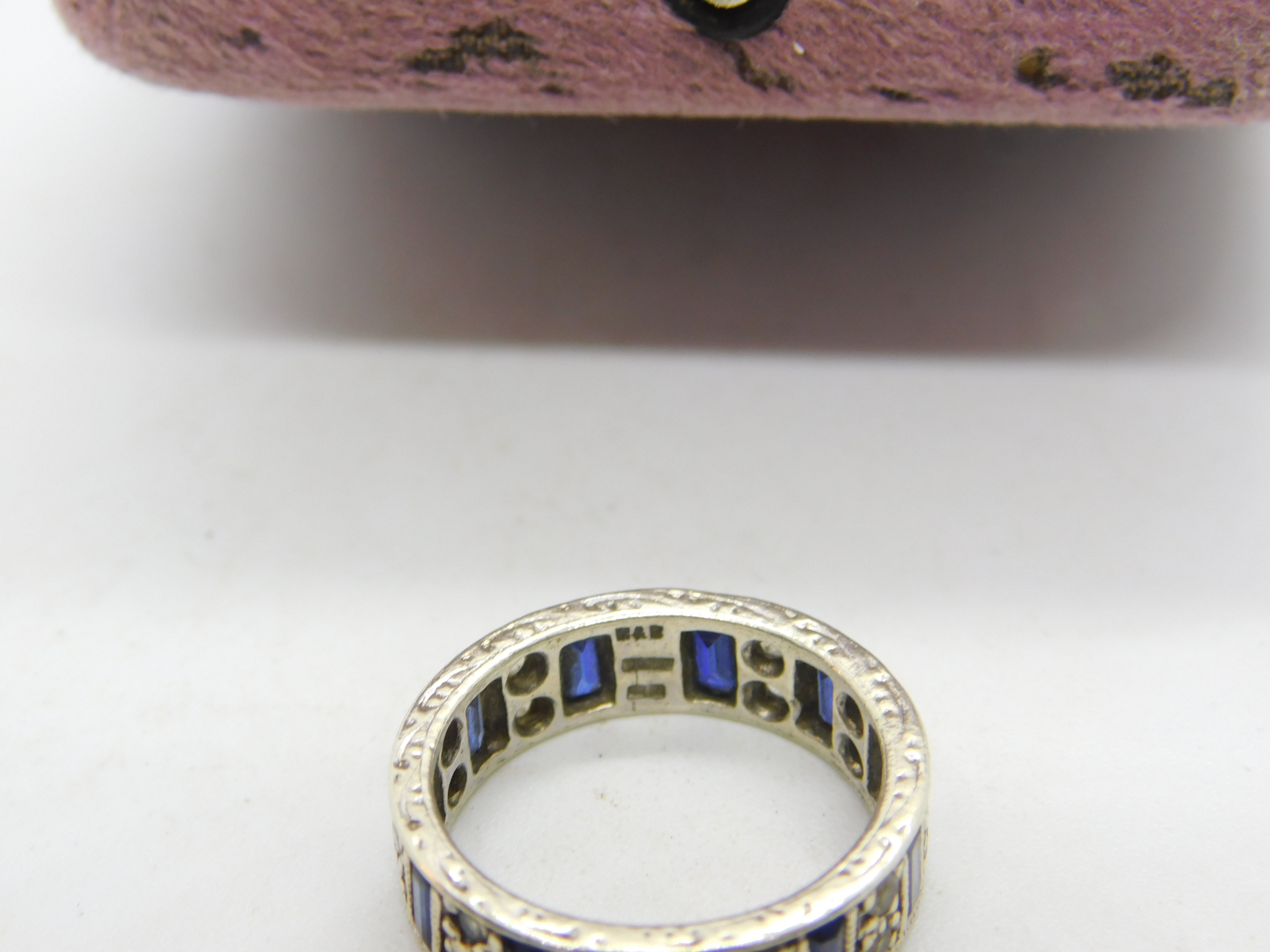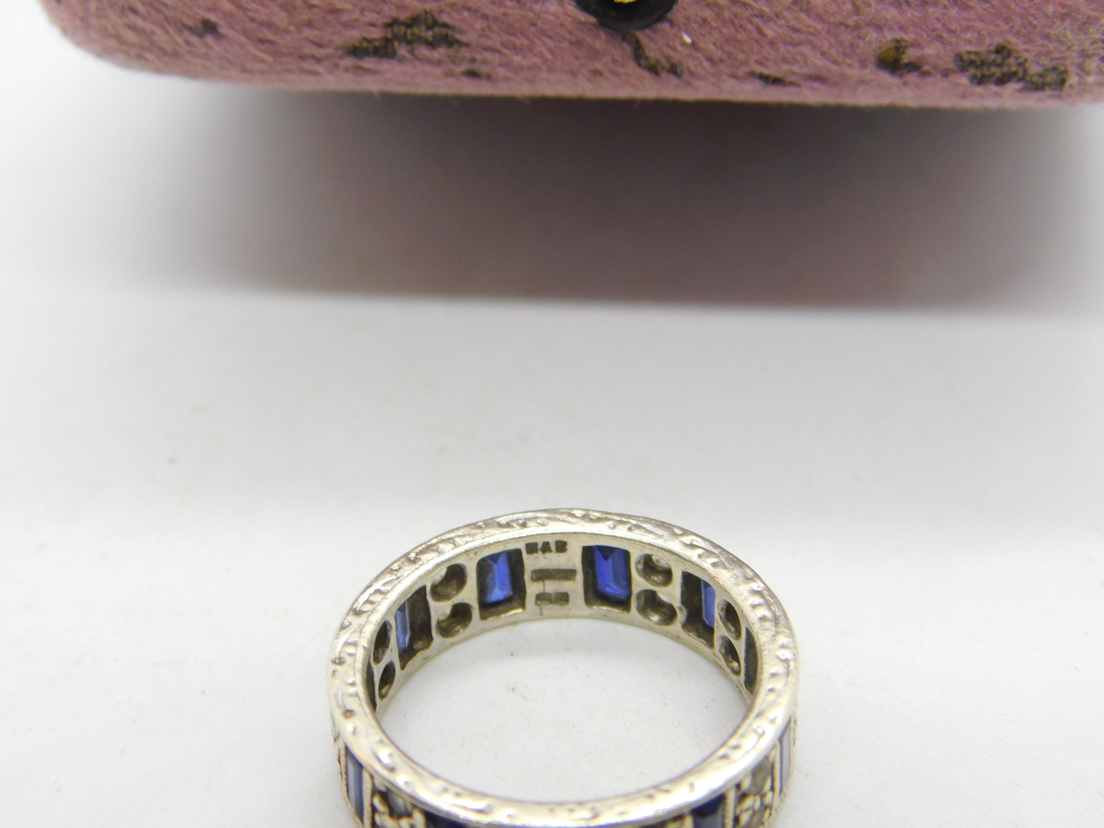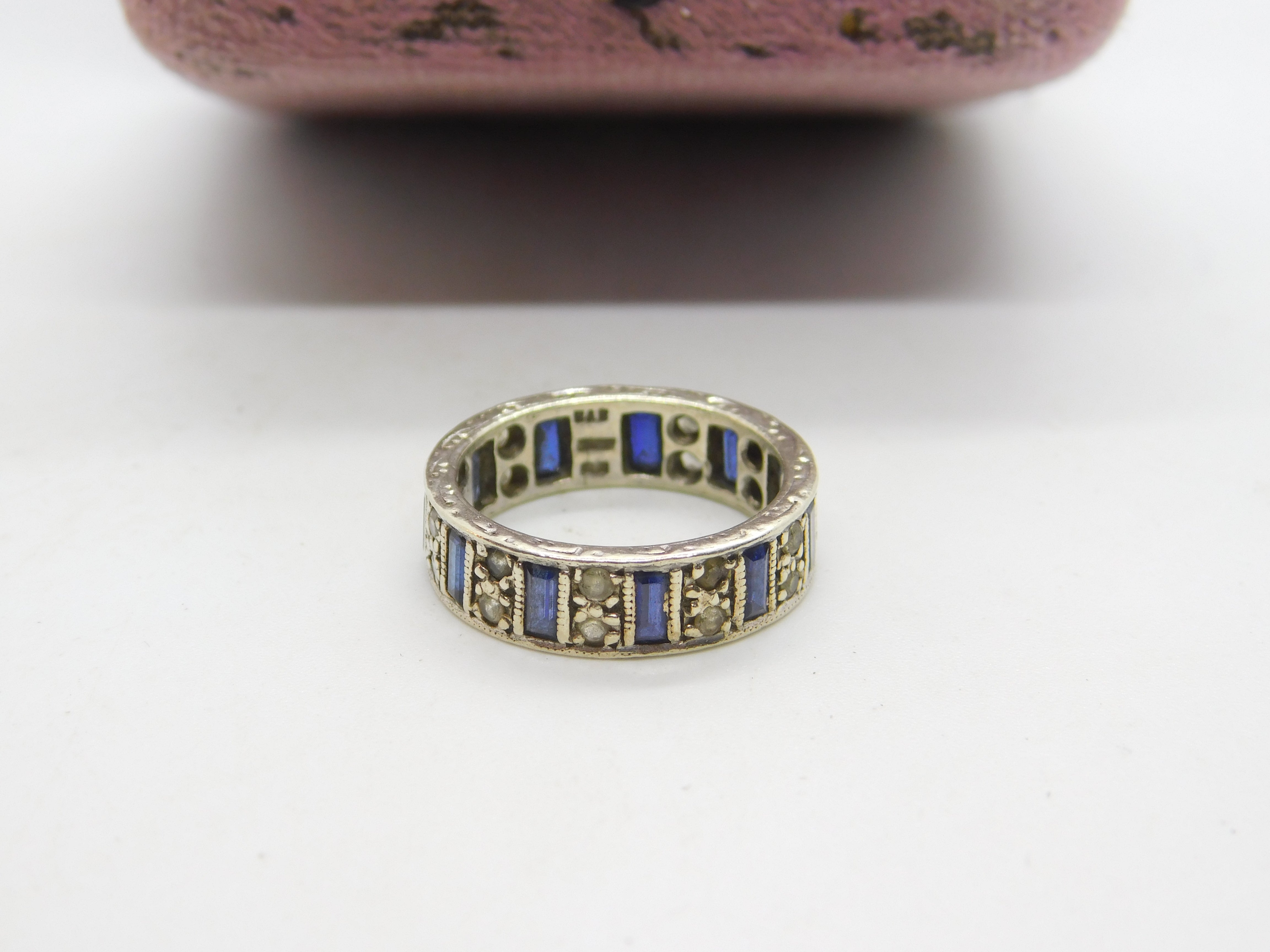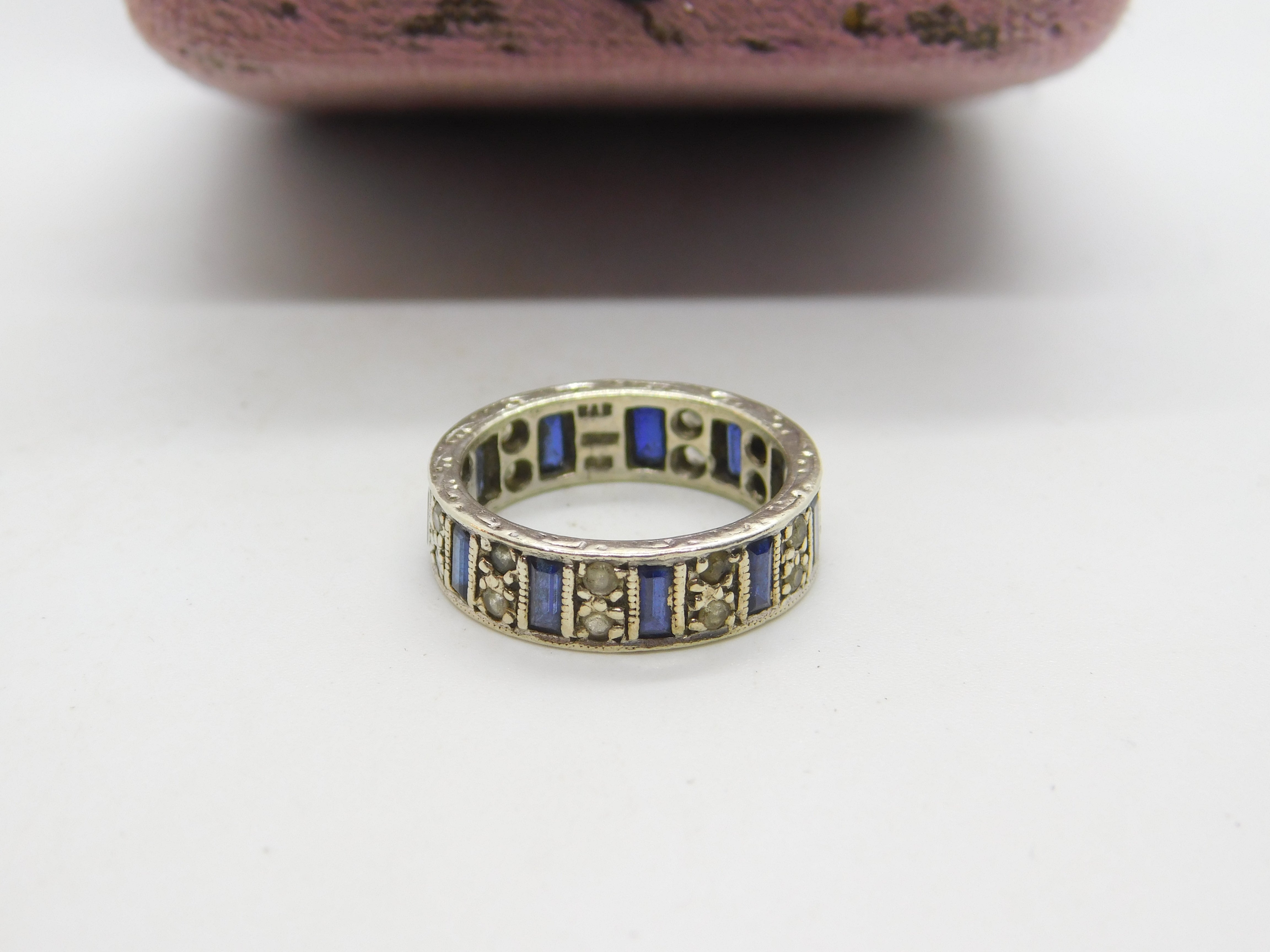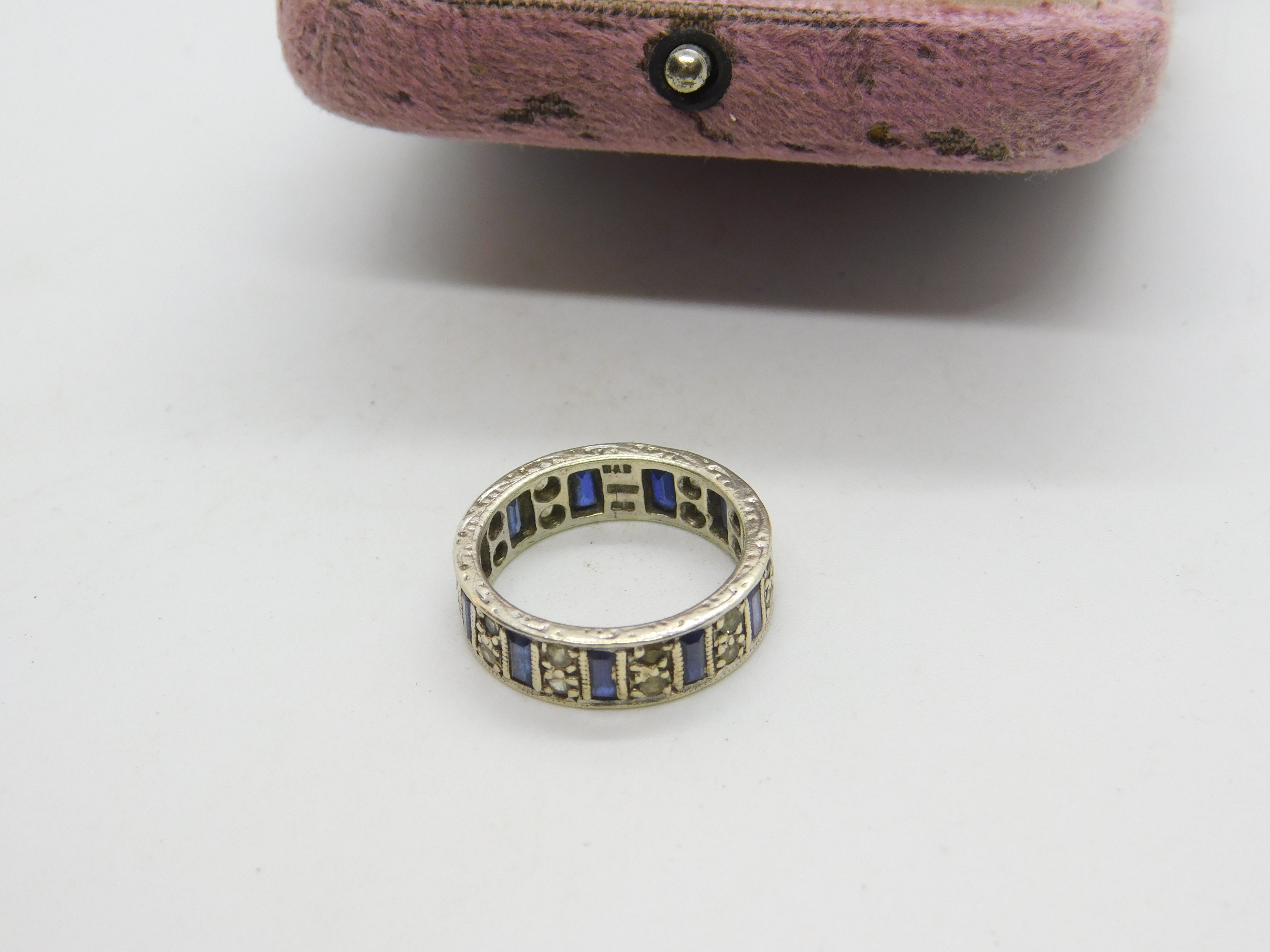 Details: A fantastic and wonderfully designed vintage 9ct white gold, sapphire & spinel set full eternity band ring with lovely detailing hallmarked Birmingham 1974 to the interior and the stones have been tested. This is a wonderful item that would make a perfect gift or addition to any collection. The BOX pictured is for PRESENTATION ONLY and is NOT included in the listings but used to frame the pictures unless specifically stated otherwise.