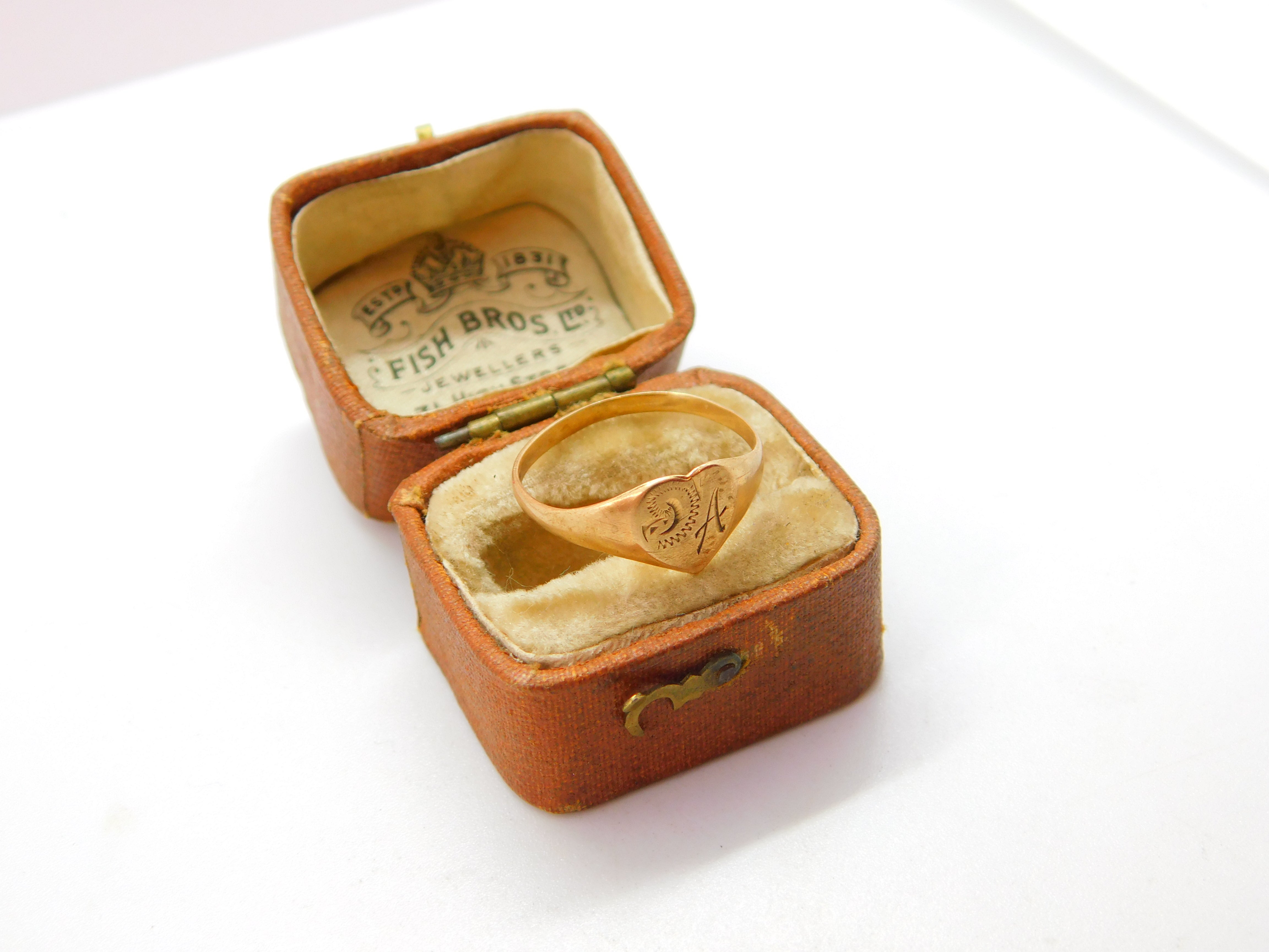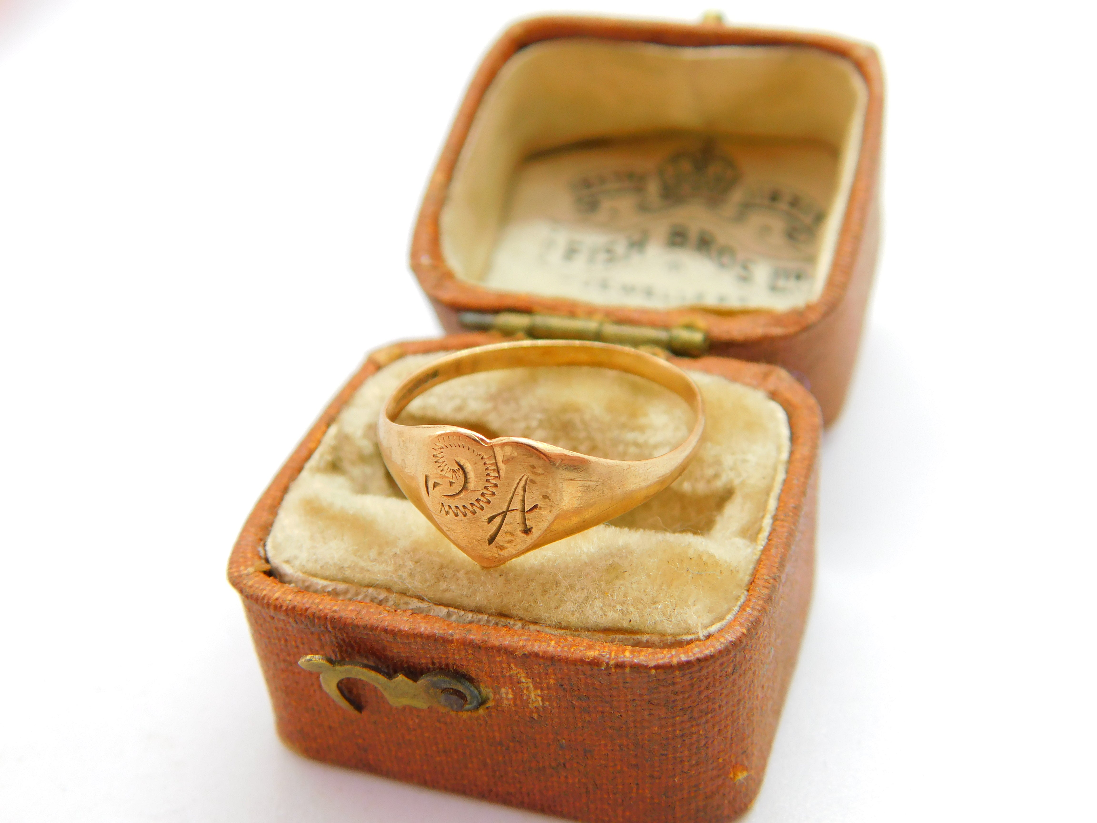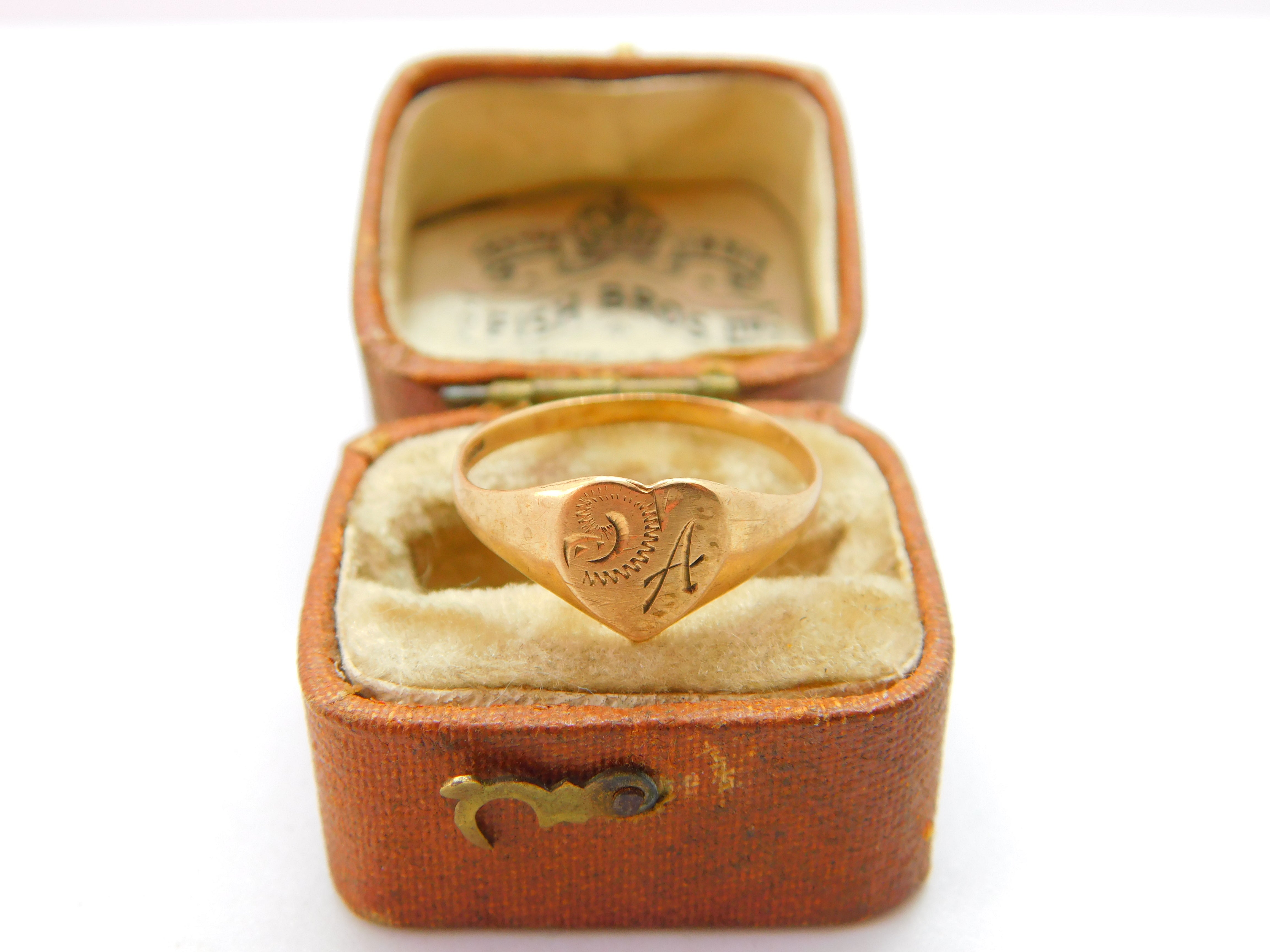 9ct Yellow Gold 'A' Initial Heart Shaped Signet Ring 1988 Birmingham