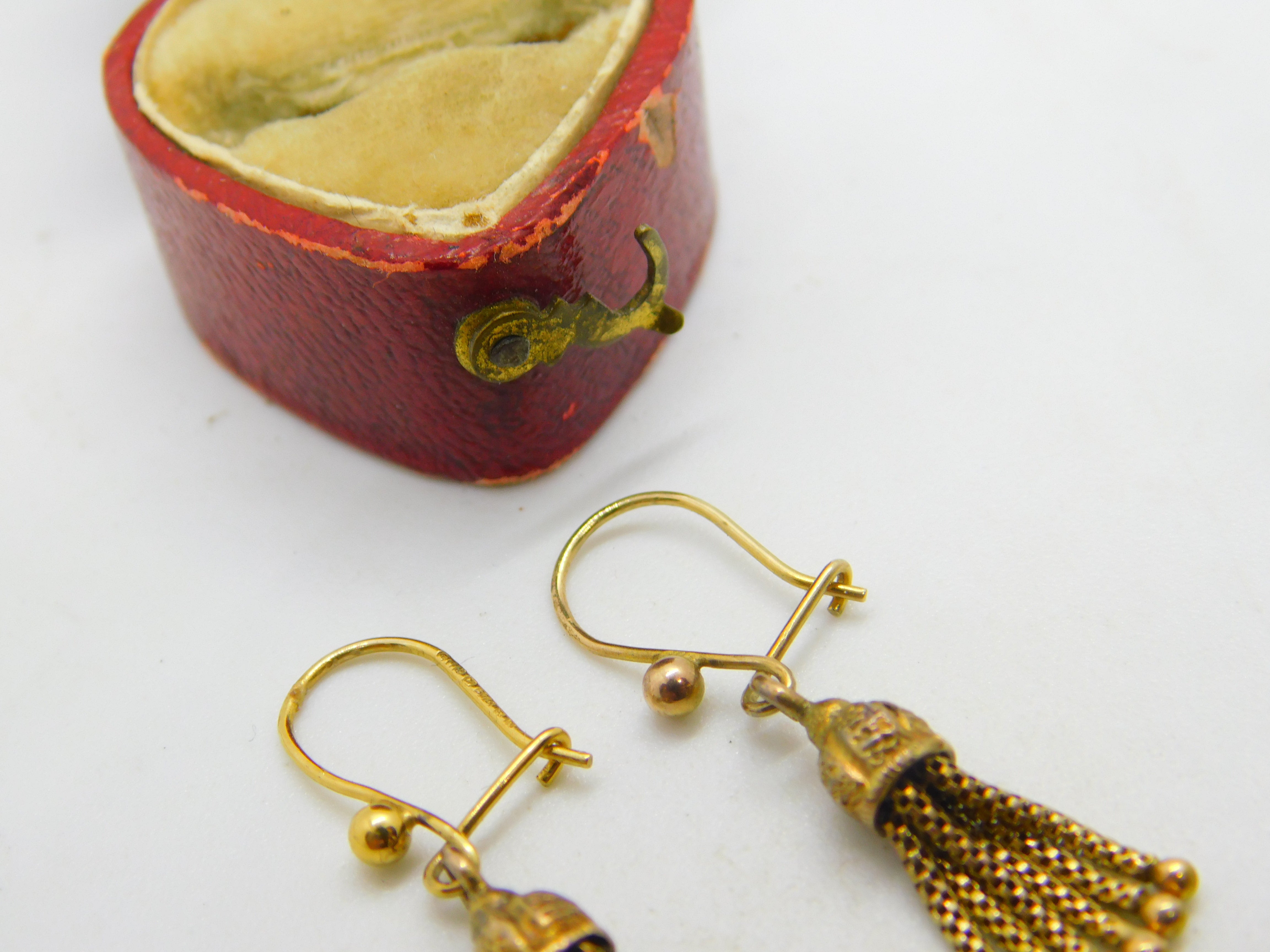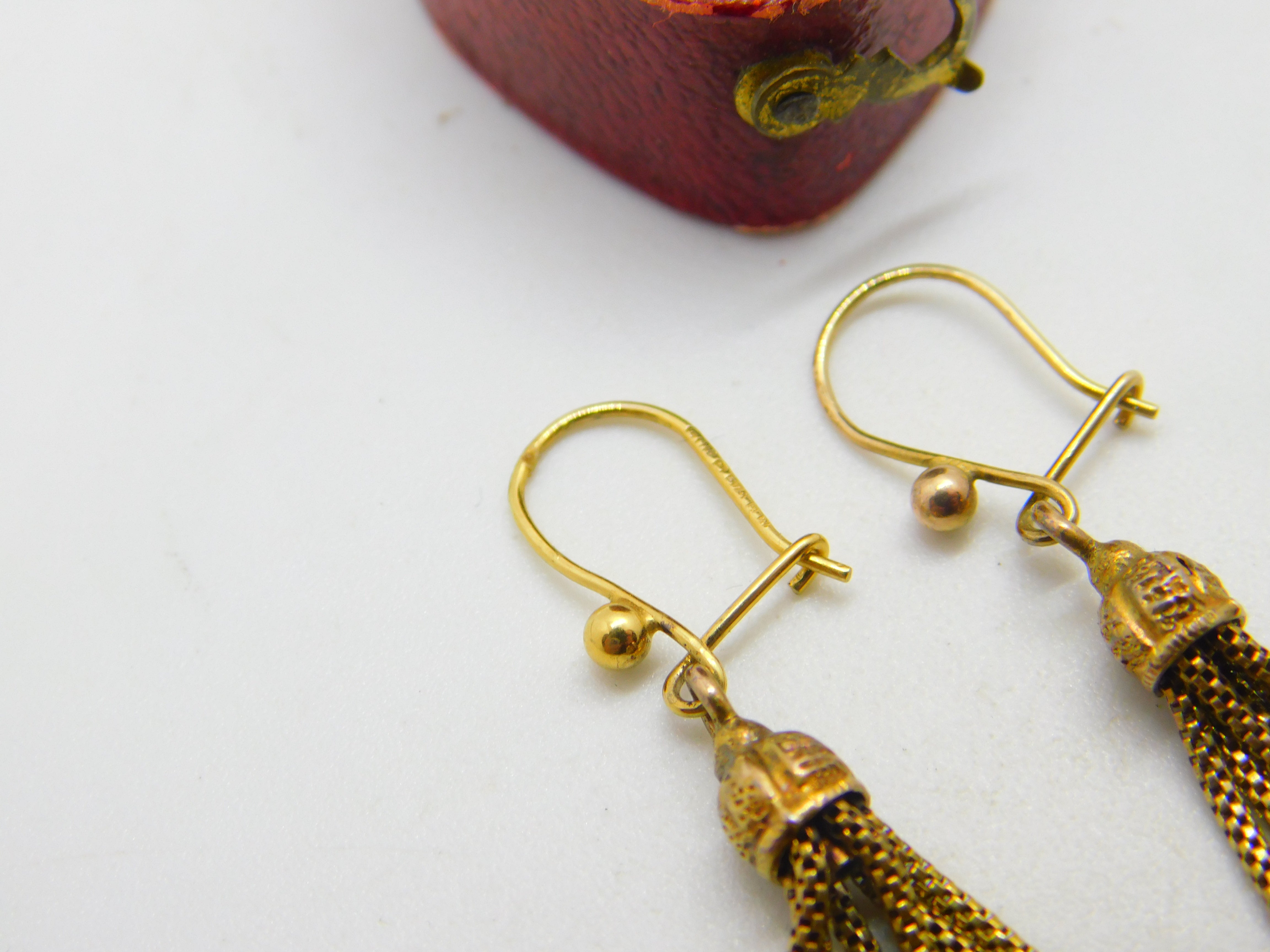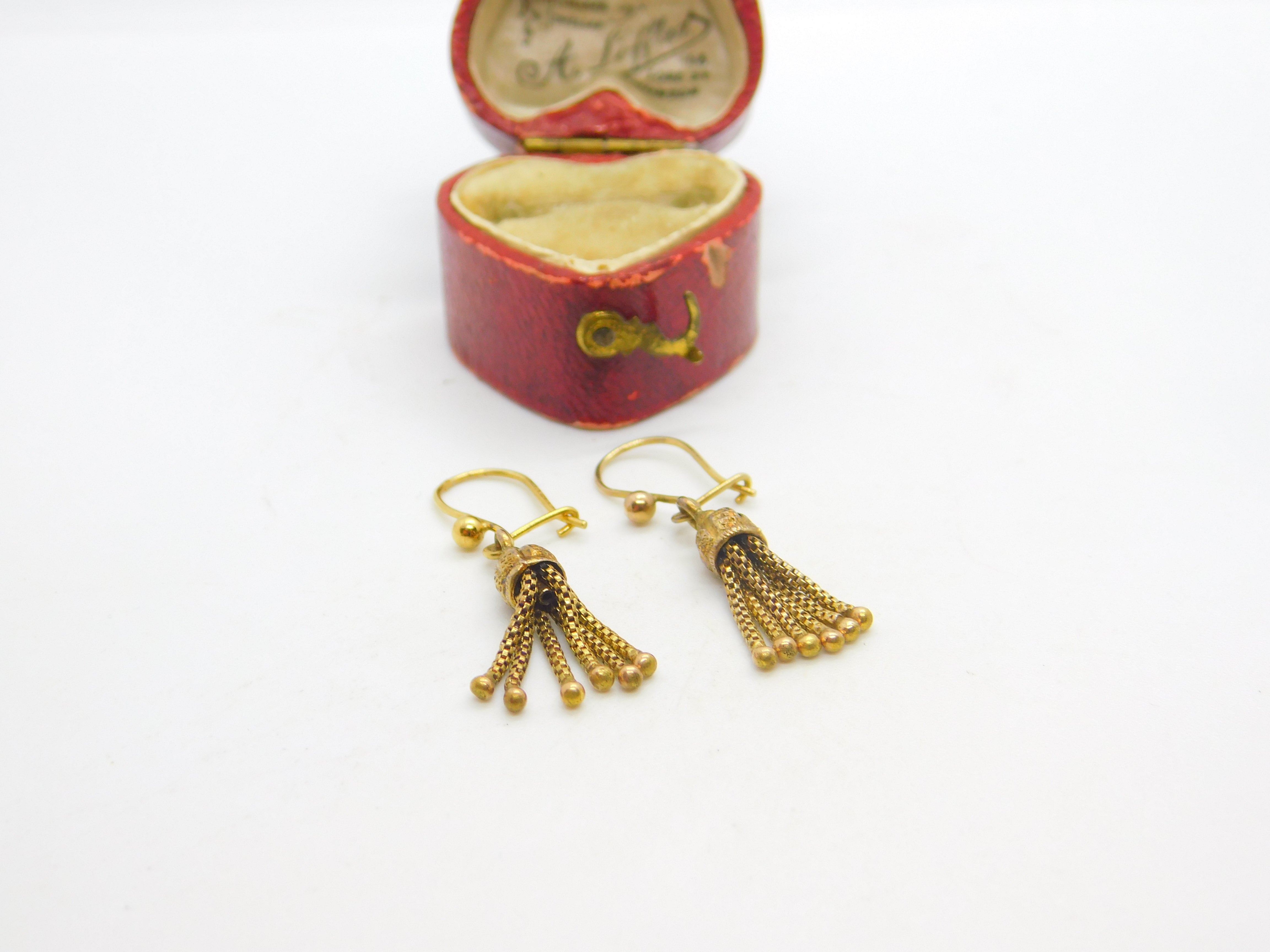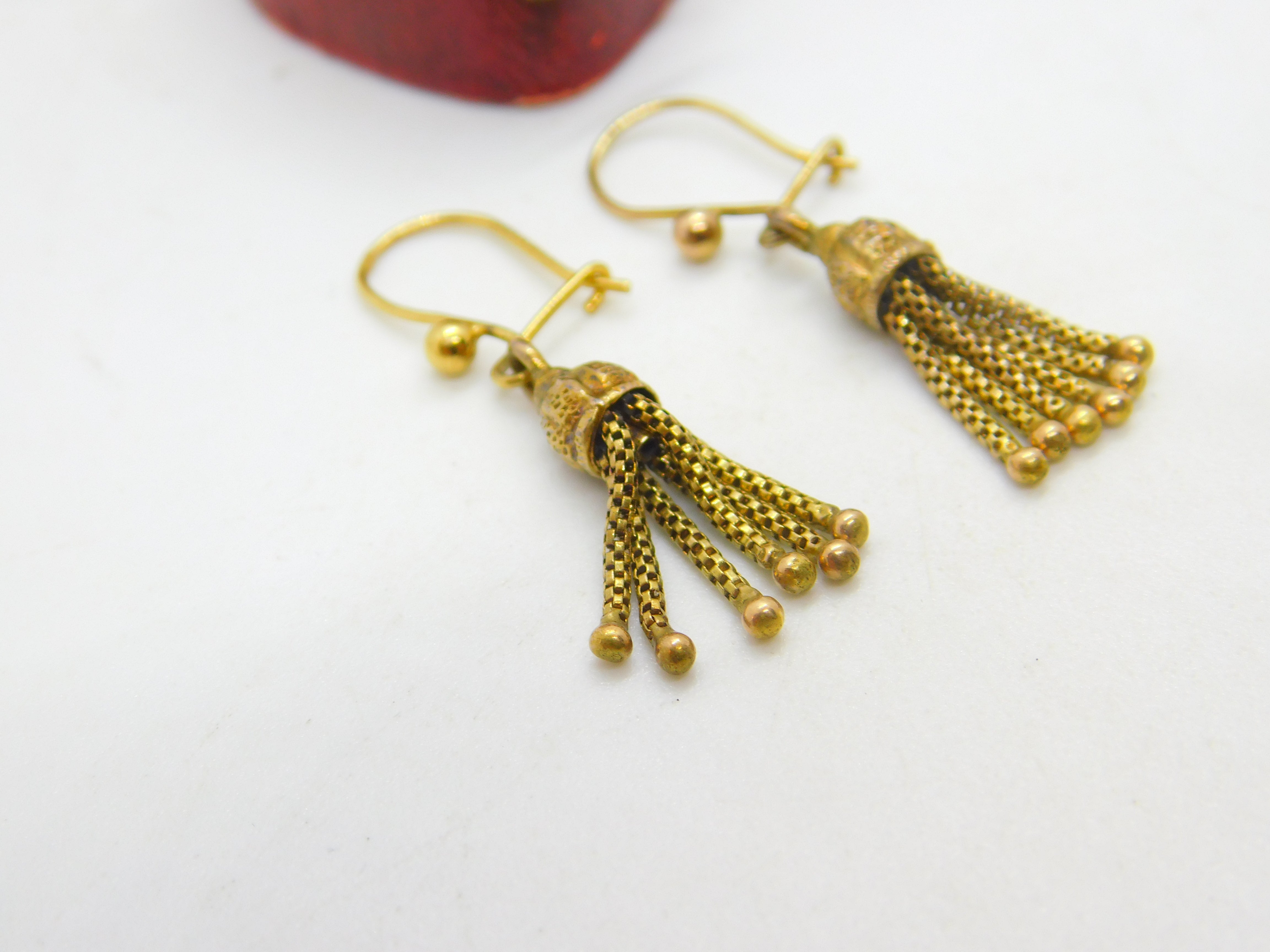 A lovely pair of 9ct yellow gold dangling tassel earrings. The tiny English hallmarks can be found on the kidney wire backs which are later replacements. In good used condition with minor tarnishing. c1860