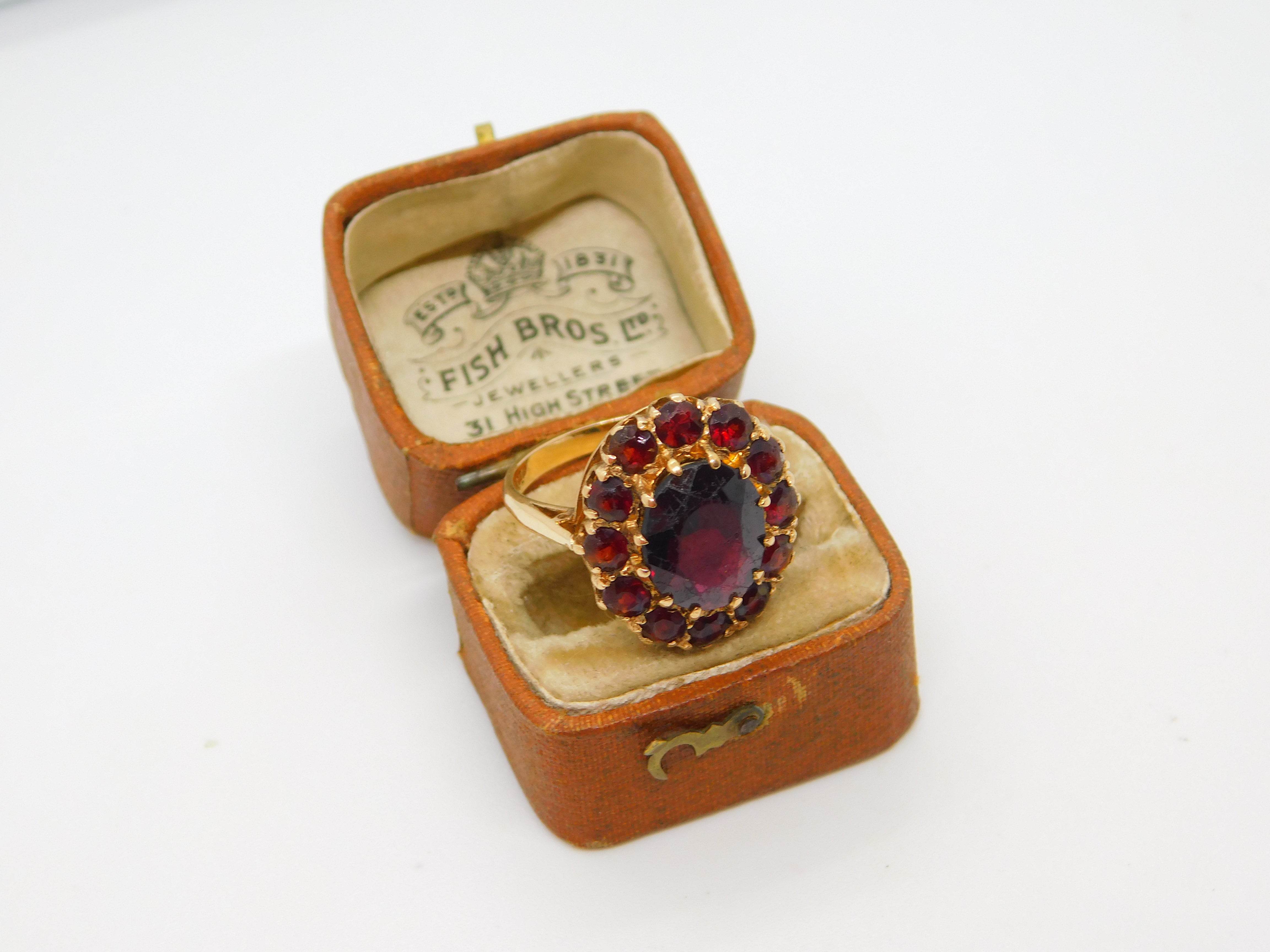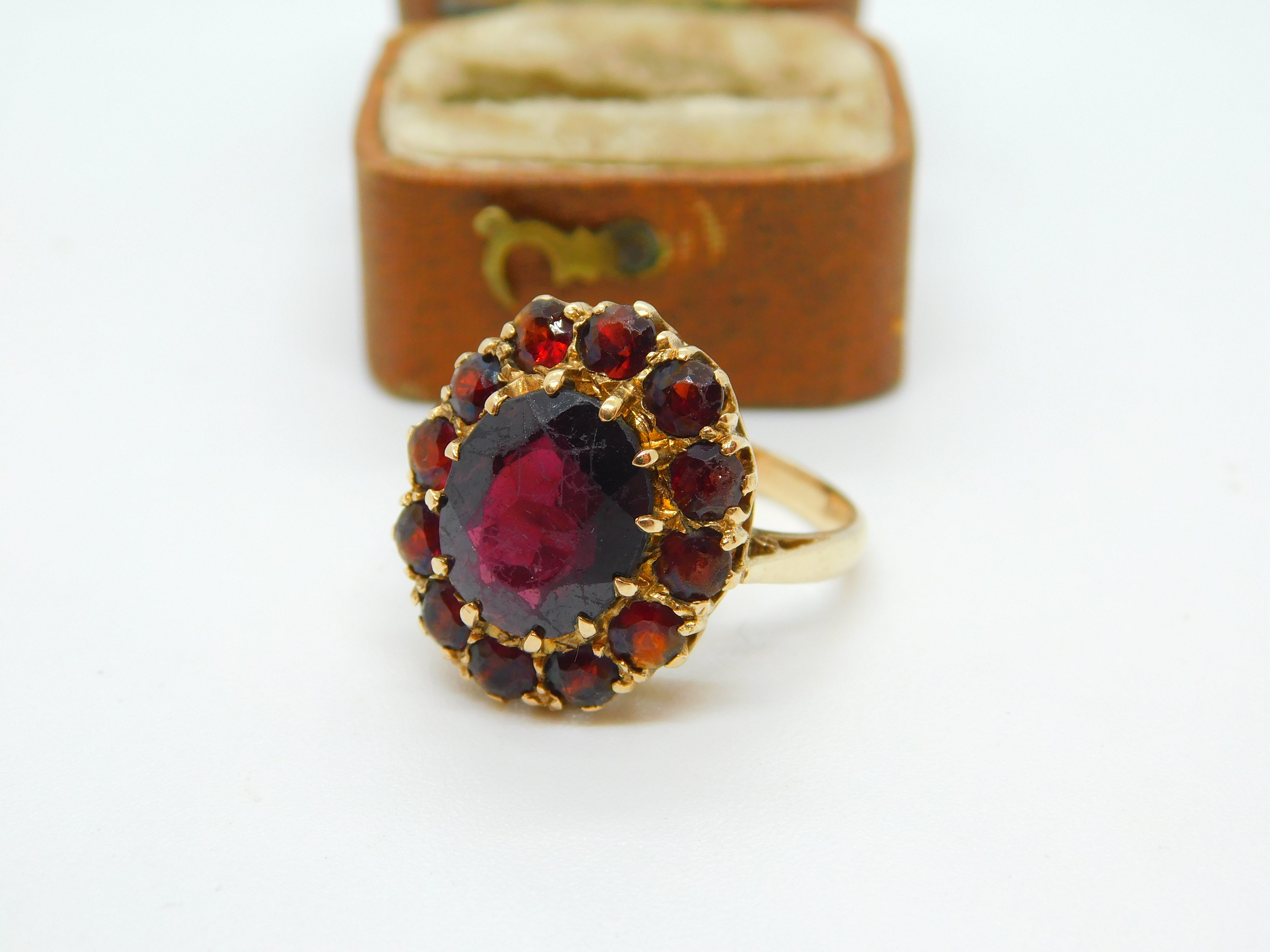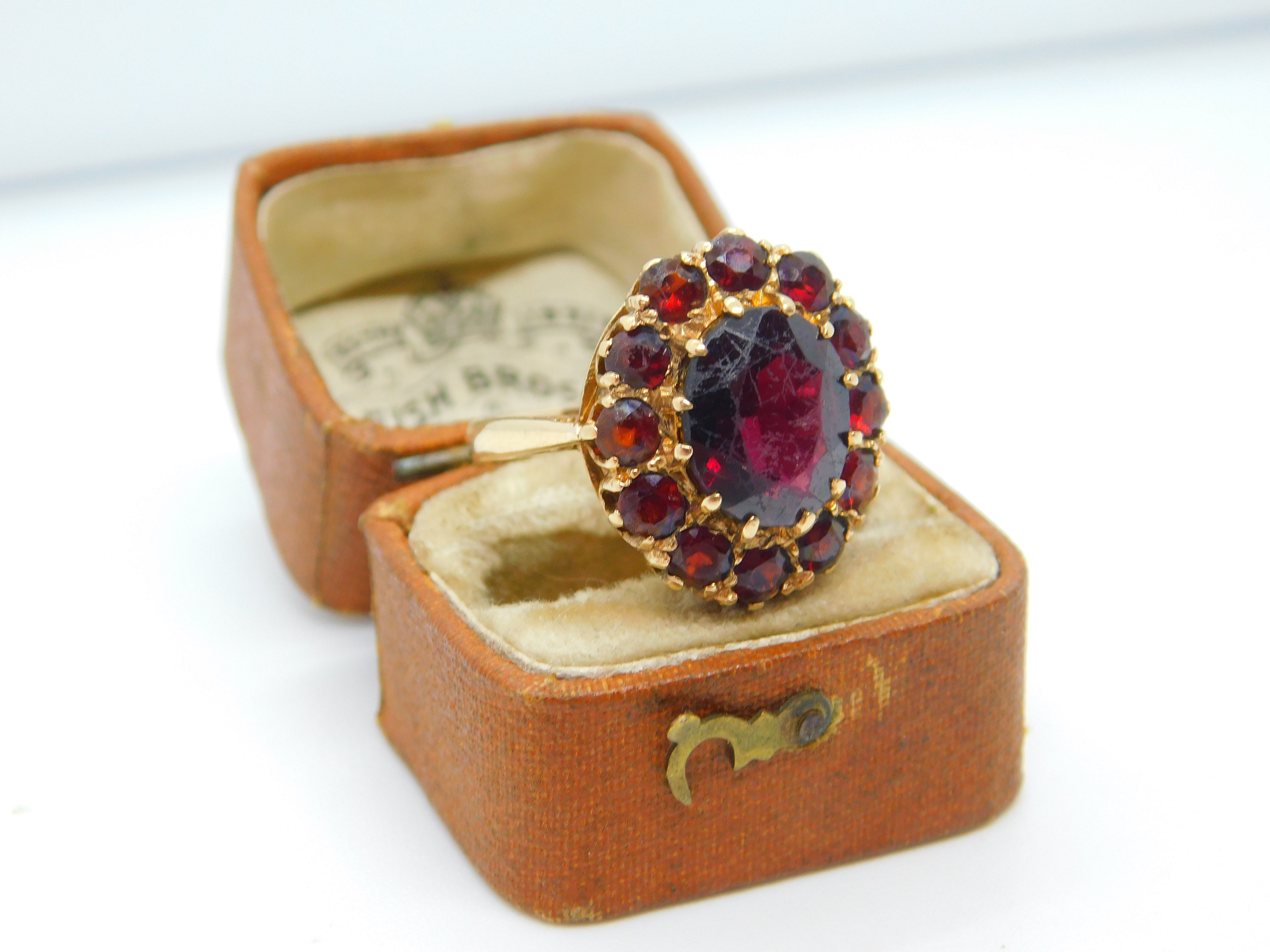 Details: A fantastic and wonderfully designed antique art deco 9ct yellow gold bohemian garnet set floral cluster ring hallmarked to the interior c1940. This is a wonderful item that would make a perfect gift or addition to any collection. The BOX pictured is for PRESENTATION ONLY and is NOT included in the listings but used to frame the pictures unless specifically stated otherwise.